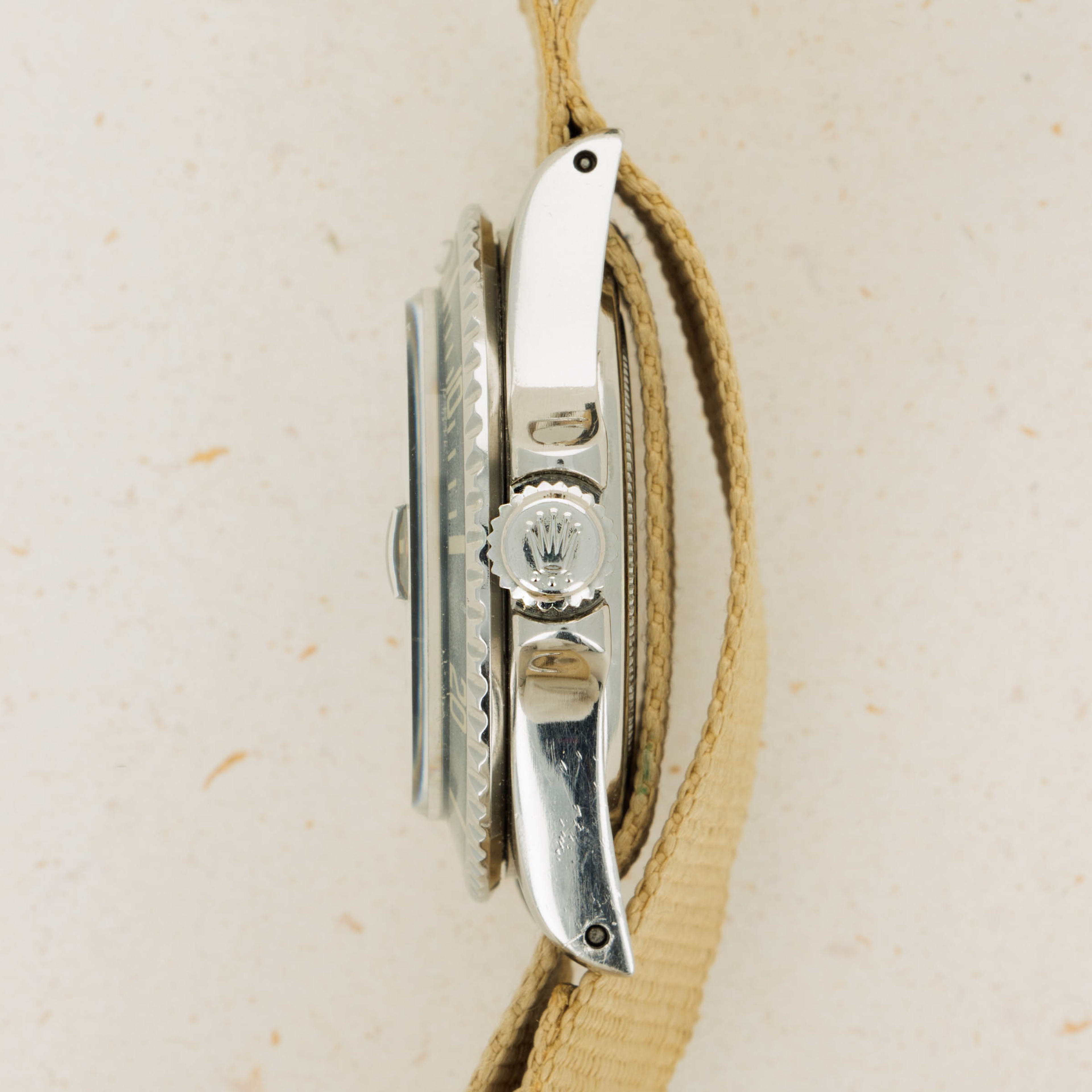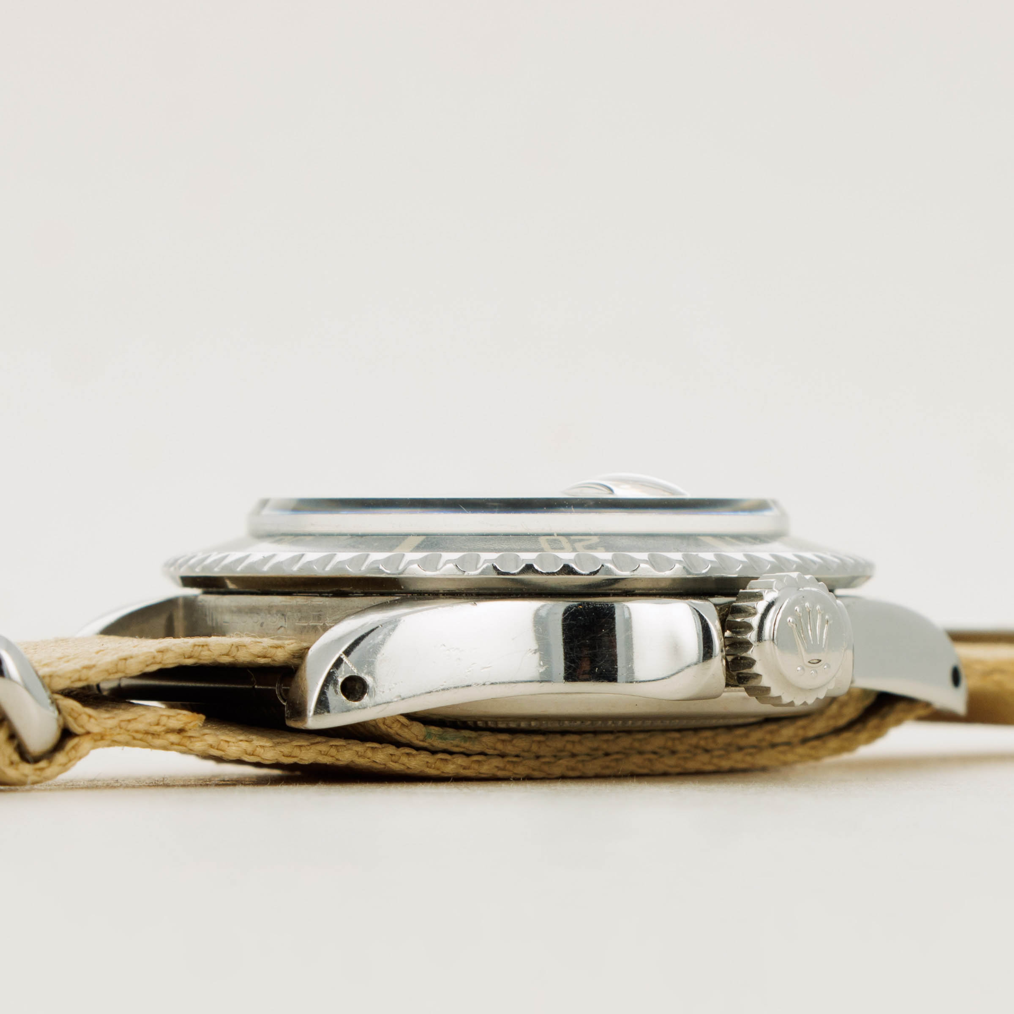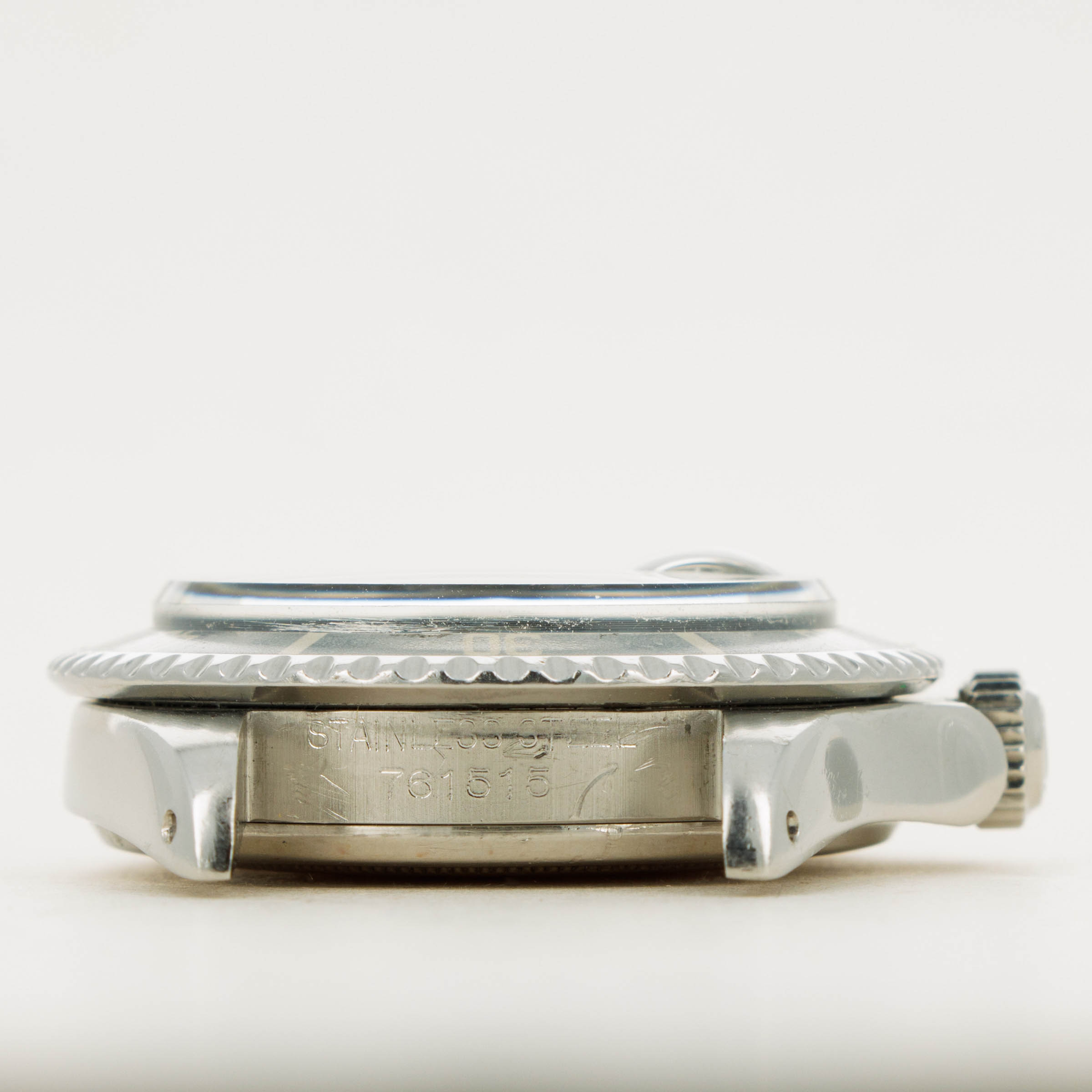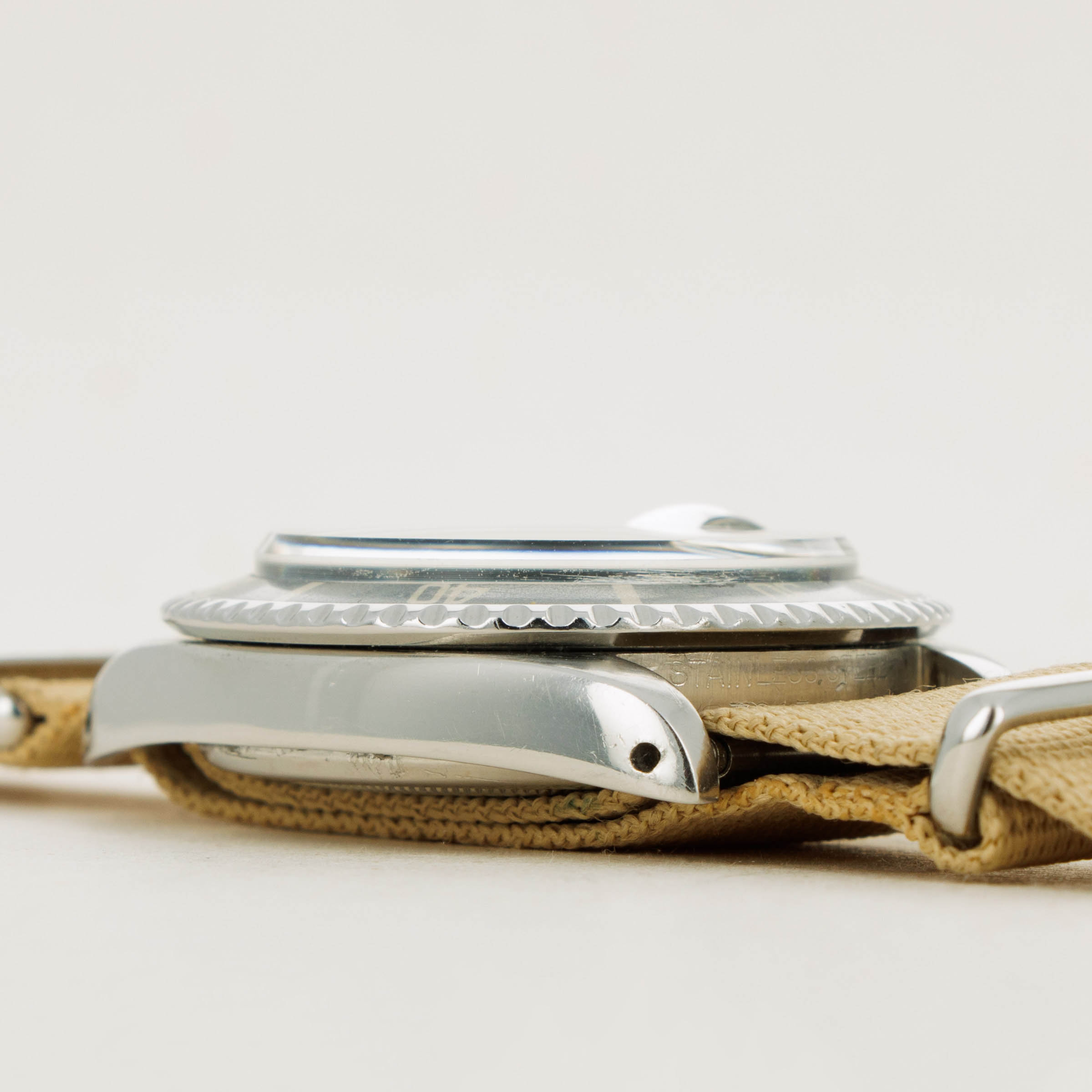 Watch is in very good overall condition. Case exhibits moderate wear, with lugs being slightly thin due to previous polishing. Dial in excellent condition with some surface wear and slightly discolored luminous. Hands are a different tone and appear to have been relumed at some point. Original insert has faded to a very light tone, with some damage along the inner edge.