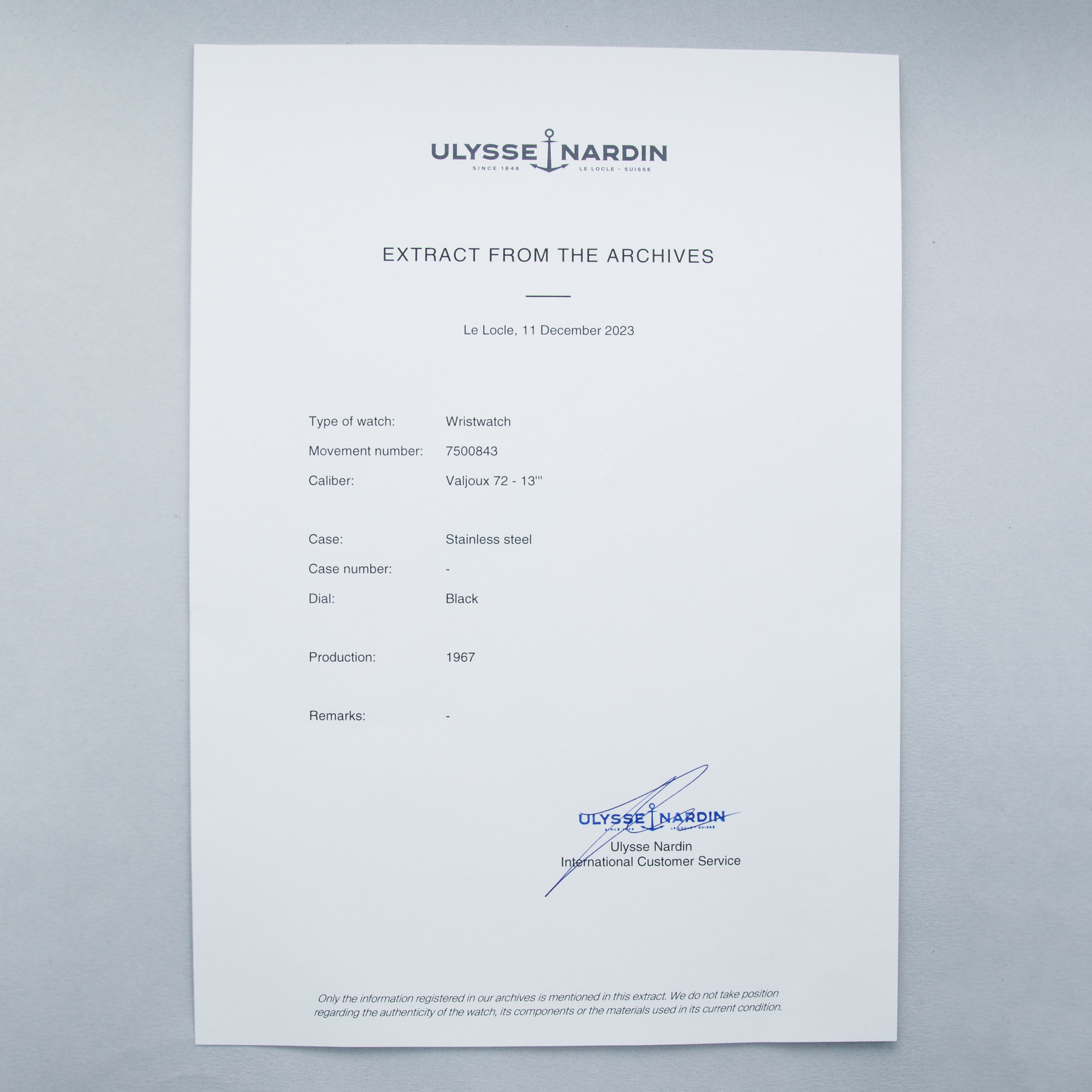 Founded in 1846, Ulysse Nardin are one of watchmaking’s most famed brands in the world of seafaring due to their highly accurate marine chronometers and complicated timepieces. In service across more than fifty of the world's navies from the end of the 19th century till 1950, Ulysse Nardin’s modern brand is built upon this maritime heritage, with a host of their offerings linked to the sea. However, they also have a slew of offerings that break from that seafaring tradition, much like the Chronograph ref. 7536-1 “Daytona” that we have here. An exceptionally rare 1960s chronograph, as its name suggests, the ref. 7536-1 has only been seen on the market a handful of times over the years, which has led to it becoming a truly desirable and sought-after chronograph. Boasting a dial design that is very similar to the Rolex Daytona from the same period, the ref. 7536-1 features a black dial, made by Singer, with white subdials that sport the same concentric finishing and the same layout. Furthermore, the dial also includes the same applied indices. Two versions of the ref. 7536-1 have been observed on the market, with the example we have appearing as a Mk. 1 example, as denoted by its engravings, and lack of lume pips at 3, 6, and 9 o’clock. A large chronograph for the time, this 38mm stainless steel beauty boasts thick bevels on its lugs and a wonderfully maintained aluminum bezel insert that subtly suggests this example’s age.