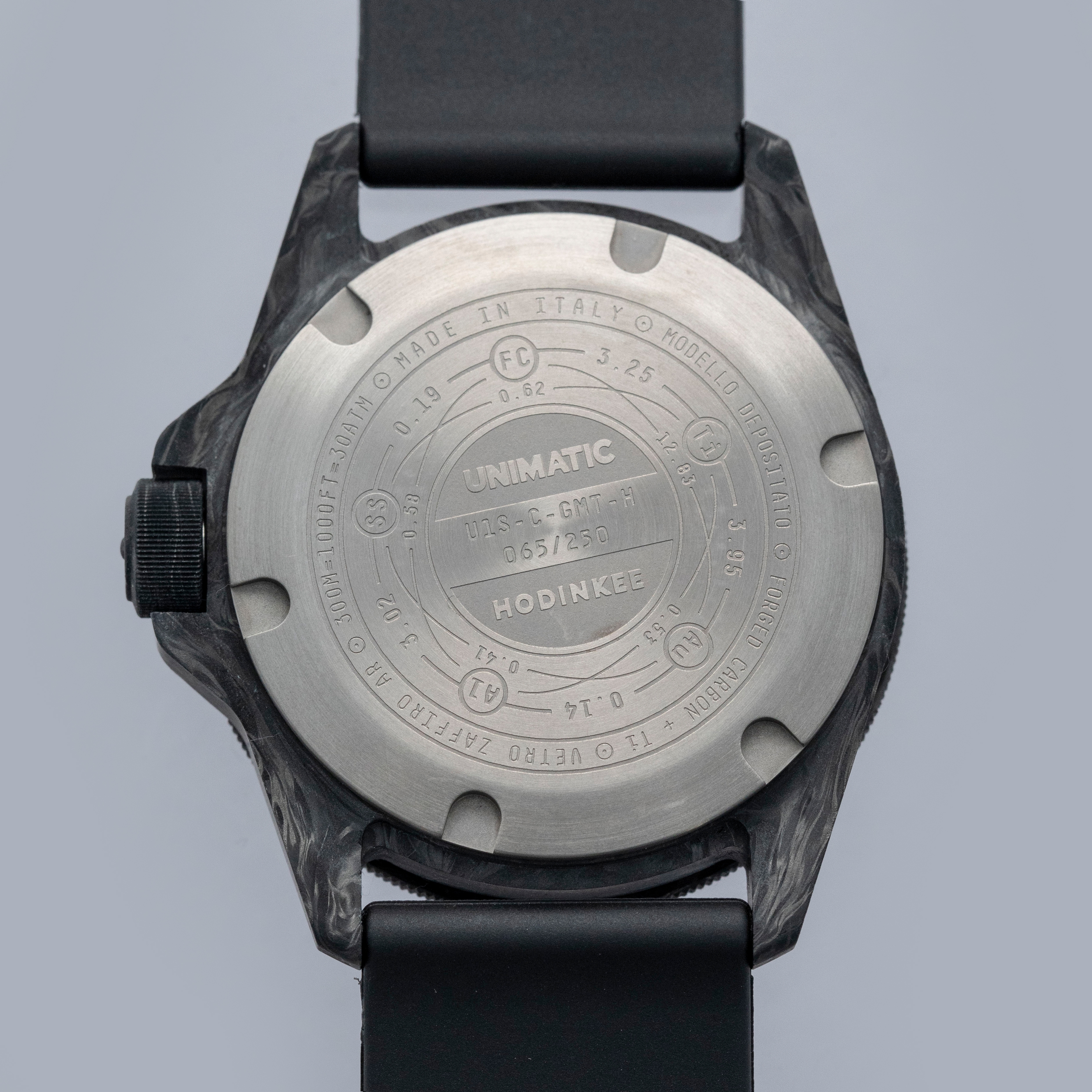 Introduced as the second collaboration between famed watch publication Hodinkee and independent watchmaker Unimatic, their latest release is the Modello Uno U1S-C-GMT-H. Boasting a distinctive forged carbon fiber design for the first time in Unimatic’s history, this limited edition watch, limited to just 250 units, features a 41.5mm blacked-out carbon fiber case that features a unique marbled effect that created a distinctively sleek aesthetic. Paired with a matte black unidirectional 24-hour bezel and a blacked-out dial with large white indices and hands that allow for fantastic legibility, the watch is minimalist in design with its floating skeletonized GMT hand and blacked-out date window fading into the background of its design. Water-resistant up to 300 meters and powered by the ETA cal. 2893-2 automatic movement with a 42-hour power reserve, this watch is designed for adventurers. Each piece is uniquely marked with a serial number and a special Unimatic x Hodinkee engraving on the caseback that marks it as the second collaboration between these two powerhouses of industry.