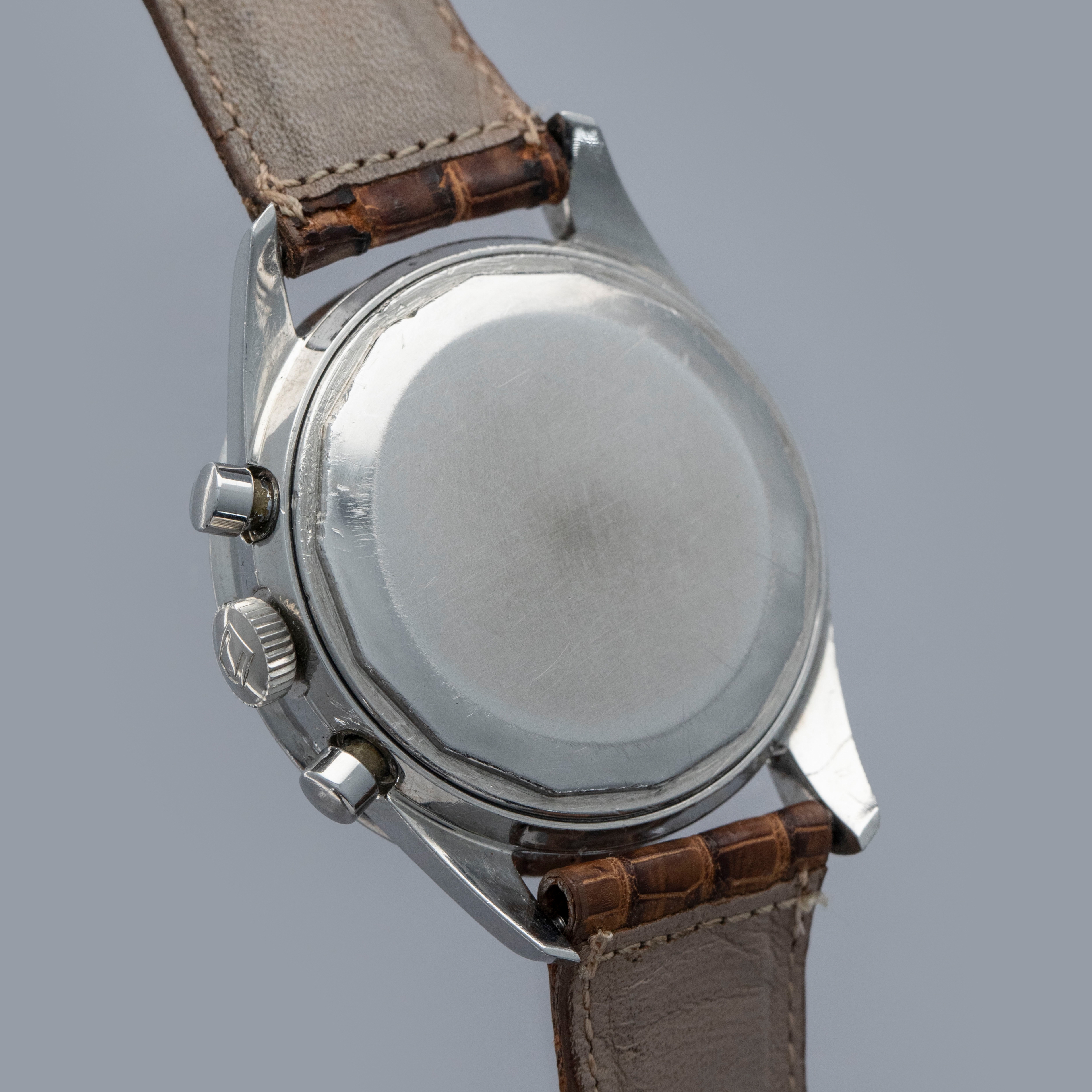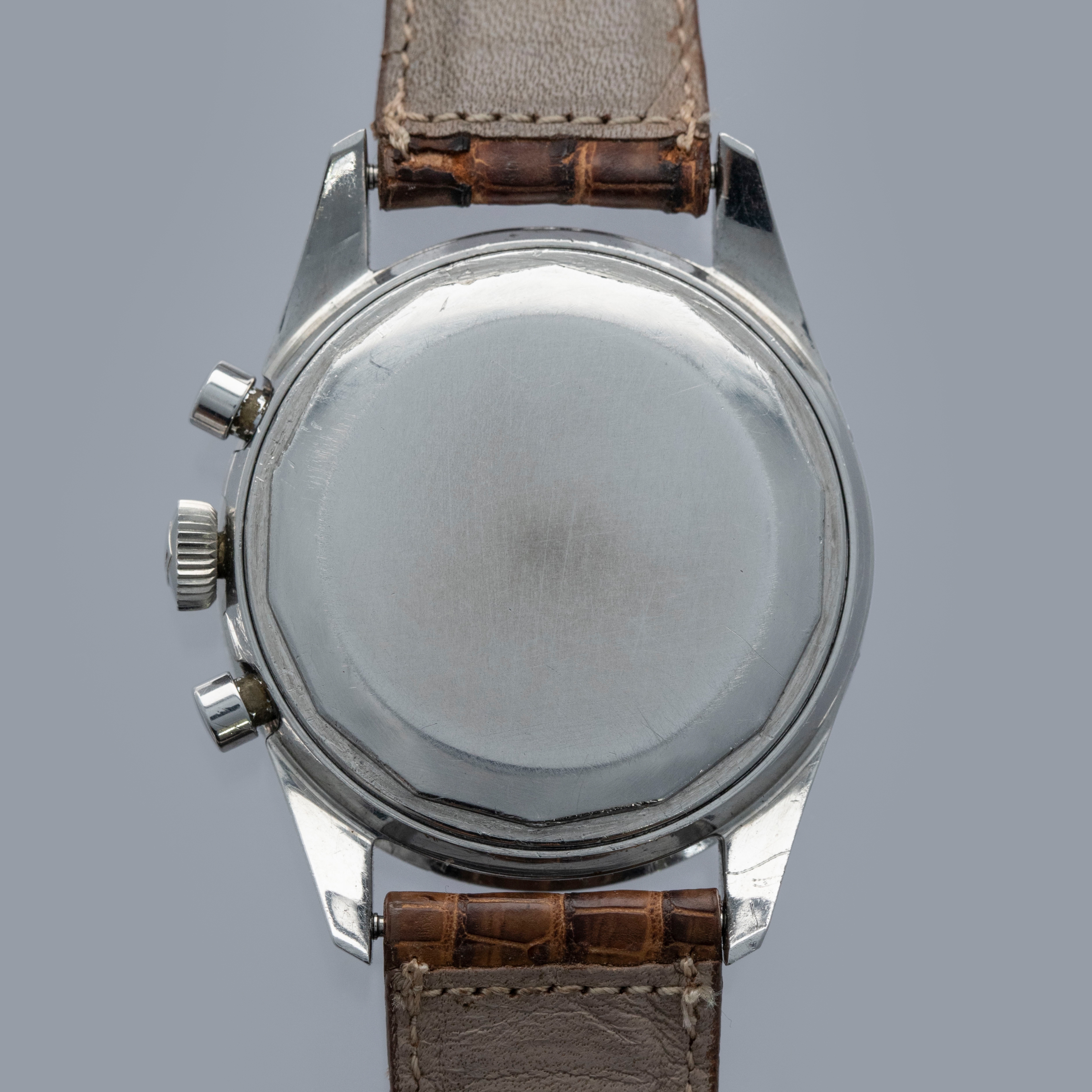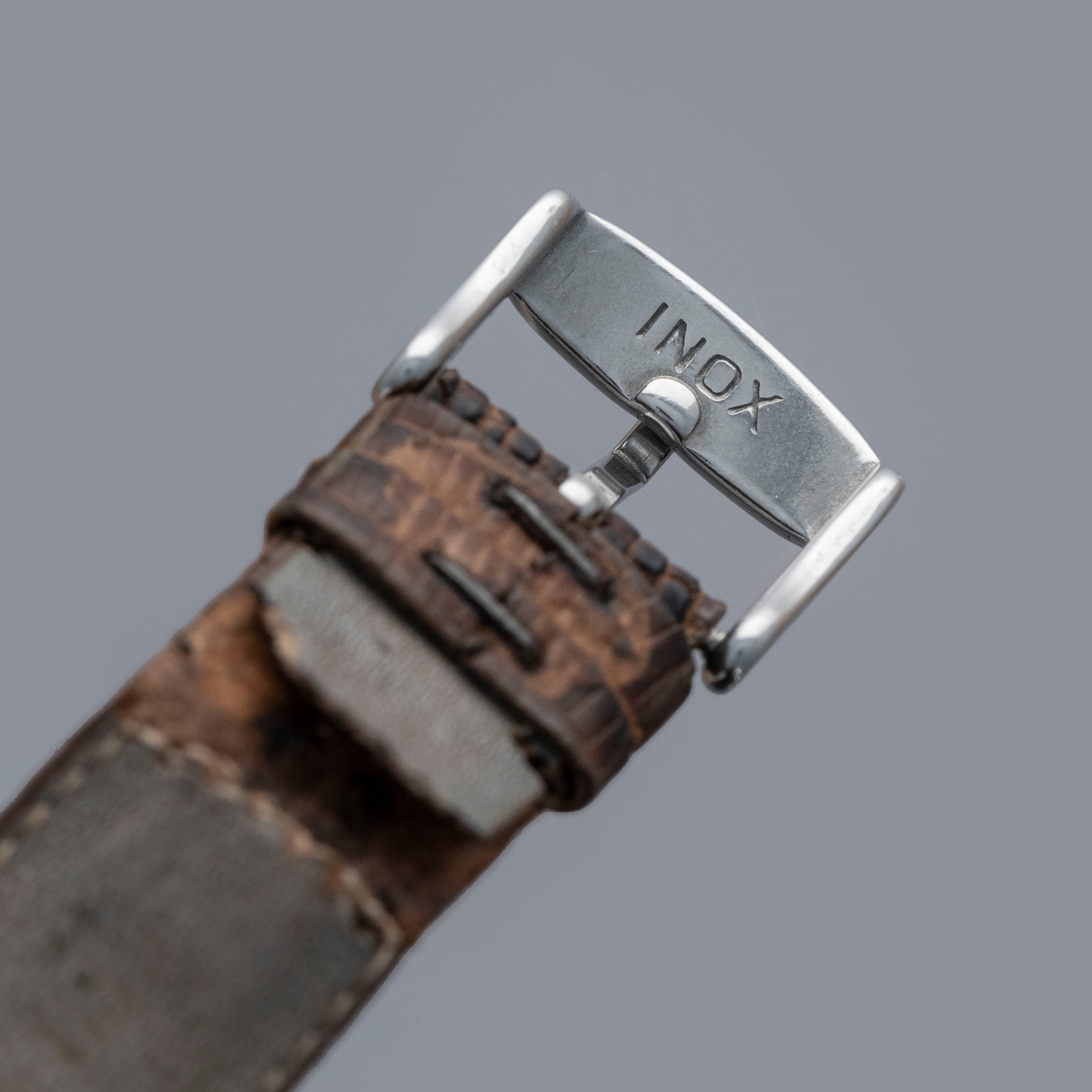 Watch is in overall very good condition. The steel case shows light surface scratches and small nicks as expected of a watch of this vintage. The tetradecagonal case back displays scuffs and marks, and the serial and reference number have been worn over time and are no longer visible. The steel bezel and black insert remain excellent, with some light surface marks visible on the insert. The dial shows light spotting on the sub-dials, while the hands have some surface scratches. It is fitted with a leather crocodile strap in very poor condition. Please note that this watch does not have a serial number.
