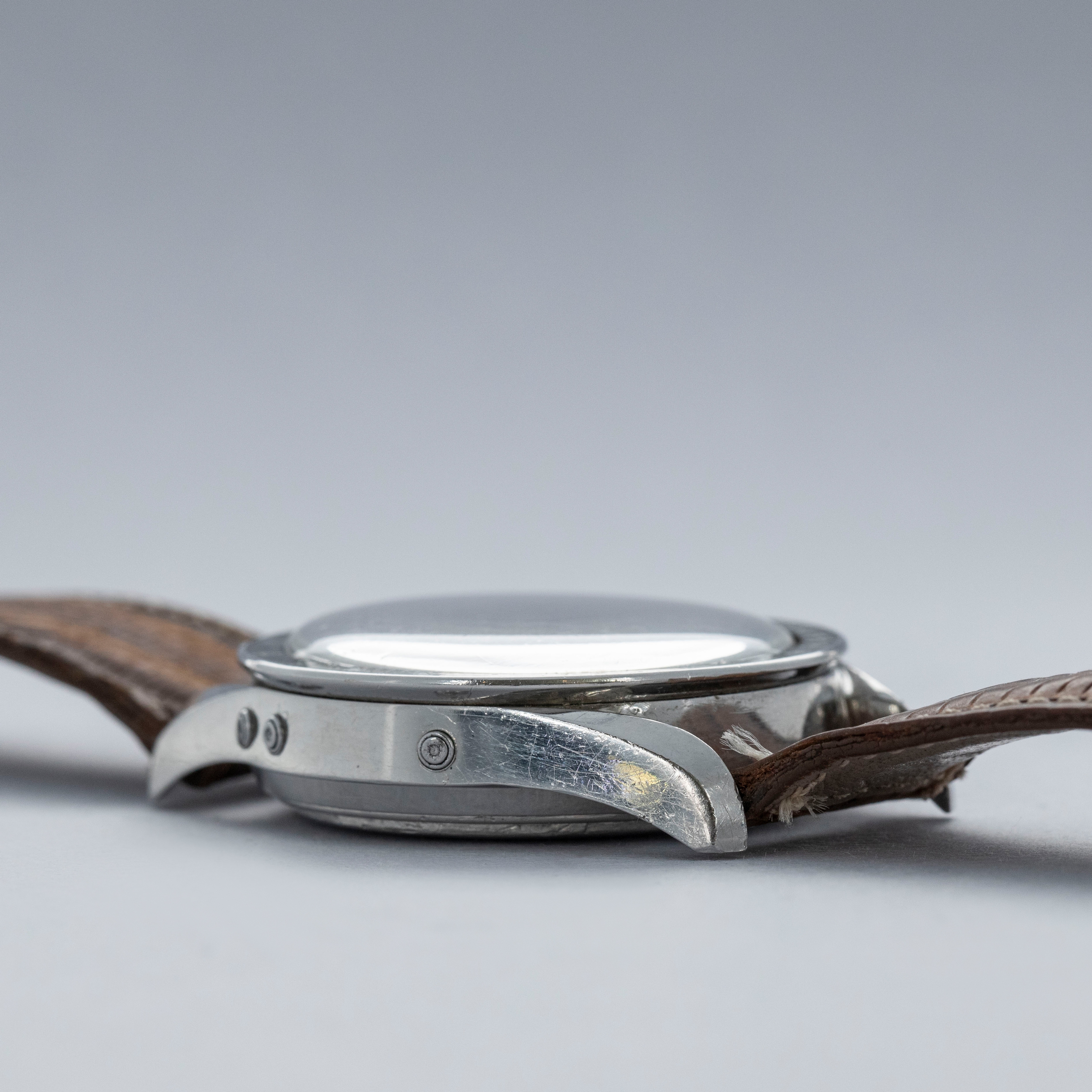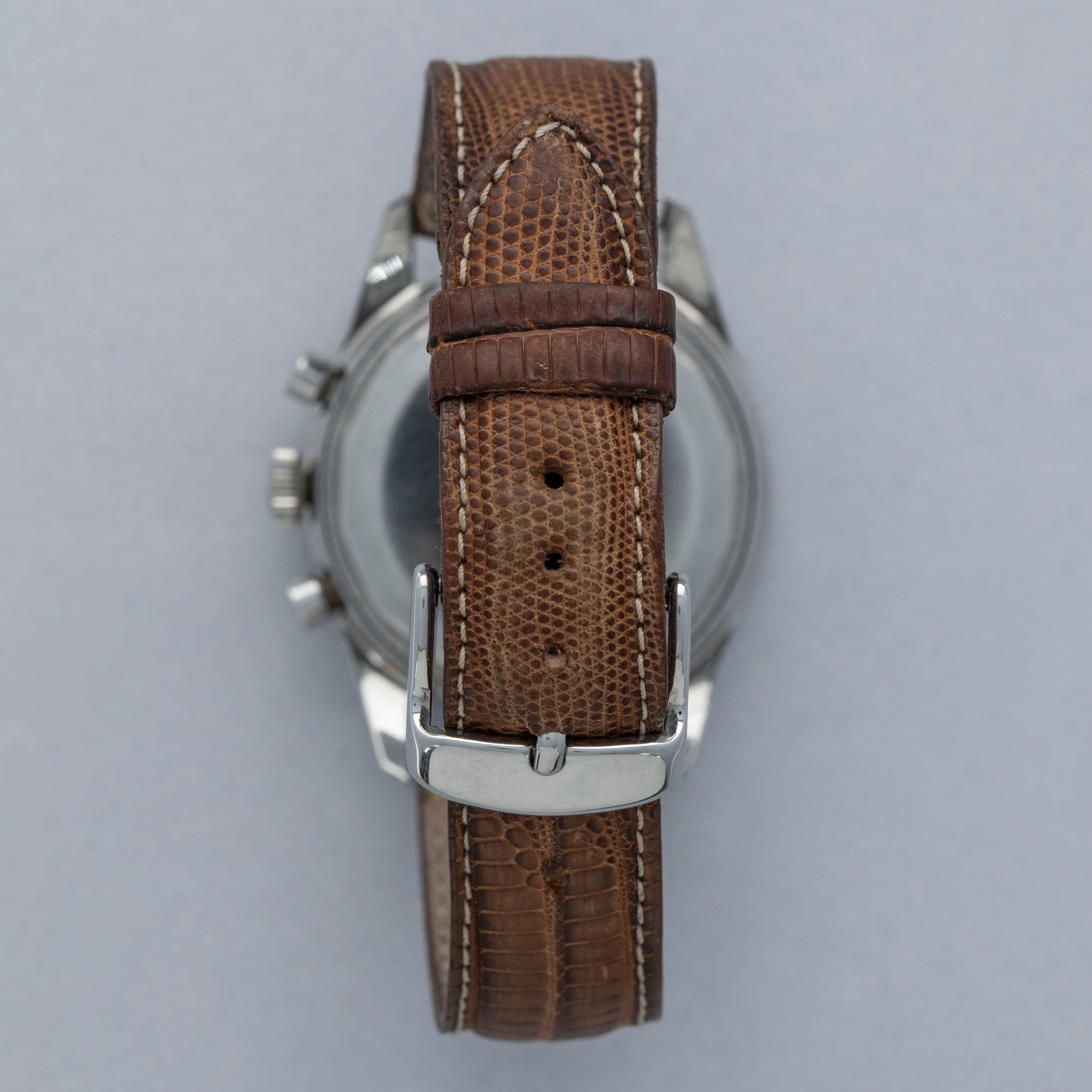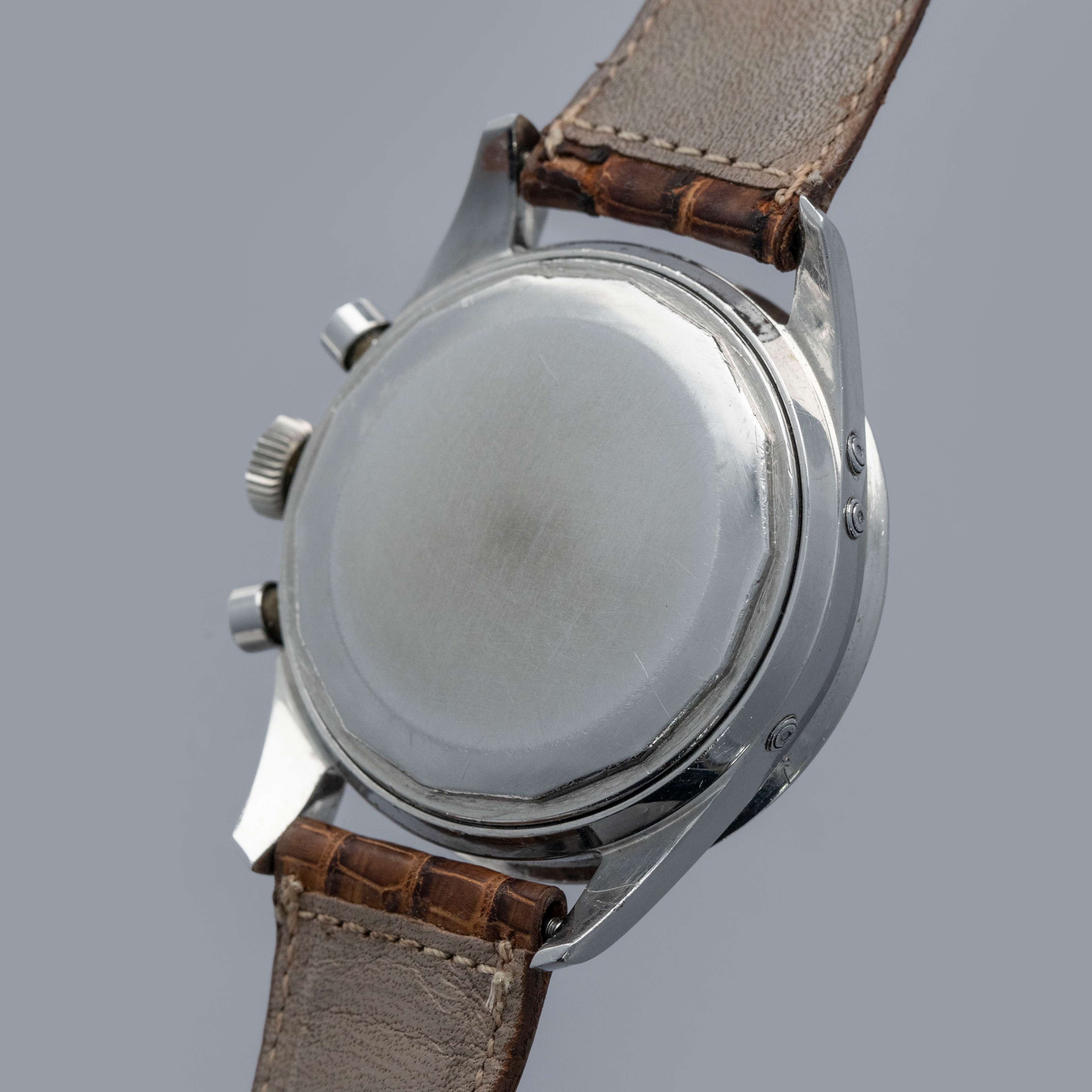 Watch is in overall very good condition. The steel case shows light surface scratches and small nicks as expected of a watch of this vintage. The tetradecagonal case back displays scuffs and marks, and the serial and reference number have been worn over time and are no longer visible. The steel bezel and black insert remain excellent, with some light surface marks visible on the insert. The dial shows light spotting on the sub-dials, while the hands have some surface scratches. It is fitted with a leather crocodile strap in very poor condition. Please note that this watch does not have a serial number.