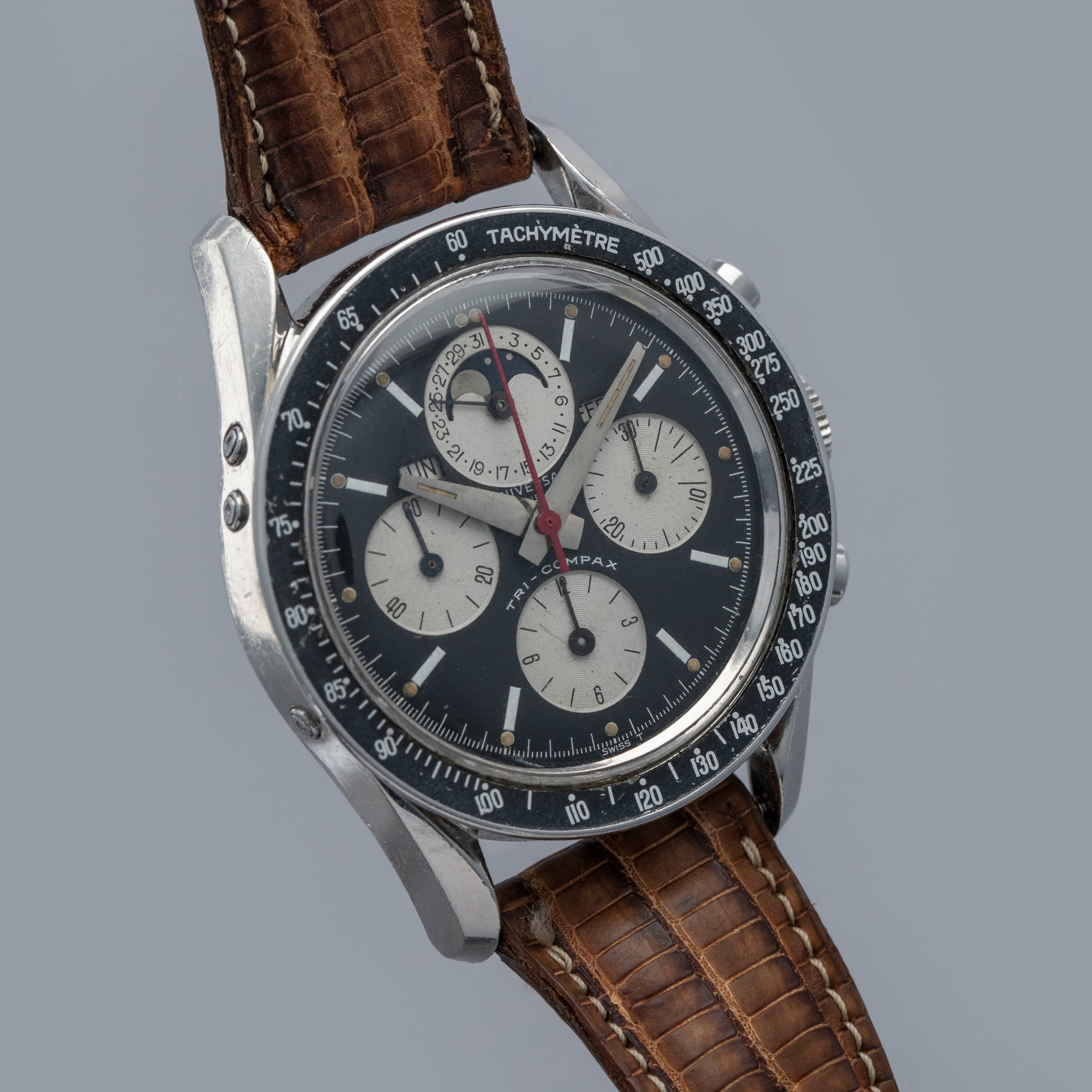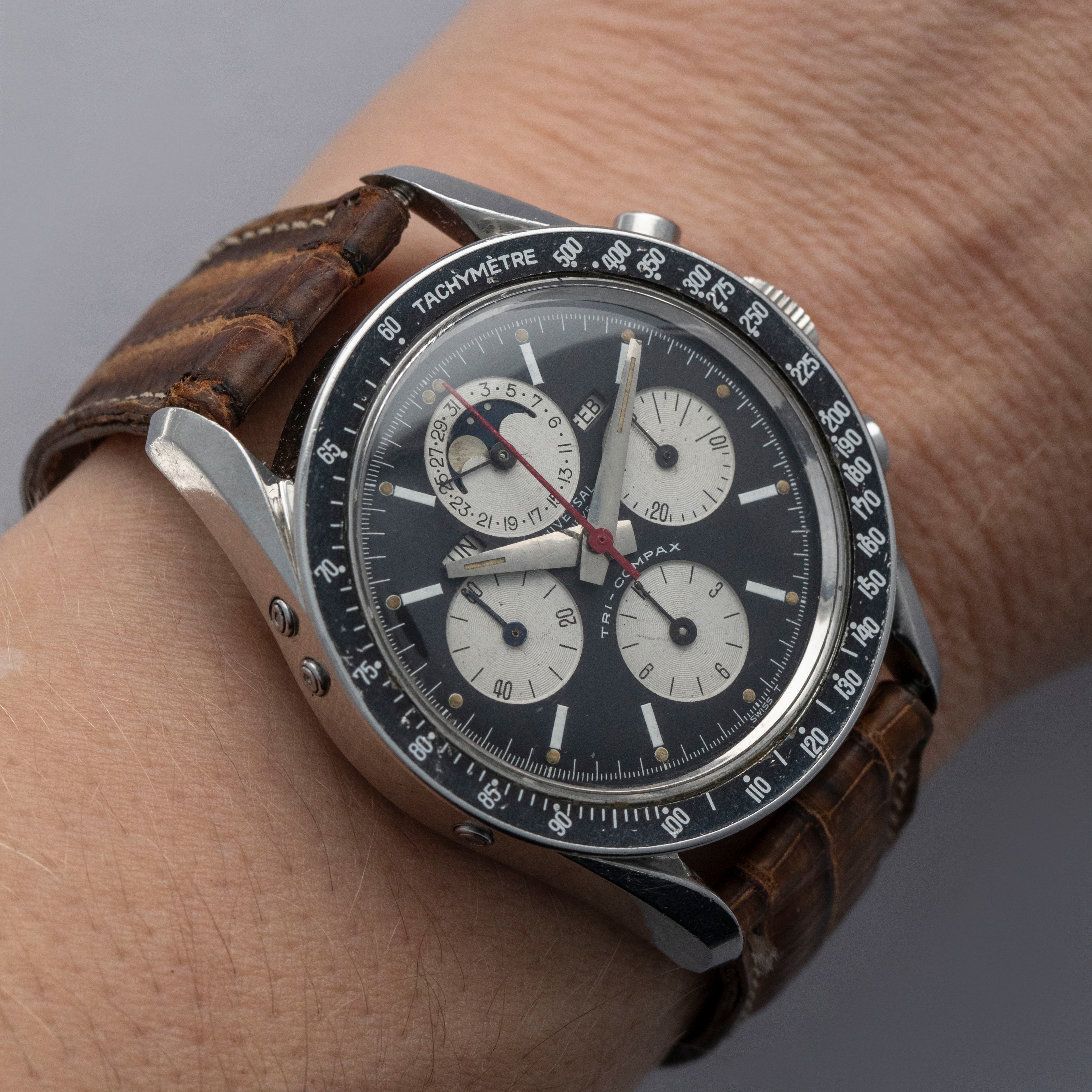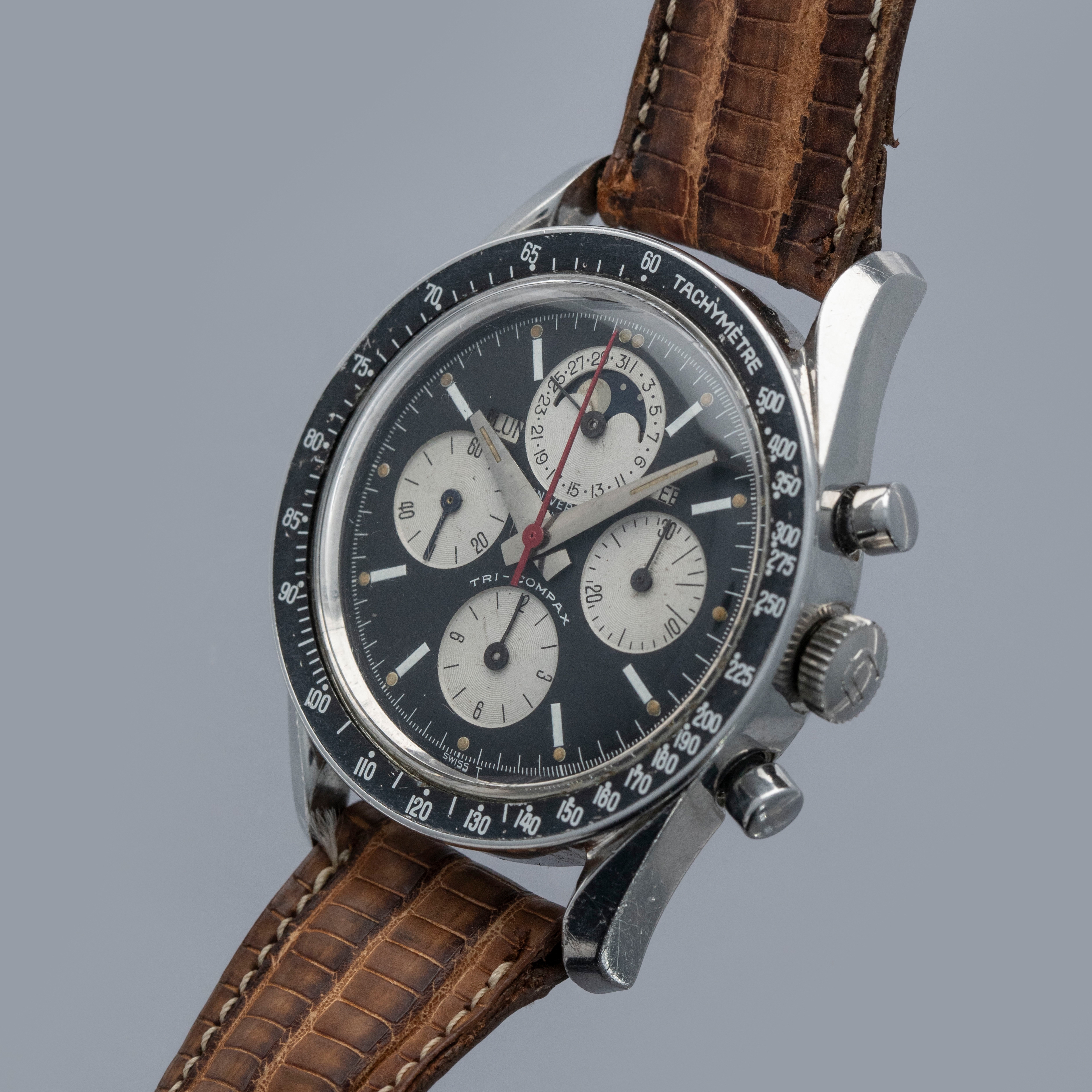 Amongst the list of watchmakers who weren’t lucky enough to make it out of the Quartz Crisis lies the name of perhaps one of watchmaking's most important companies, Universal Geneve. While they were revived and currently produce watches, their vintage pre-Quartz Crisis offerings are by far their most valuable and sought-after, and we are lucky enough to have one of those watches, the Tri-Compax "Evil Calpton" ref. 88101/2. Named after Eric Clapton, who became known for wearing the silver panda dial version of the TriCompax, the 'Evil' variant is distinguishable thanks to its black reverse panda dial. Featuring a 37mm case with twisted lyre lugs like those on the Speedmaster, the Tri-Compax is comfortable on the wrist, with its silhouette making a familiar profile on the wrist for any vintage chronograph aficionado. Featuring a black bezel to match its dial, this chronograph is an intensely stylish ensemble. Powered by the manual wind cal. 281 movement, the Tri-Compax features a running seconds subdial at 9 o'clock, a 12-hour chronograph subdial at 6 o'clock, a 30-minute chronograph subdial at 3 o'clock, and most interestingly a pointer date subdial complete with a moonphase indicator at 12 o’clock, which combines with the model’s three other subdials to create a wonderfully balanced display that caps off this iconic watch with a unique presence on the wrist thanks to its abundance of information and stylish design.