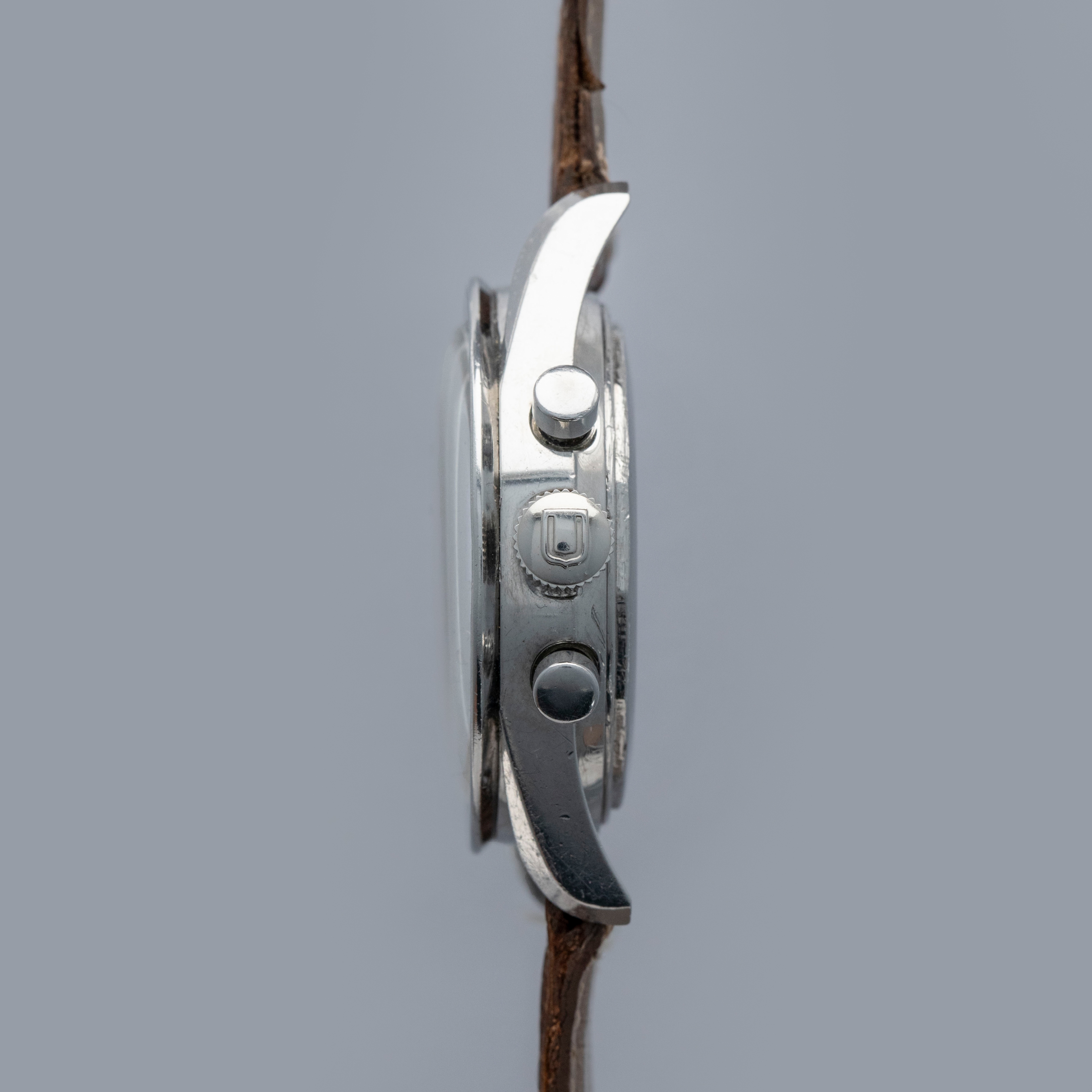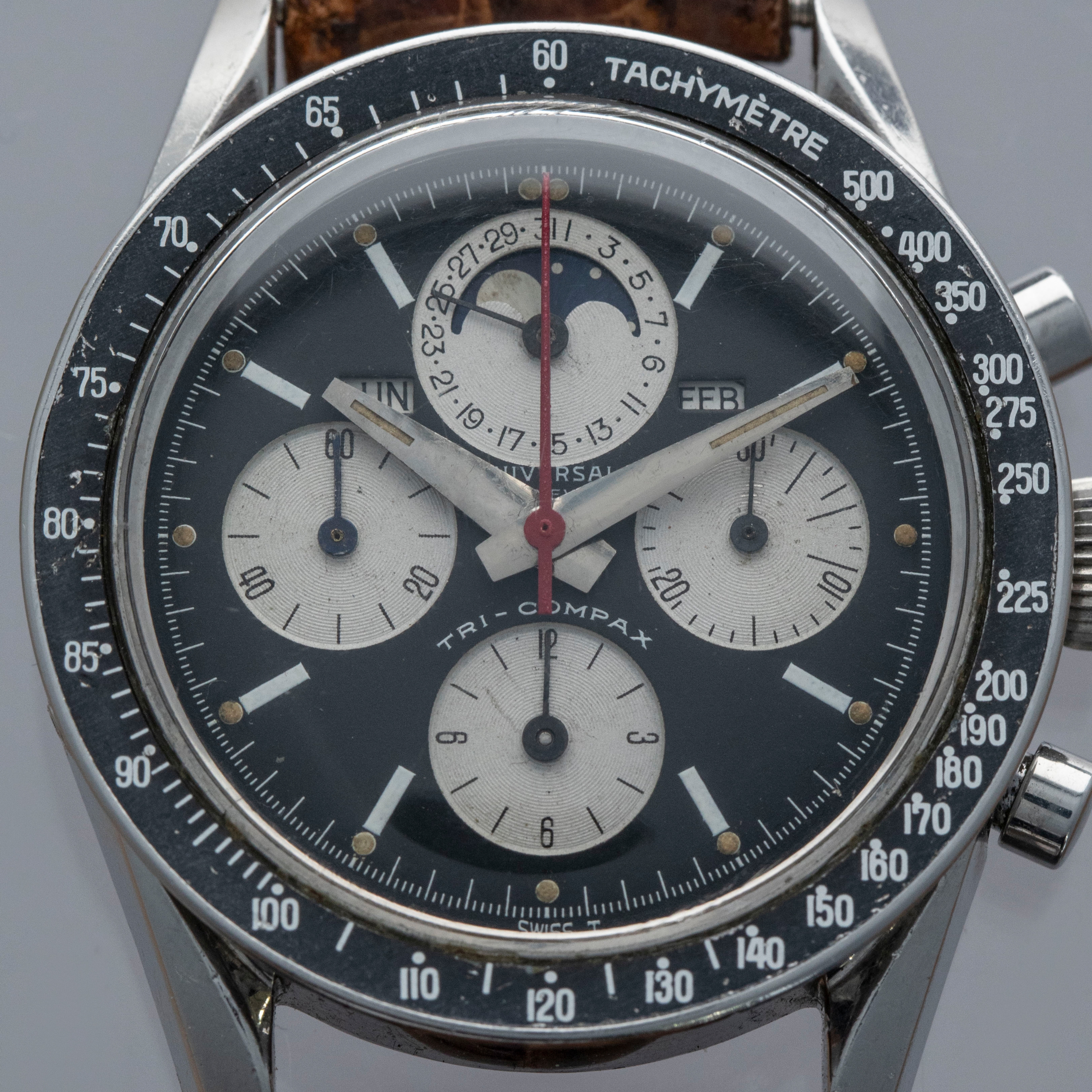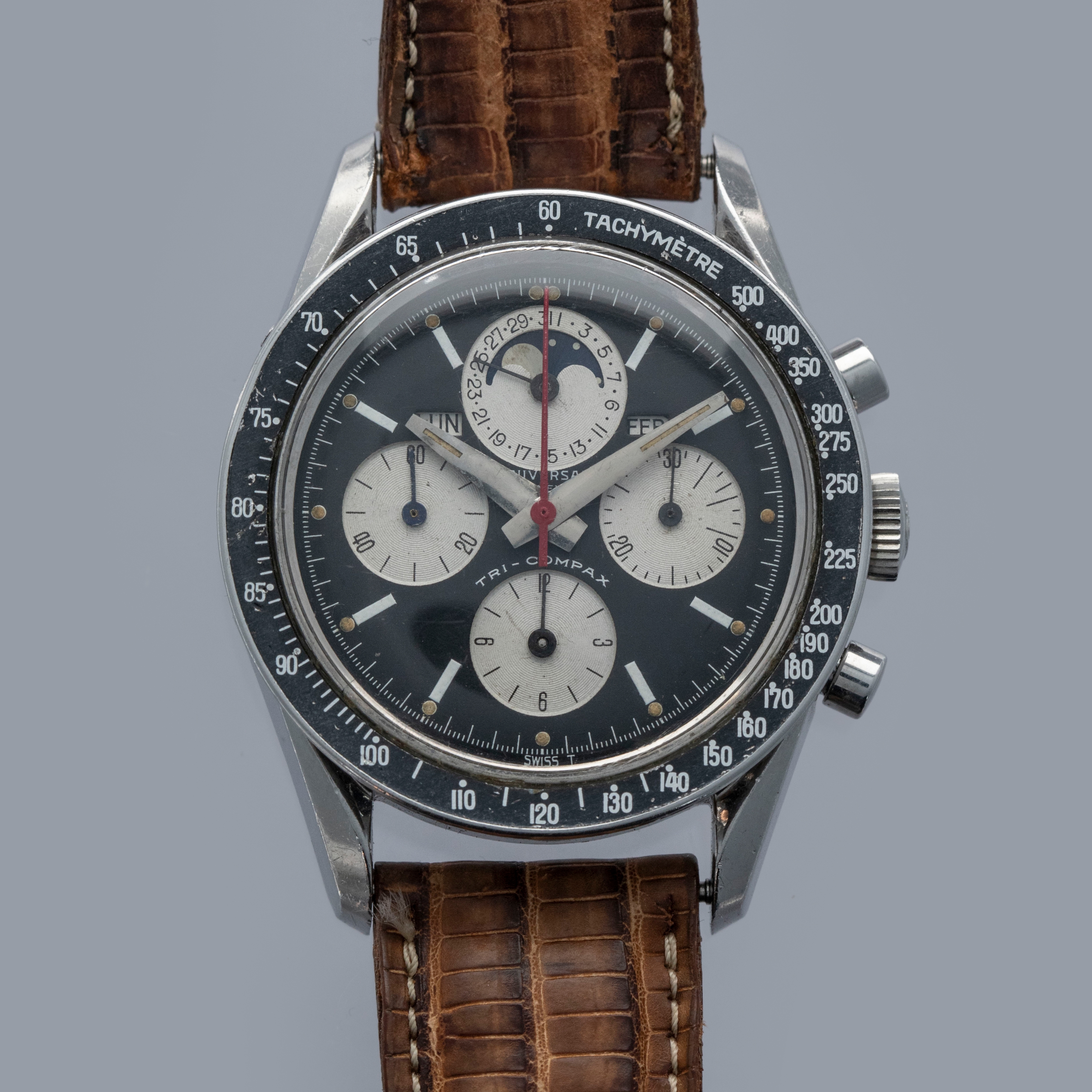 Amongst the list of watchmakers who weren’t lucky enough to make it out of the Quartz Crisis lies the name of perhaps one of watchmaking's most important companies, Universal Geneve. While they were revived and currently produce watches, their vintage pre-Quartz Crisis offerings are by far their most valuable and sought-after, and we are lucky enough to have one of those watches, the Tri-Compax "Evil Calpton" ref. 88101/2. Named after Eric Clapton, who became known for wearing the silver panda dial version of the TriCompax, the 'Evil' variant is distinguishable thanks to its black reverse panda dial. Featuring a 37mm case with twisted lyre lugs like those on the Speedmaster, the Tri-Compax is comfortable on the wrist, with its silhouette making a familiar profile on the wrist for any vintage chronograph aficionado. Featuring a black bezel to match its dial, this chronograph is an intensely stylish ensemble. Powered by the manual wind cal. 281 movement, the Tri-Compax features a running seconds subdial at 9 o'clock, a 12-hour chronograph subdial at 6 o'clock, a 30-minute chronograph subdial at 3 o'clock, and most interestingly a pointer date subdial complete with a moonphase indicator at 12 o’clock, which combines with the model’s three other subdials to create a wonderfully balanced display that caps off this iconic watch with a unique presence on the wrist thanks to its abundance of information and stylish design.