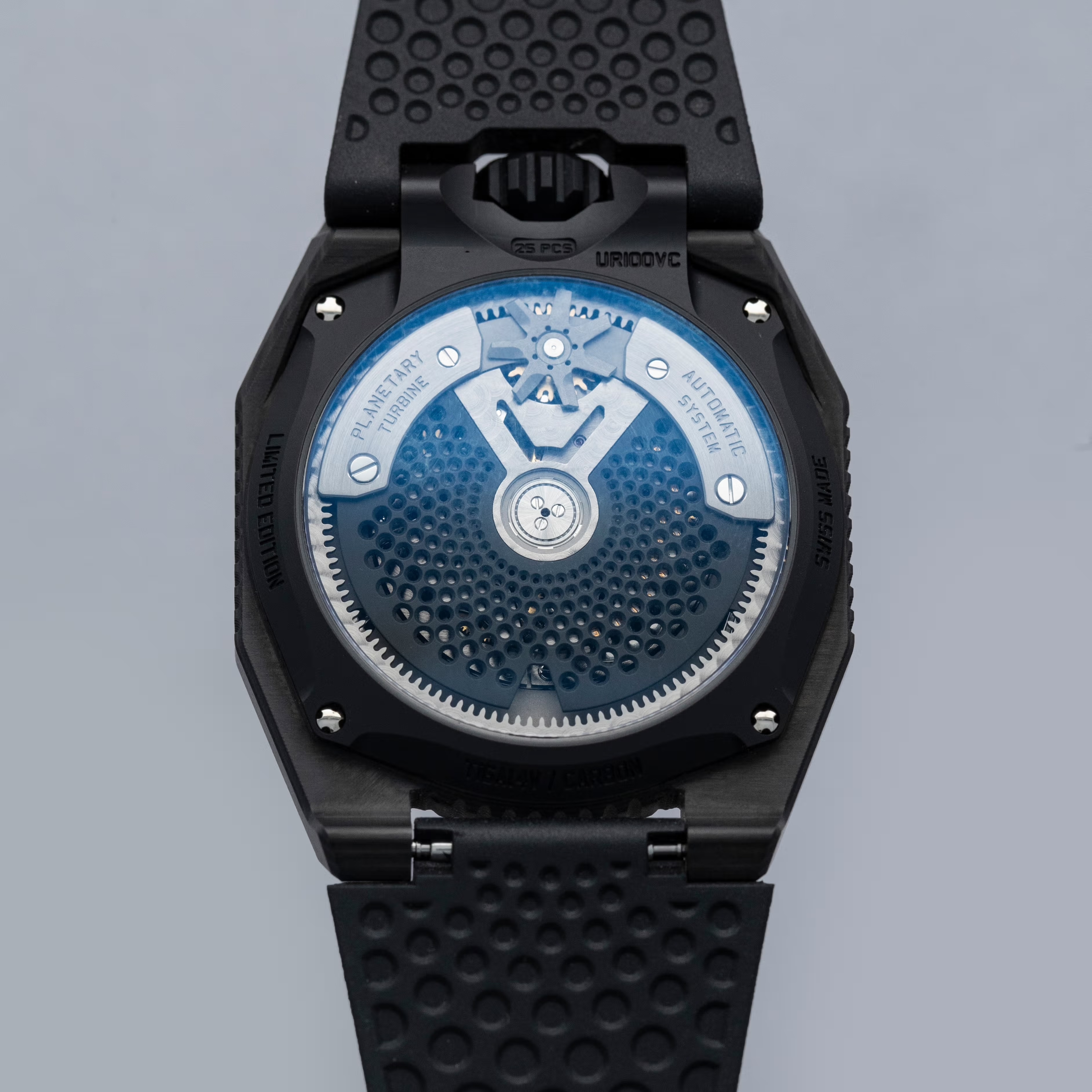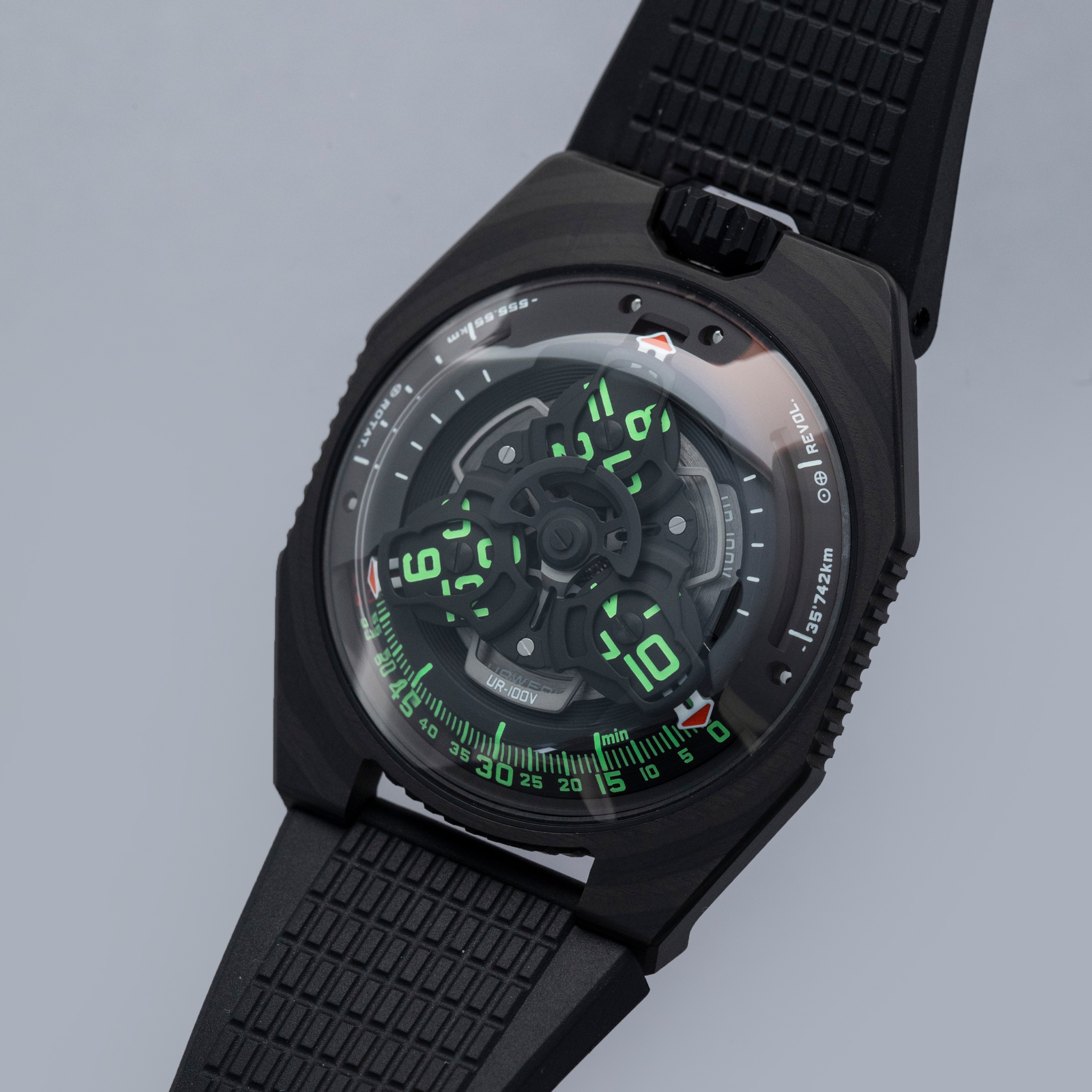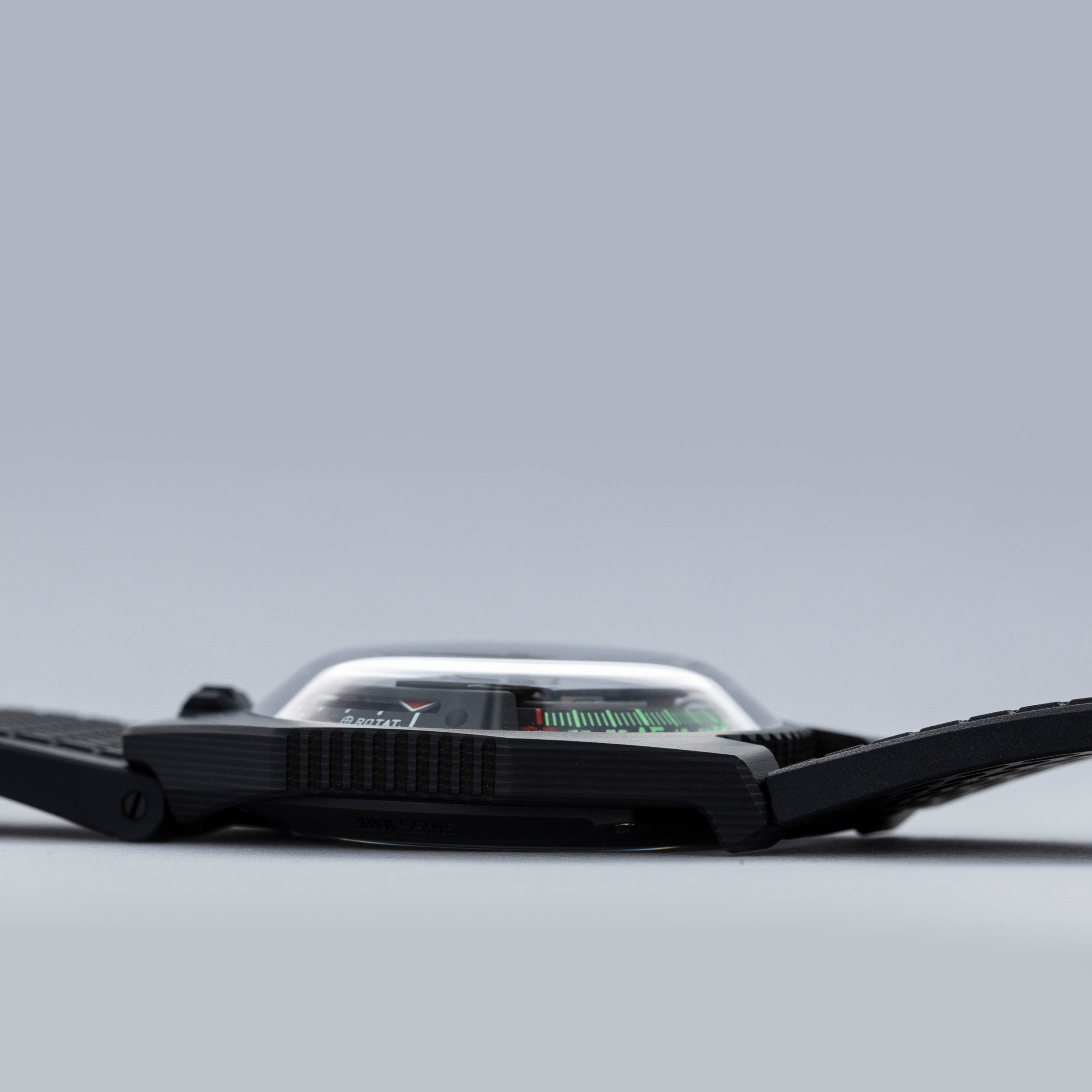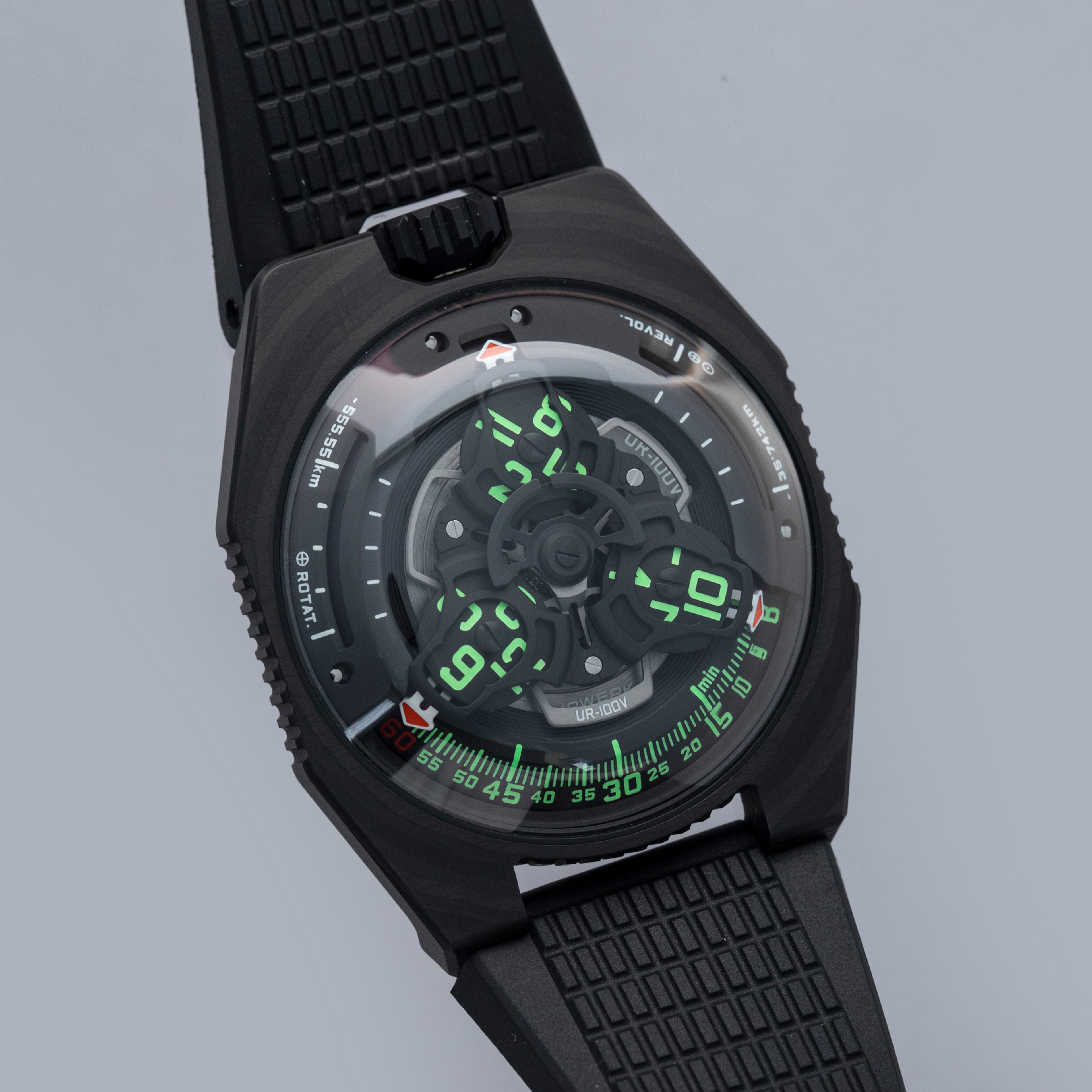 Made of 52 ultra-thin layers of 'carbon thin ply' that are compressed in epoxy polymer resin, the UR-100V C52's blacked-out case includes a marbling specific to carbon fiber along with a matte finish that allows this watch to wear more subtly on the wrist than one might assume at first glance.