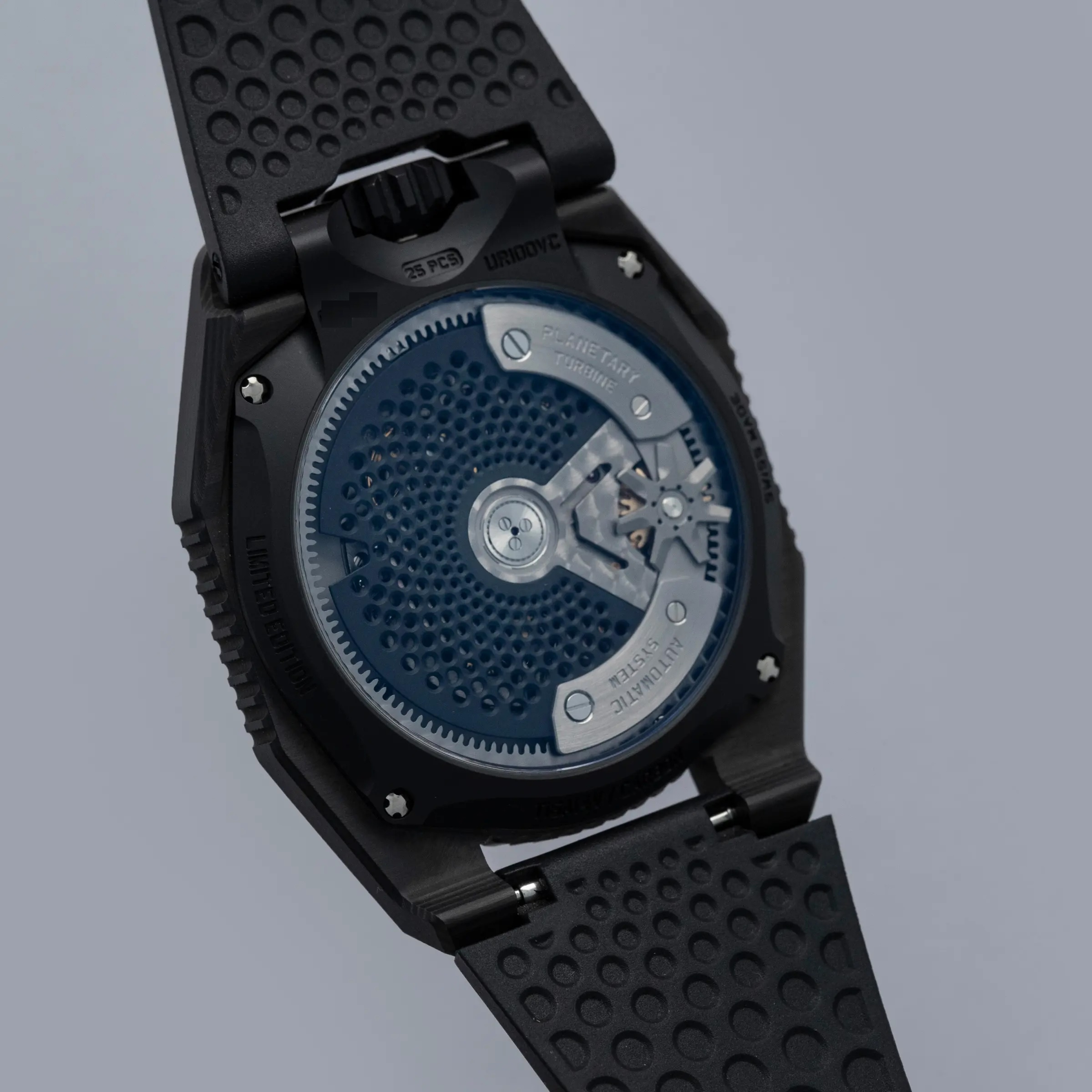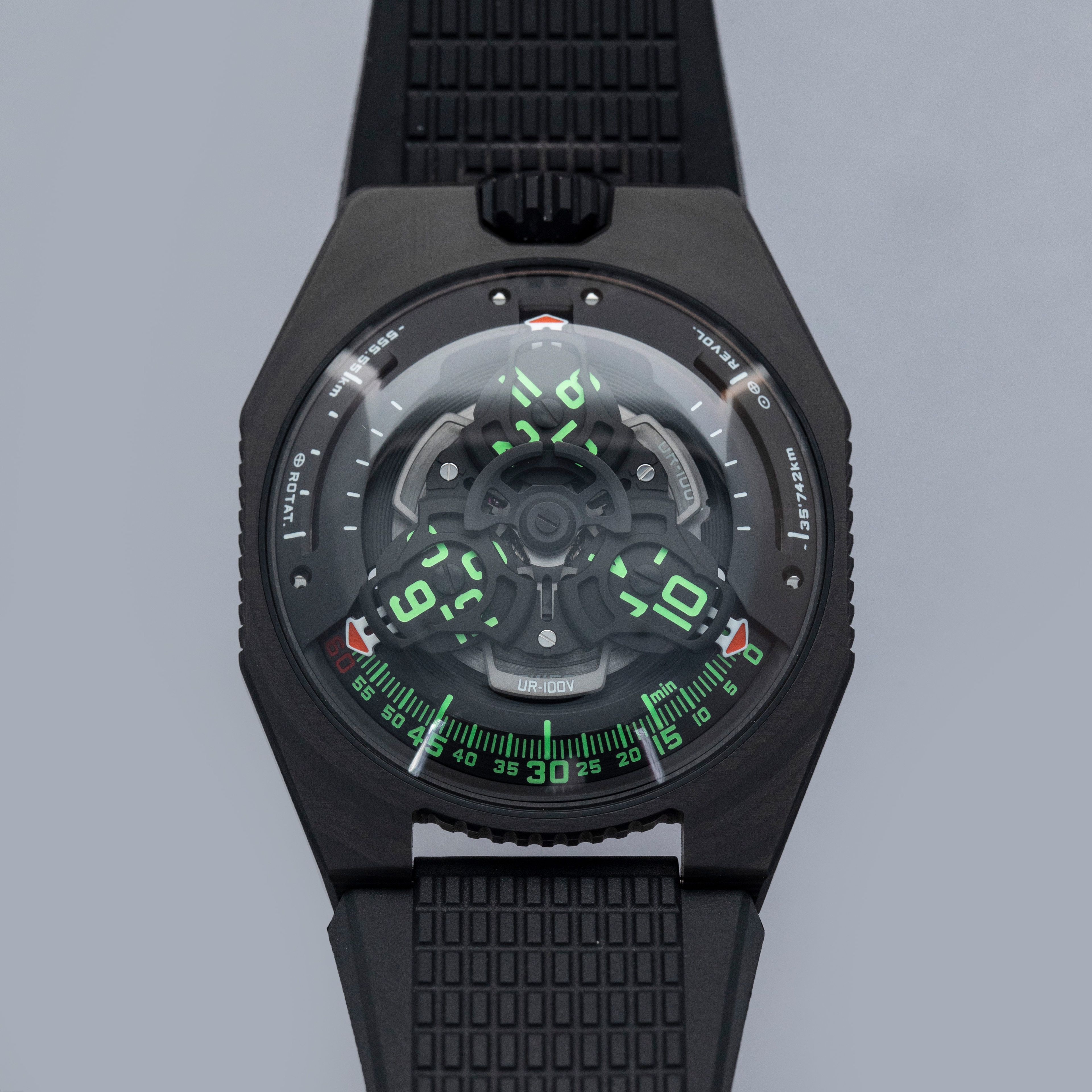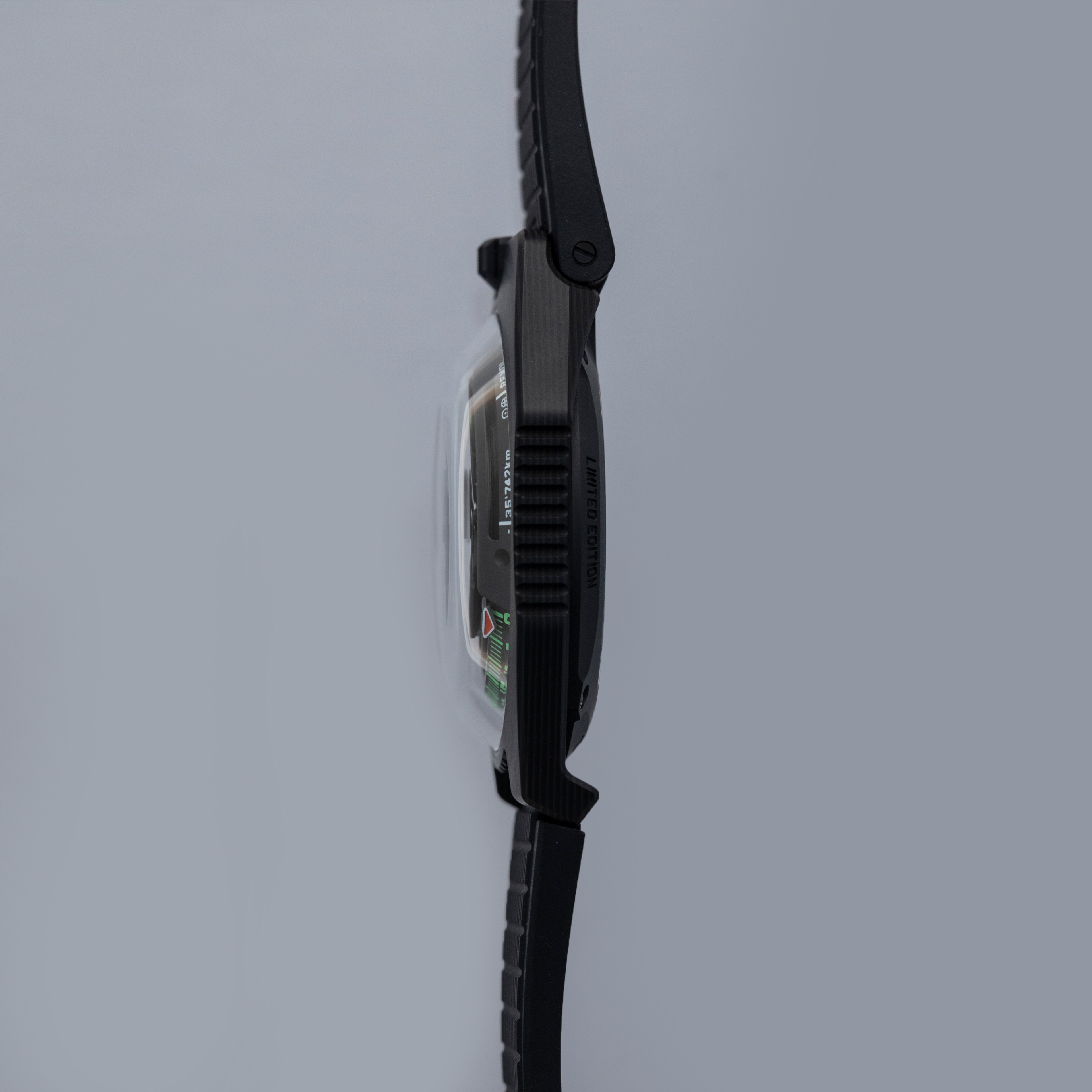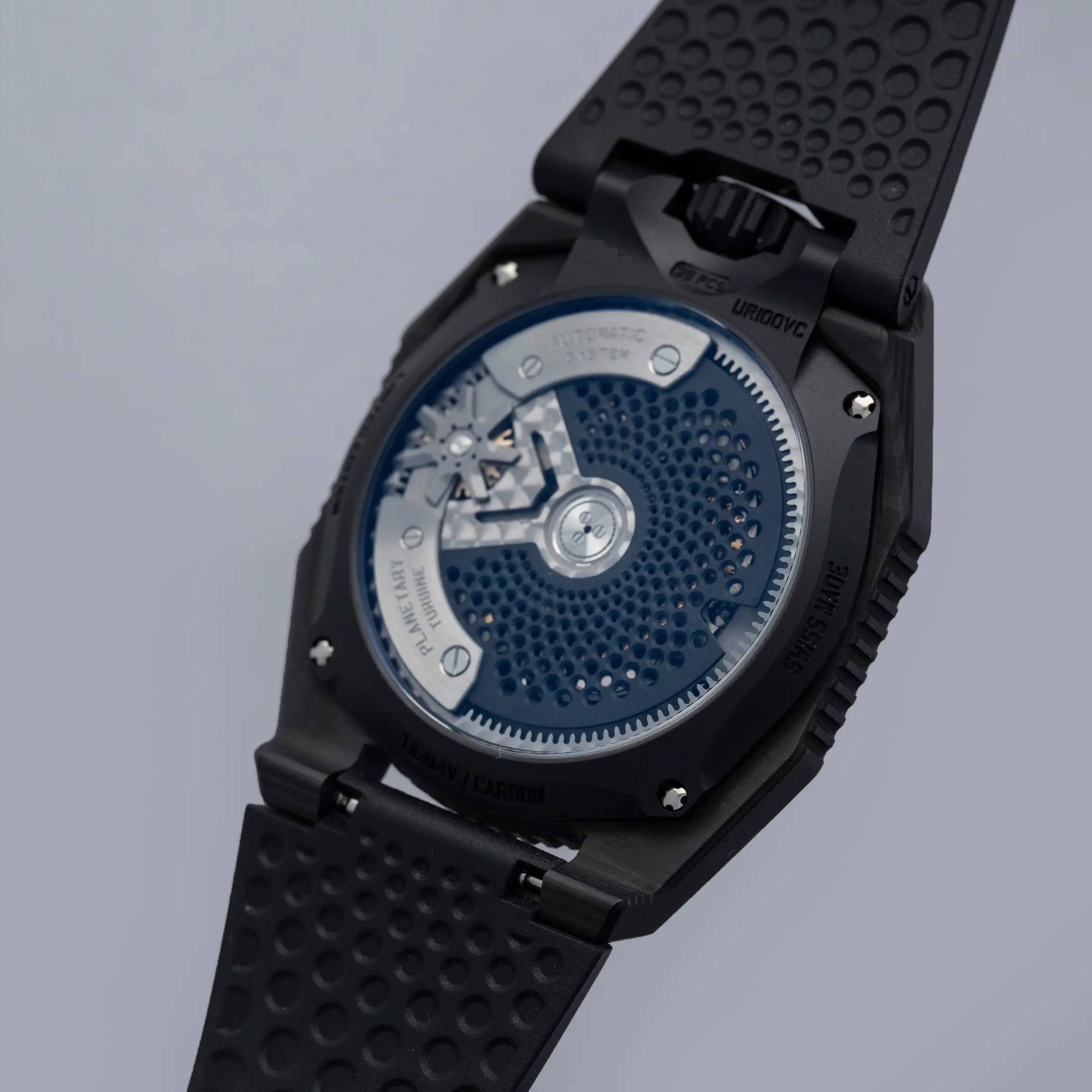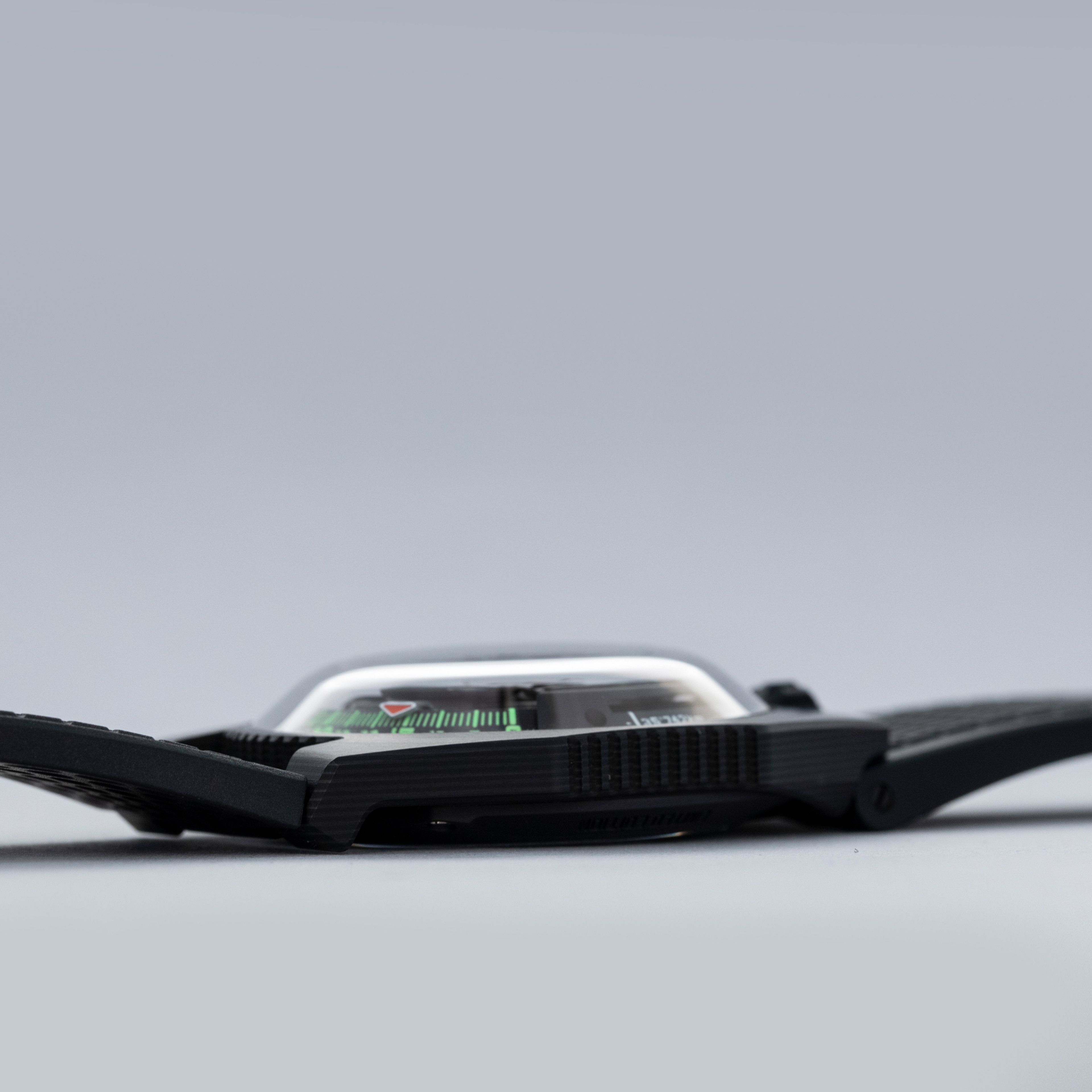 Made of 52 ultra-thin layers of 'carbon thin ply' that are compressed in epoxy polymer resin, the UR-100V C52's blacked-out case includes a marbling specific to carbon fiber along with a matte finish that allows this watch to wear more subtly on the wrist than one might assume at first glance.