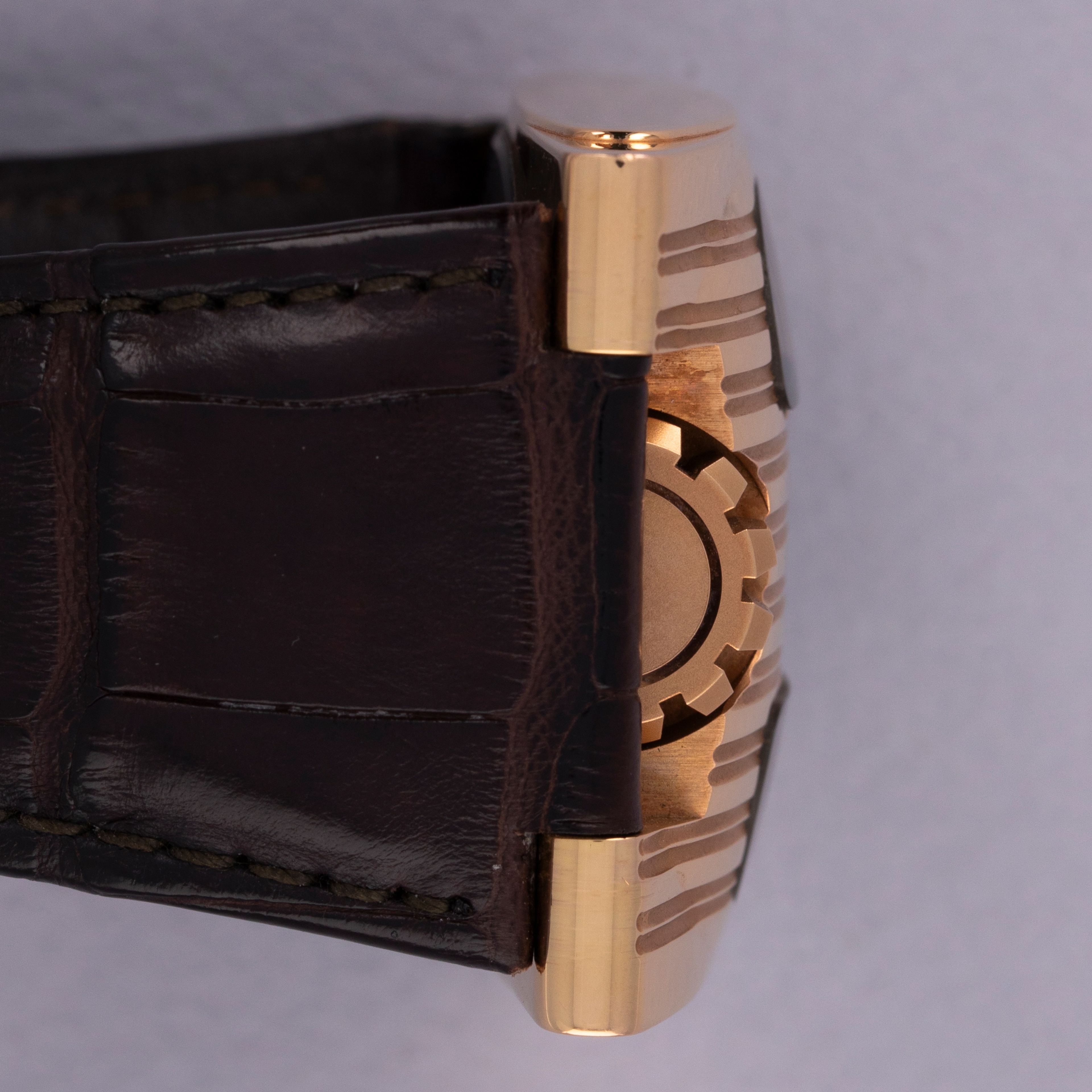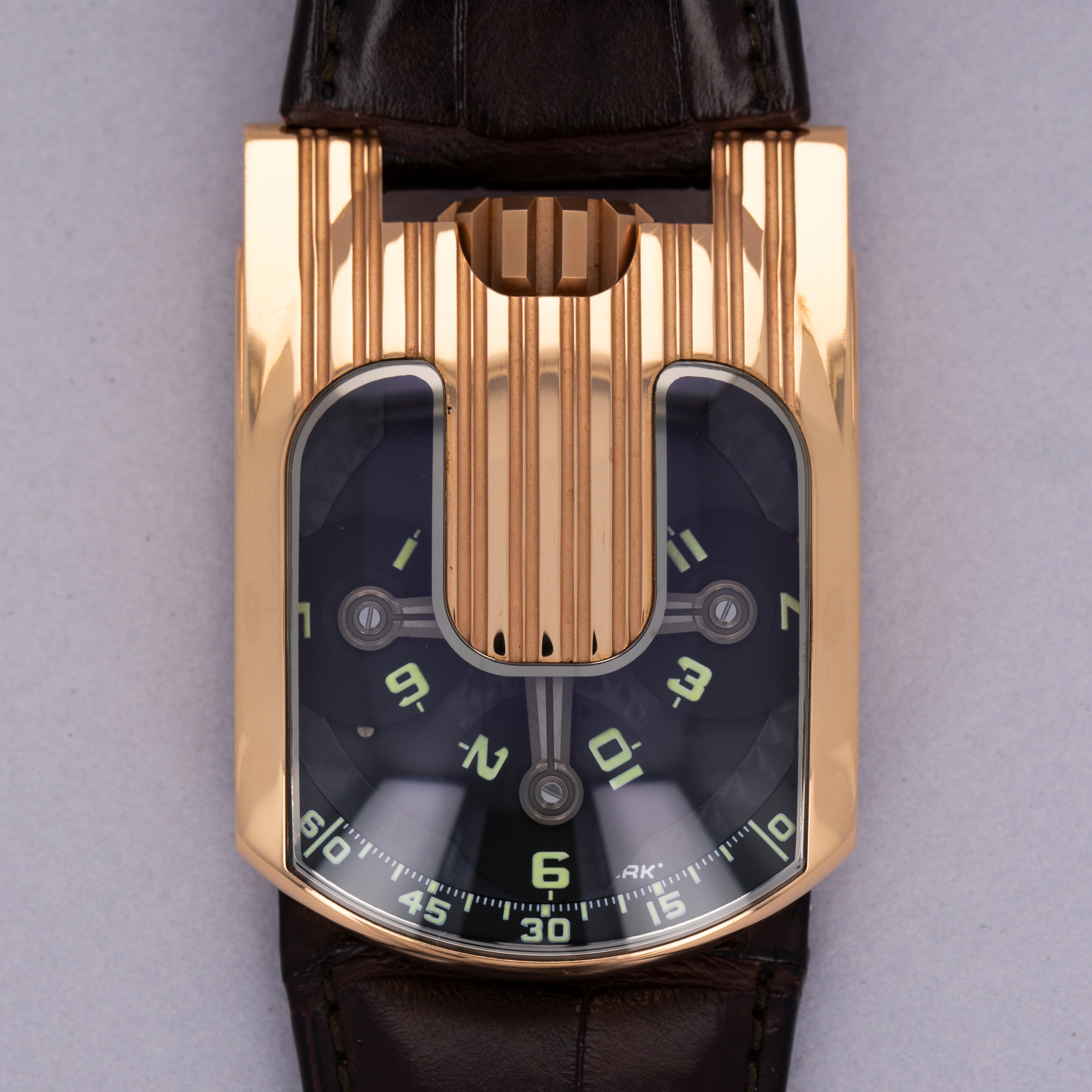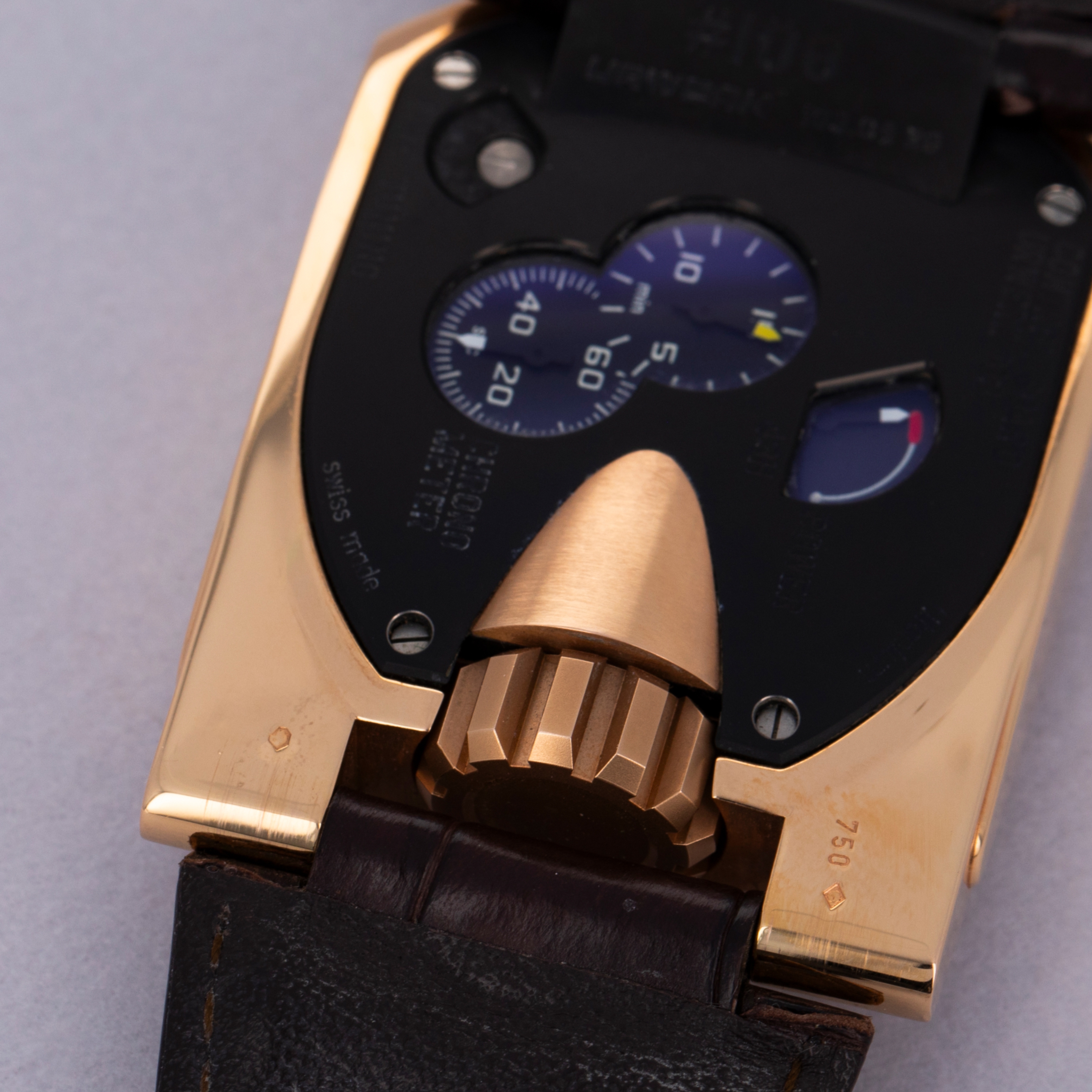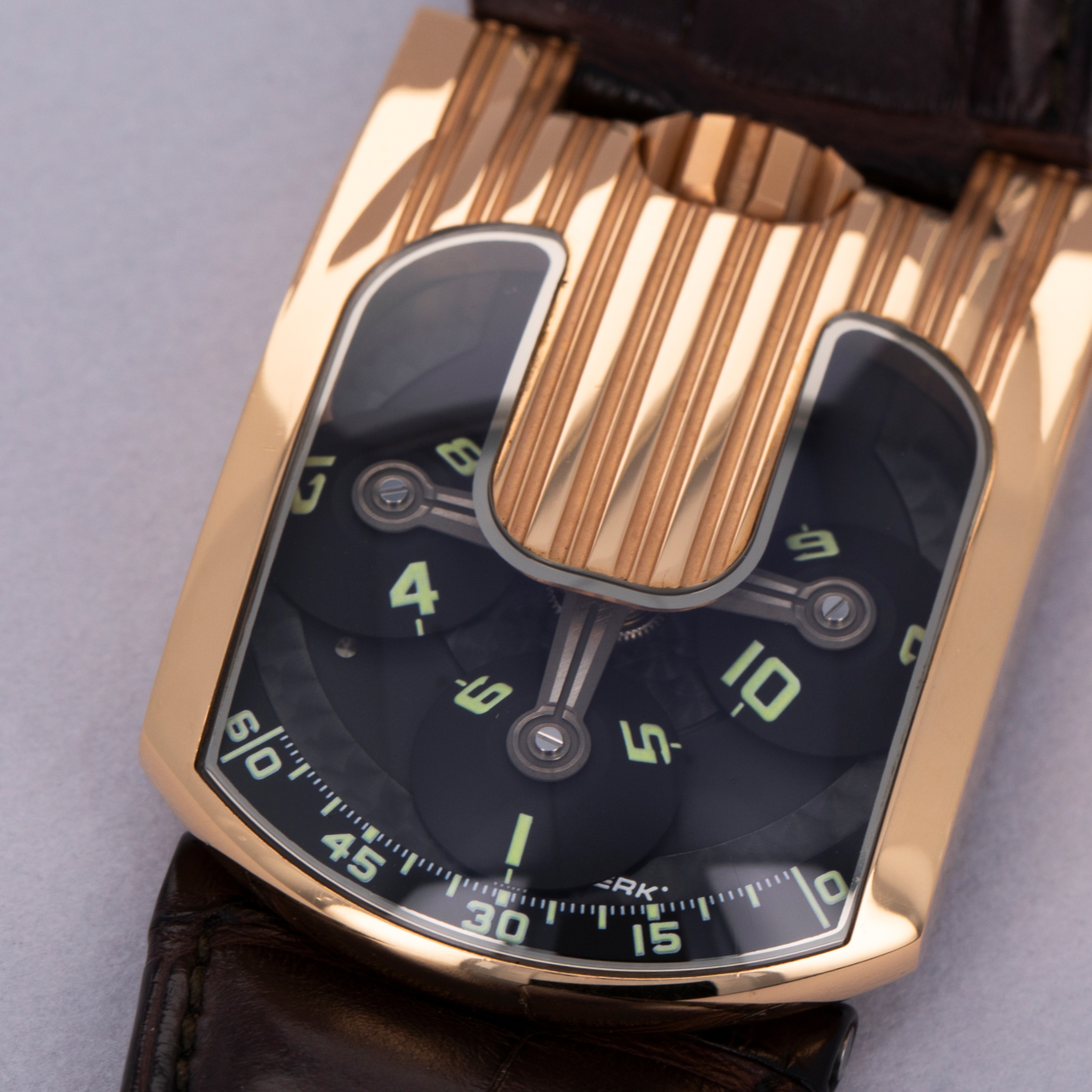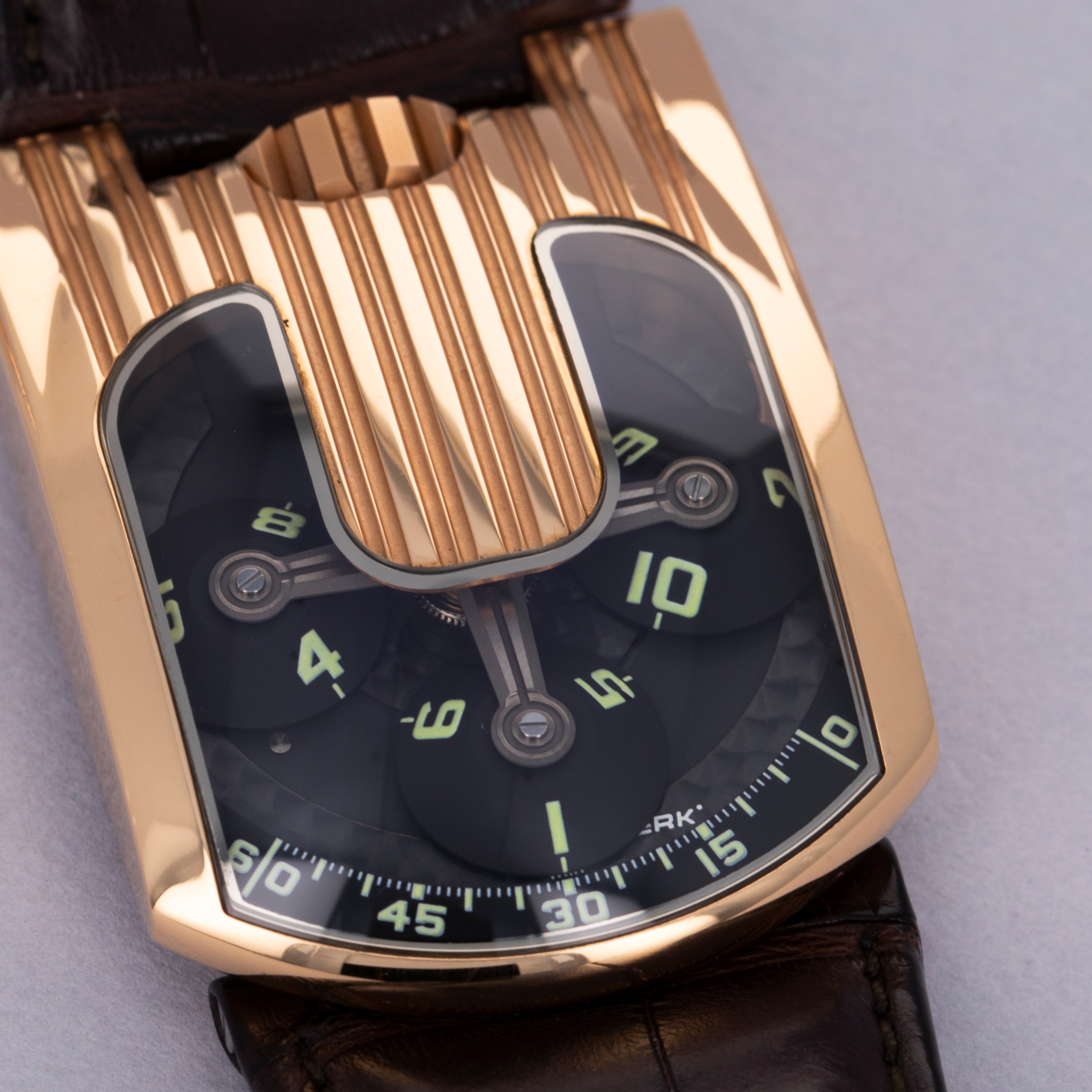 An eclectic blend of avant-garde space-inspired design language and luxury, the UR-103's 36mm x 49mm 18kt rose gold case is emblematic of Urwerk's unique styling, with its ridged top, large crown, and U-shaped sapphire crystal standing as a testament to that.