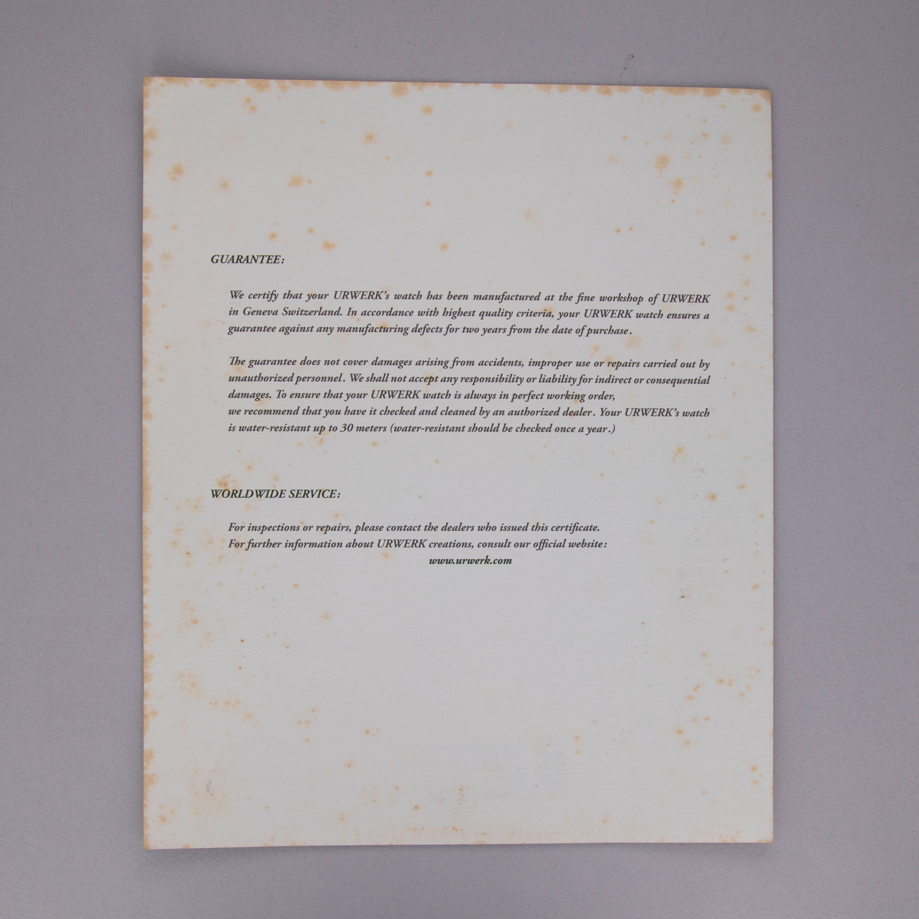 Watch is in excellent condition. Case shows minor surface wear, with some hairlines visible along the polished case surface. The caseback apertures show some debris trapped along the crystal edge. Original guarantee certificate is spotted with age as seen in the images.