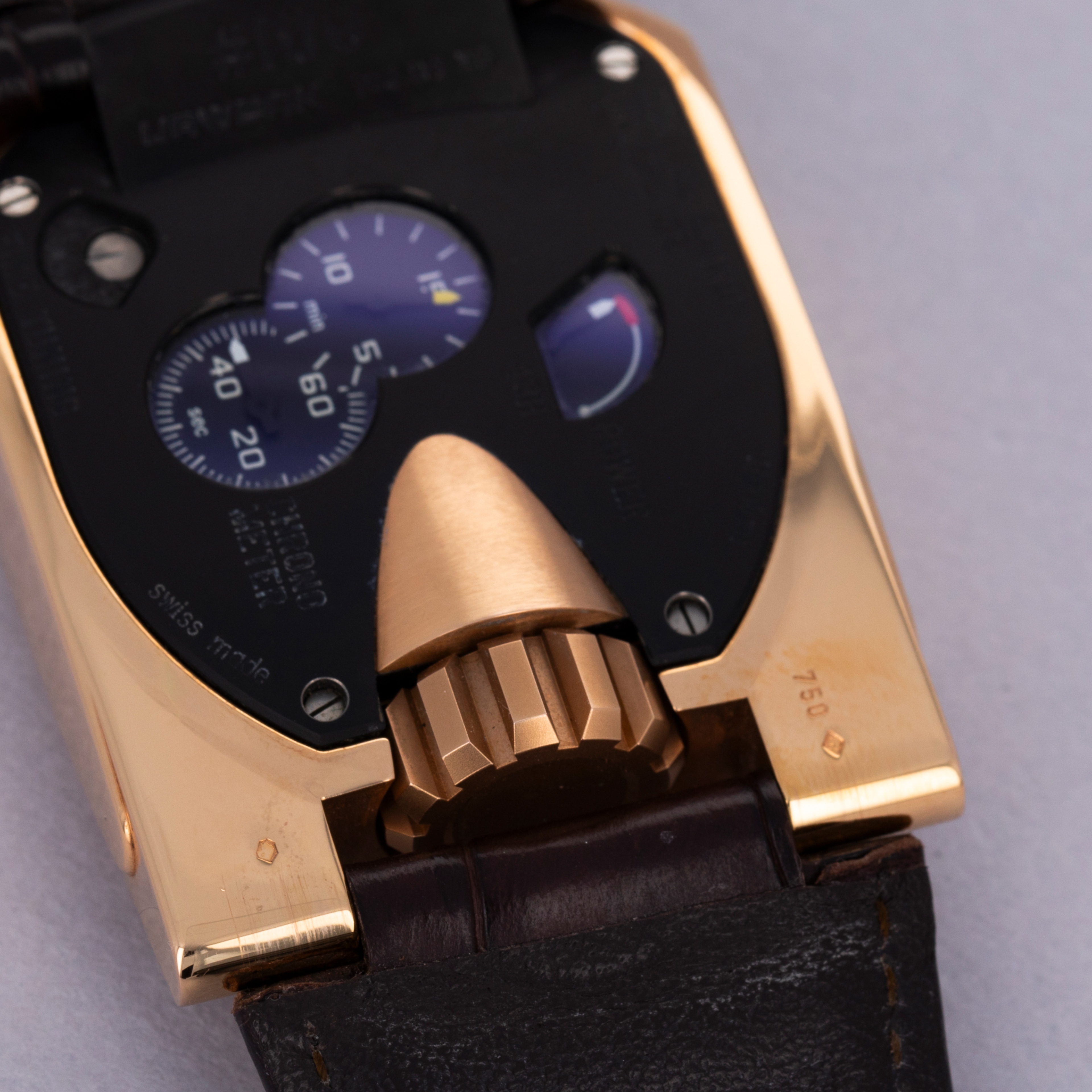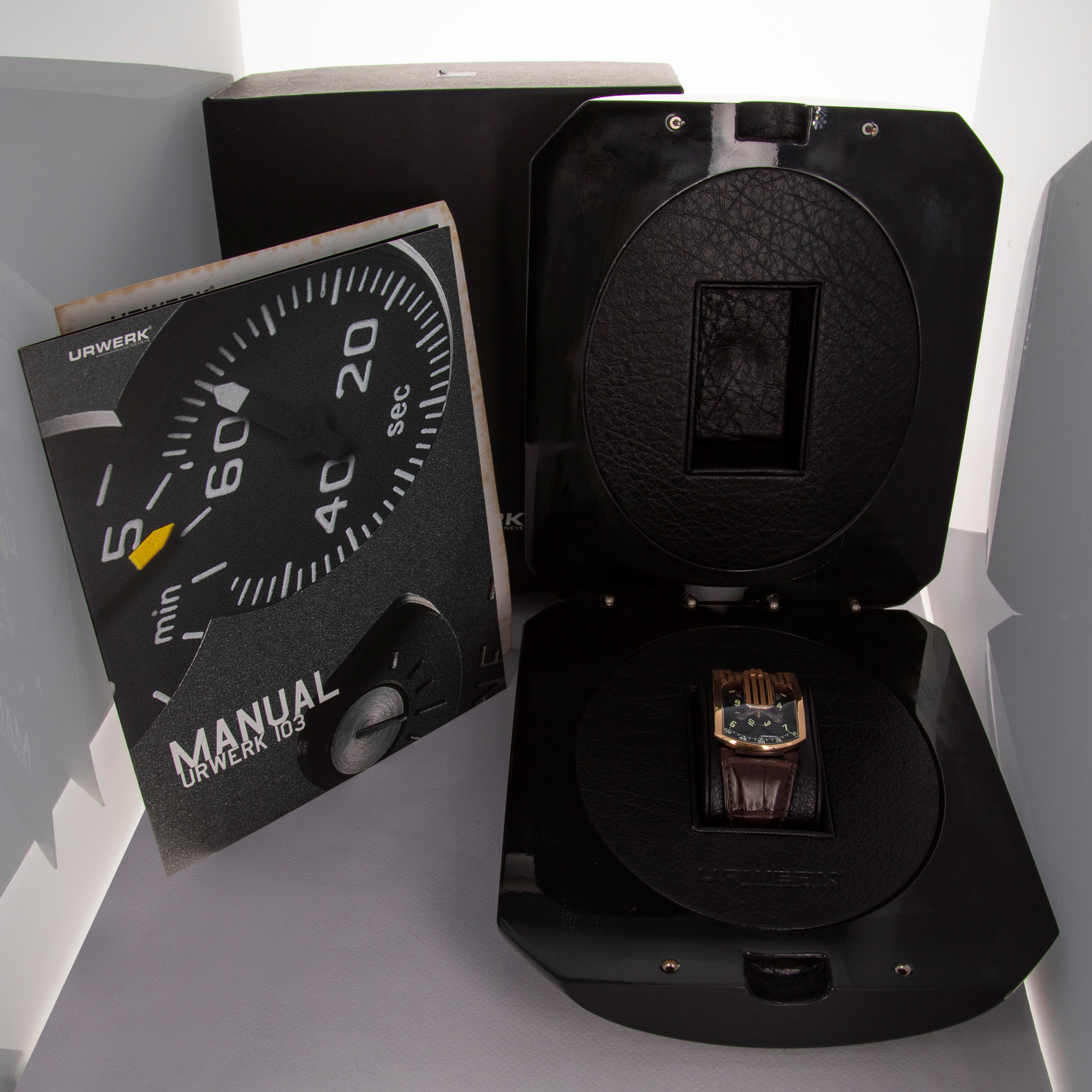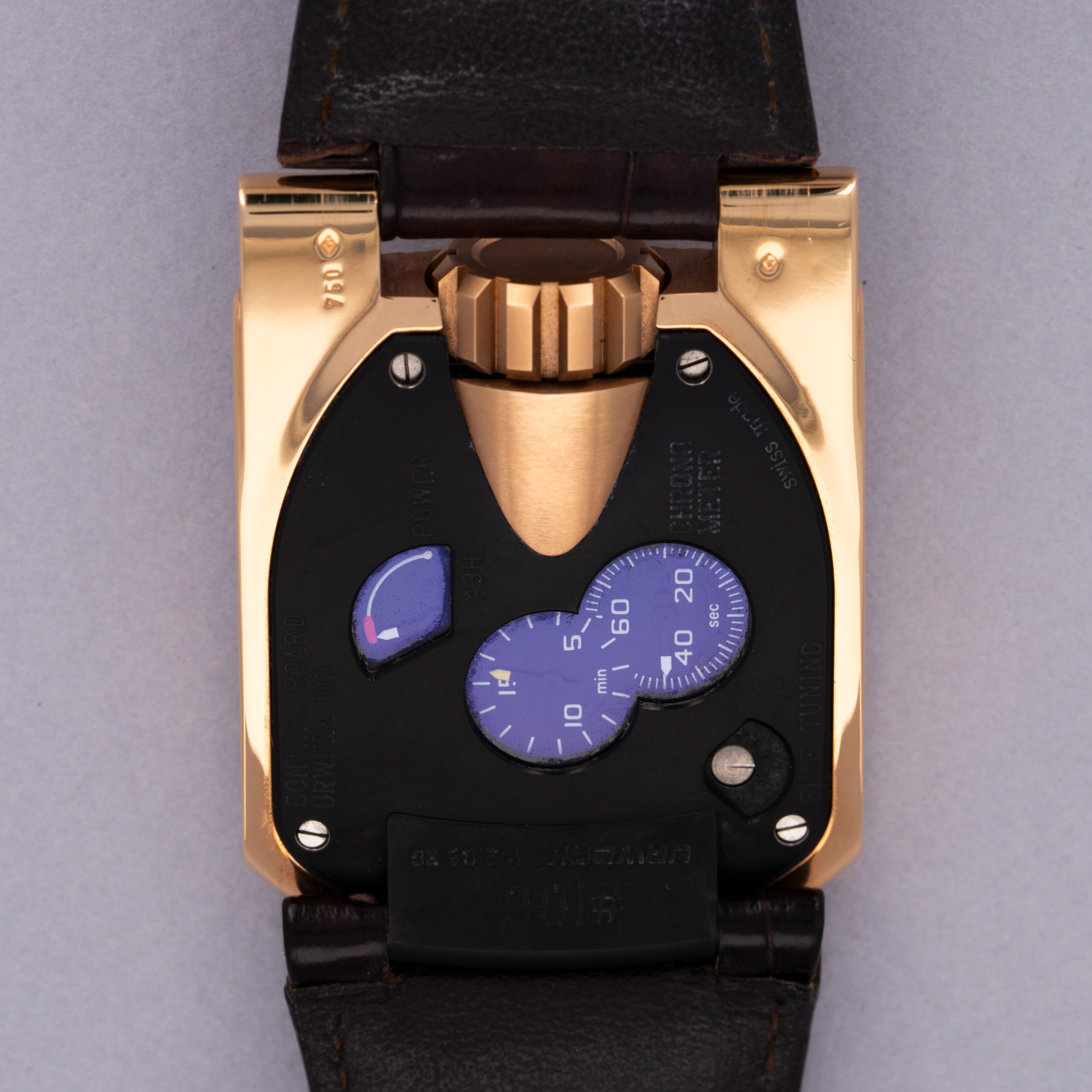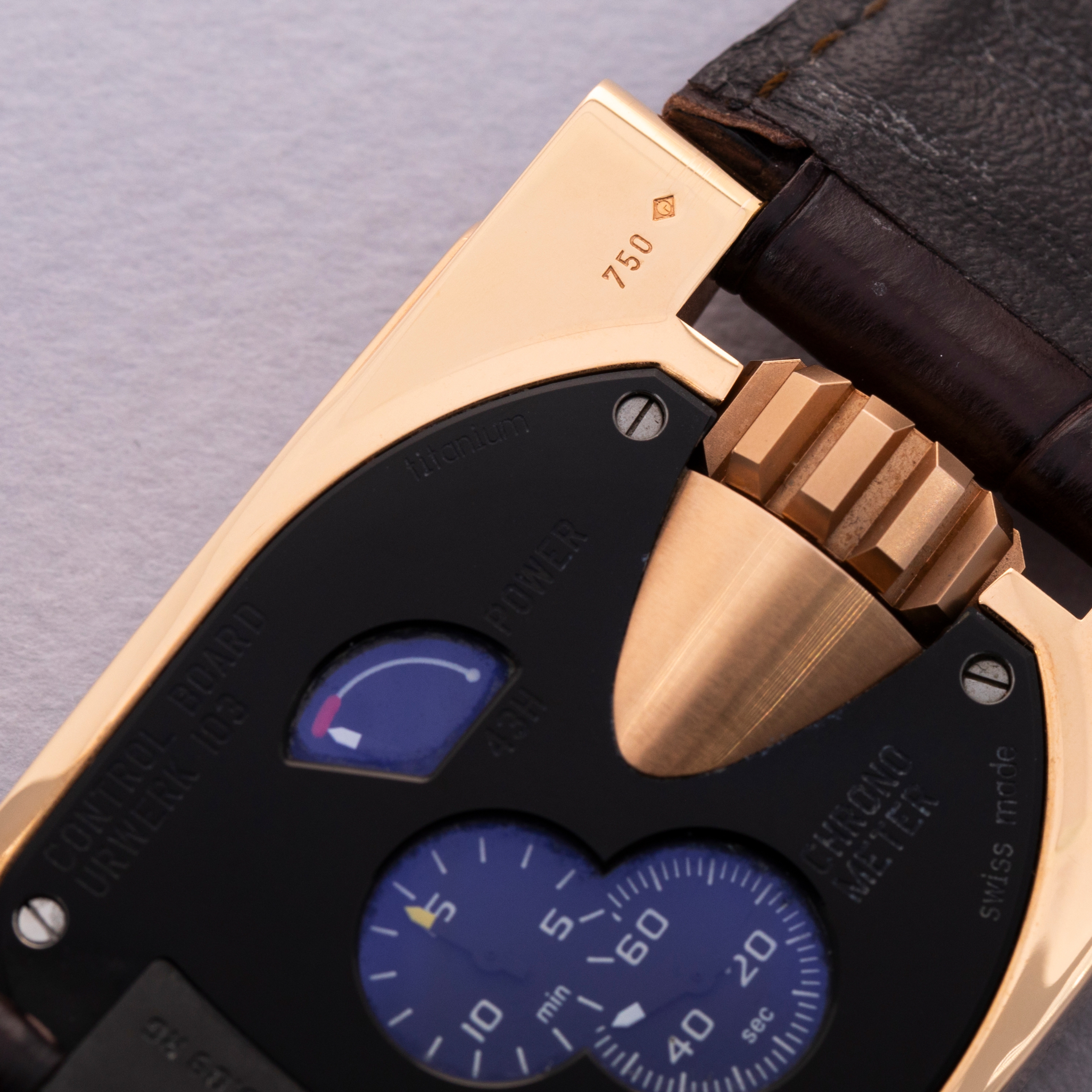 The world of independent watchmaking is a colorful place with hundreds of brands all vying to create some of the most unique and wonderful watches the industry has seen. Natuarally, some brands have proven to be more successful than others, one such brand being Urwerk. Founded in 1997 by Martin Frei and Felix Baumgartner, Urwerk’s mission has always been to create Haute Horlogerie timepieces that fuse their love of traditional watchmaking with a futuristic aesthetic that seems to have been lifted straight out of a sci-fi novel. With their distinctive case shapes and signature satellite hour markers, their timepieces have become some of horology’s most sought-after watches, one such being the model we have here, the UR-103 ref. 103.09 that we have here. Launched in 2003 and boasting a large 36mm x 49mm case in 18kt rose gold, the UR-103 is certainly a luxurious timepiece, but through its satellite hour marker display, unique case design, and unusual profile, the UR-103 fits on the wrist like a spaceship. Featuring a ridged and partially domed top that runs onto its sapphire crystal, the UR-103 wears like nothing else on the market outside of Urwerk’s exceptional offerings. With a control board, as Urwerk calls it, on its caseback – inspired by vintage marine chronometers, the UR-103 reveals its power reserve indicator and chrono meter which is used for precise time-setting. A thoroughly unique watch unlike anything else on the market, it is timepiece like this that reveal why Urkwerk are championed for their free-thinking design language and exceptional craftsmanship.
