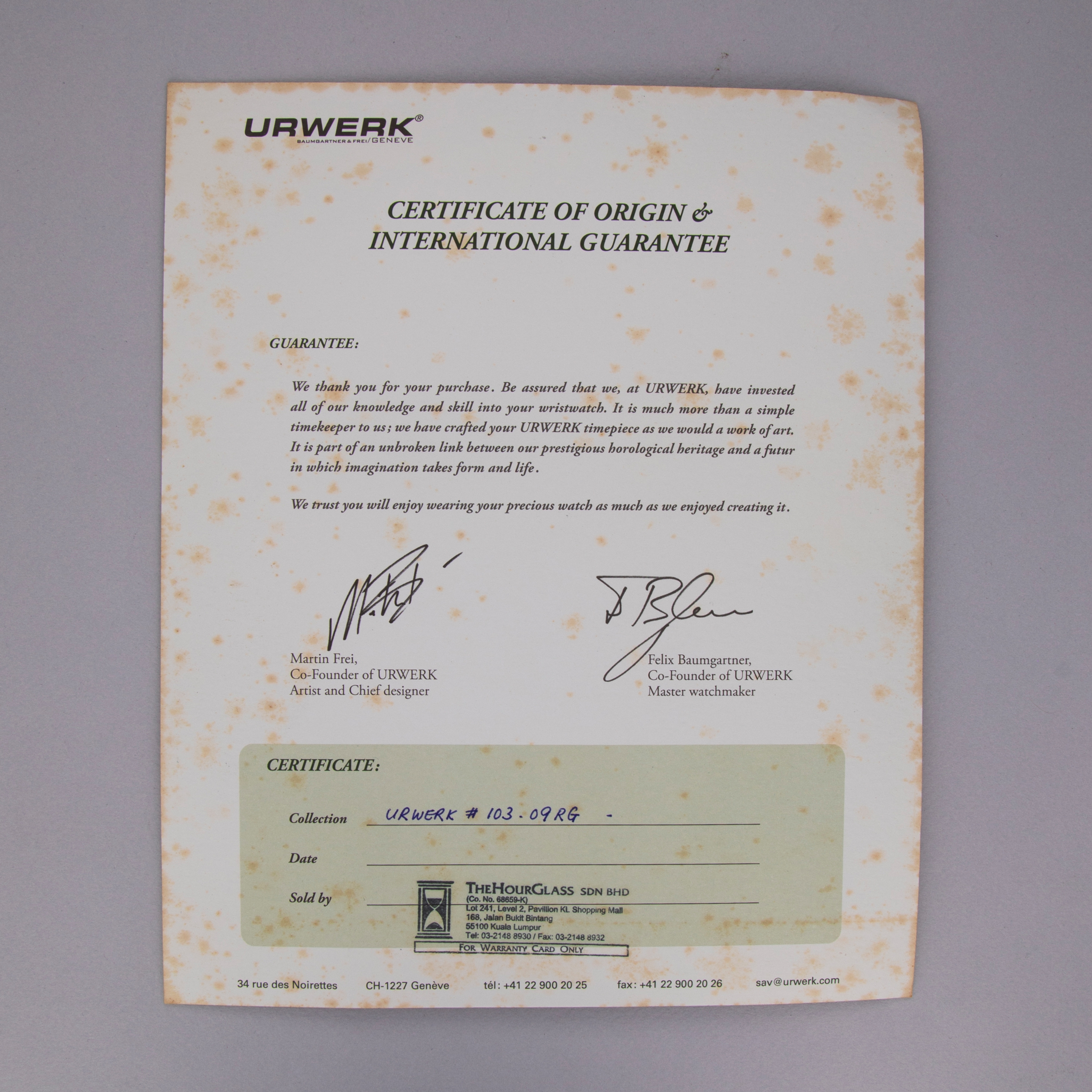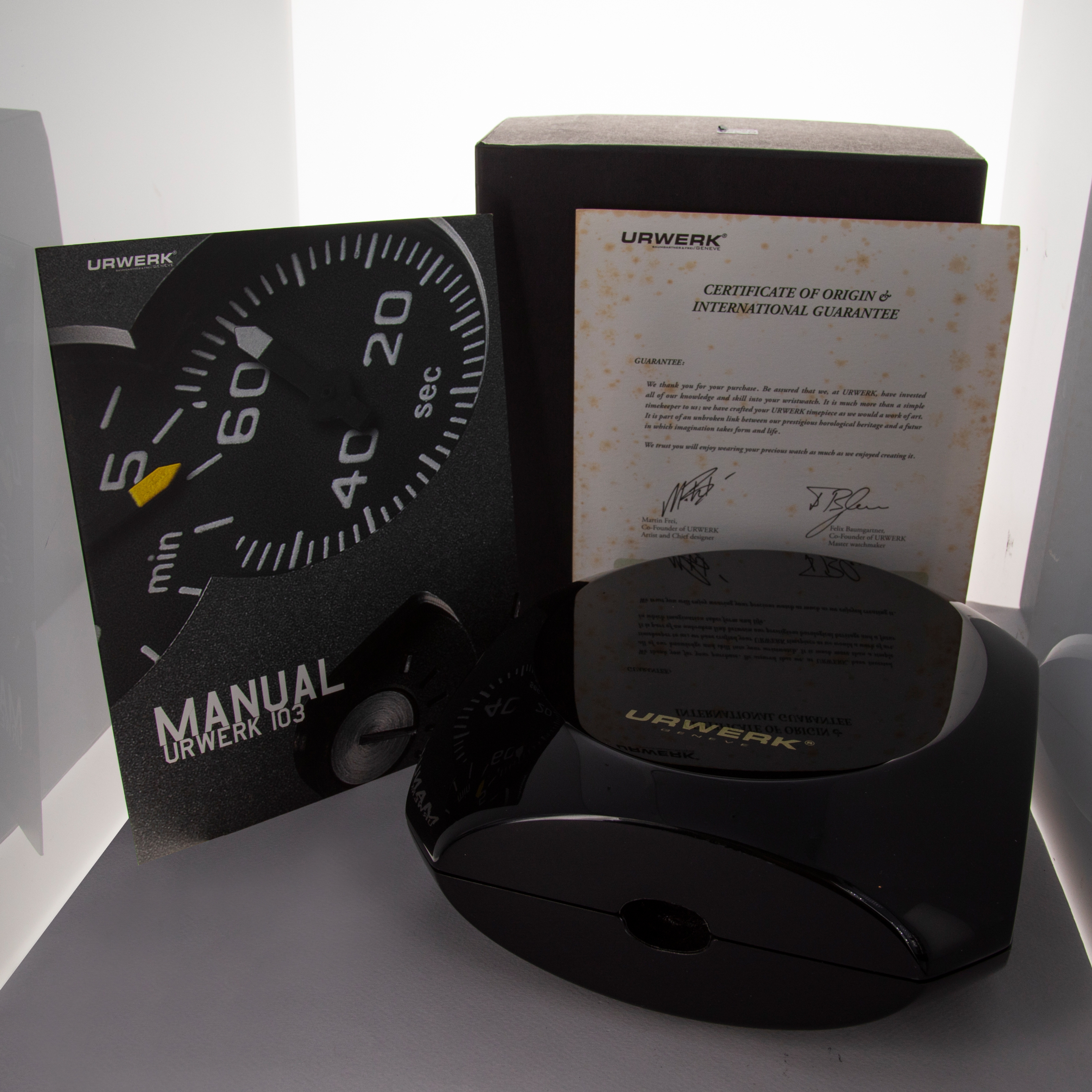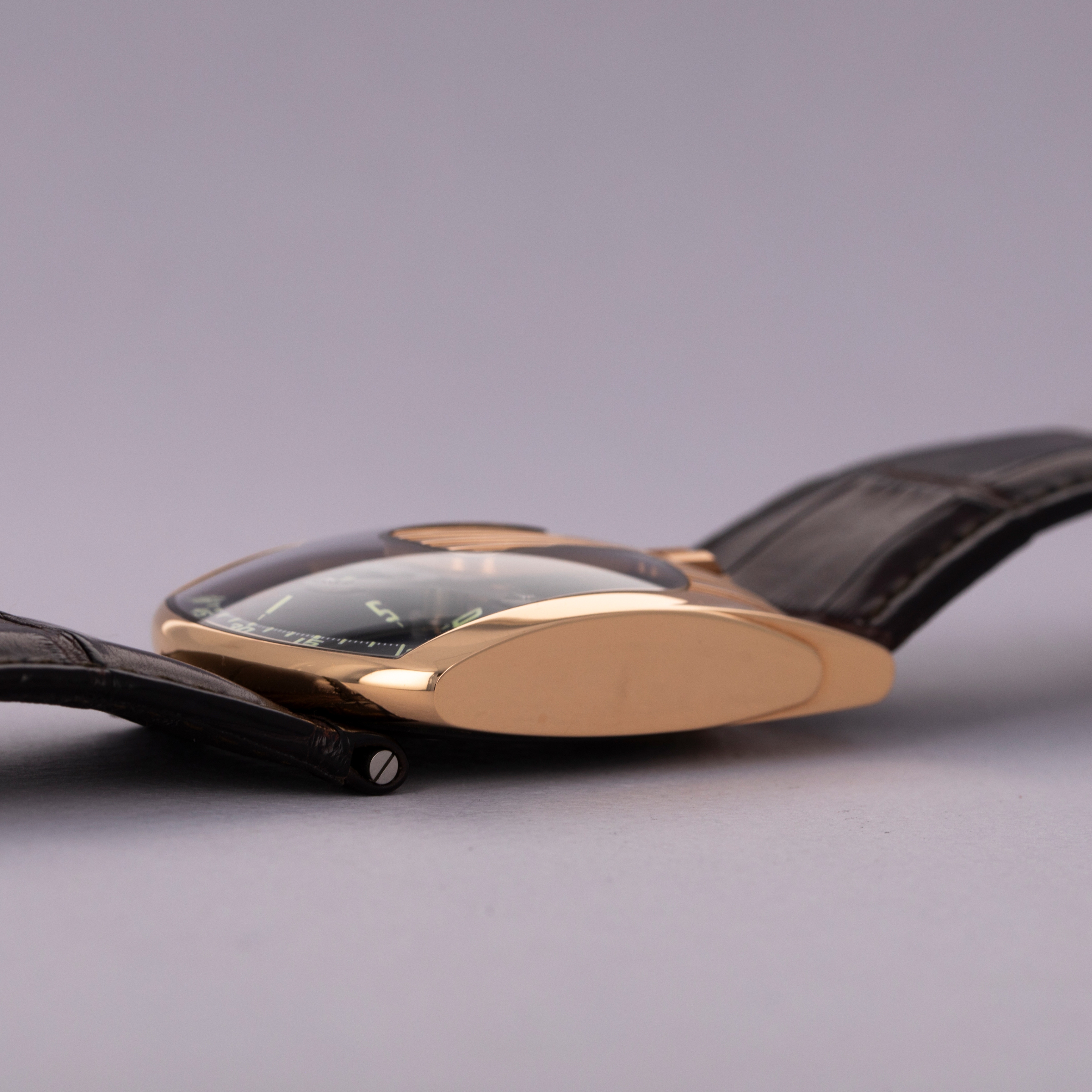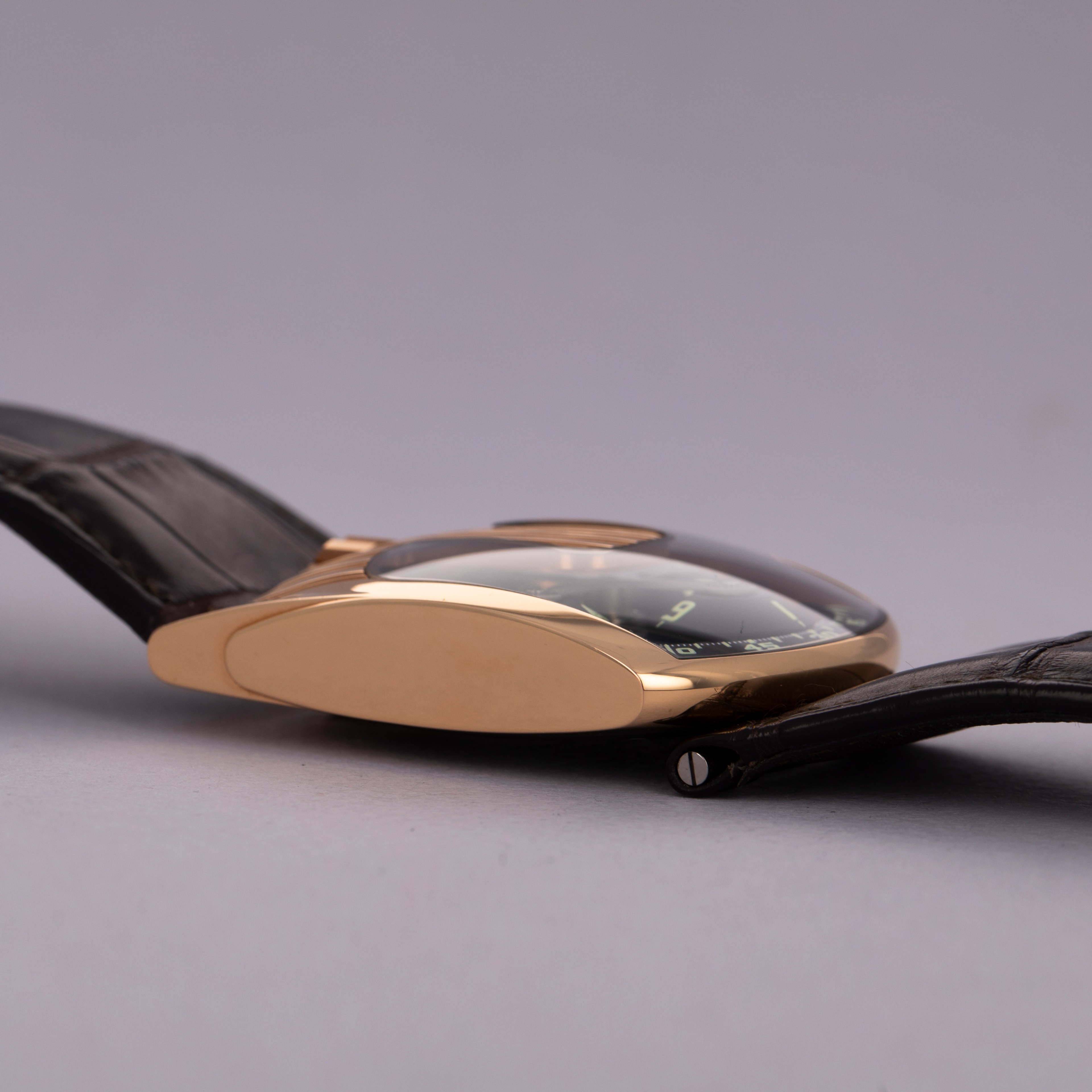 The world of independent watchmaking is a colorful place with hundreds of brands all vying to create some of the most unique and wonderful watches the industry has seen. Natuarally, some brands have proven to be more successful than others, one such brand being Urwerk. Founded in 1997 by Martin Frei and Felix Baumgartner, Urwerk’s mission has always been to create Haute Horlogerie timepieces that fuse their love of traditional watchmaking with a futuristic aesthetic that seems to have been lifted straight out of a sci-fi novel. With their distinctive case shapes and signature satellite hour markers, their timepieces have become some of horology’s most sought-after watches, one such being the model we have here, the UR-103 ref. 103.09 that we have here. Launched in 2003 and boasting a large 36mm x 49mm case in 18kt rose gold, the UR-103 is certainly a luxurious timepiece, but through its satellite hour marker display, unique case design, and unusual profile, the UR-103 fits on the wrist like a spaceship. Featuring a ridged and partially domed top that runs onto its sapphire crystal, the UR-103 wears like nothing else on the market outside of Urwerk’s exceptional offerings. With a control board, as Urwerk calls it, on its caseback – inspired by vintage marine chronometers, the UR-103 reveals its power reserve indicator and chrono meter which is used for precise time-setting. A thoroughly unique watch unlike anything else on the market, it is timepiece like this that reveal why Urkwerk are championed for their free-thinking design language and exceptional craftsmanship.