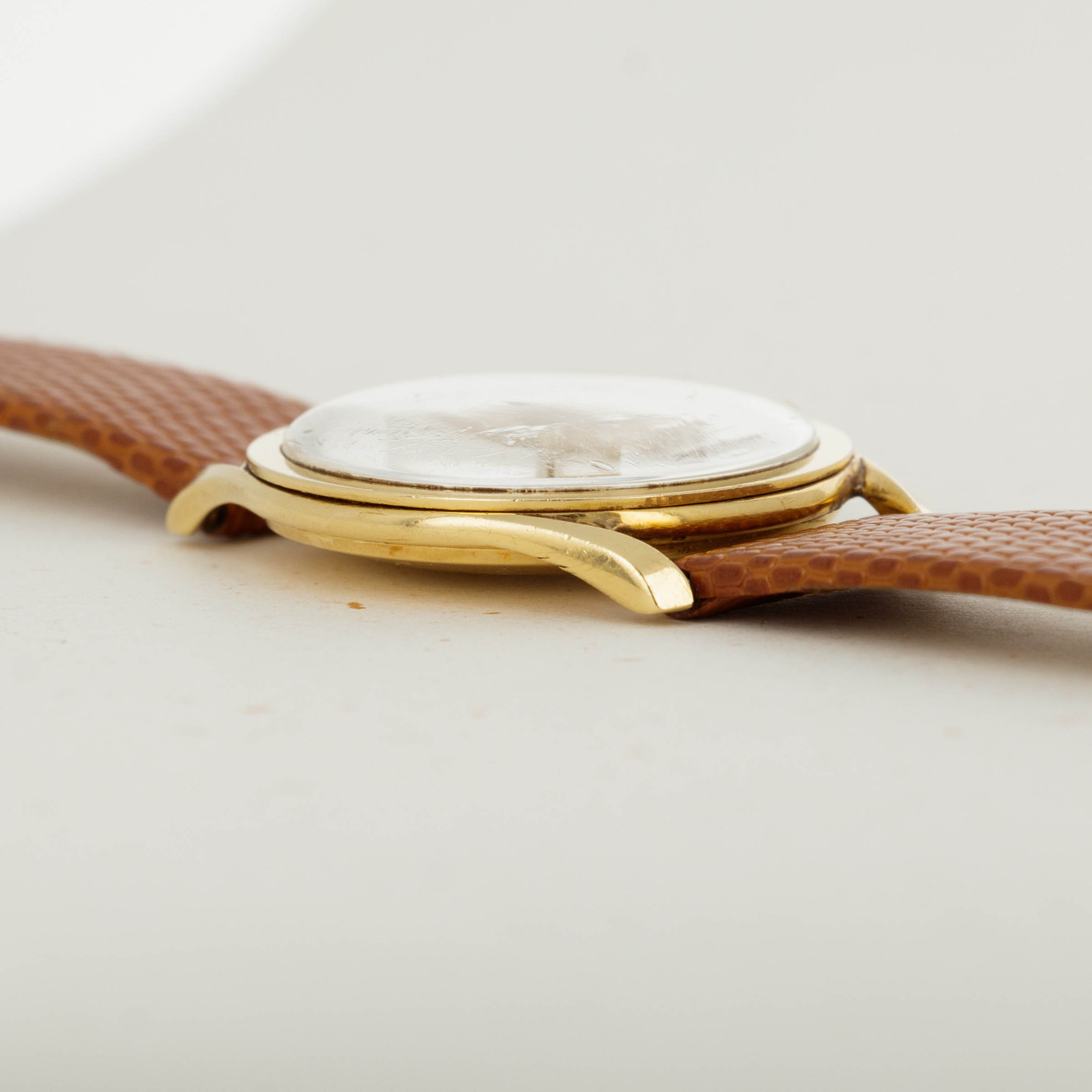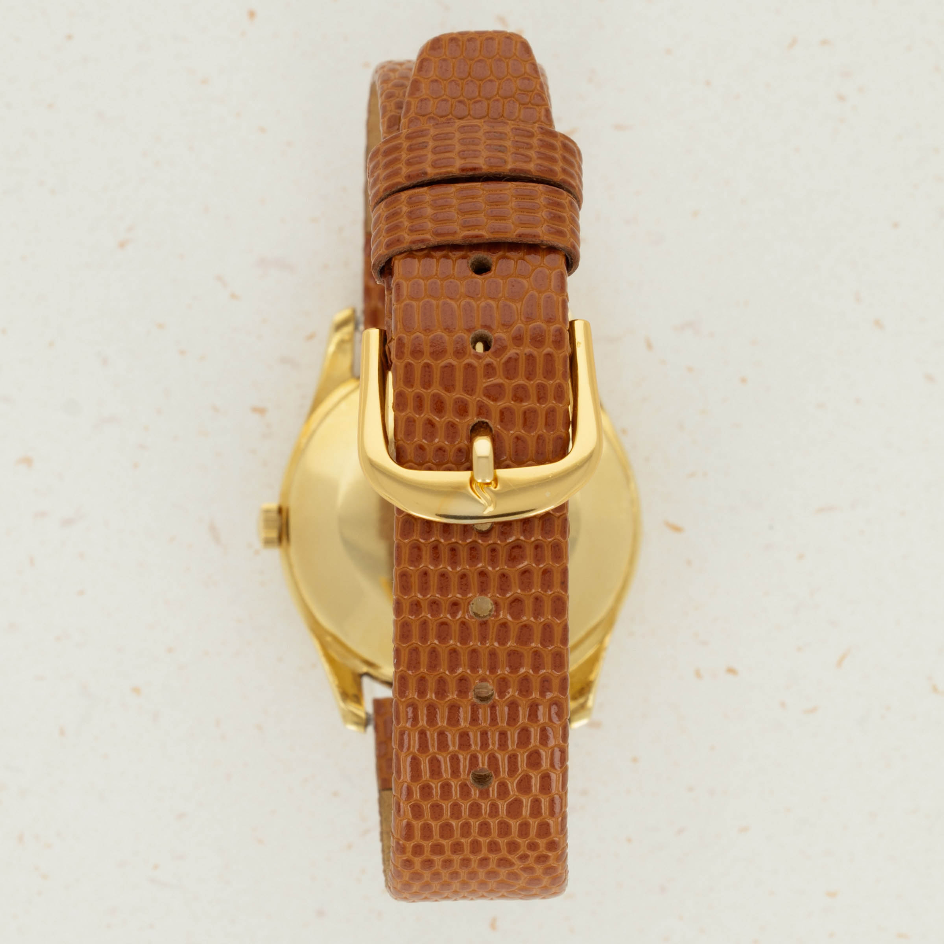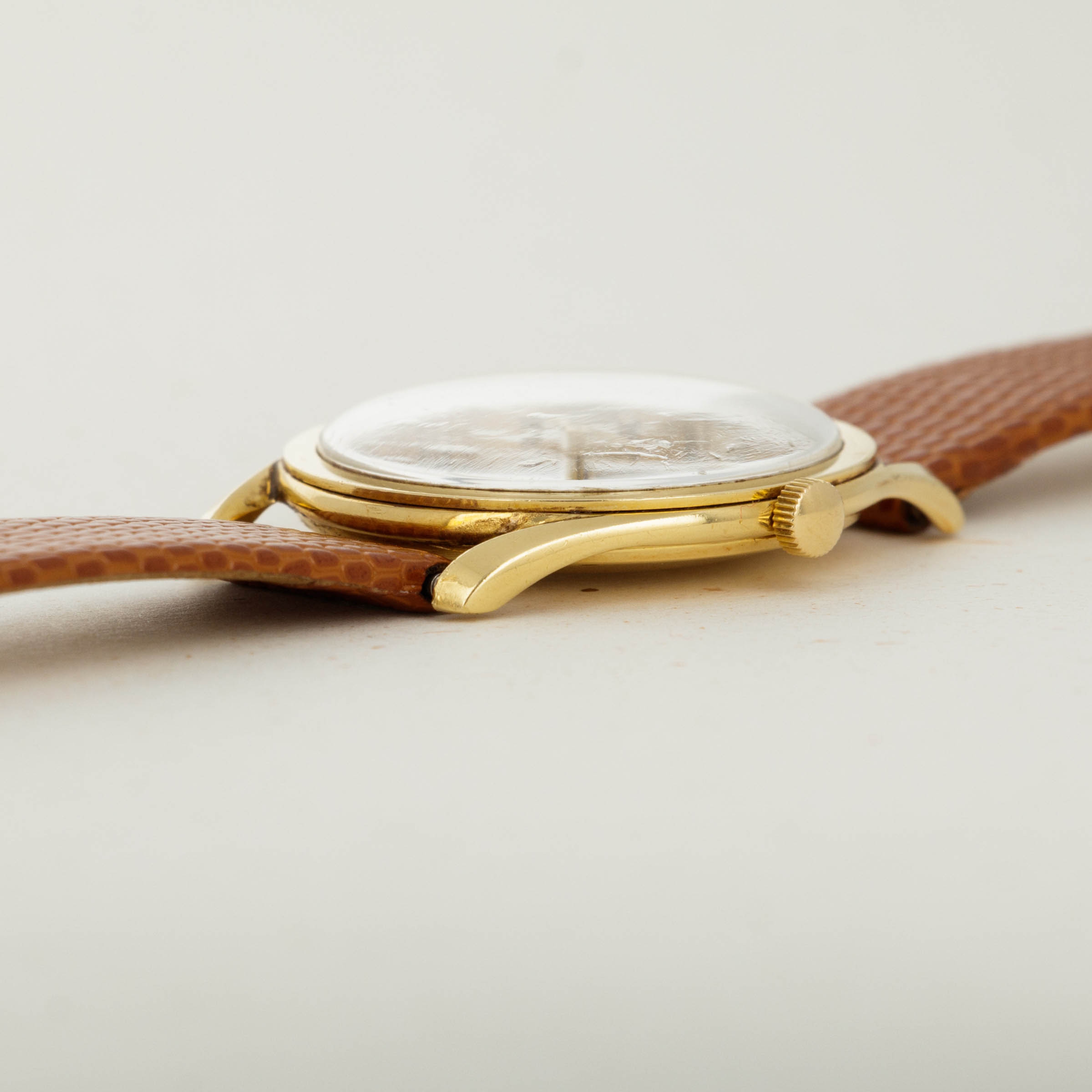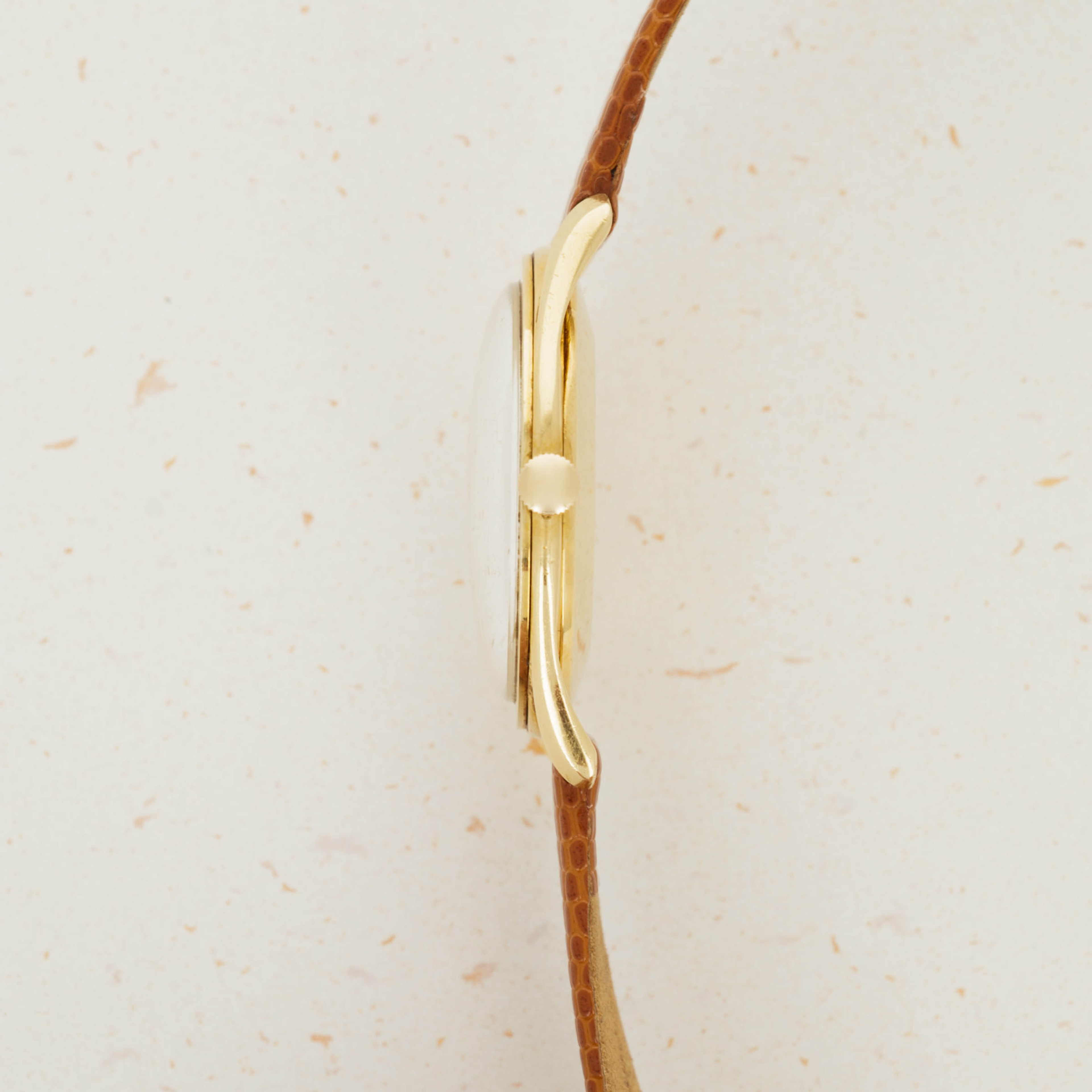 Featuring a svelte 33mm 18kt yellow gold construction with twisted "lyre" style lugs like those on the Omega Speedmaster, the ref. 6134 is unlike the traditional dress watches of its time, thus wearing with a subtle modernity.