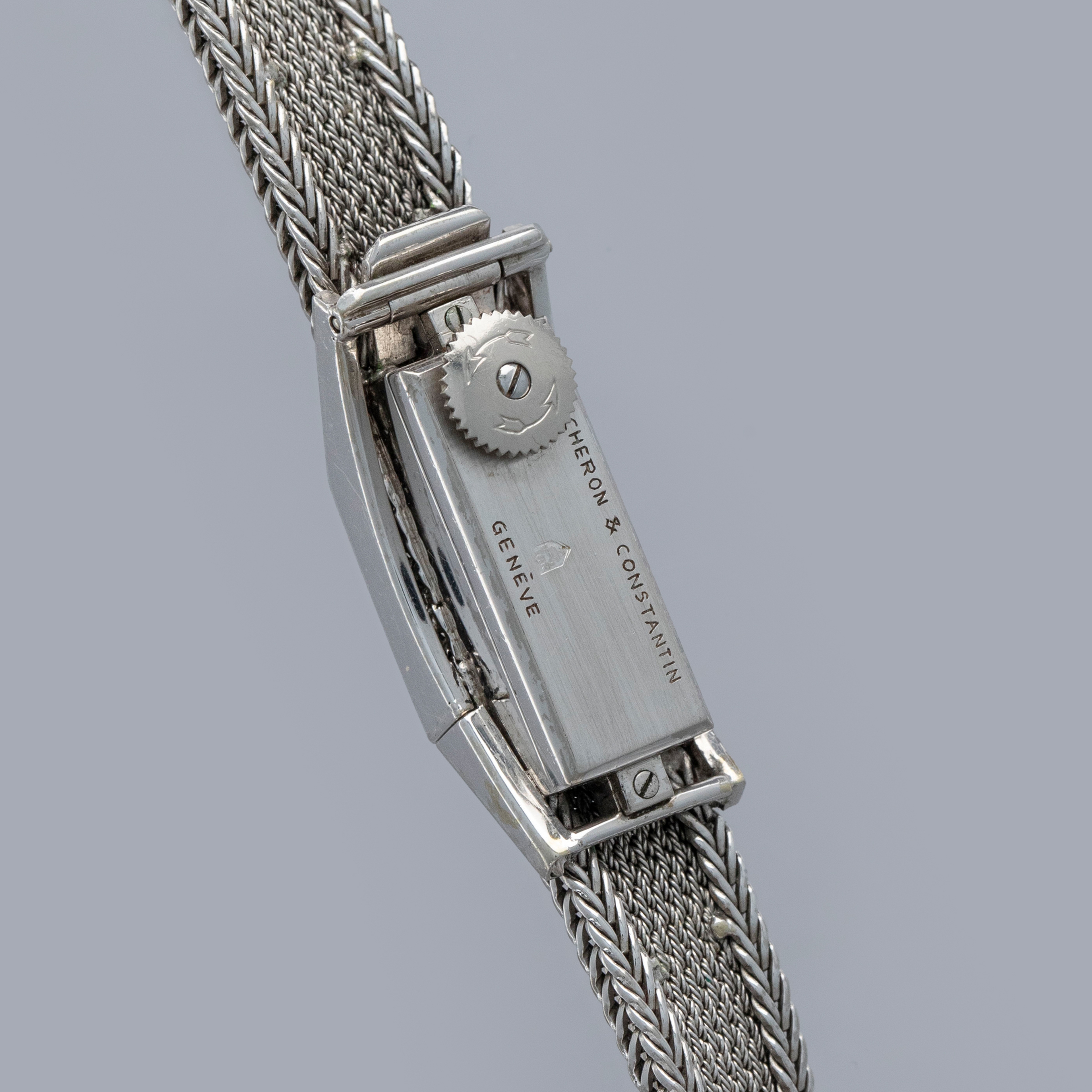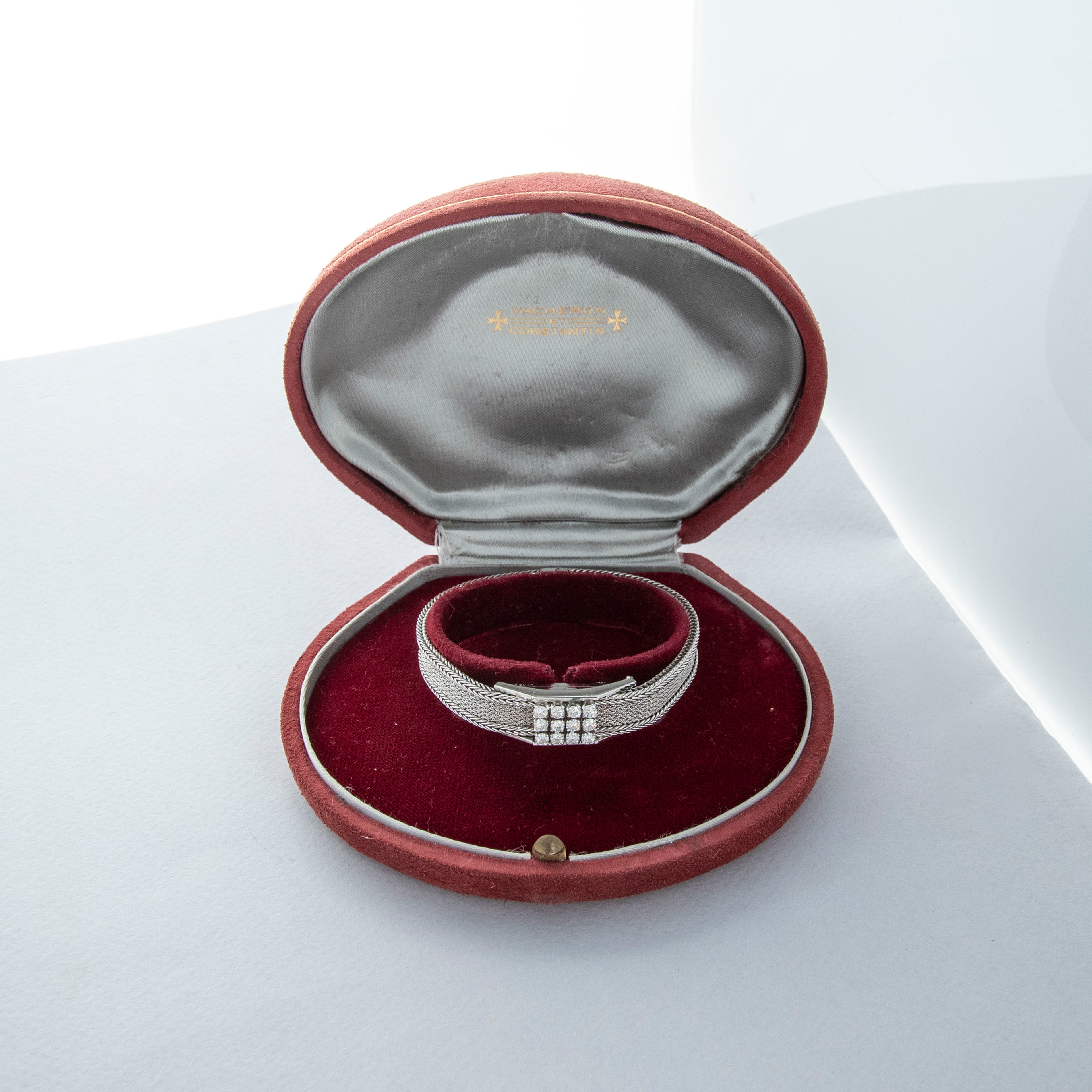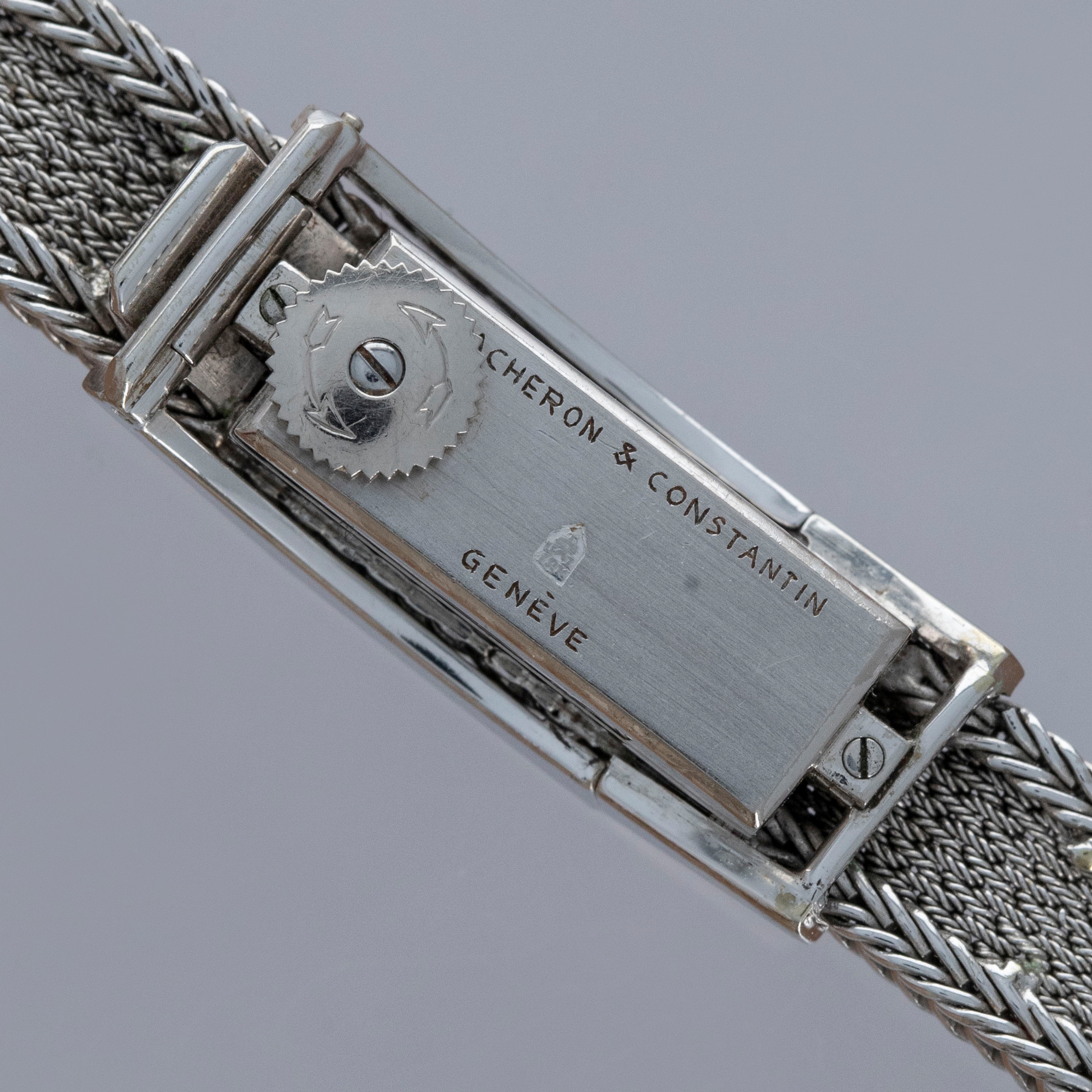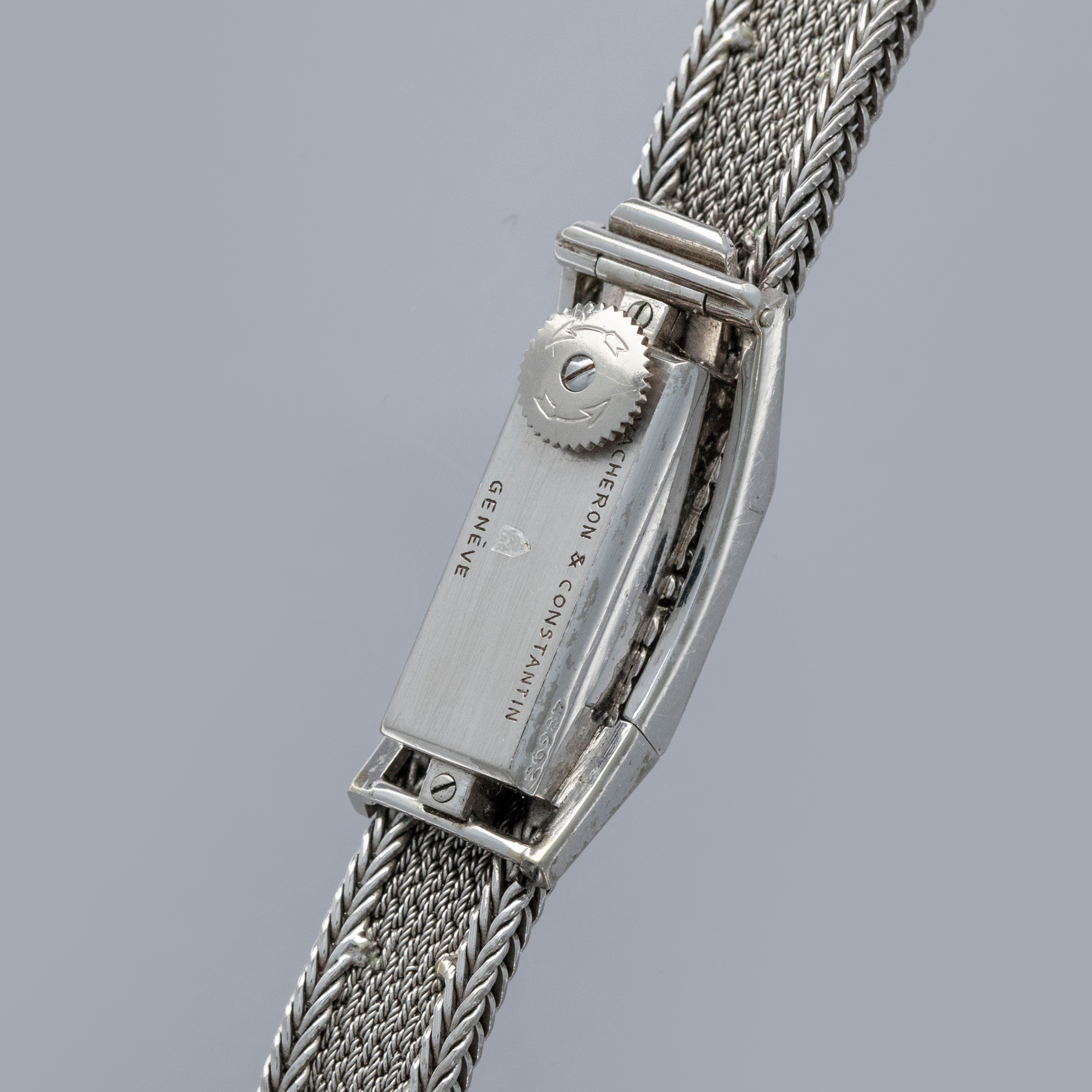 The watch is in overall excellent condition. The white gold case shows some scratches and areas of tarnish, consistent with age. The hinged diamond-set cover is in excellent condition, with all diamonds secure in their settings. The case back has well-defined engravings and a hidden winder. The dial has some light surface marks, while the hands are very clean. The white gold mesh bracelet is in excellent condition and fits an approximately 6 1/4” wrist. The watch comes with its original Vacheron Constantin box.