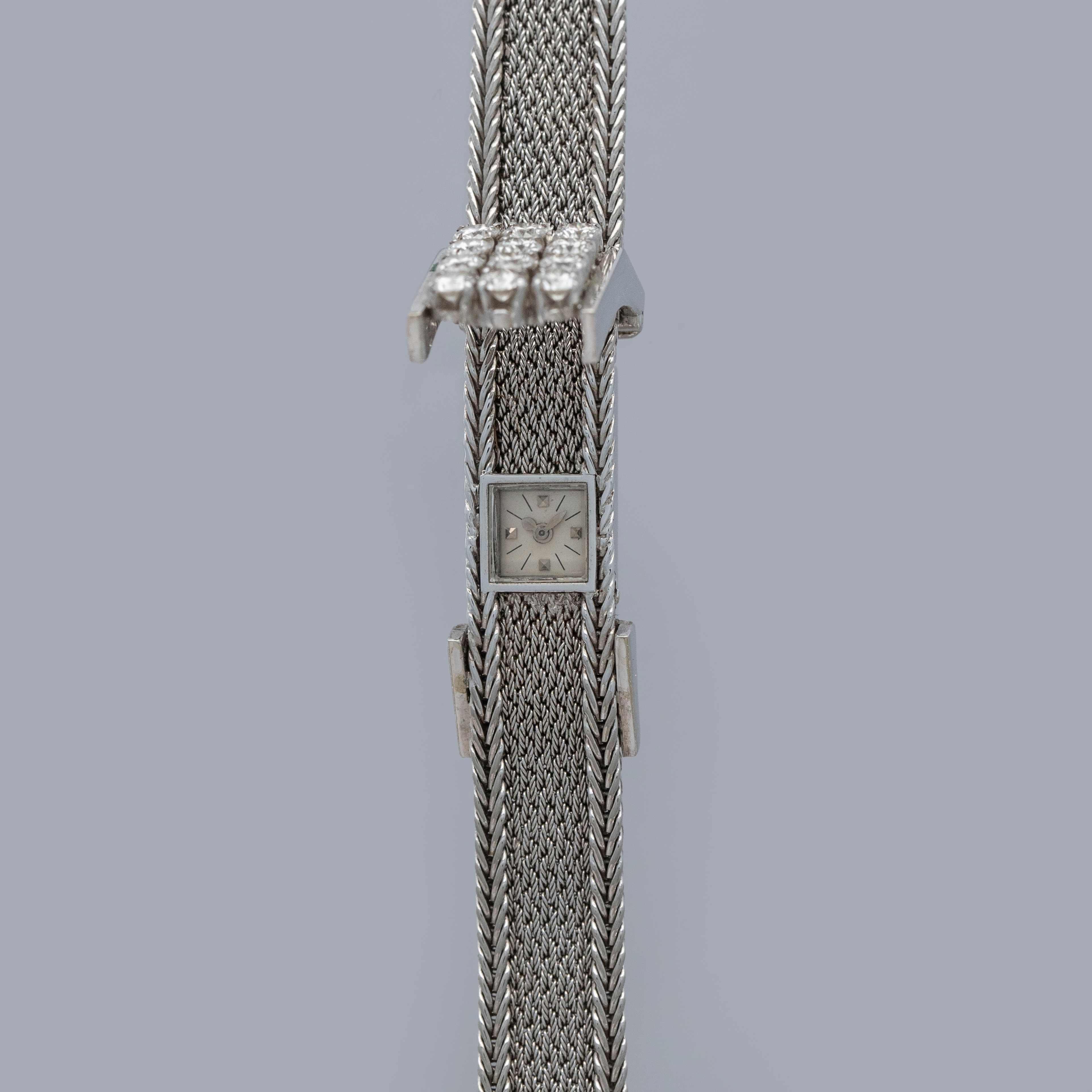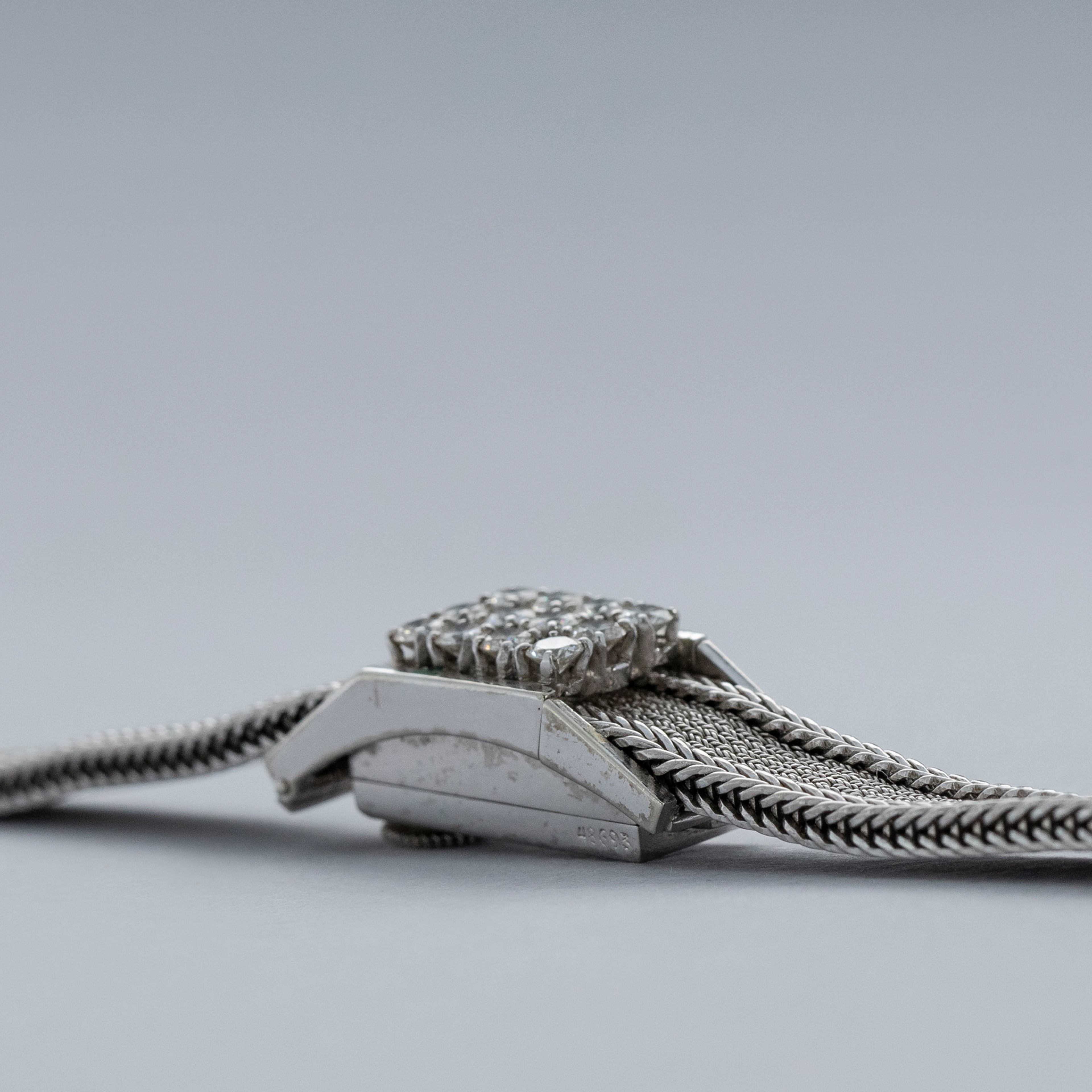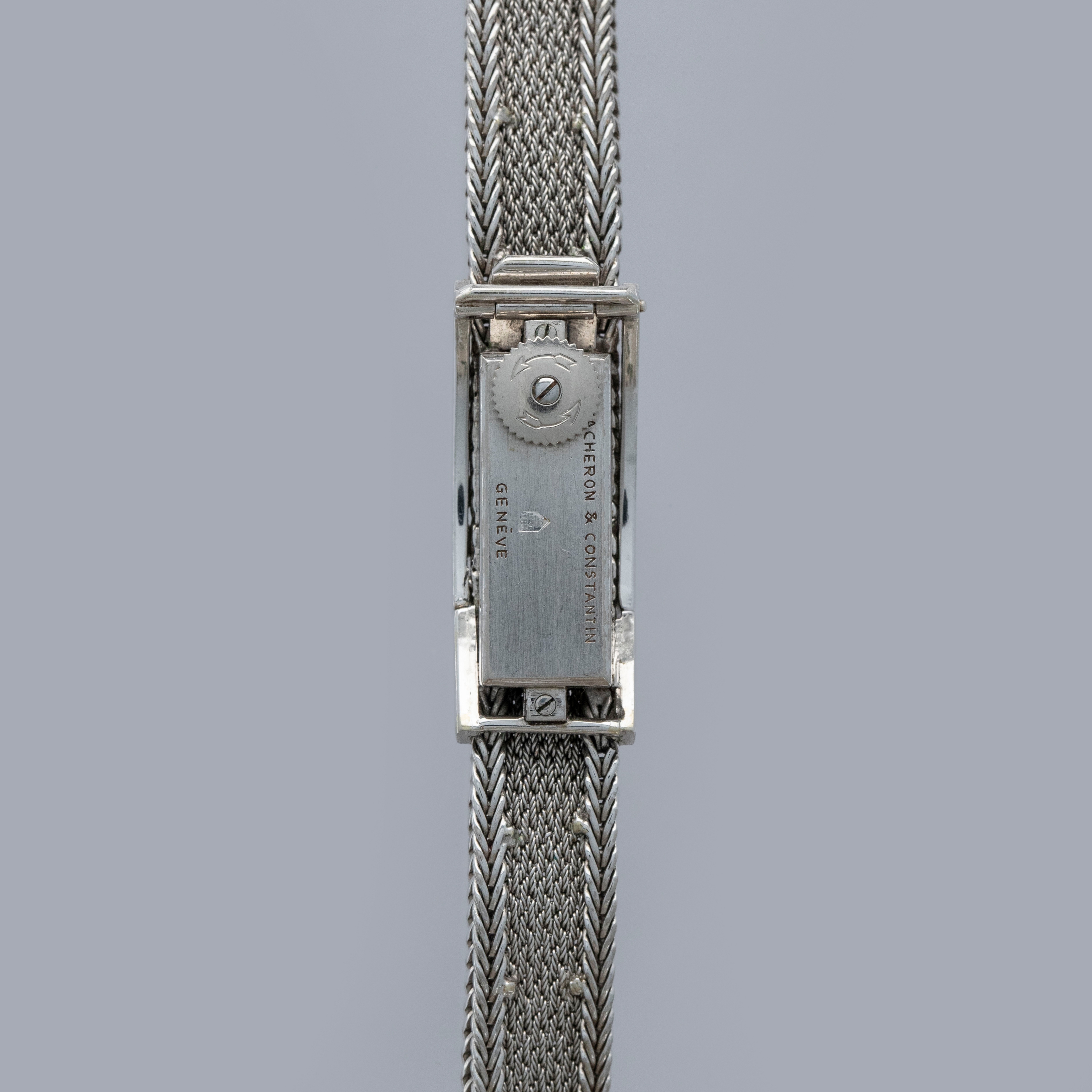 The watch is in overall excellent condition. The white gold case shows some scratches and areas of tarnish, consistent with age. The hinged diamond-set cover is in excellent condition, with all diamonds secure in their settings. The case back has well-defined engravings and a hidden winder. The dial has some light surface marks, while the hands are very clean. The white gold mesh bracelet is in excellent condition and fits an approximately 6 1/4” wrist. The watch comes with its original Vacheron Constantin box.