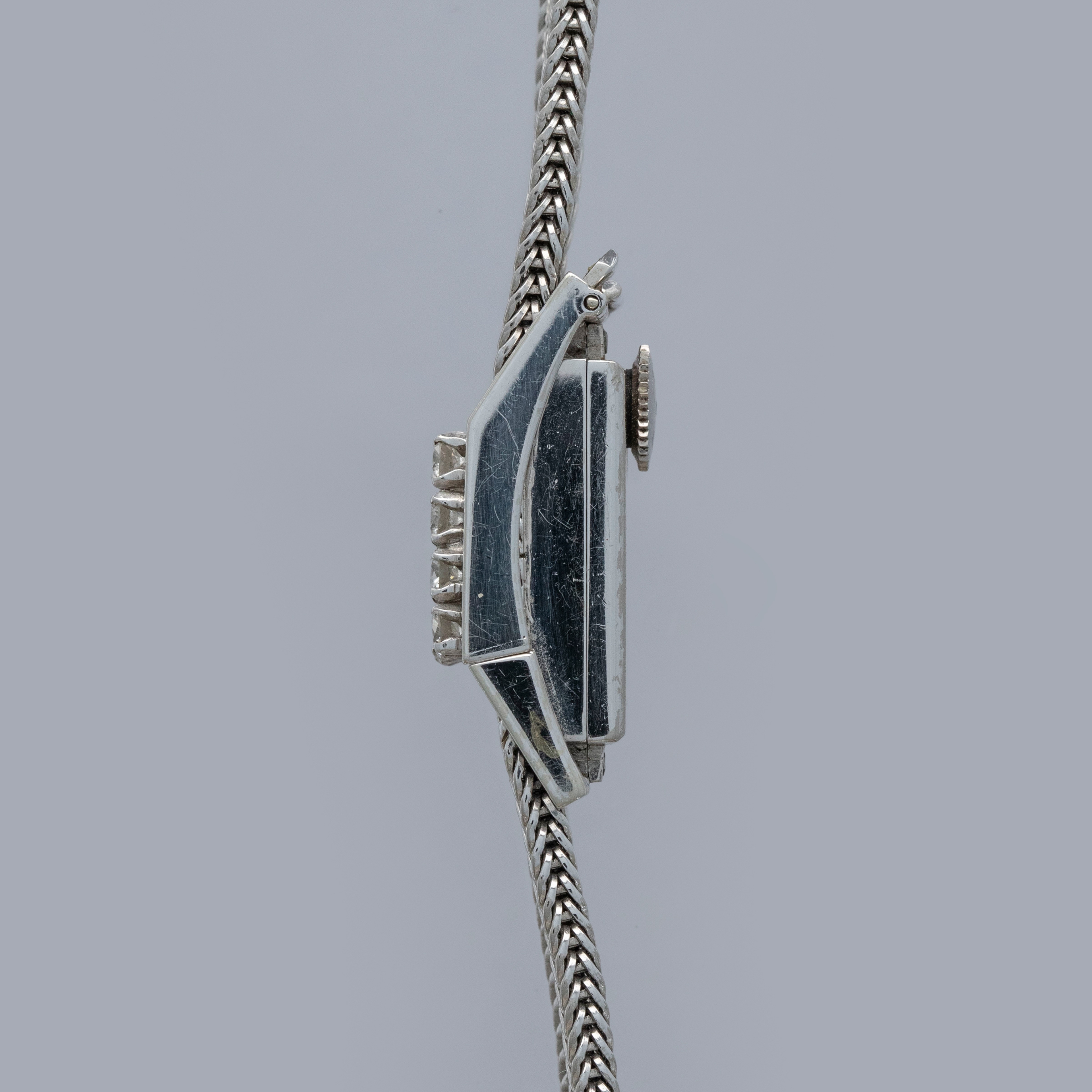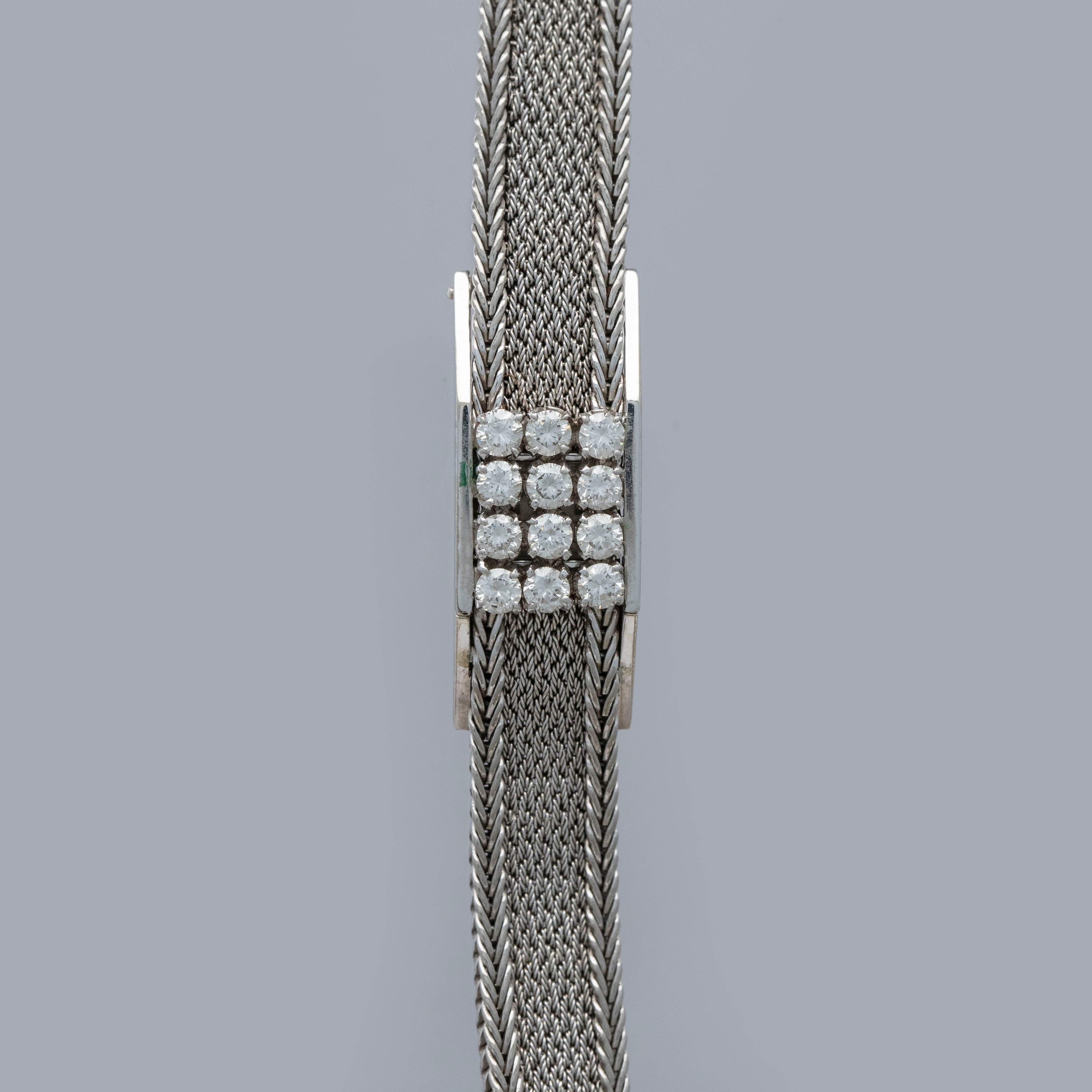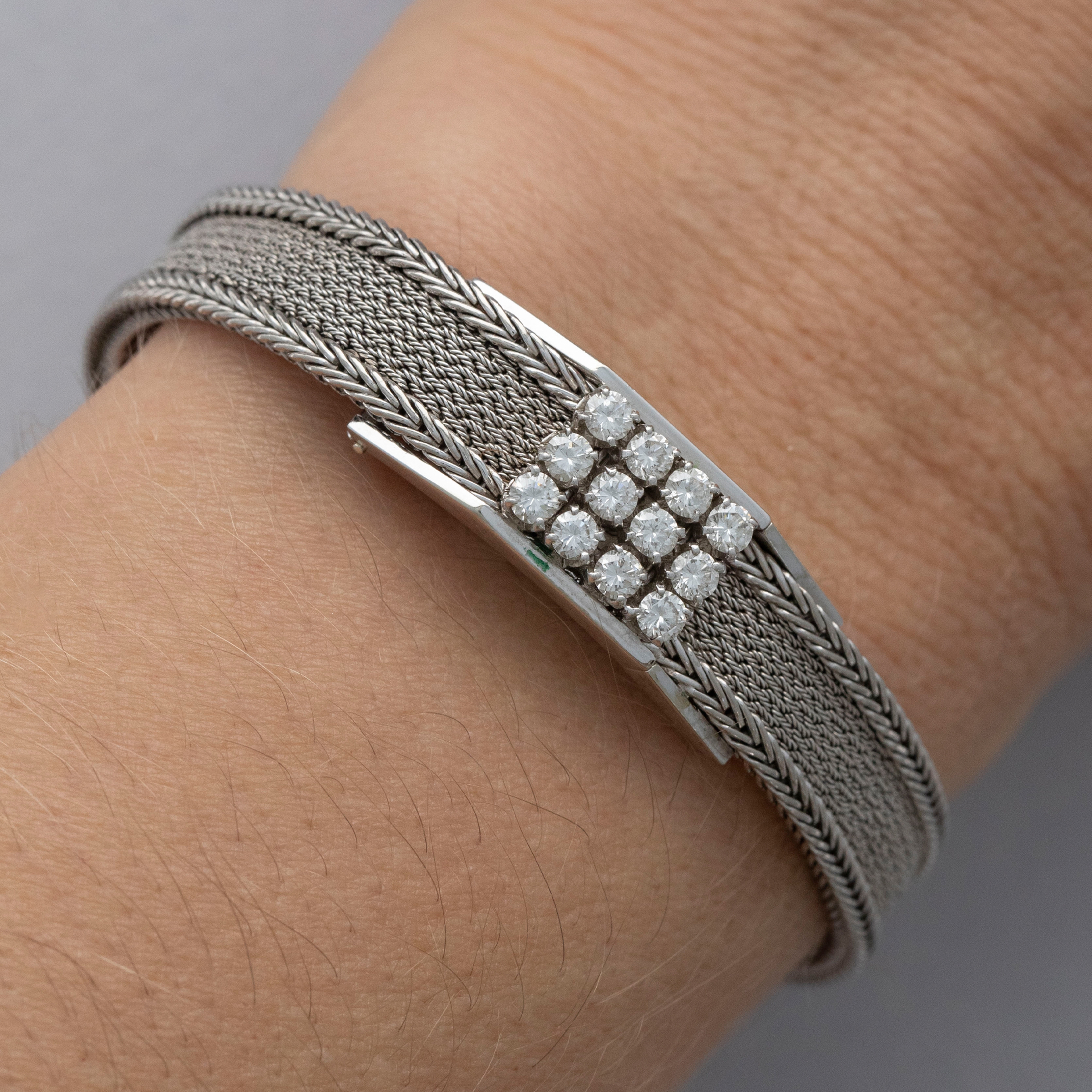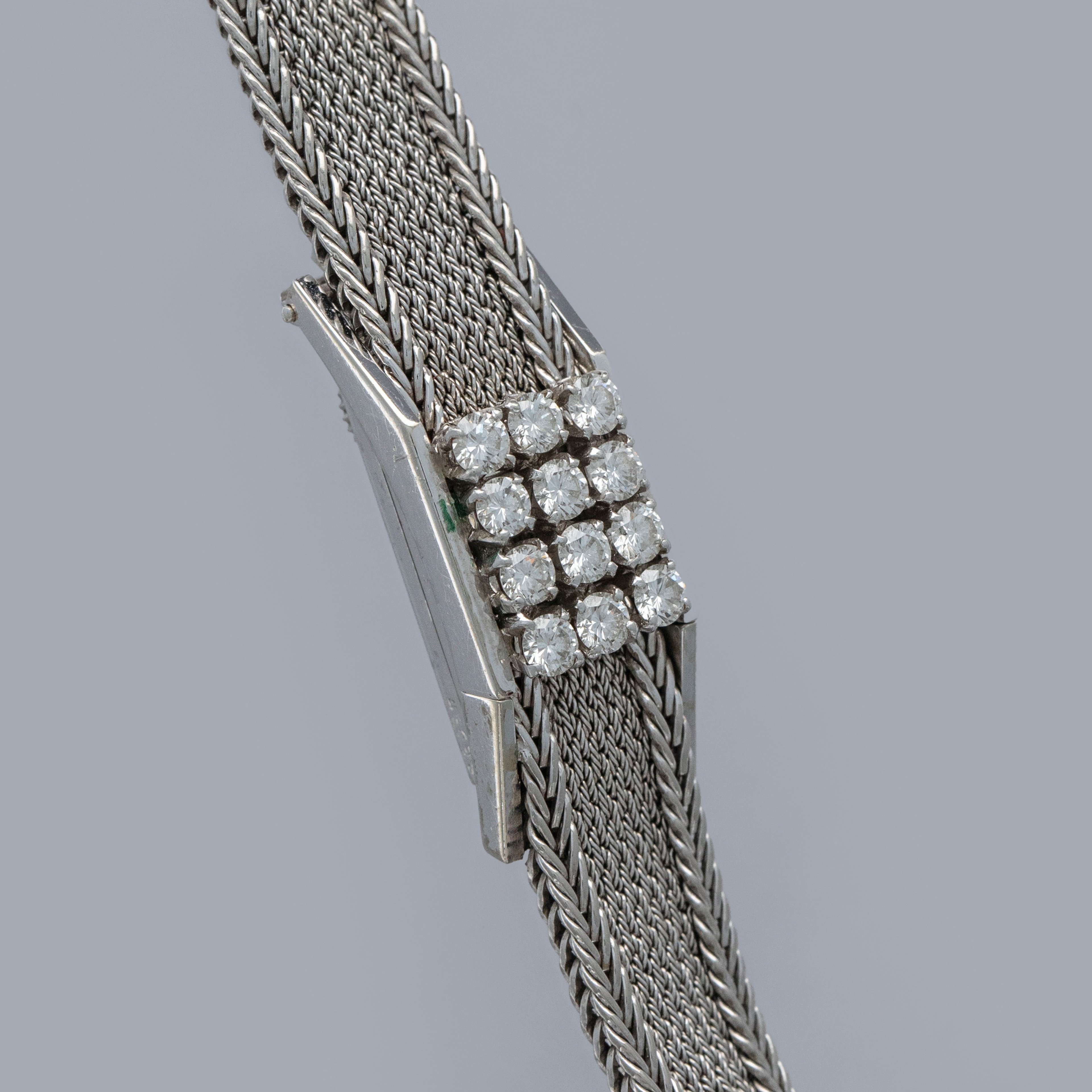 The watch is in overall excellent condition. The white gold case shows some scratches and areas of tarnish, consistent with age. The hinged diamond-set cover is in excellent condition, with all diamonds secure in their settings. The case back has well-defined engravings and a hidden winder. The dial has some light surface marks, while the hands are very clean. The white gold mesh bracelet is in excellent condition and fits an approximately 6 1/4” wrist. The watch comes with its original Vacheron Constantin box.