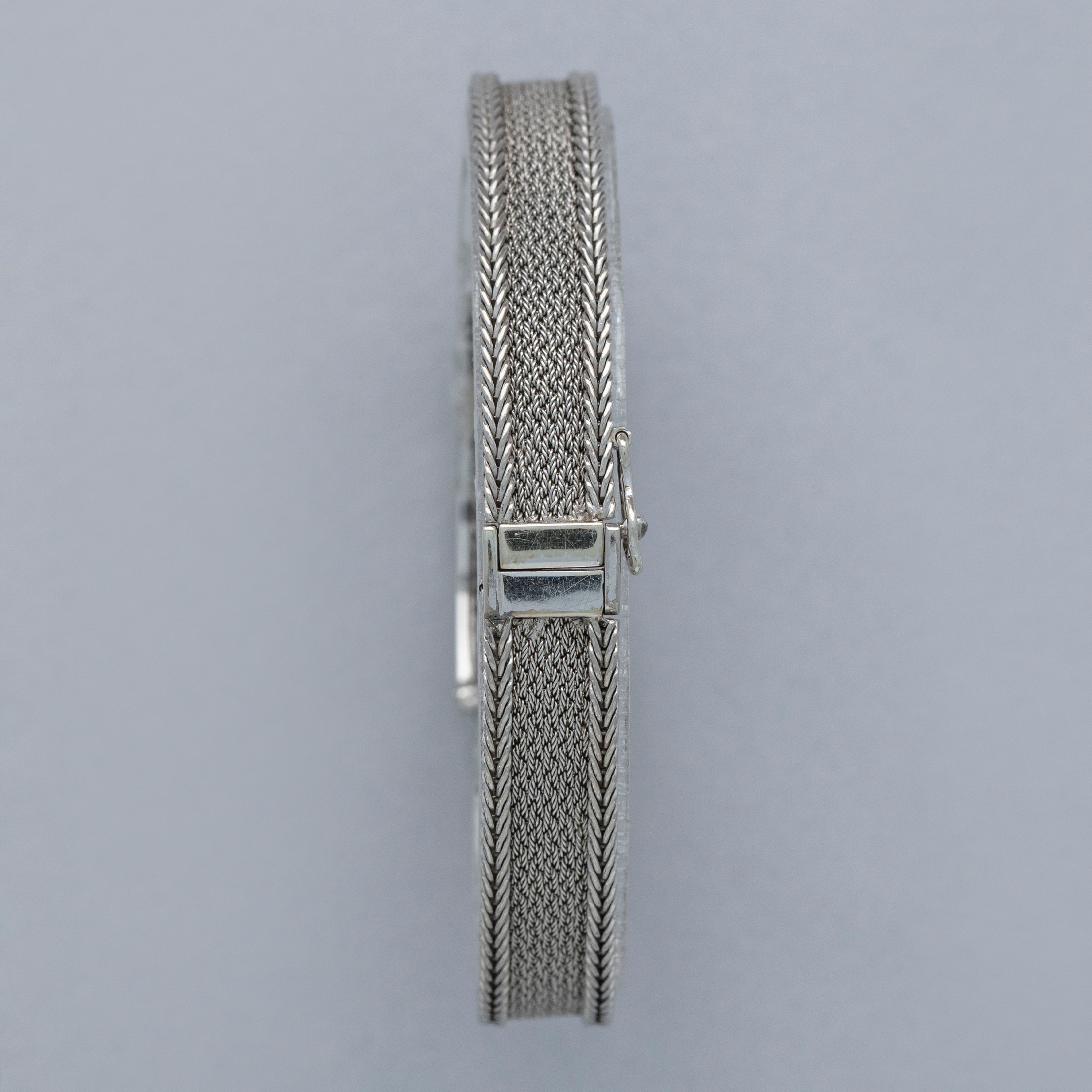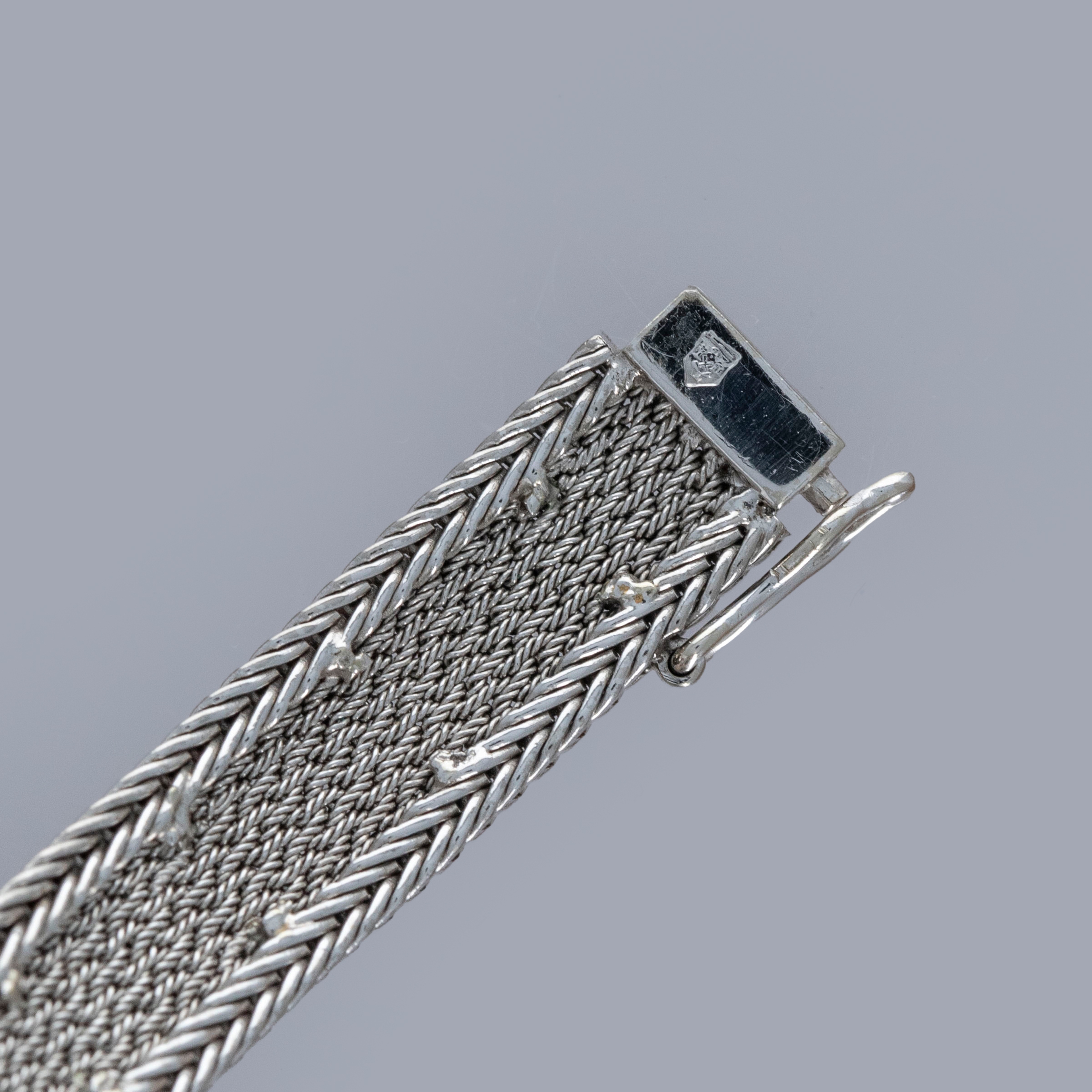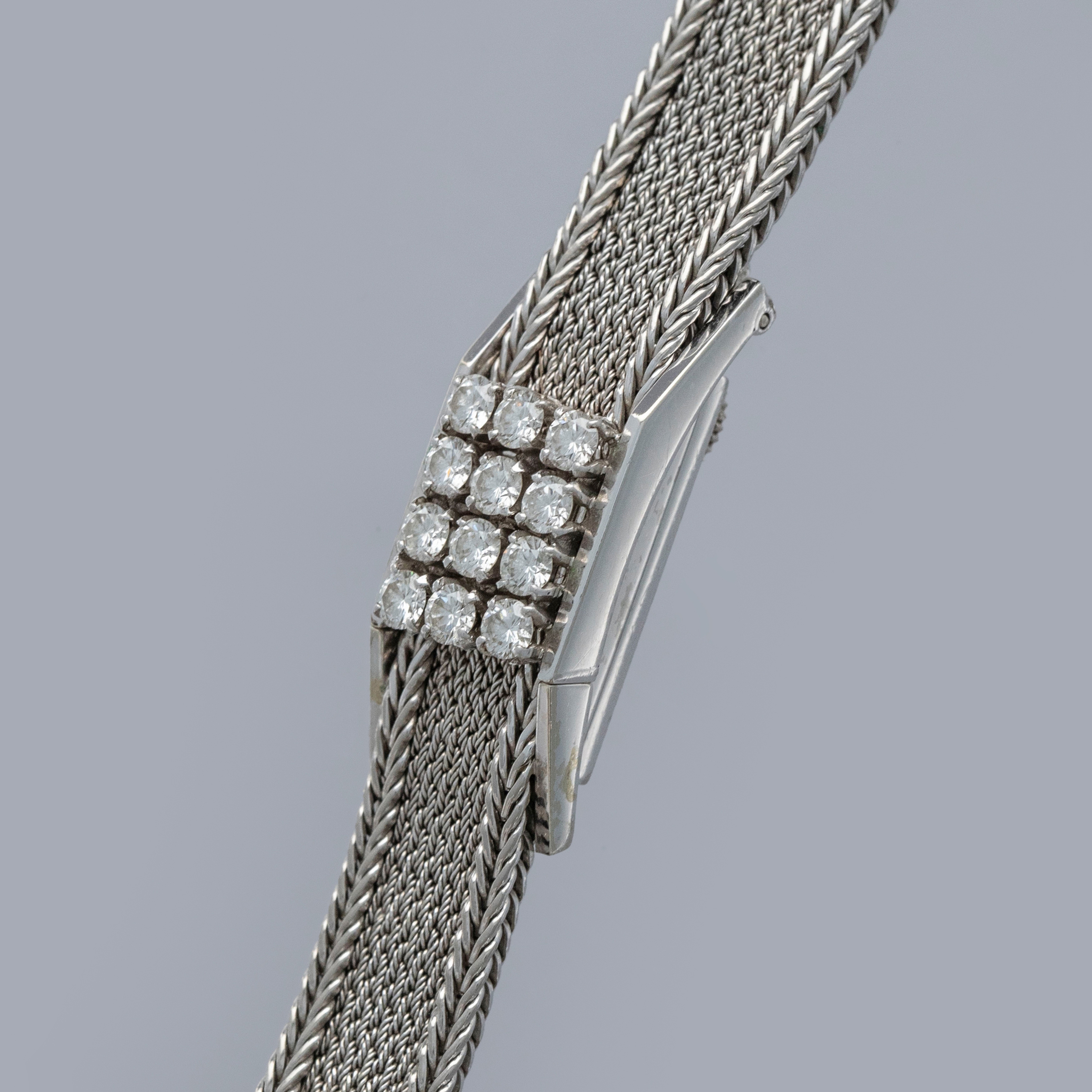 Vacheron Constantin has evolved over the years from their position in the shadows of their fellow "Holy Trinity" members, Audemars Piguet and Patek Philippe, to a watchmaker that is revered throughout the entire watchmaking industry. Crucial to this development was their attractive dress watches like the example we have here with its beautiful diamond-set 18kt white gold construction. While most high-end brands typically focus on creating round dress watches, there has always been room for watchmakers to experiment with timepieces that break from that convention in some way, shape or form, and shape and form is how the example that we have here breaks from that convention. Boasting a 27mm x 11mm rectangular 18kt white gold case with a diamond-set hinged cover and intricately woven mesh 18kt white gold bracelet, this example fills the wrist with an incredibly neat presence that arises from its design as a cocktail watch that hides in plain sight as a normal bracelet. Featuring a manual-wind movement with a winding crown set on its caseback and a tiny silver dial with applied quarter indices, this timepiece is equally reserved as it is opulent; it stands out from its peers thanks to its gem-set precious metal construction and intricately woven mesh and braided bracelet.