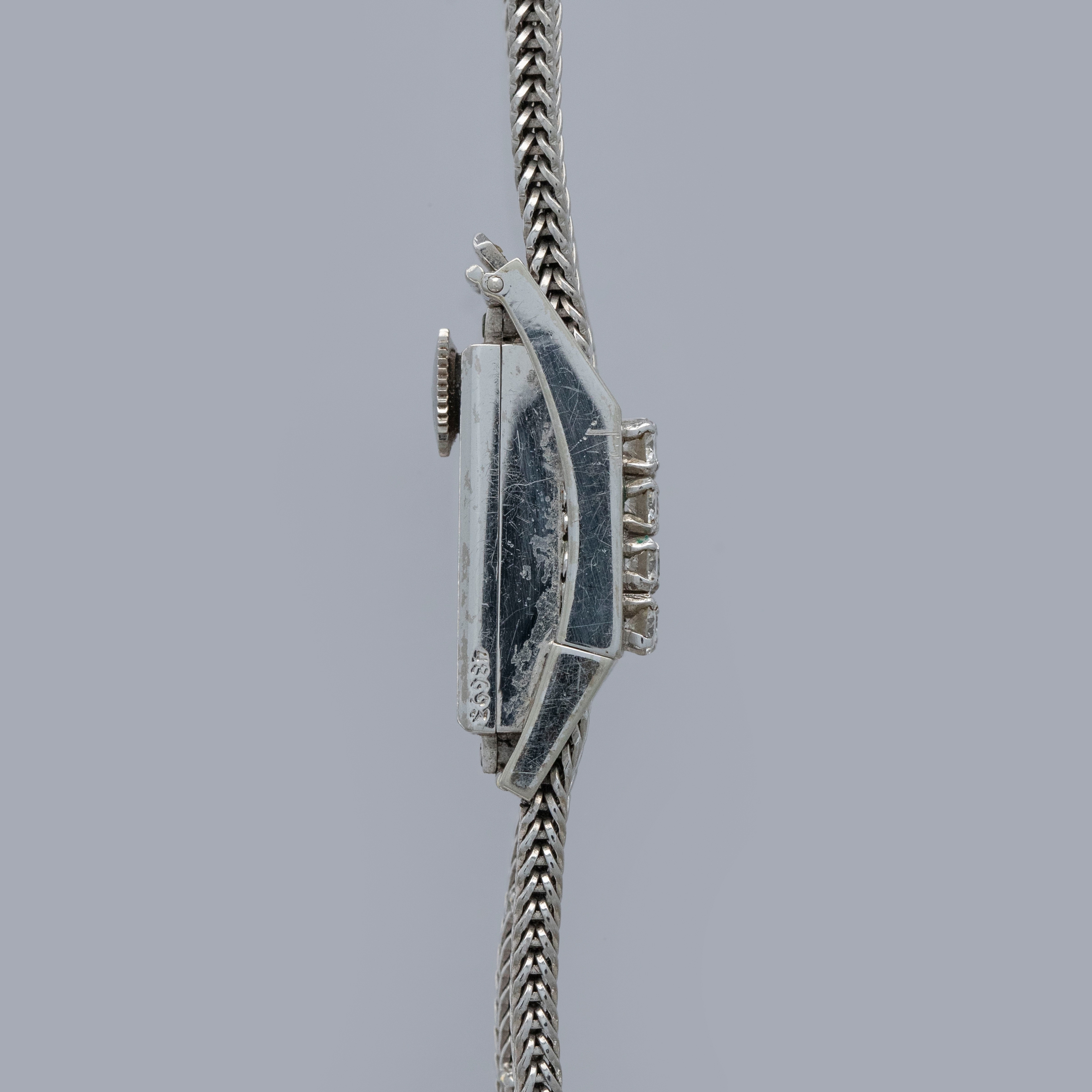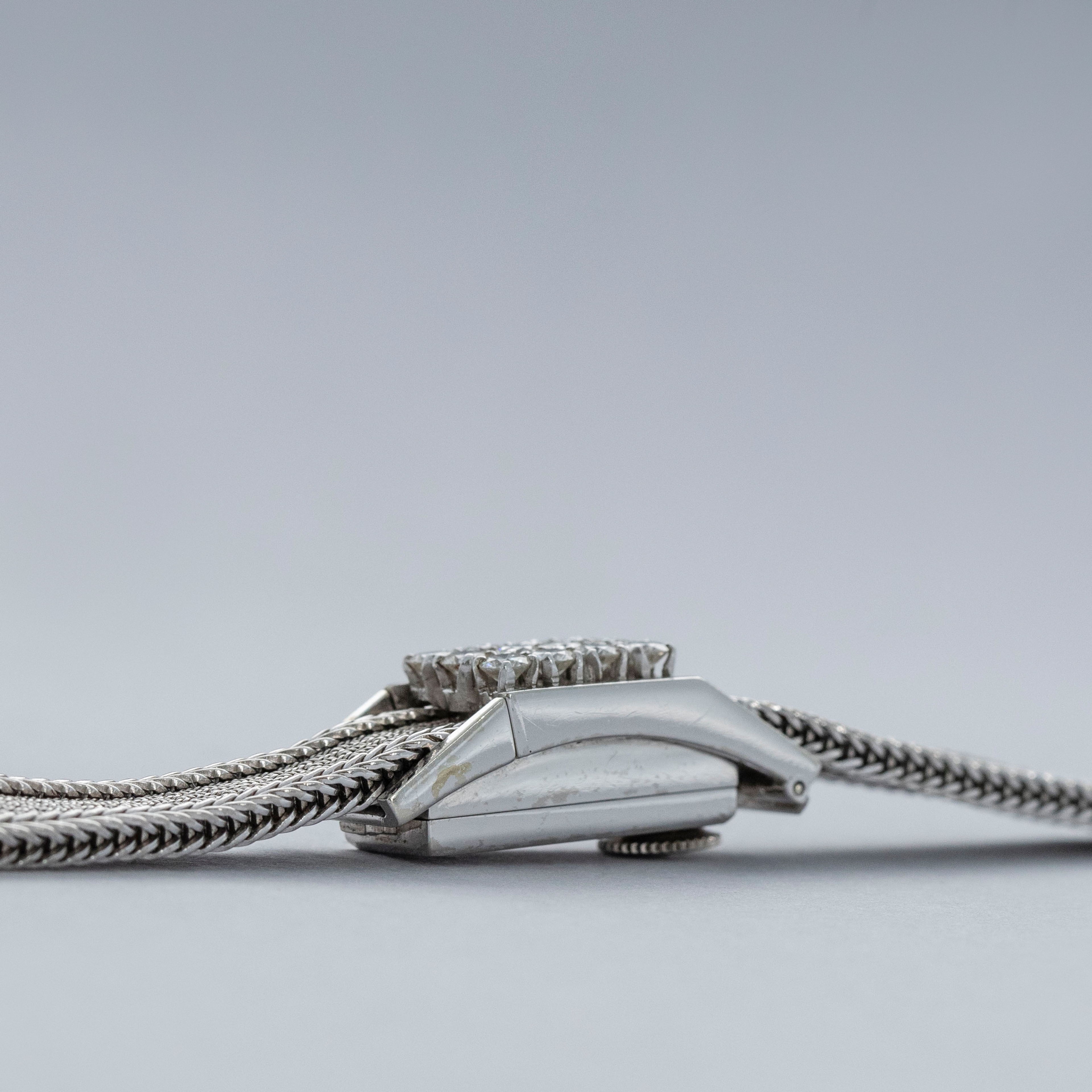 Hidden behind its hinged diamond-set cover, this timepiece's dial is a small, square-shaped silver display featuring applied quarter-hour markers, uniquely shaped hands, and no visible branding.