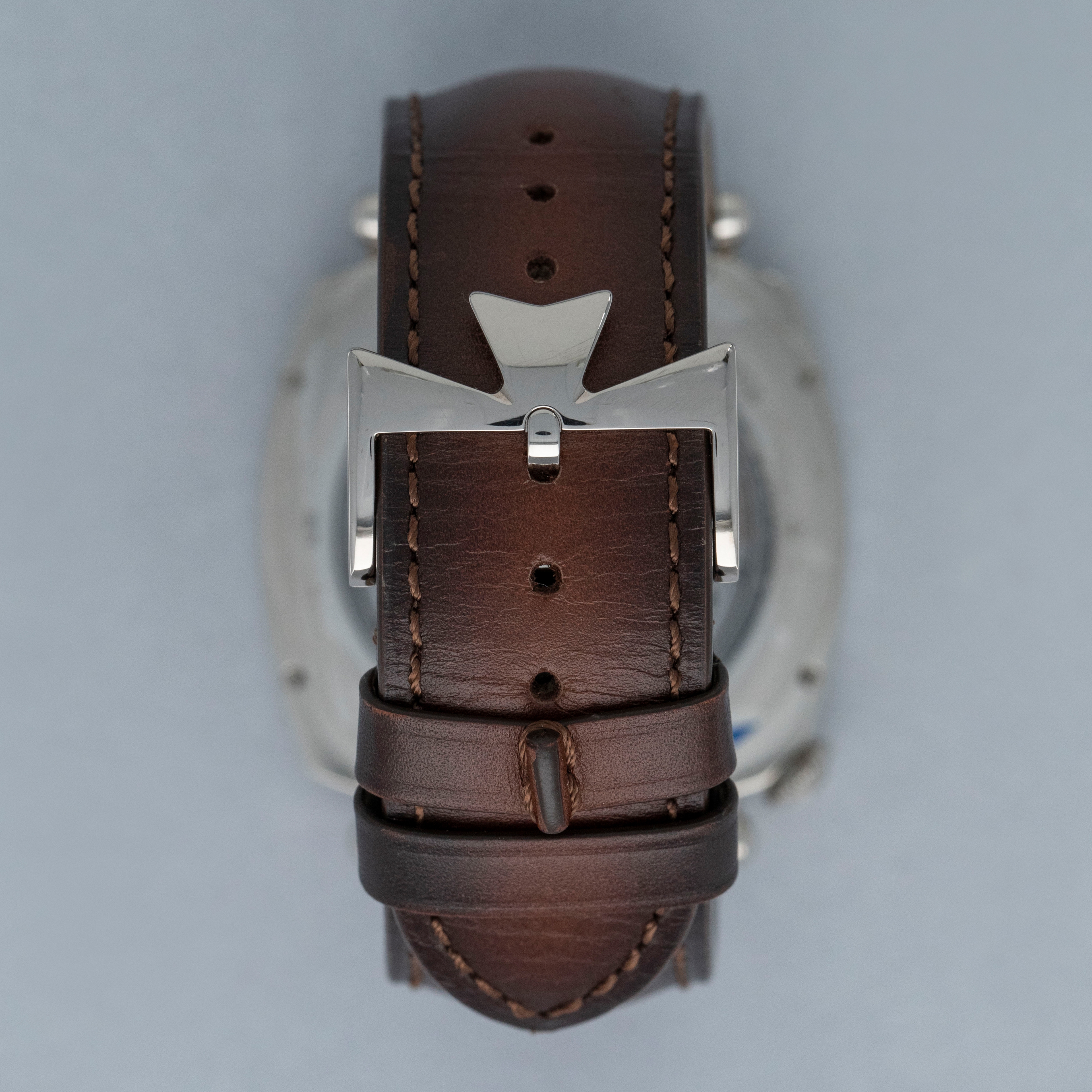 Rotated 45 degrees so as to be most legible while the wearer's arm is outstretched to hold a steering wheel, the 1921's stunning silver dial is both fun and fabulously executed.