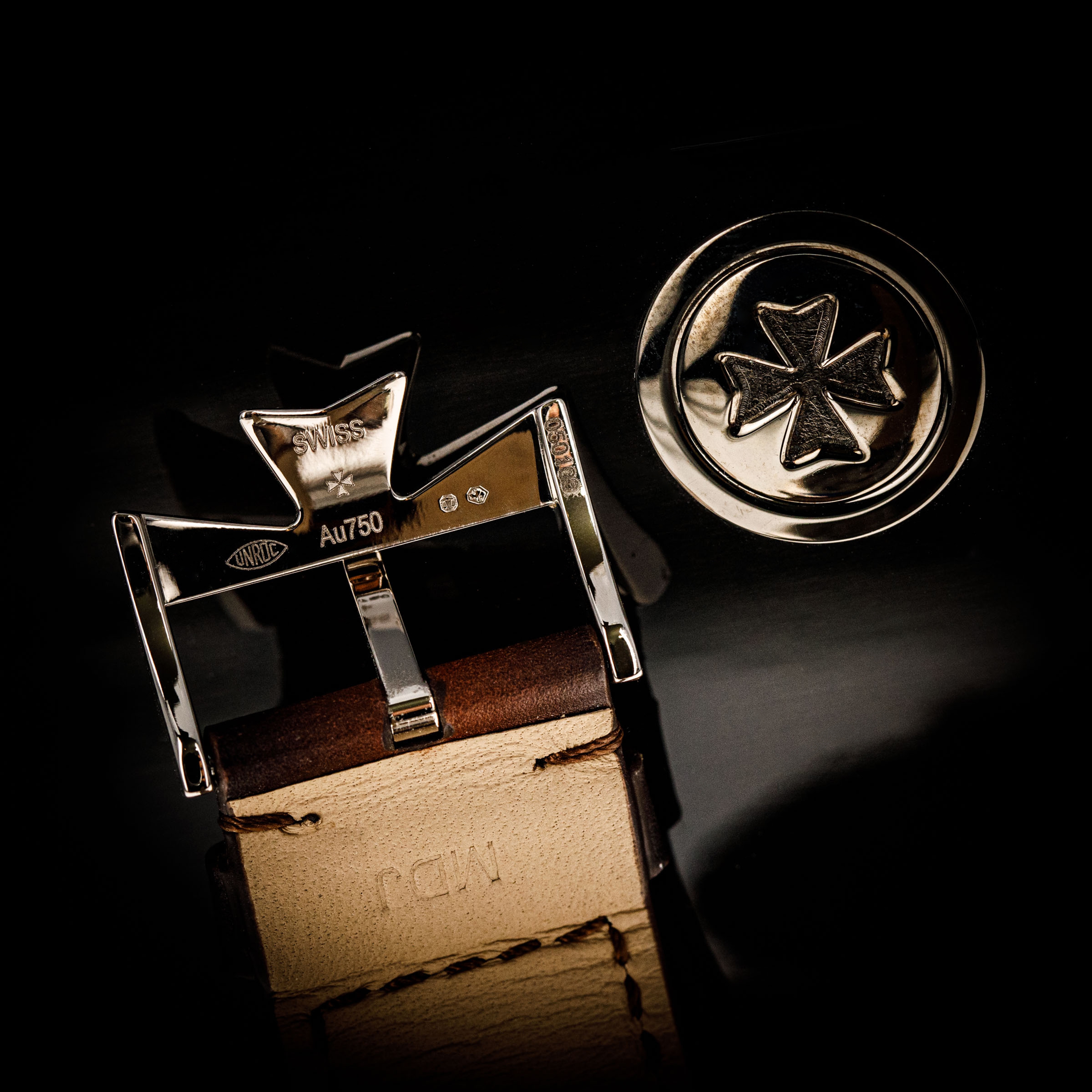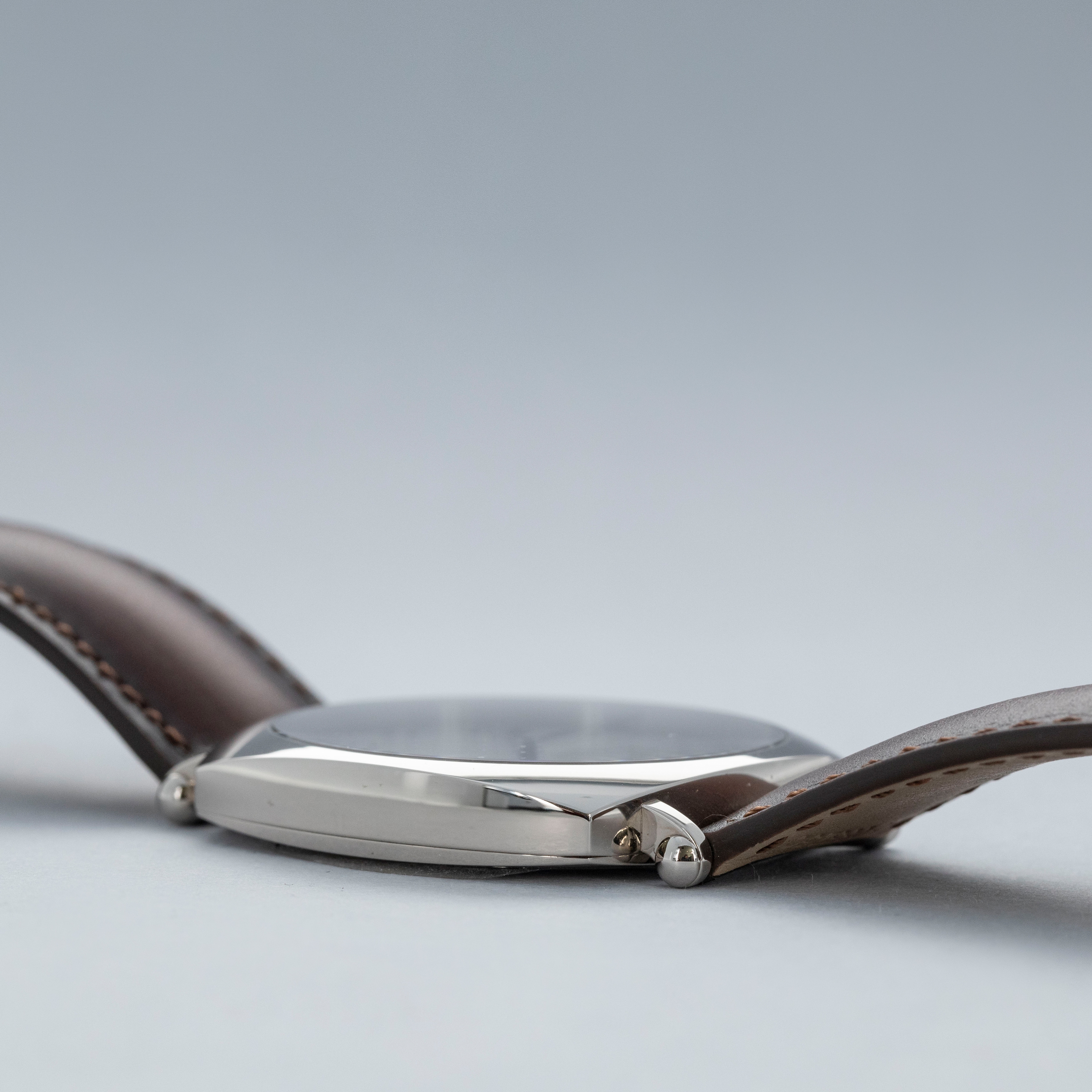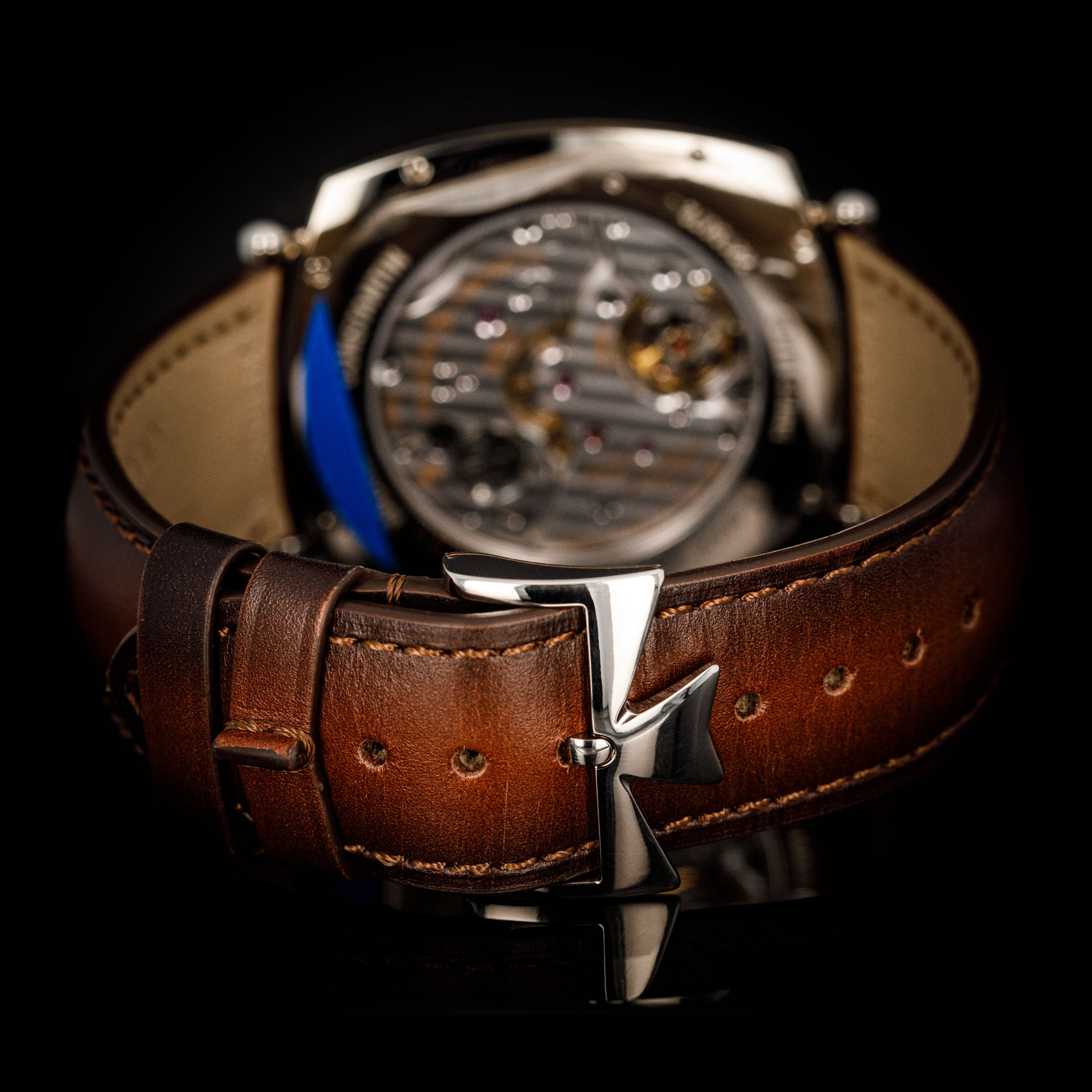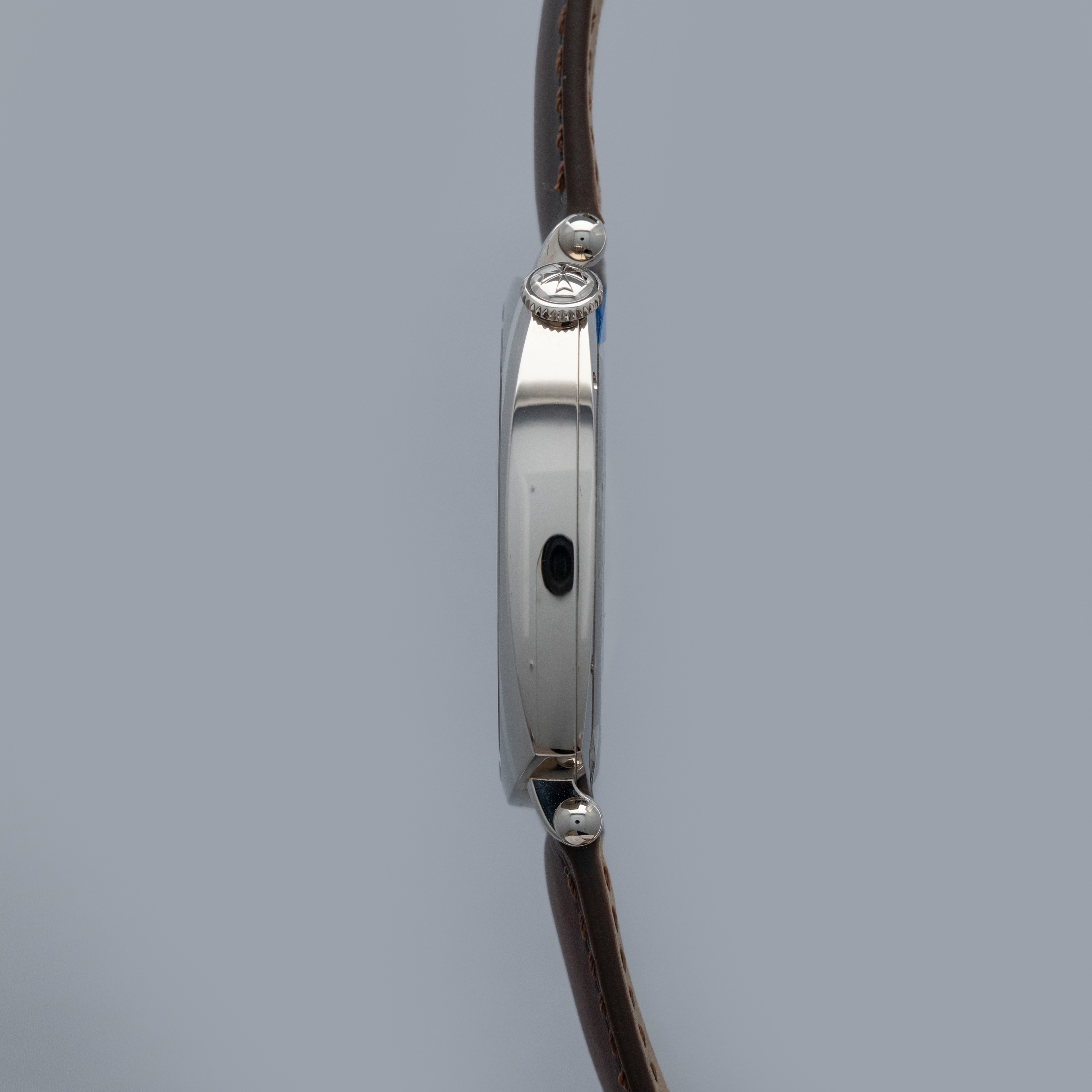 Featuring an 18kt white gold cushion-shaped case with a crown at 2 o'clock (or at 12 o'clock in the 1921's case) with short lugs and sharp corners, the 1921's construction is immediately reminiscent of the Art Deco period that inspired it.