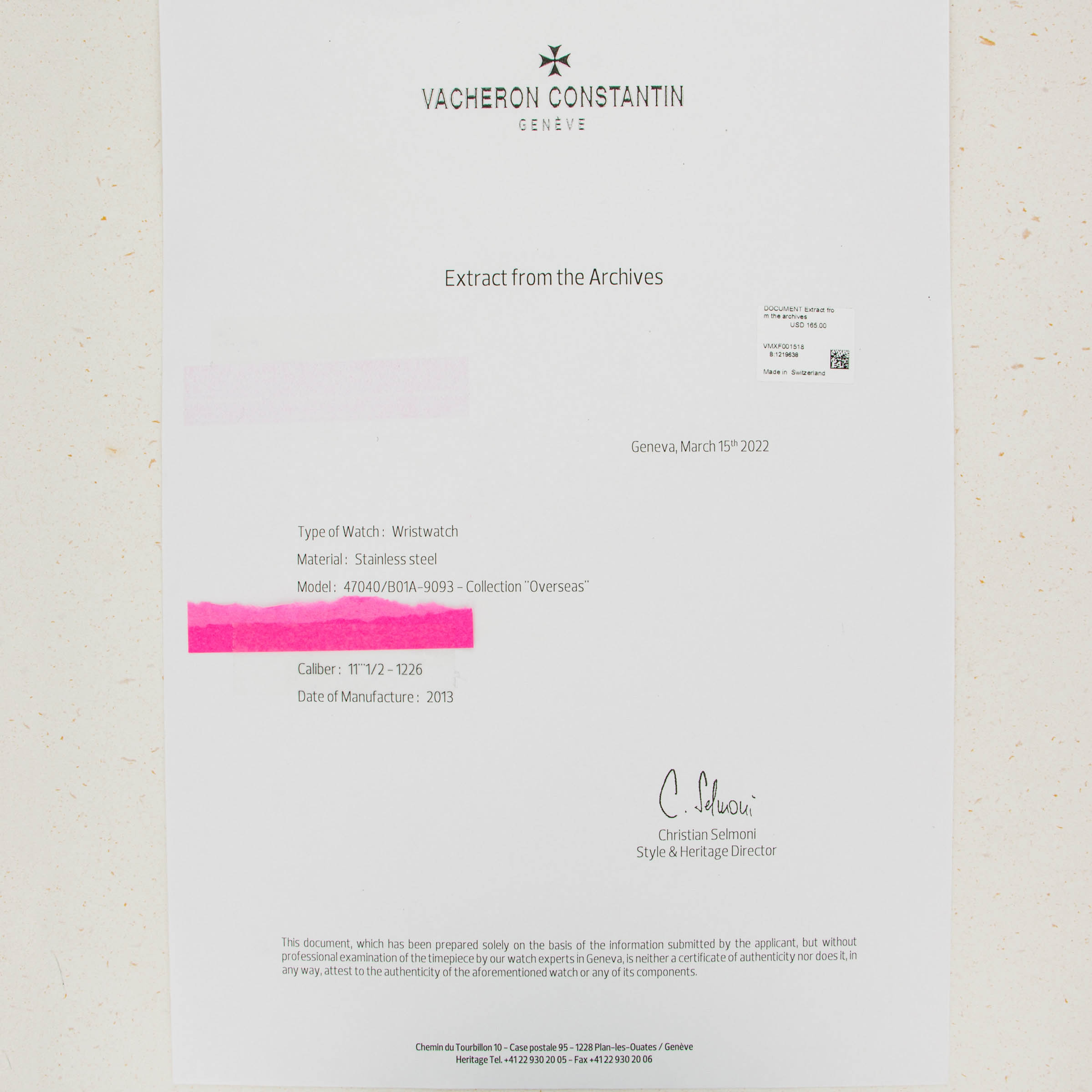 With a beautiful silver dial, this Overseas ref. 47040 features a large display with an intricate guilloche engraved pattern along with applied indices along the length of the dial with applied Arabic numerals at 3, 6, 9, and 12 o 'clock and a subtle date window at 4:30.