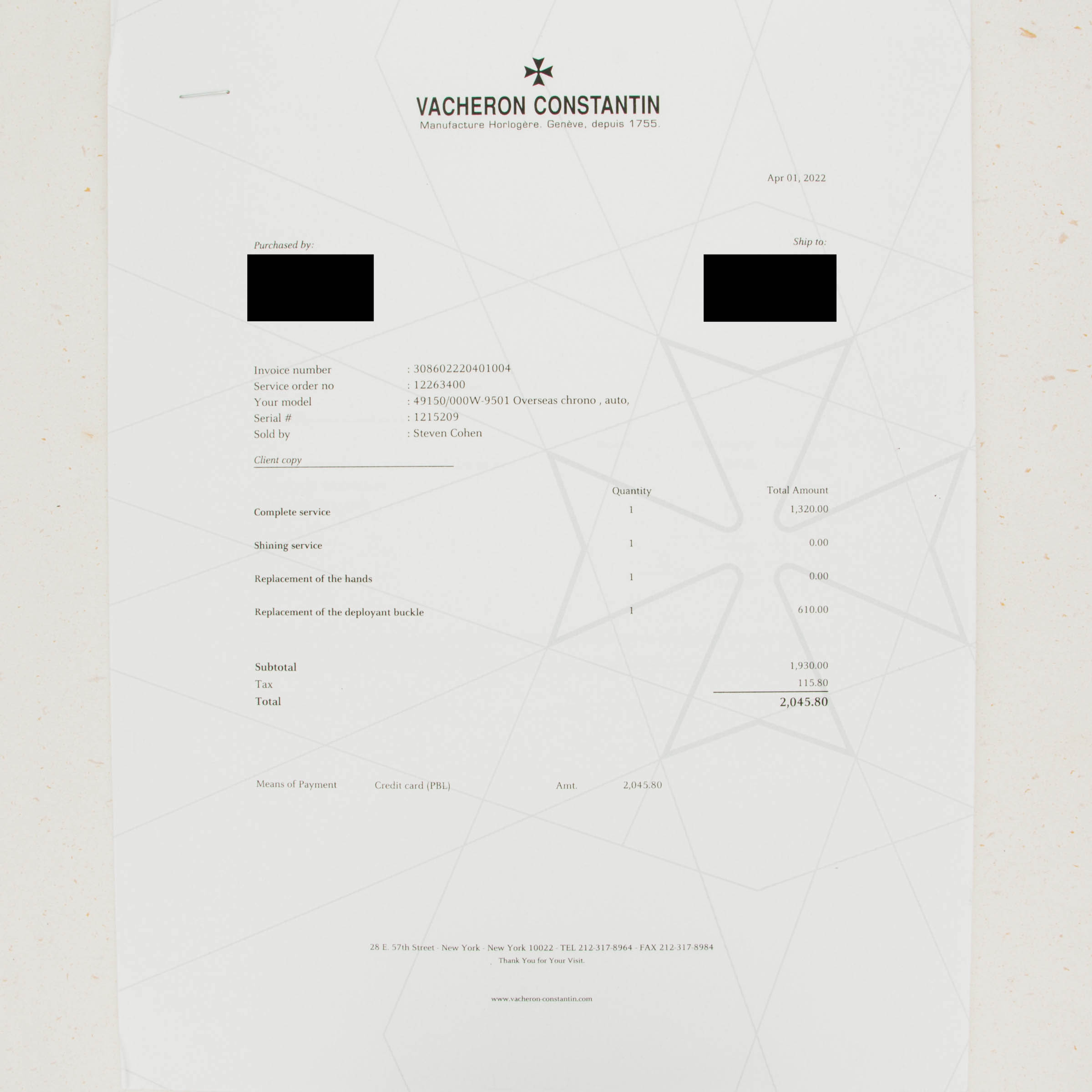 Watch is in excellent over condition. Case exhibits some wear, with minor marks and abrasions visible on the surface. Watch was recently overhauled at Vacheron and as noticed on the invoice, the case was polished and the hands were replaced, as well as the deployant buckle.