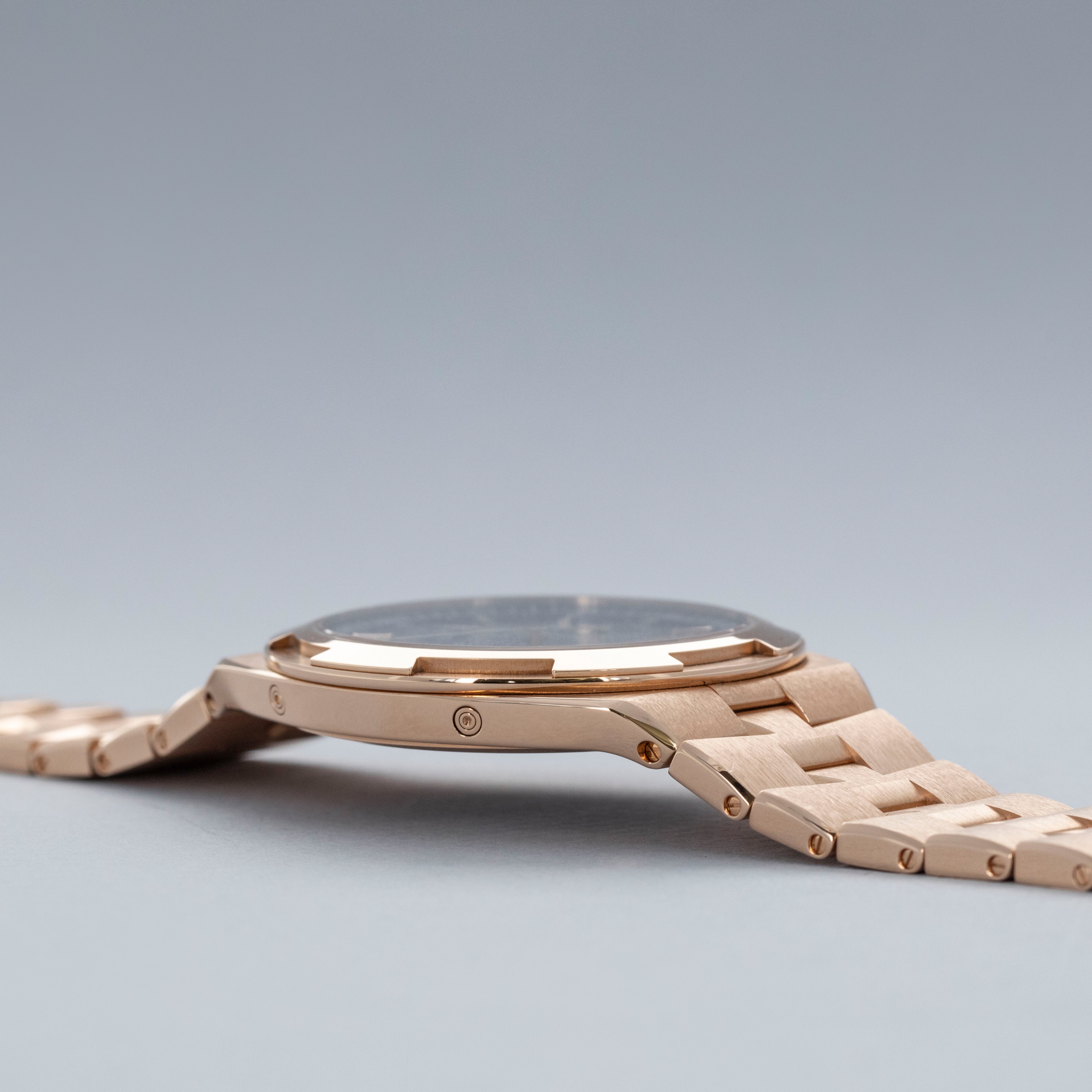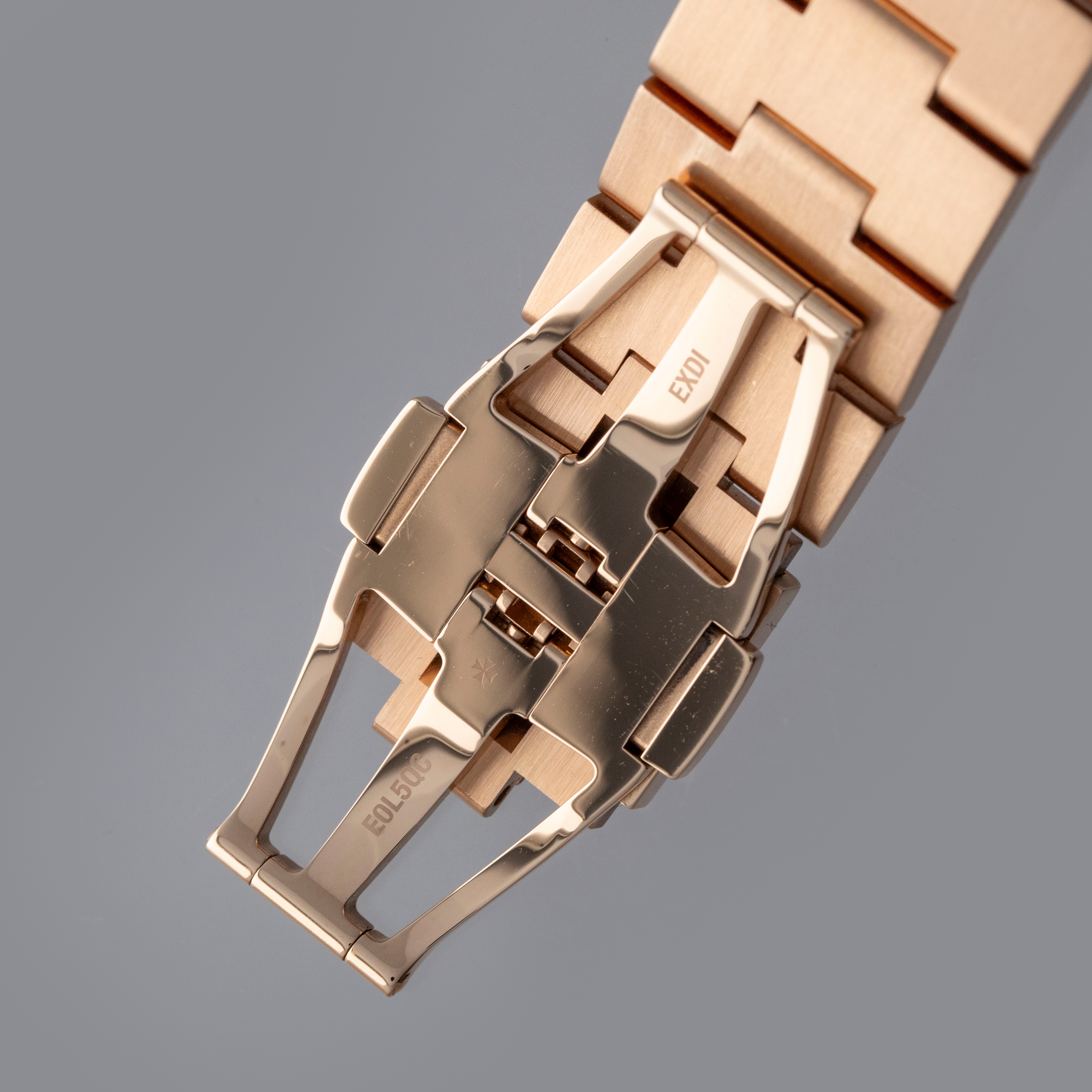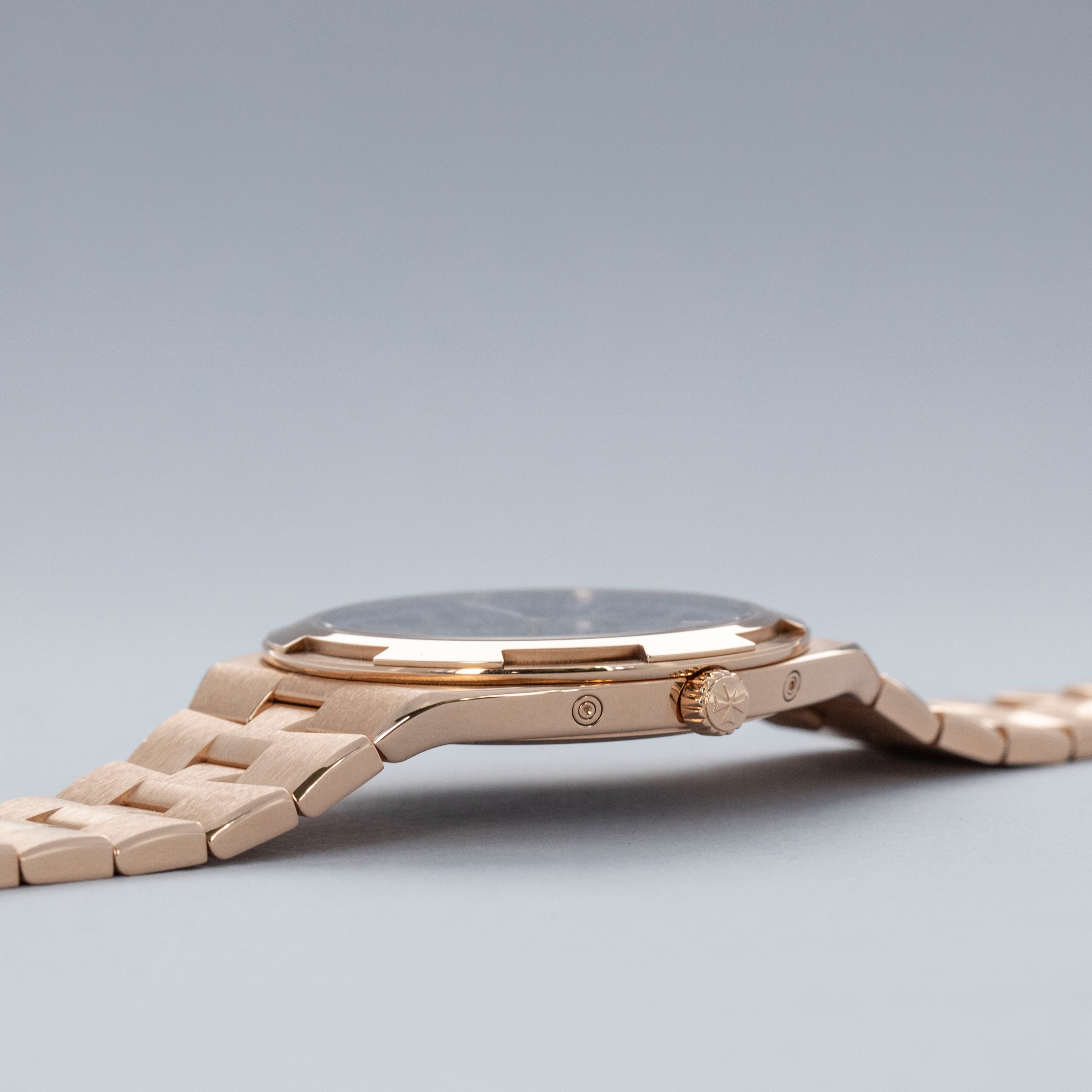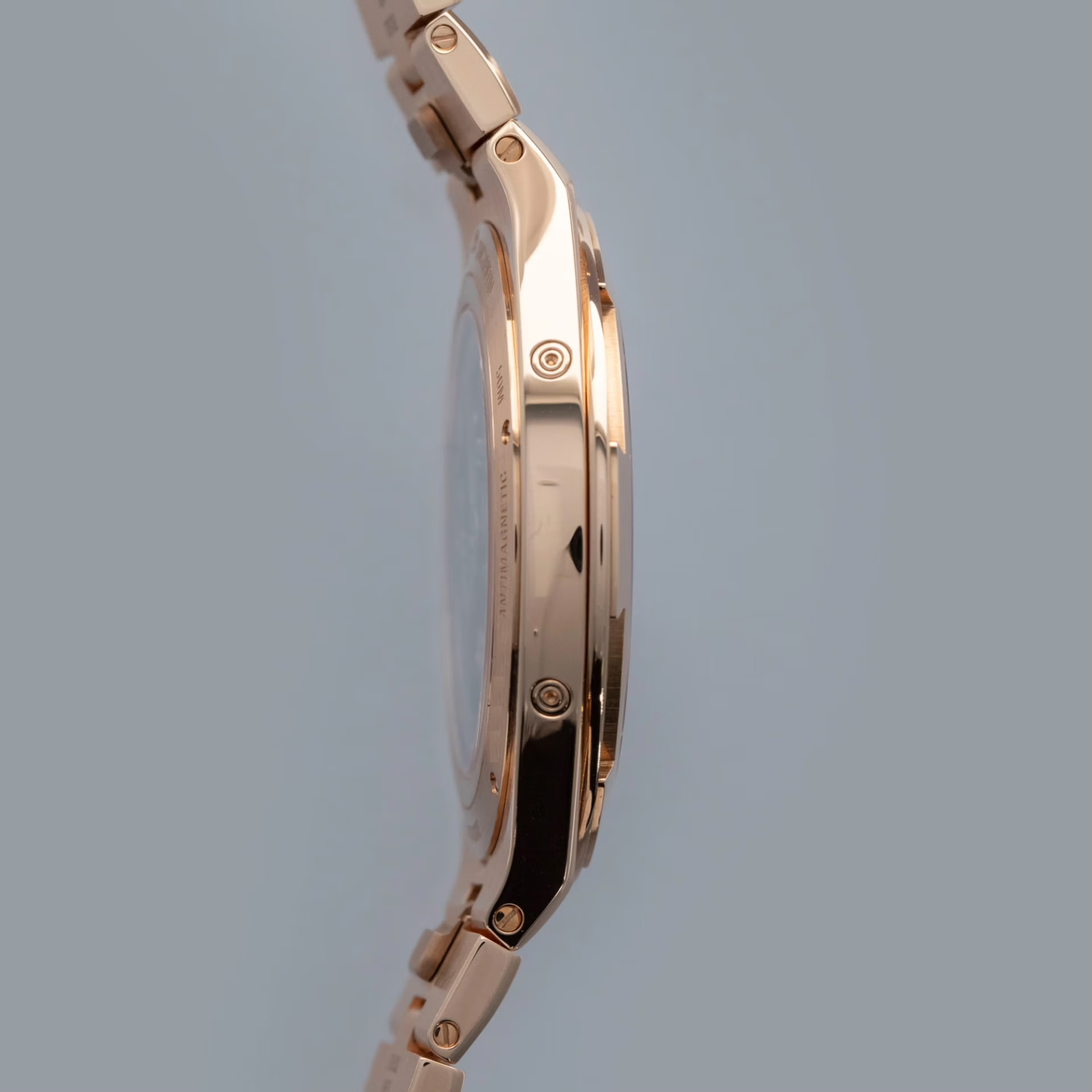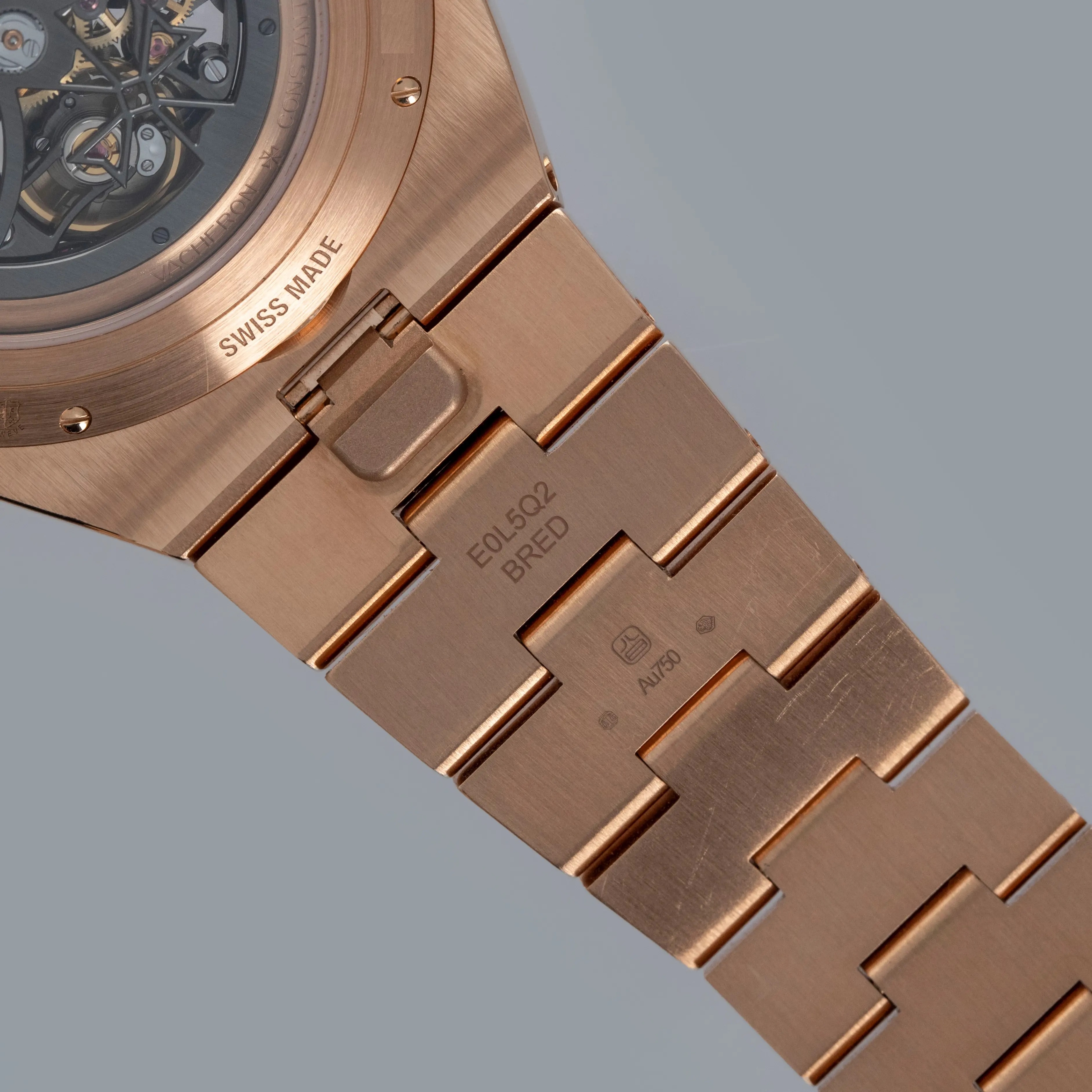 Offered in 18kt rose gold and featuring all of the Overseas' iconic design elements such as its integrated Maltese cross-inspired bracelet and bezel, this timepiece wears with the level of candour that it deserves.