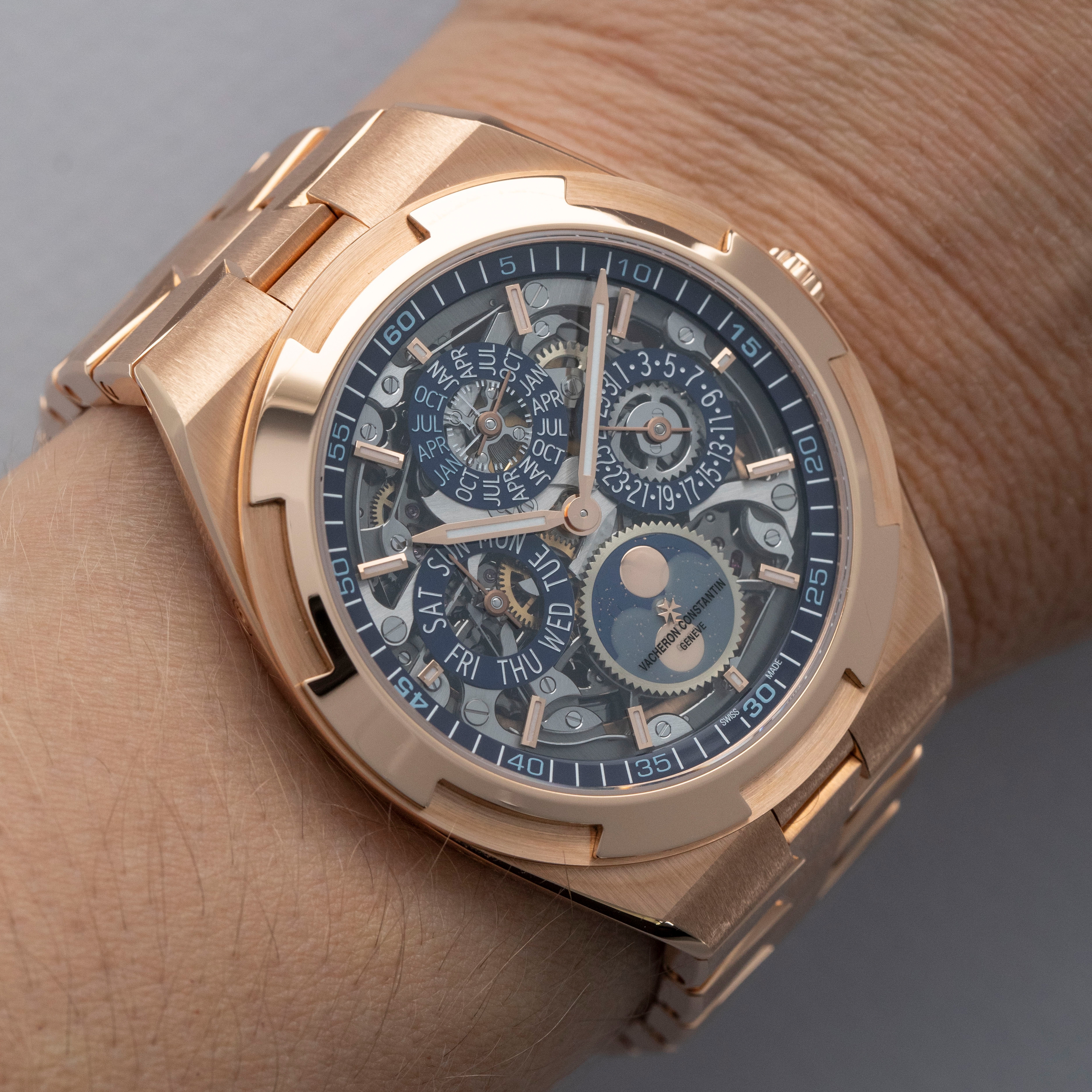 Released in 2016, the latest generation Overseas model has modernized the collection's aesthetics, upgraded its construction and improved Vacheron Constantin's flagship sports model in leaps and bounds. Drawing its inspiration from Vacheron's older 222 collection from 1977, the Overseas features a polished Maltese cross-inspired bezel and Maltese cross-inspired bracelet links that call back to the watchmaker's iconic logo. Furthermore, with 120m of water resistance, an incredible quick release system for changing between the metal bracelet and rubber or leather straps and its stunning dials ranging from blue to black to silver and more, they are a great all-around addition to any collection as wearability, utility and beauty have all been prioritized above all else. With Vacheron's incredible craftsmanship on display, too, the 3rd generation Overseas is a marvellous timepiece that is only beginning to gain the traction within the market that it deserves. Launched in 2022 as perhaps the crown jewel within the collection, the ref. 4300V/220R-B642 showcases the craftsmanship that Vacheron have to offer within their Overseas collection. Made of 18kt rose gold, its construction is luxurious, but that’s not just where it ends. Indeed, the Overseas Perpetual Calendar Ultra-Thin Skeleton’s piece de resistance is its skeletonised dial, as its name suggests. Providing an almost entirely uninterrupted view of the automatic cal. 1120/3 QPSQN/1 below that allows the watch to be an incredibly thin 8.1mm tall, this timepiece’s display balances its function with stunning craftsmanship and intelligent design. A perfect watch in many regards, this timepiece proves exactly why Vacheron are as highly regarded by collectors as they are.