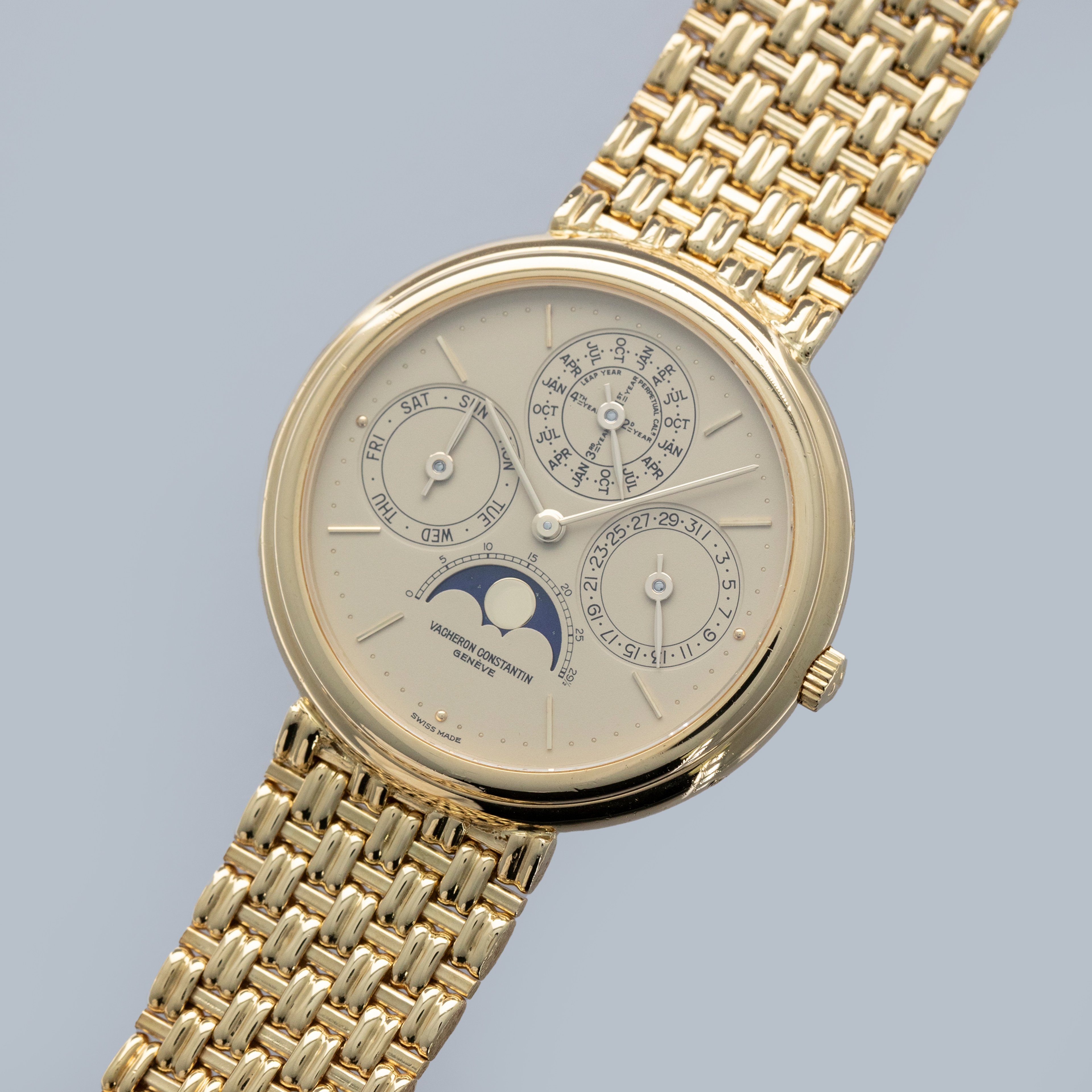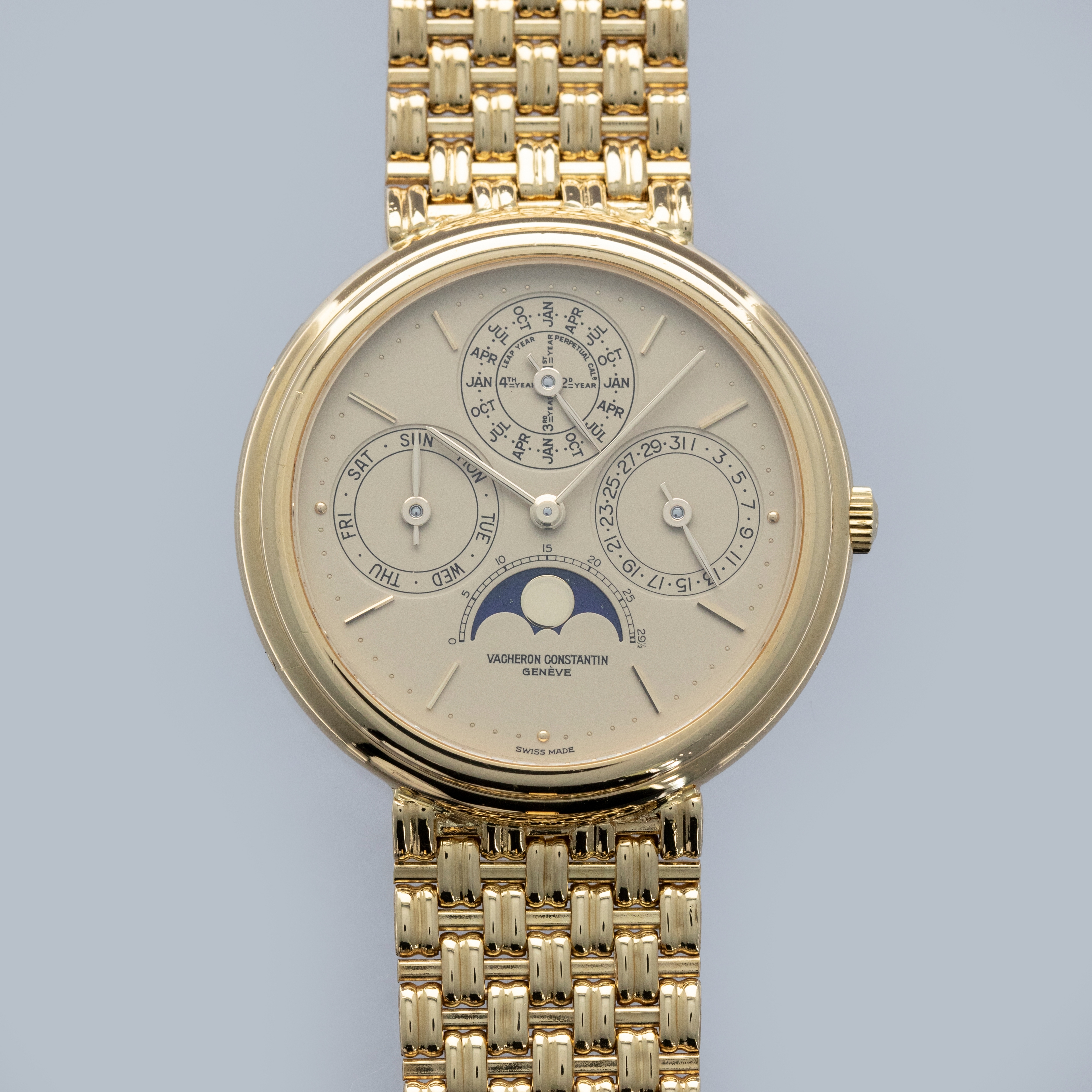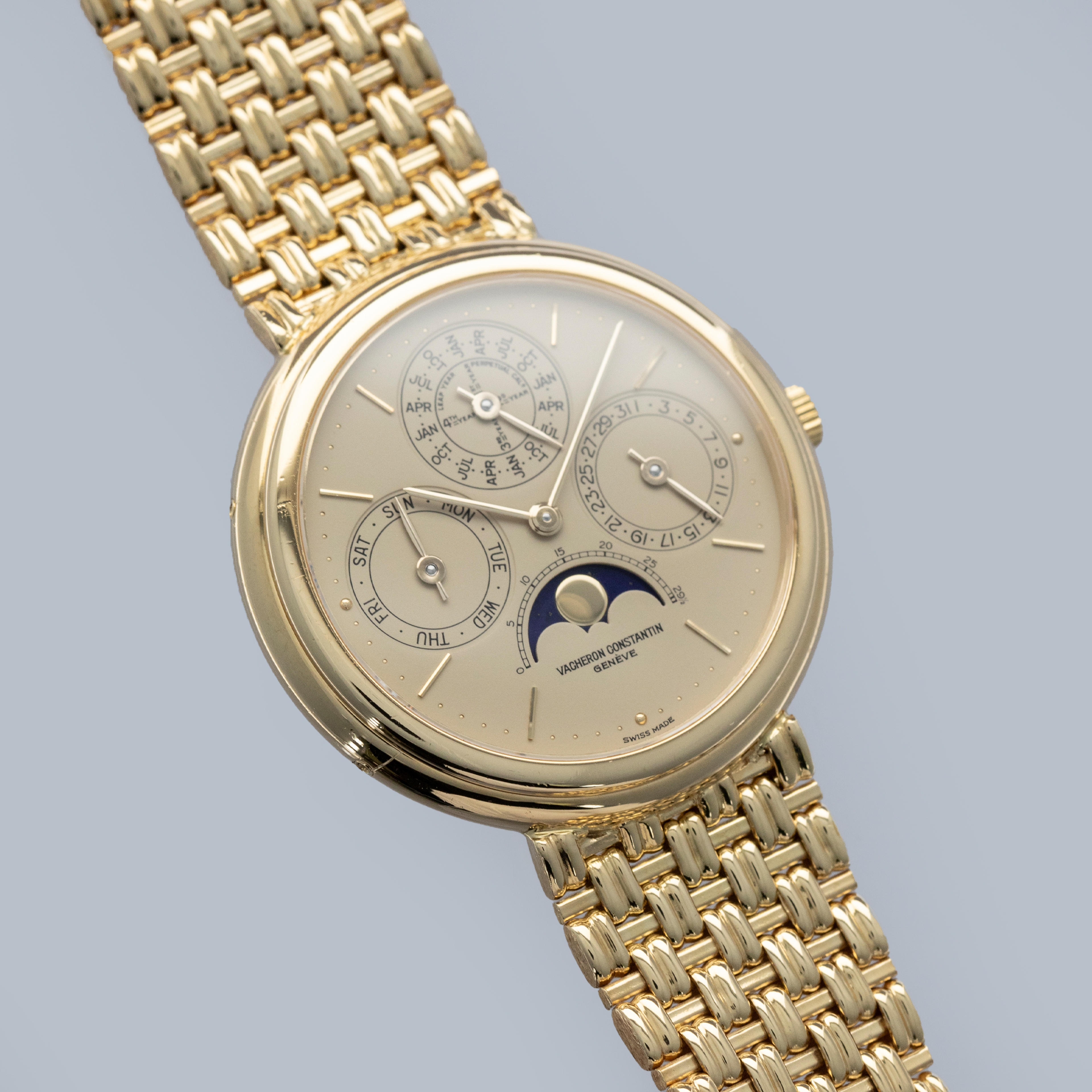 Revered by collectors and watchmakers alike for their classical approach to watchmaking, Vacheron Constantin are renowned for their old-time aesthetic, heritage-inspired designs and traditionalist view of mechanics. With this, some of Vacheron's timepieces offer a wonderful view of the timepieces that came generations before the modern watches of today and the Patrimony Perpetual Calendar ref. 43031 that we have here is a testament to exactly that. Released in 1984 as one of the very few ultra-thin perpetual calendars and produced until the early 2000s, the Vacheron Constantin Patrimony Perpetual Calendar ref. 43031 that we have here combines some facets of modern watchmaking with timeless design choices to create a timepiece that is effortlessly elegant. Boasting a 36mm 18kt yellow gold case with a stepped bezel and an intricately designed integrated basket weave bracelet, the ref. 43031 wears equally modern on the wrist as it does with a vintage flair. Sporting a golden dial with sunken subdials rich with inscriptions for their complications, the ref. 43031’s dial is a lesson in understated refinement. Boasting applied gold indices, the ref. 43031 exemplifies the idea that Vacheron pays attention to the small details.