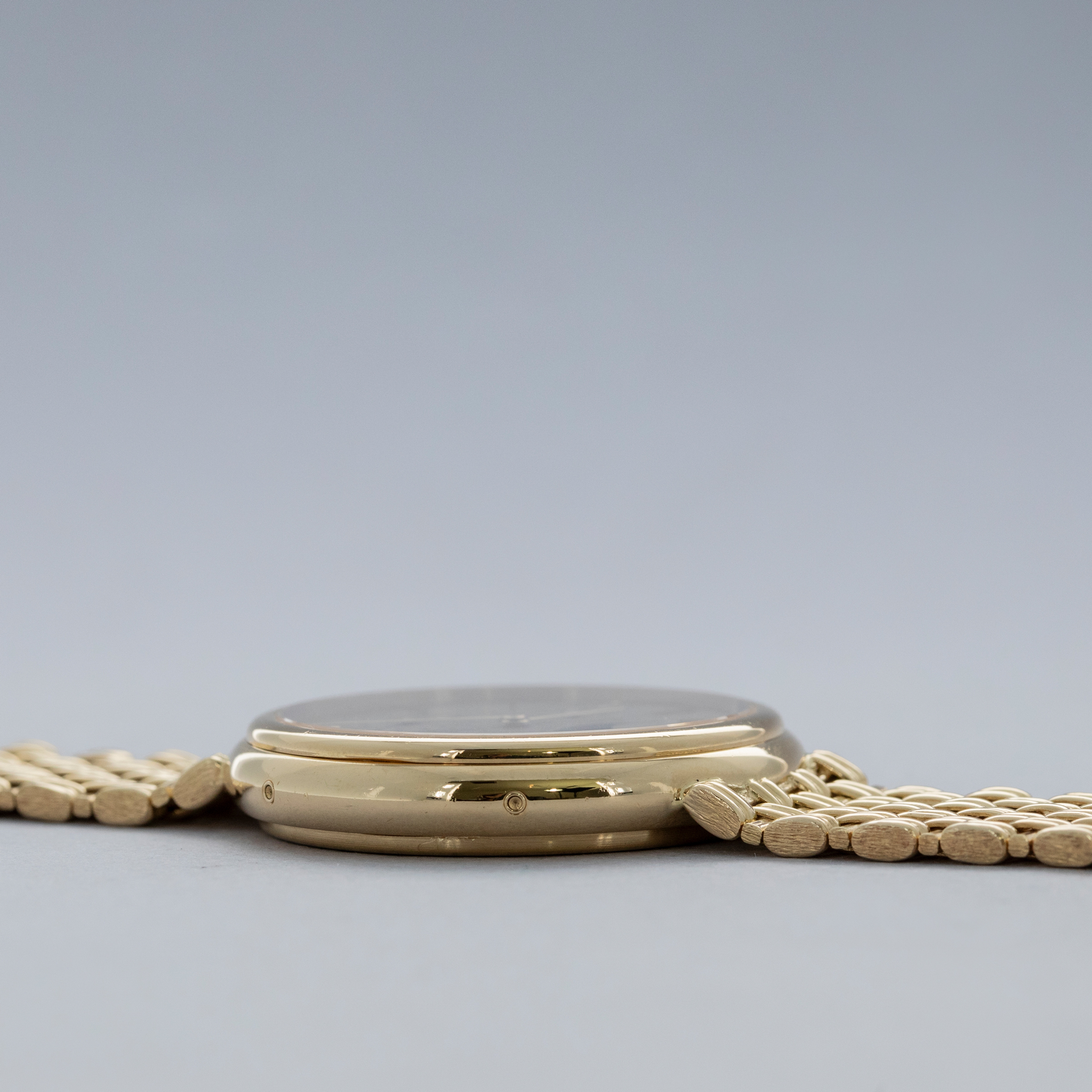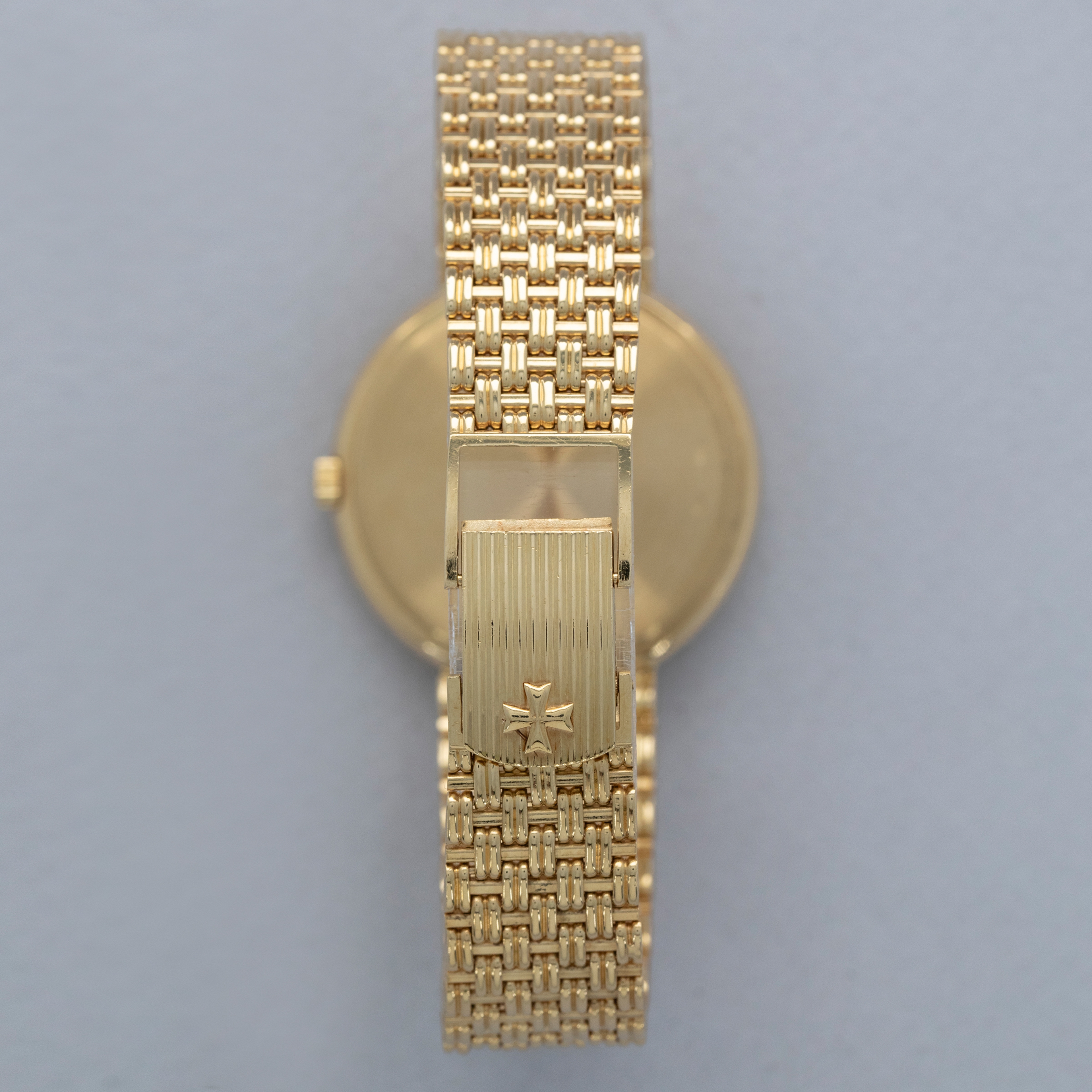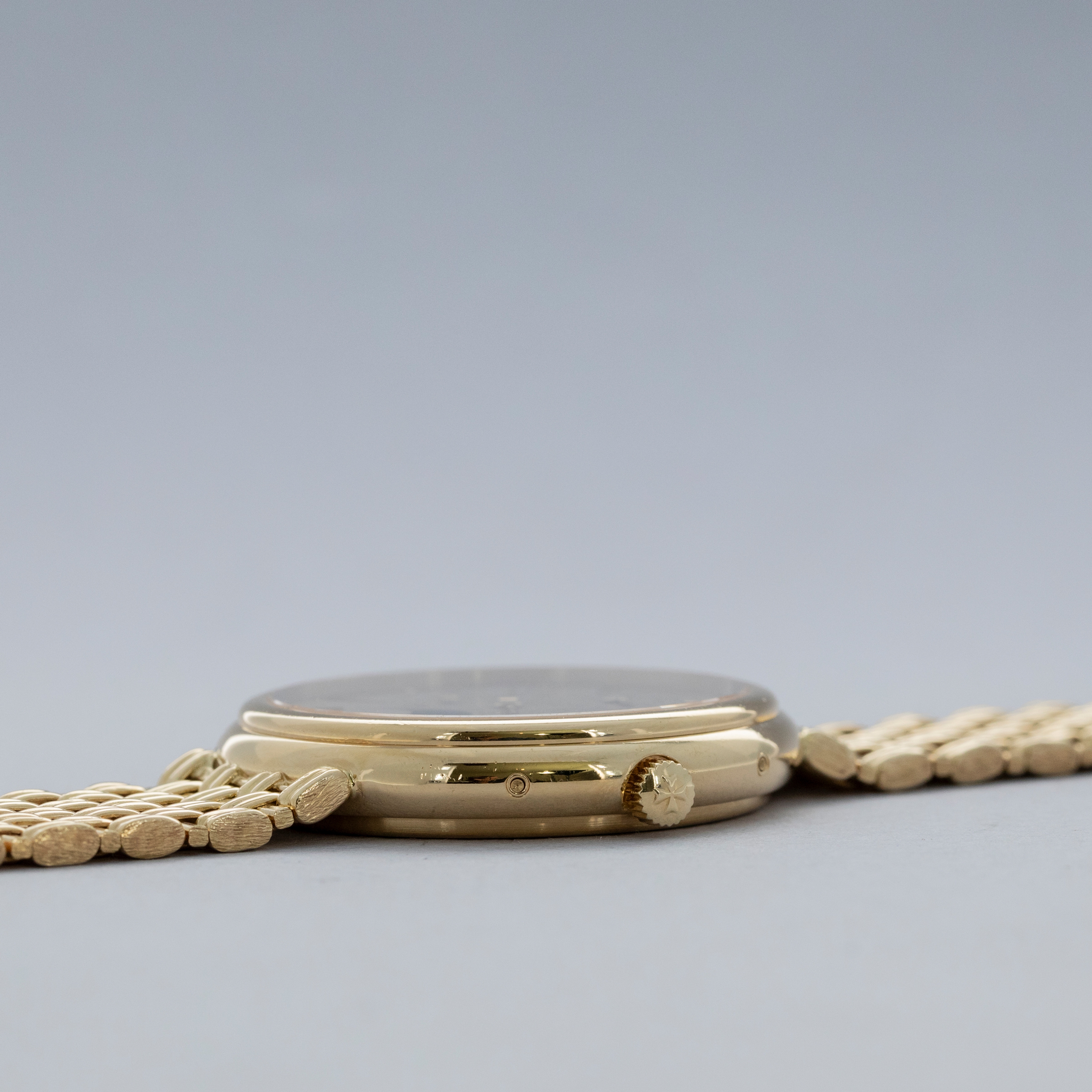 Revered by collectors and watchmakers alike for their classical approach to watchmaking, Vacheron Constantin are renowned for their old-time aesthetic, heritage-inspired designs and traditionalist view of mechanics. With this, some of Vacheron's timepieces offer a wonderful view of the timepieces that came generations before the modern watches of today and the Patrimony Perpetual Calendar ref. 43031 that we have here is a testament to exactly that. Released in 1984 as one of the very few ultra-thin perpetual calendars and produced until the early 2000s, the Vacheron Constantin Patrimony Perpetual Calendar ref. 43031 that we have here combines some facets of modern watchmaking with timeless design choices to create a timepiece that is effortlessly elegant. Boasting a 36mm 18kt yellow gold case with a stepped bezel and an intricately designed integrated basket weave bracelet, the ref. 43031 wears equally modern on the wrist as it does with a vintage flair. Sporting a golden dial with sunken subdials rich with inscriptions for their complications, the ref. 43031’s dial is a lesson in understated refinement. Boasting applied gold indices, the ref. 43031 exemplifies the idea that Vacheron pays attention to the small details.