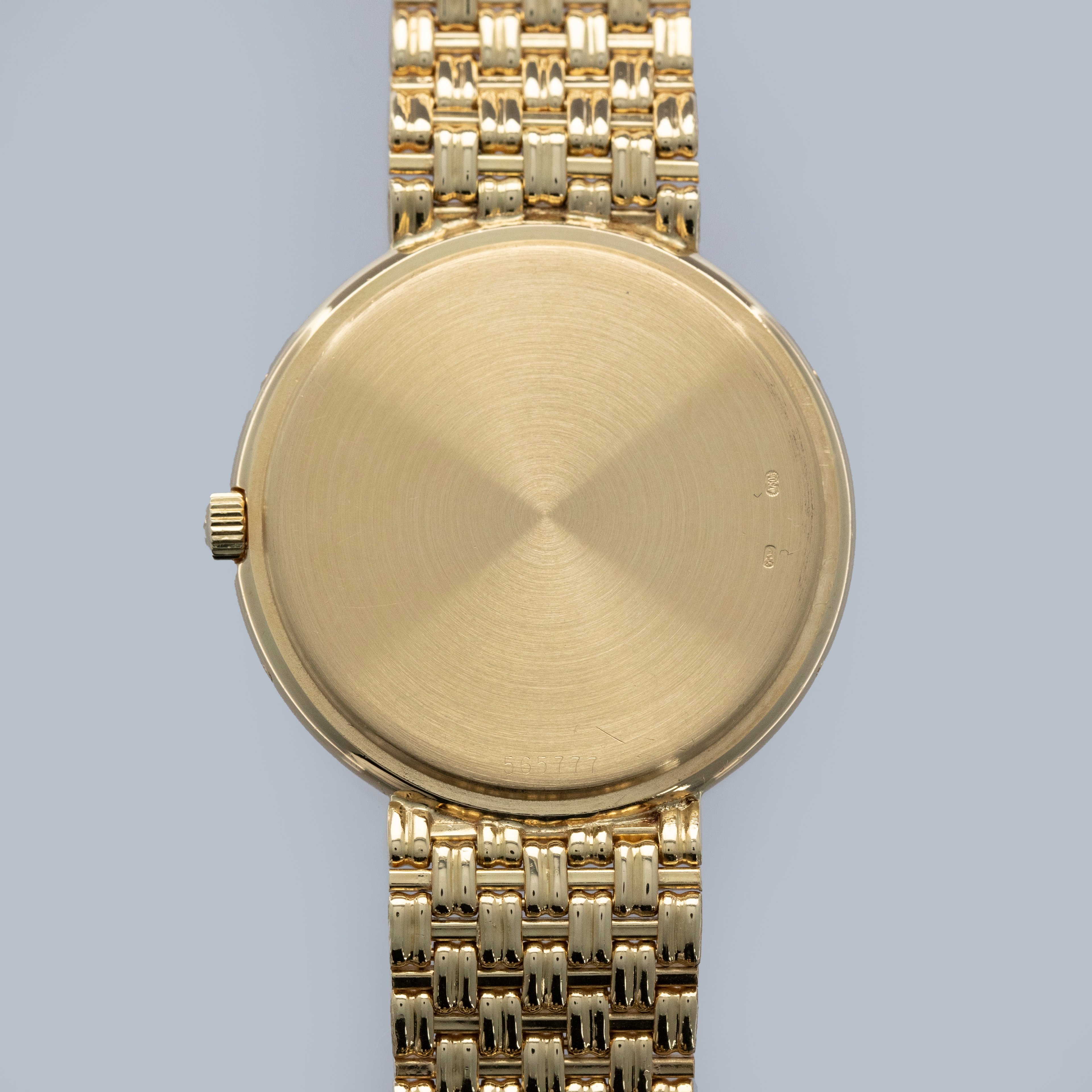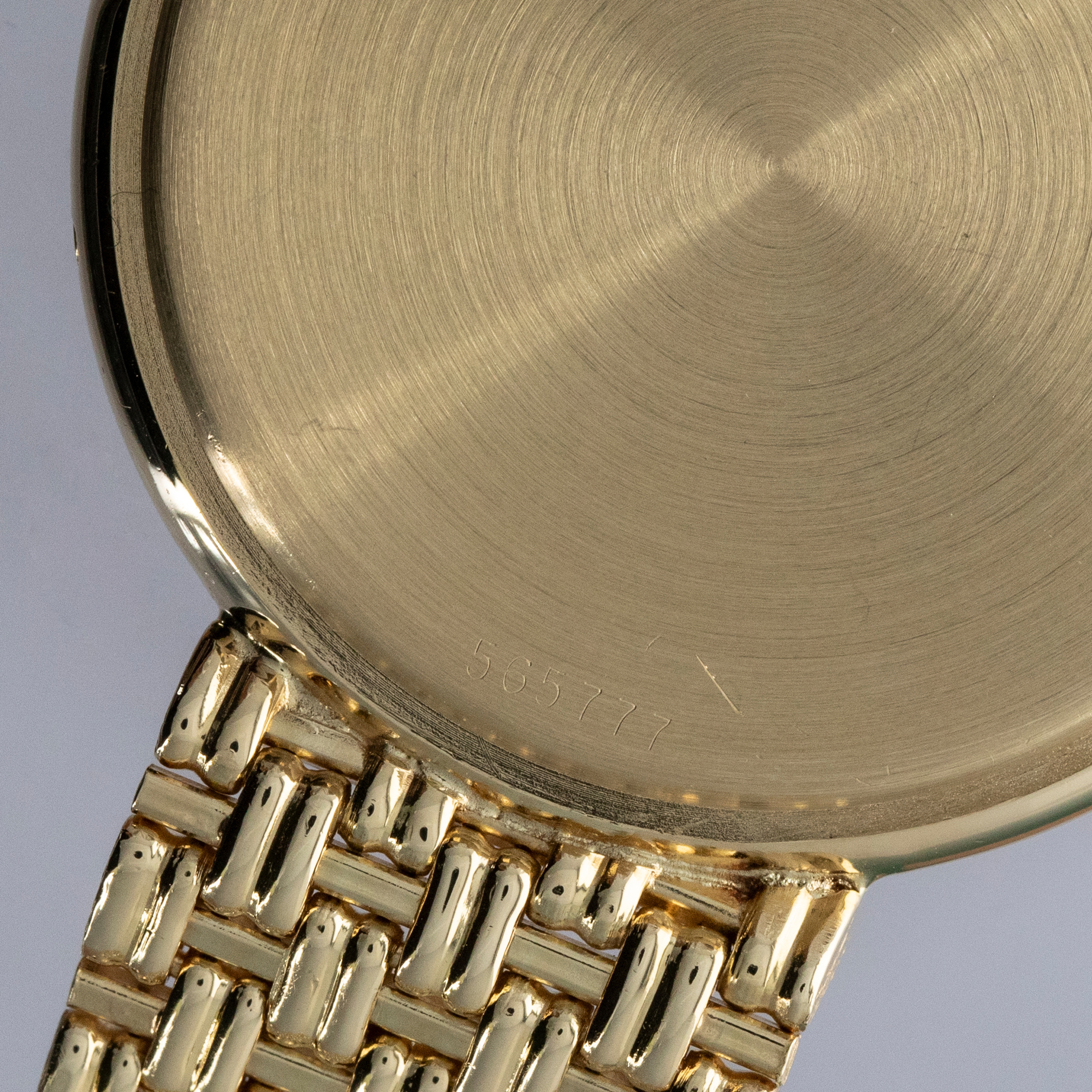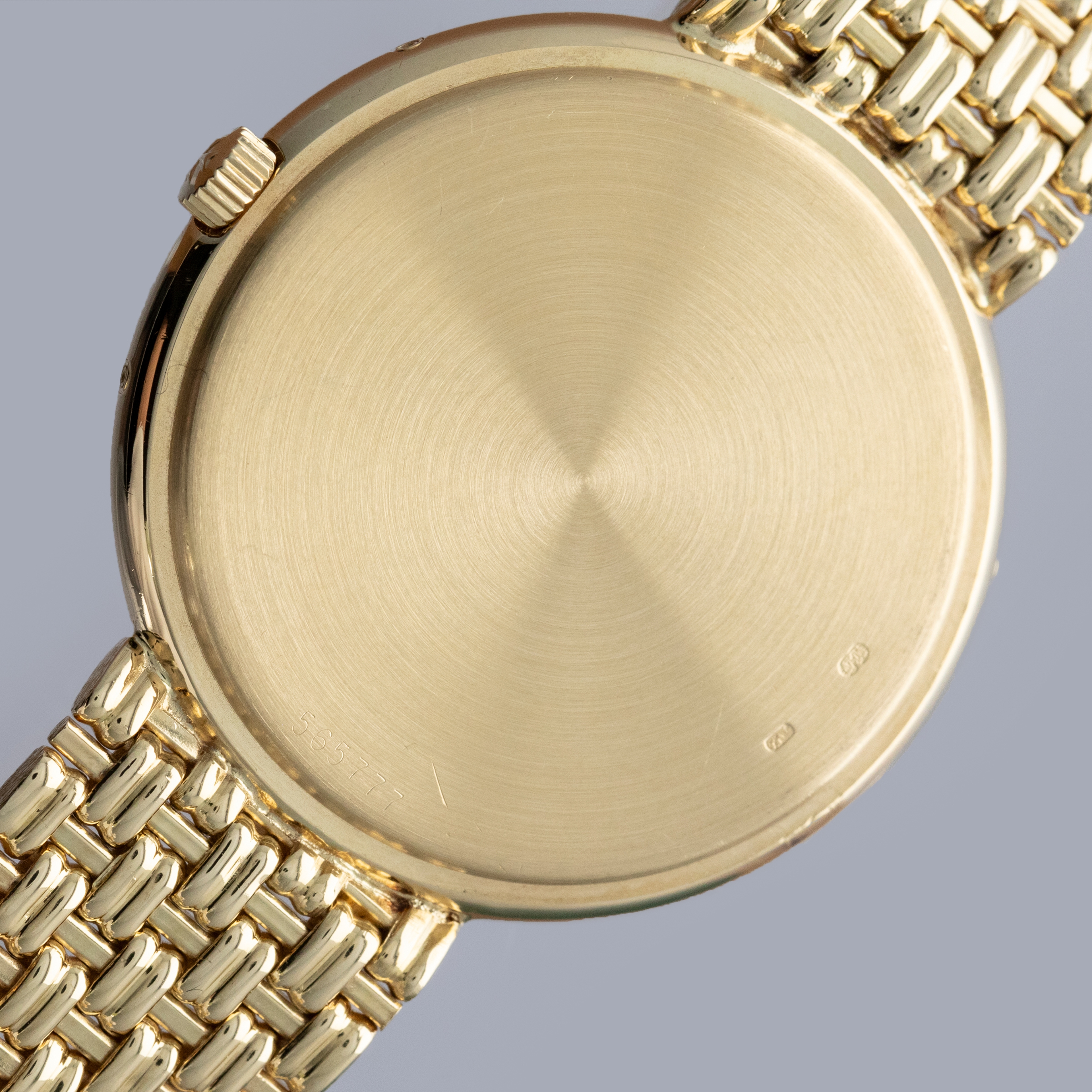 The watch is in overall excellent condition. The yellow gold case has some light scratches and a couple of very light nicks on the bezel. Caseback retains fully legible serial number and gold hallmarks. The dial is pristine, with clean gold no-lume hands. The integrated bracelet is in excellent condition, with light scratches on the polished links and a well-defined bark finish on the sides, with negligible play between the links. It fits approximately a 7 1/2" wrist.