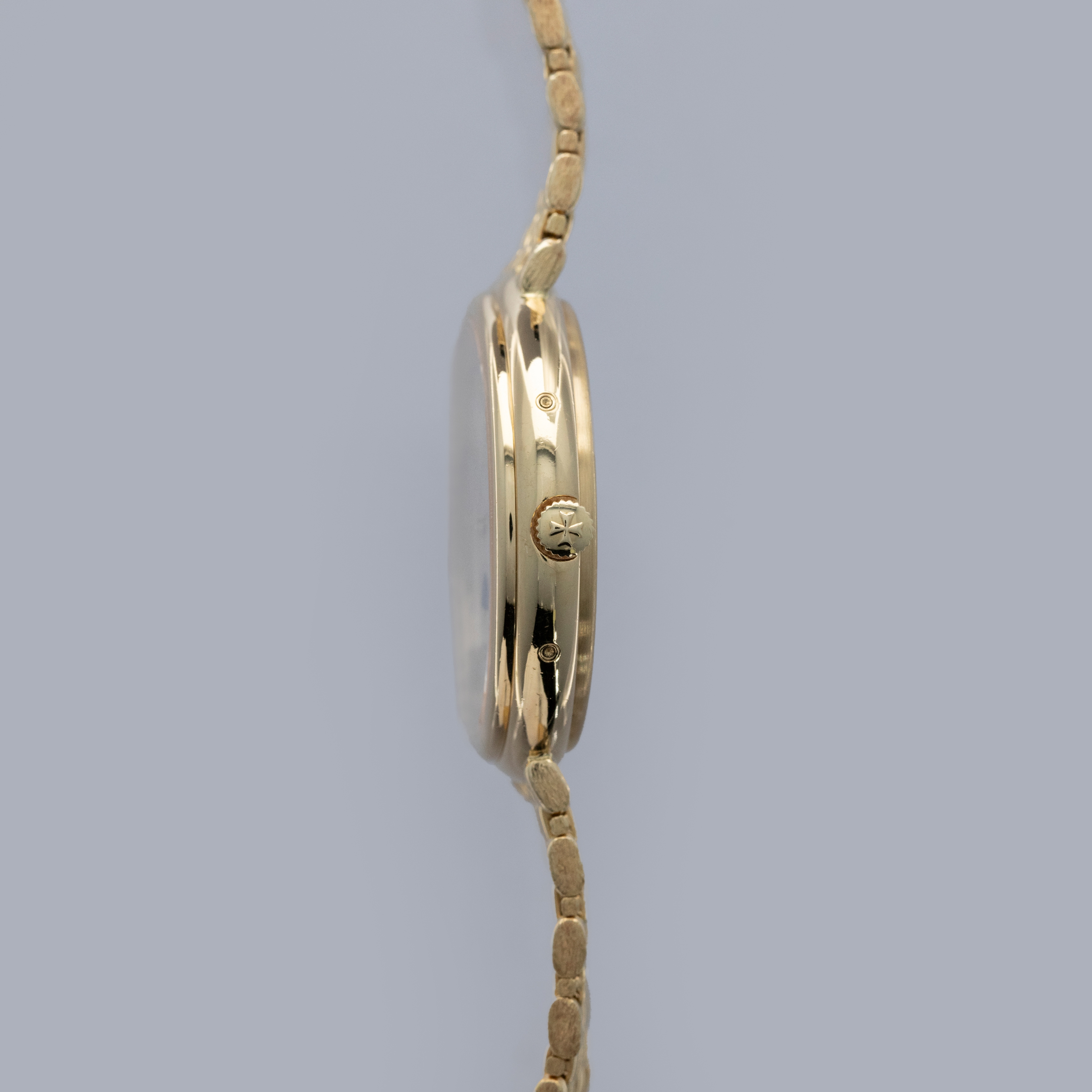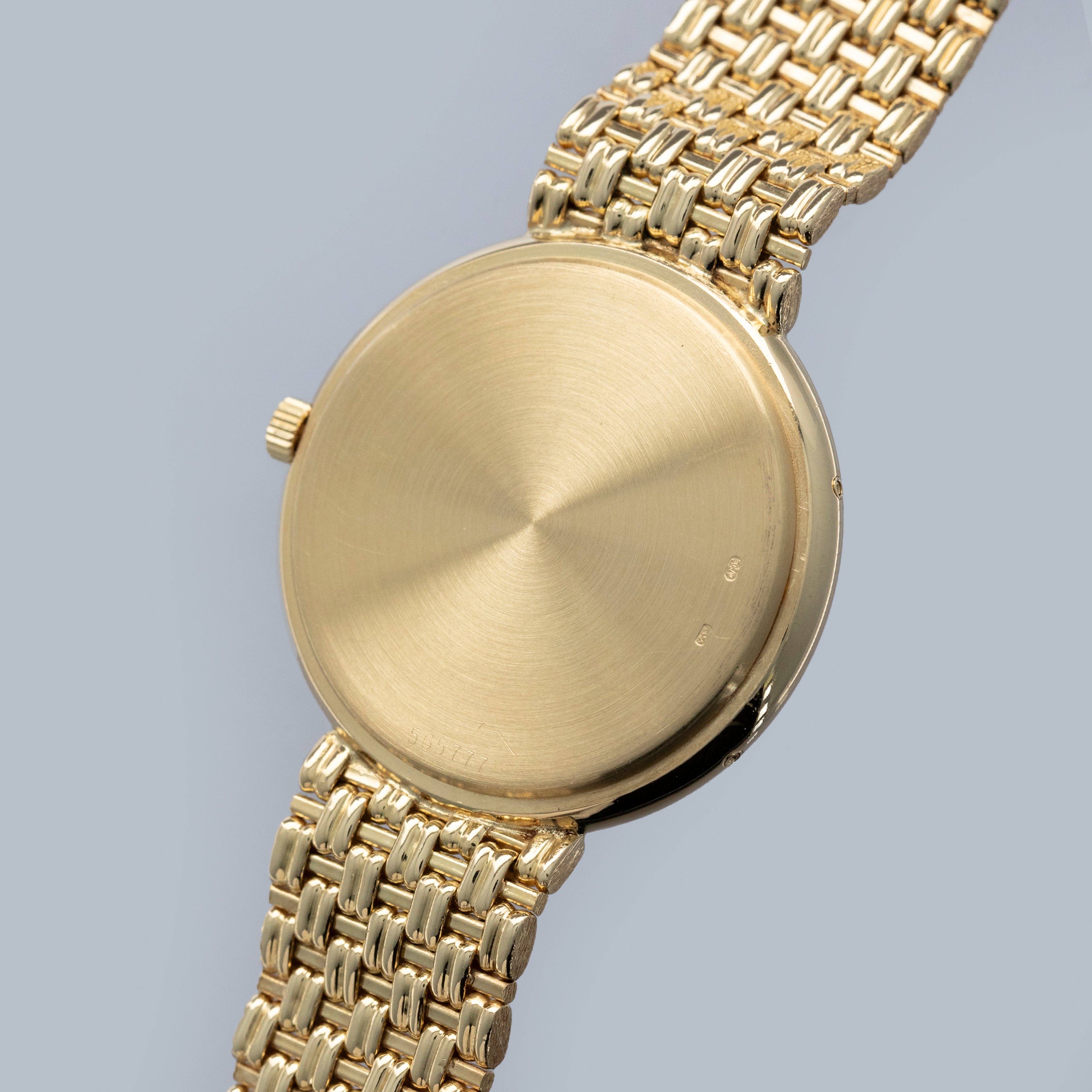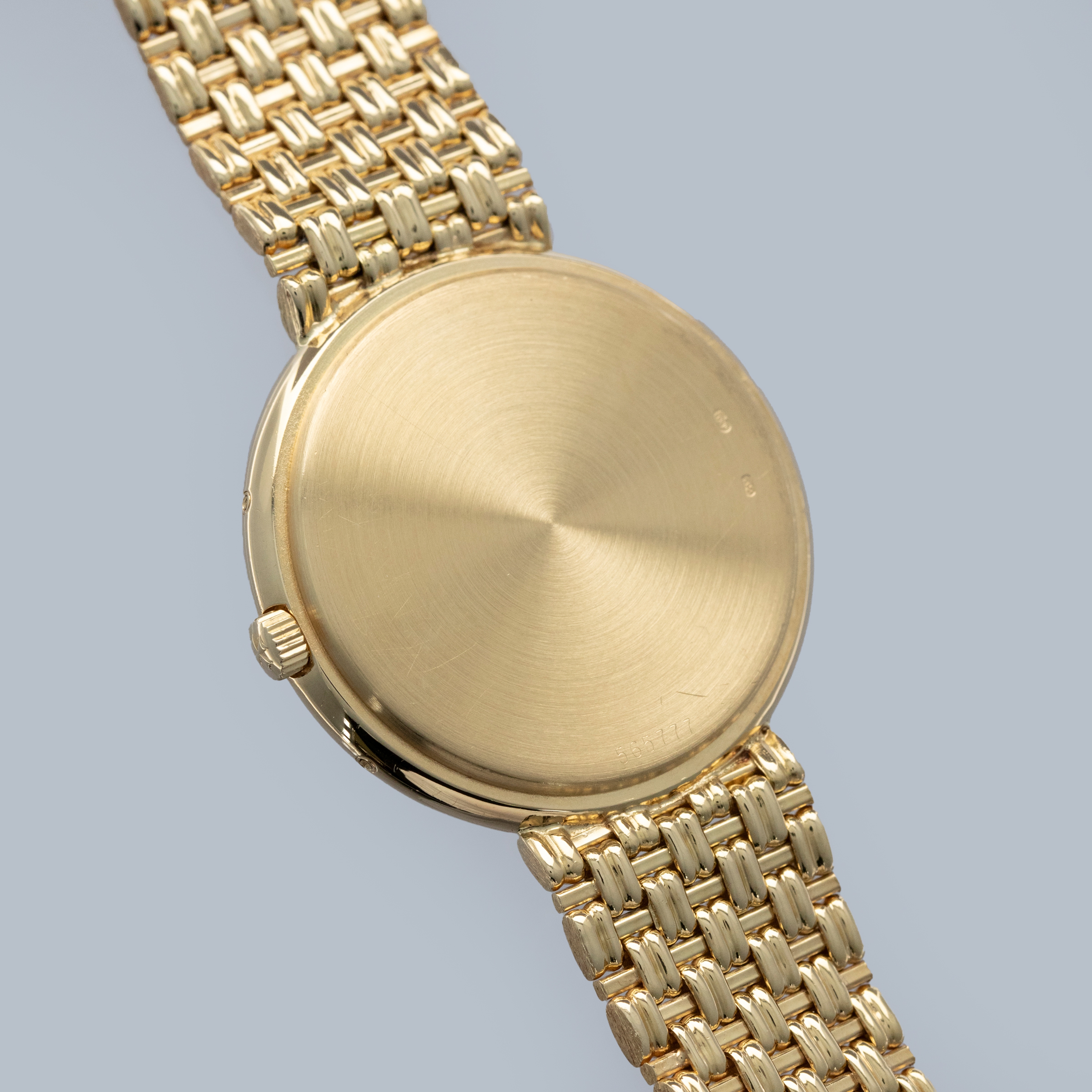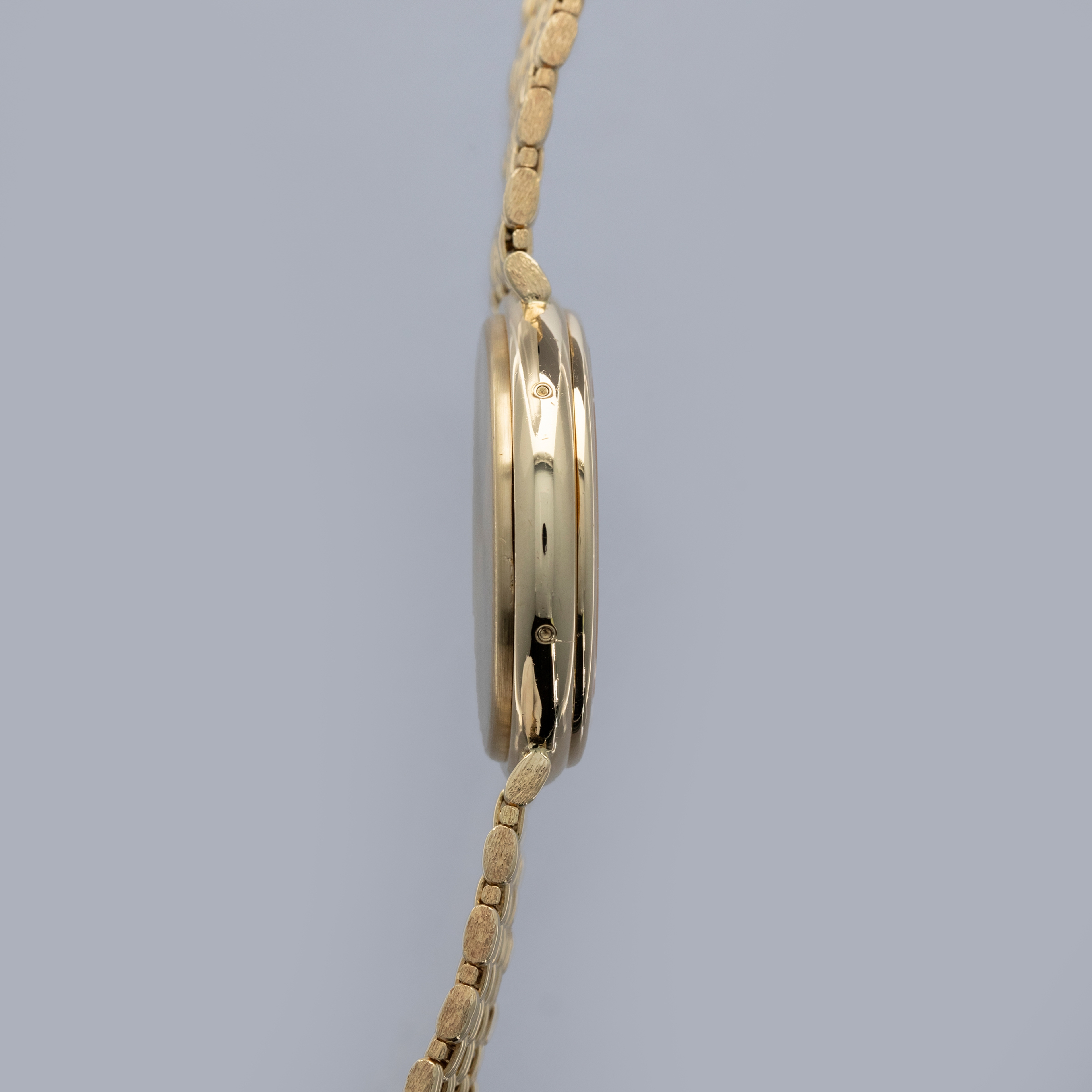 The watch is in overall excellent condition. The yellow gold case has some light scratches and a couple of very light nicks on the bezel. Caseback retains fully legible serial number and gold hallmarks. The dial is pristine, with clean gold no-lume hands. The integrated bracelet is in excellent condition, with light scratches on the polished links and a well-defined bark finish on the sides, with negligible play between the links. It fits approximately a 7 1/2" wrist.
