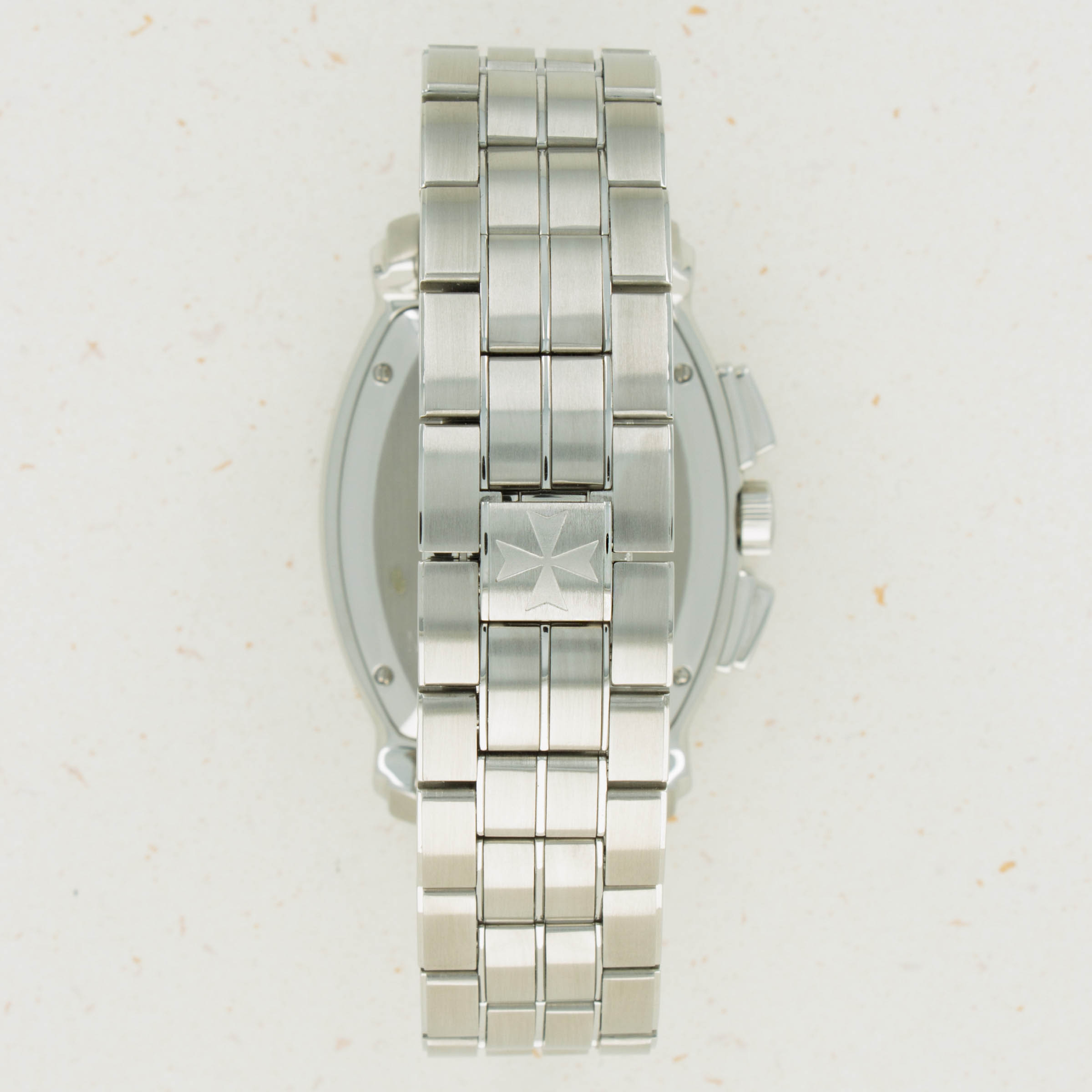 With a symmetrical silver dial, the Royal Eagle ref. 49145 features a big date at 12 o'clock alongside a trio of recessed subdials that give its display a wonderful level of depth that is only added to by its large applied Arabic numerals.