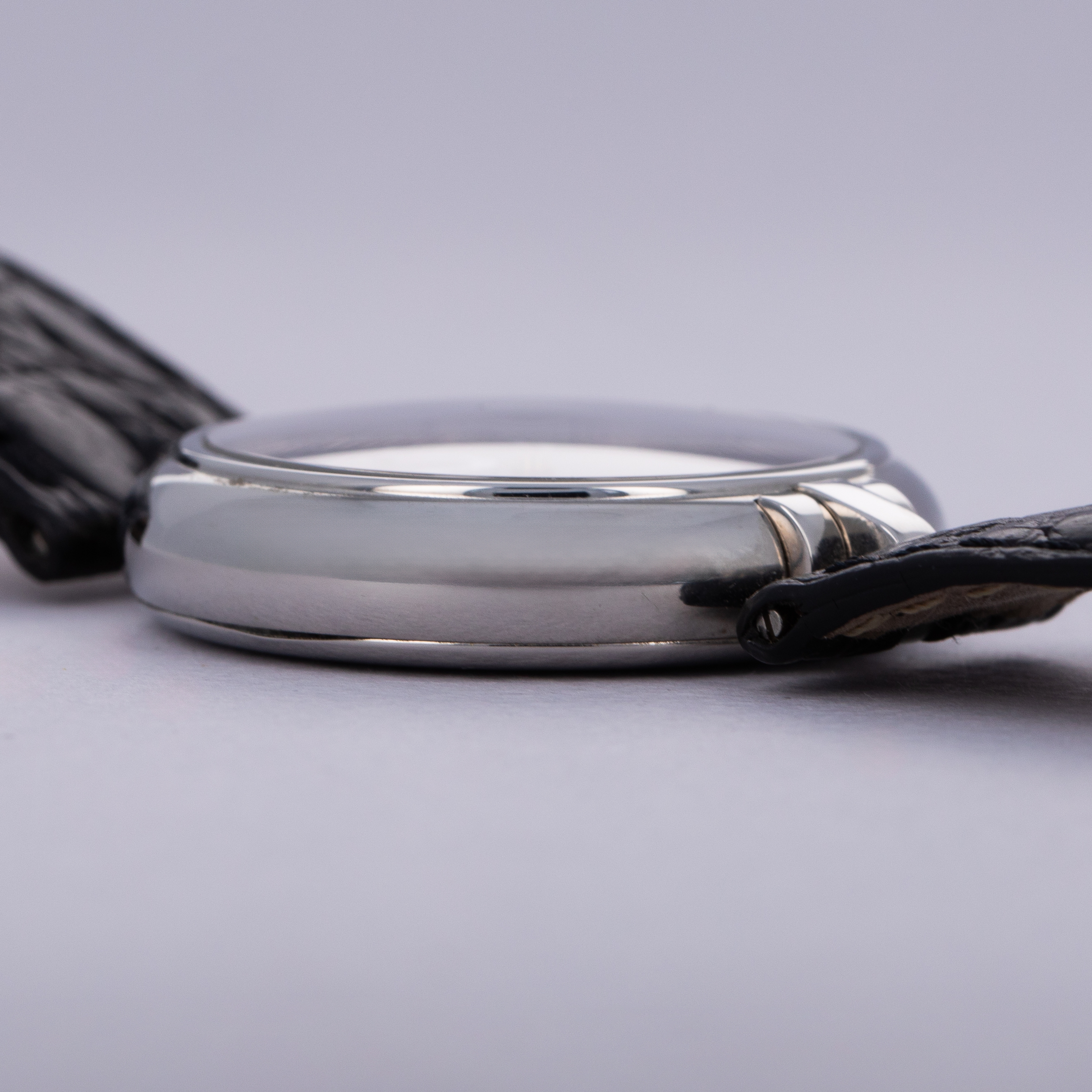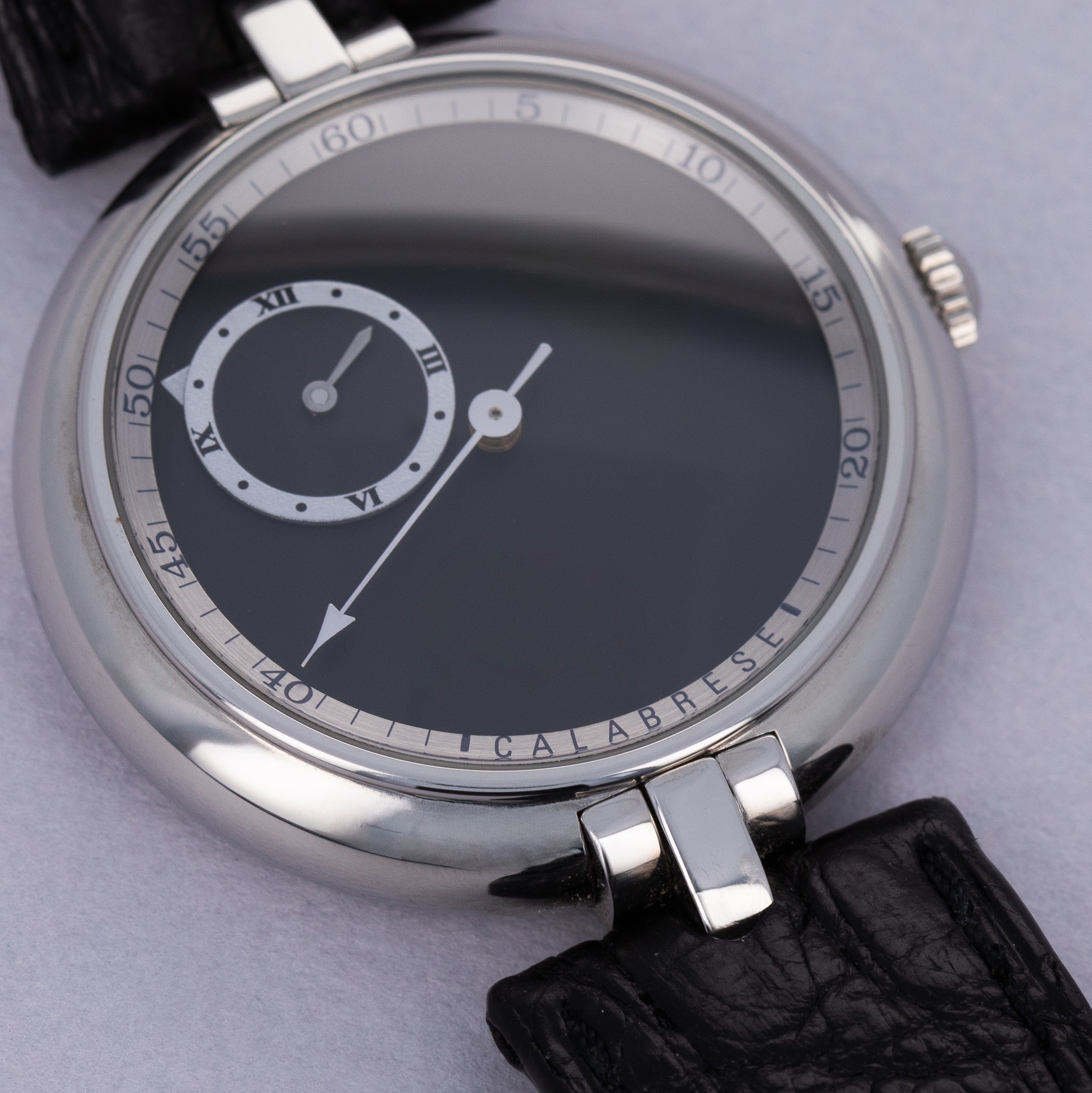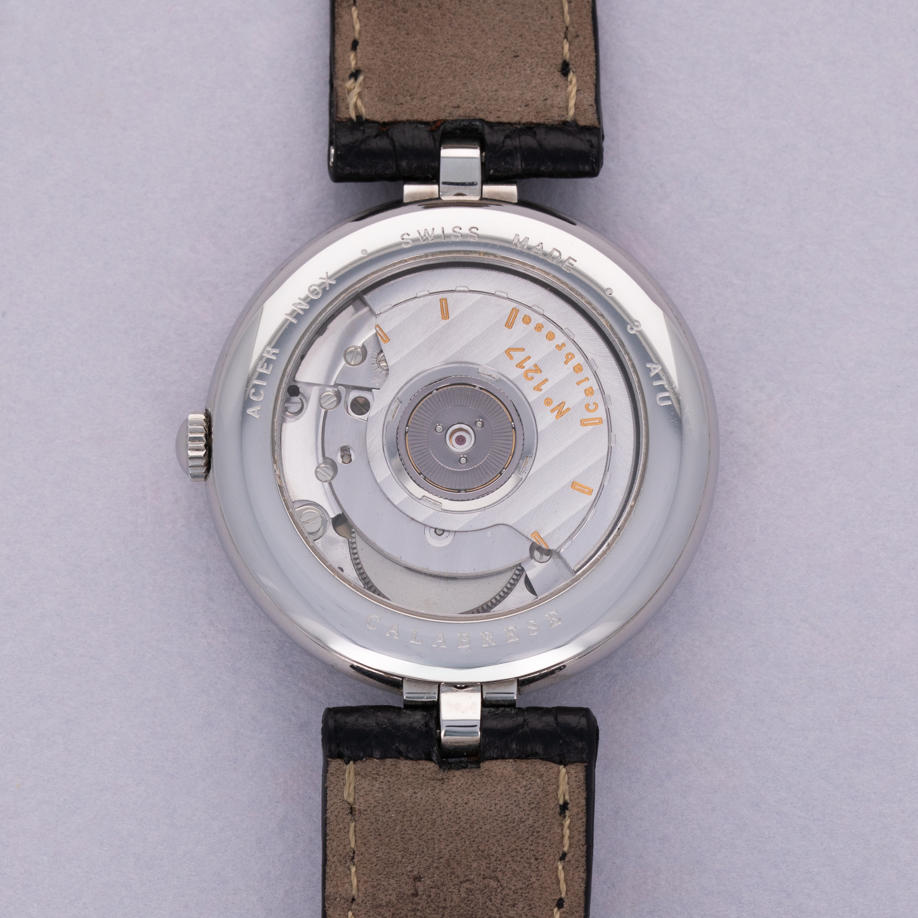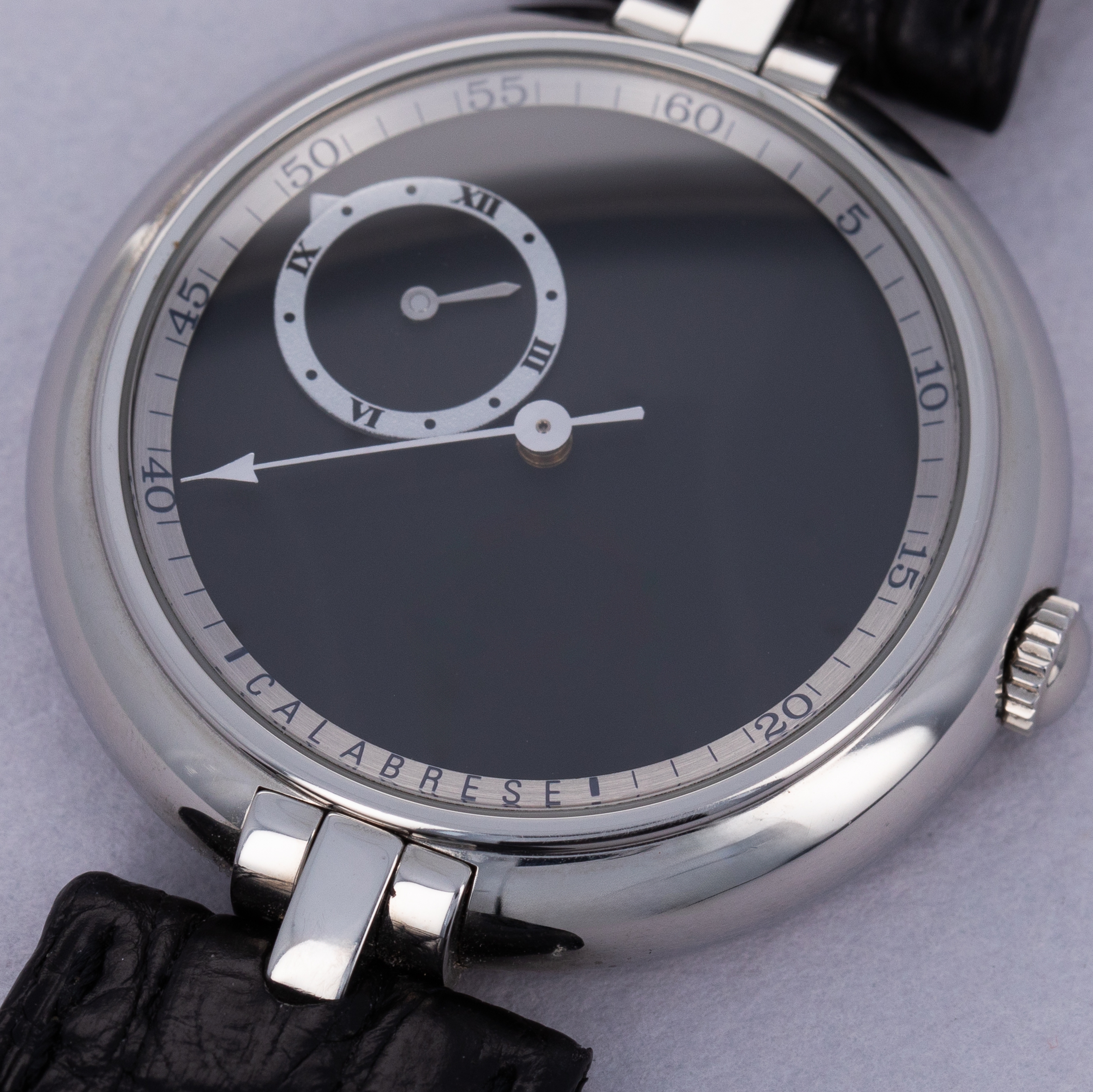 A captivating and innovative timepiece that showcases the Vincent Calabrese's mastery of horological craftsmanship, the Vincent Calabrese HN1F Wandering Hours is a distinctive timepiece that was launched in the early 2000s. Boasting a wandering hours display, like its name suggests, the HN1F’s black display features an hour subdial that travels along a minute track that circles the entire dial. As a result, the hour subdial also acts as the minute hand. The minimalist black dial is elegantly contrasted with silver accents, highlighting the wandering hours display and the central seconds hand. Featuring a 36.5mm stainless steel case that is completely polished and features straight bar lugs with a stepped attachment to the case, the HN1F features a sophisticated and modern appearance while also appearing rather classical. Beyond its physical appearance, the HN1F’s exhibition caseback reveals its automatic movement which allows its wearer to appreciate the meticulous engineering and finishing that went into its creation.