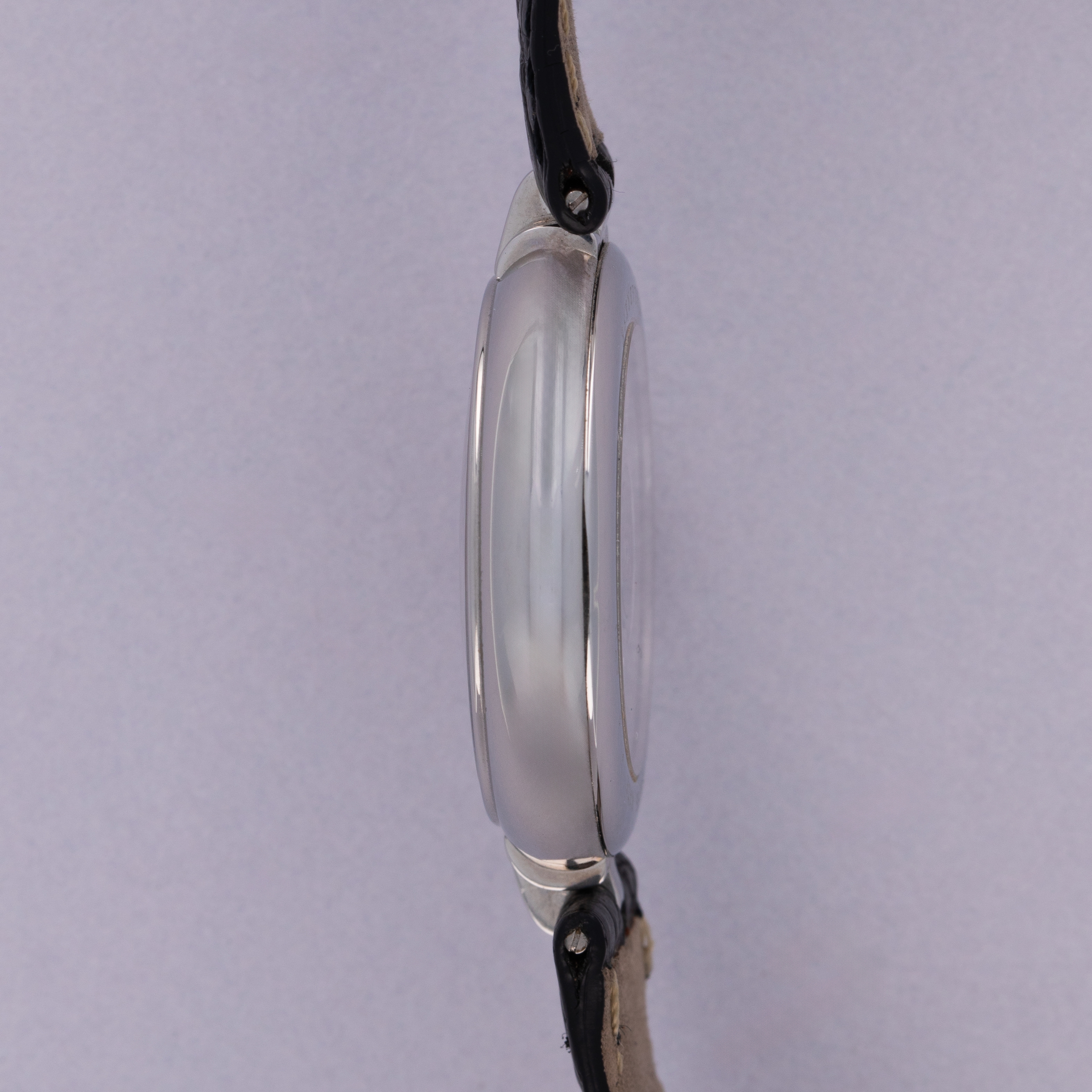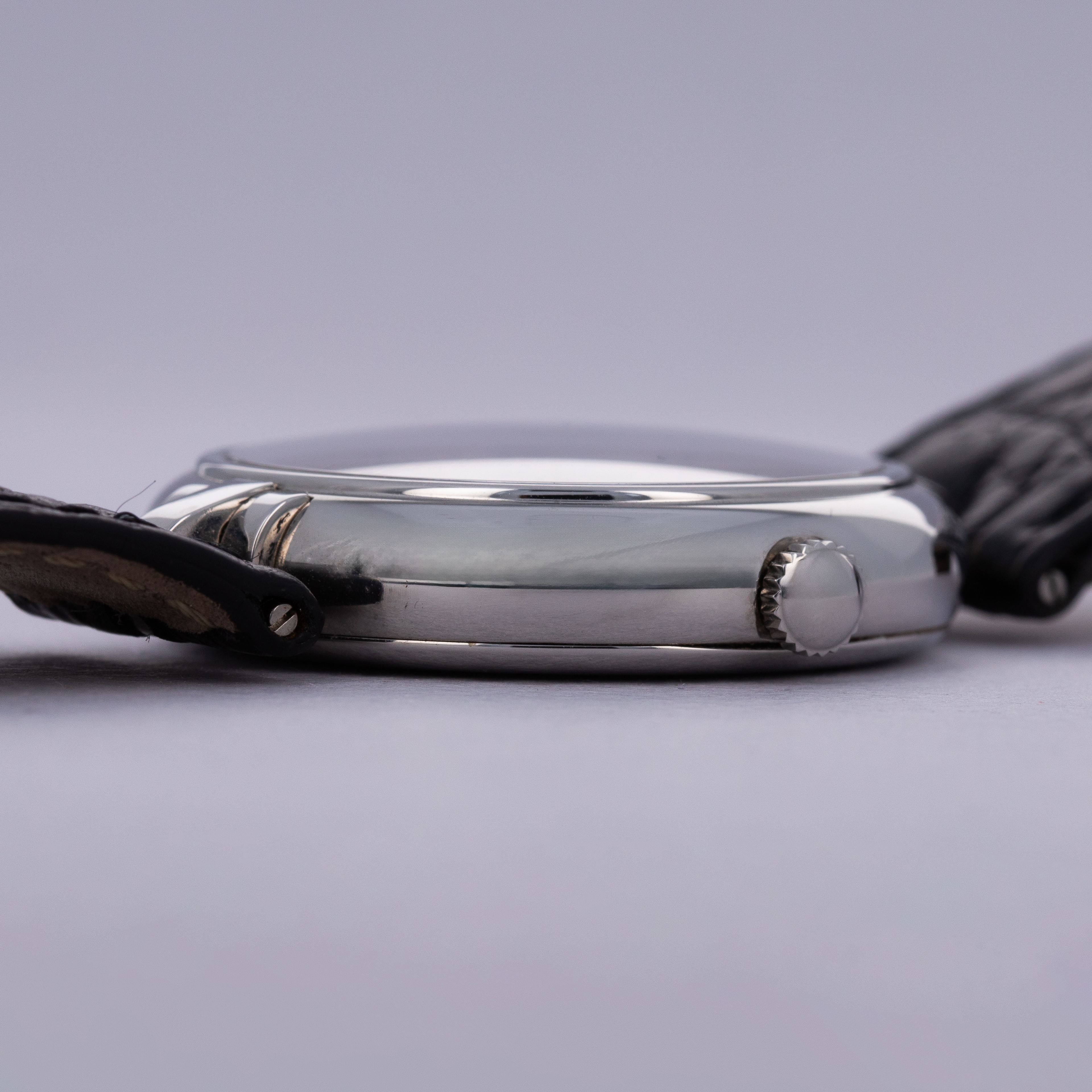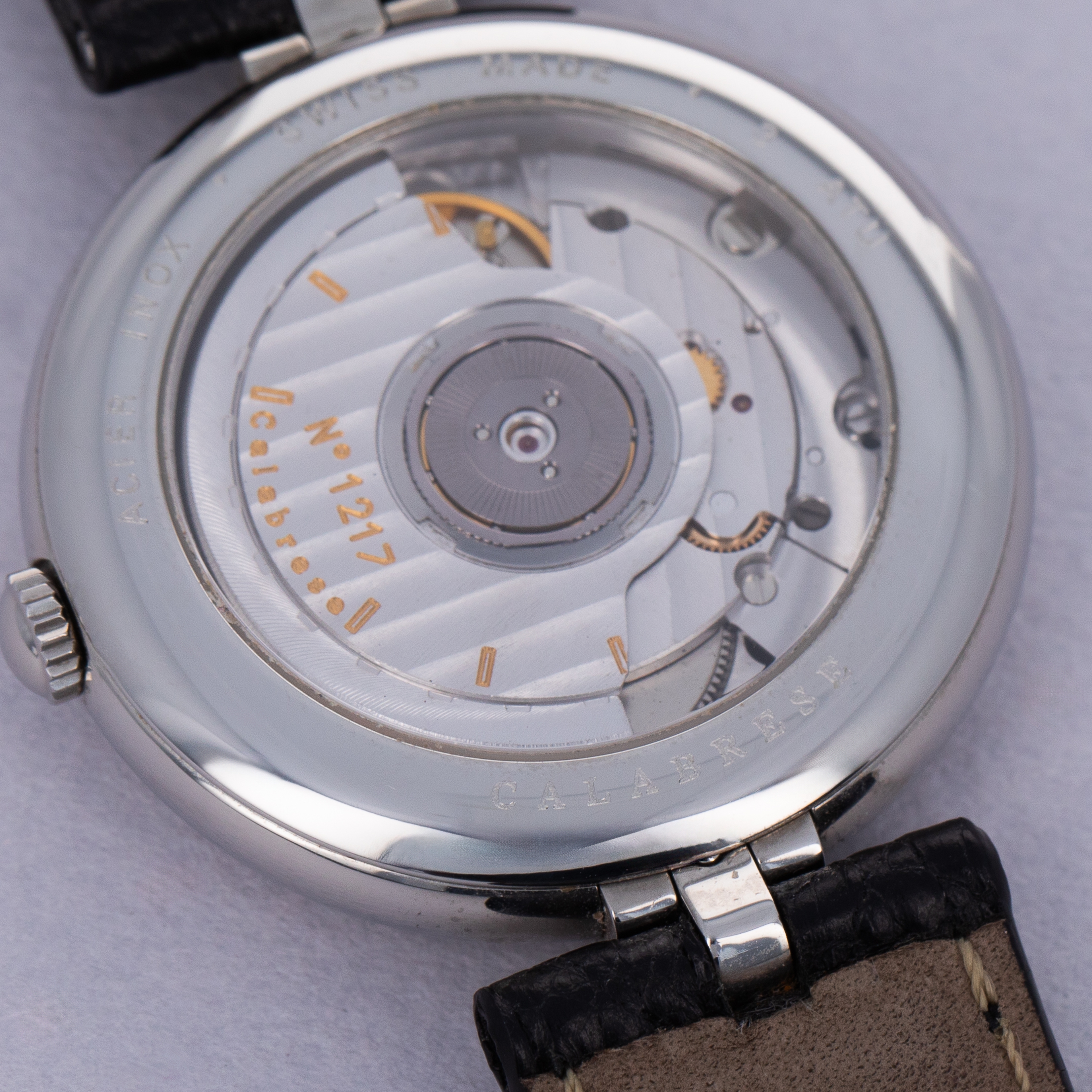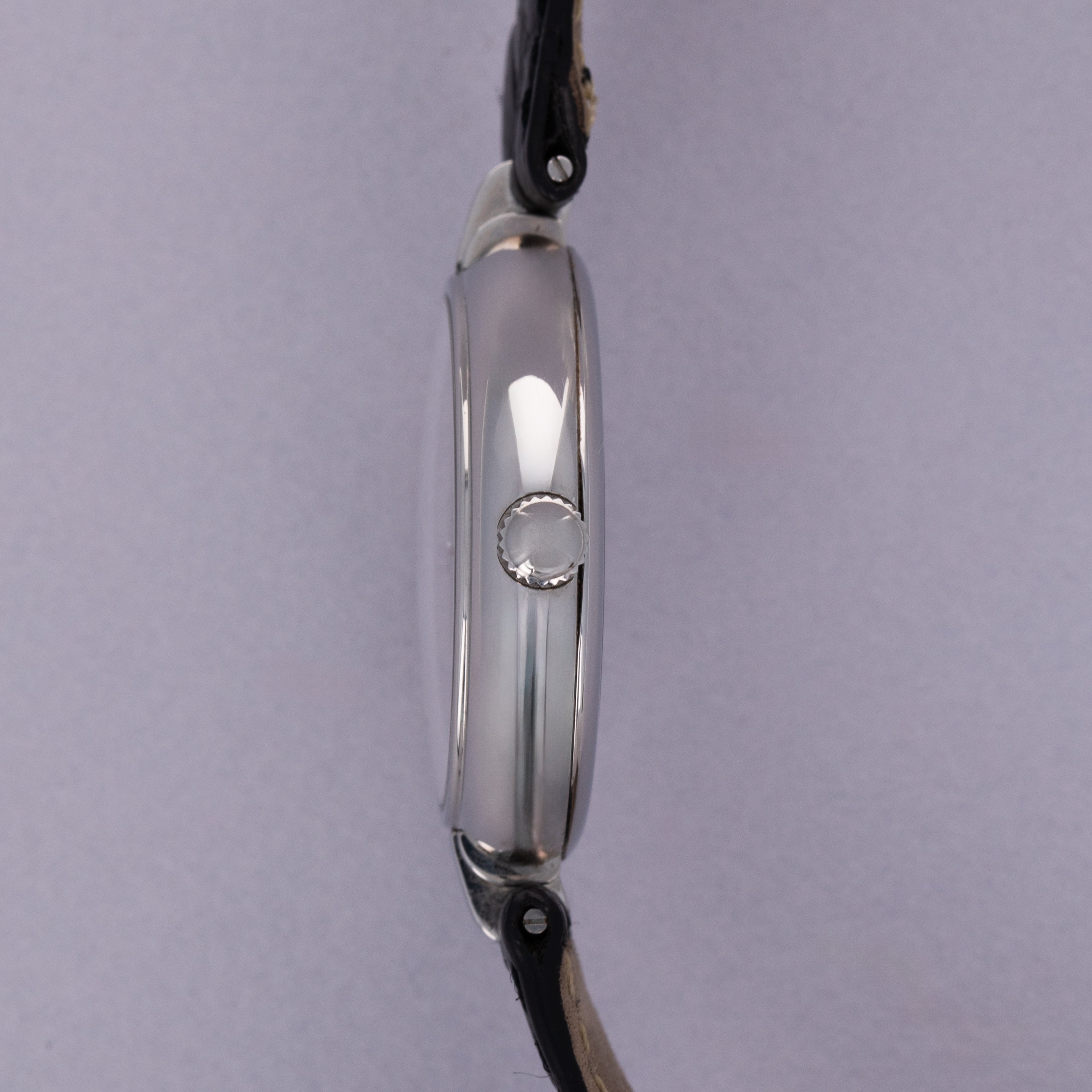A captivating and innovative timepiece that showcases the Vincent Calabrese's mastery of horological craftsmanship, the Vincent Calabrese HN1F Wandering Hours is a distinctive timepiece that was launched in the early 2000s. Boasting a wandering hours display, like its name suggests, the HN1F’s black display features an hour subdial that travels along a minute track that circles the entire dial. As a result, the hour subdial also acts as the minute hand. The minimalist black dial is elegantly contrasted with silver accents, highlighting the wandering hours display and the central seconds hand. Featuring a 36.5mm stainless steel case that is completely polished and features straight bar lugs with a stepped attachment to the case, the HN1F features a sophisticated and modern appearance while also appearing rather classical. Beyond its physical appearance, the HN1F’s exhibition caseback reveals its automatic movement which allows its wearer to appreciate the meticulous engineering and finishing that went into its creation.