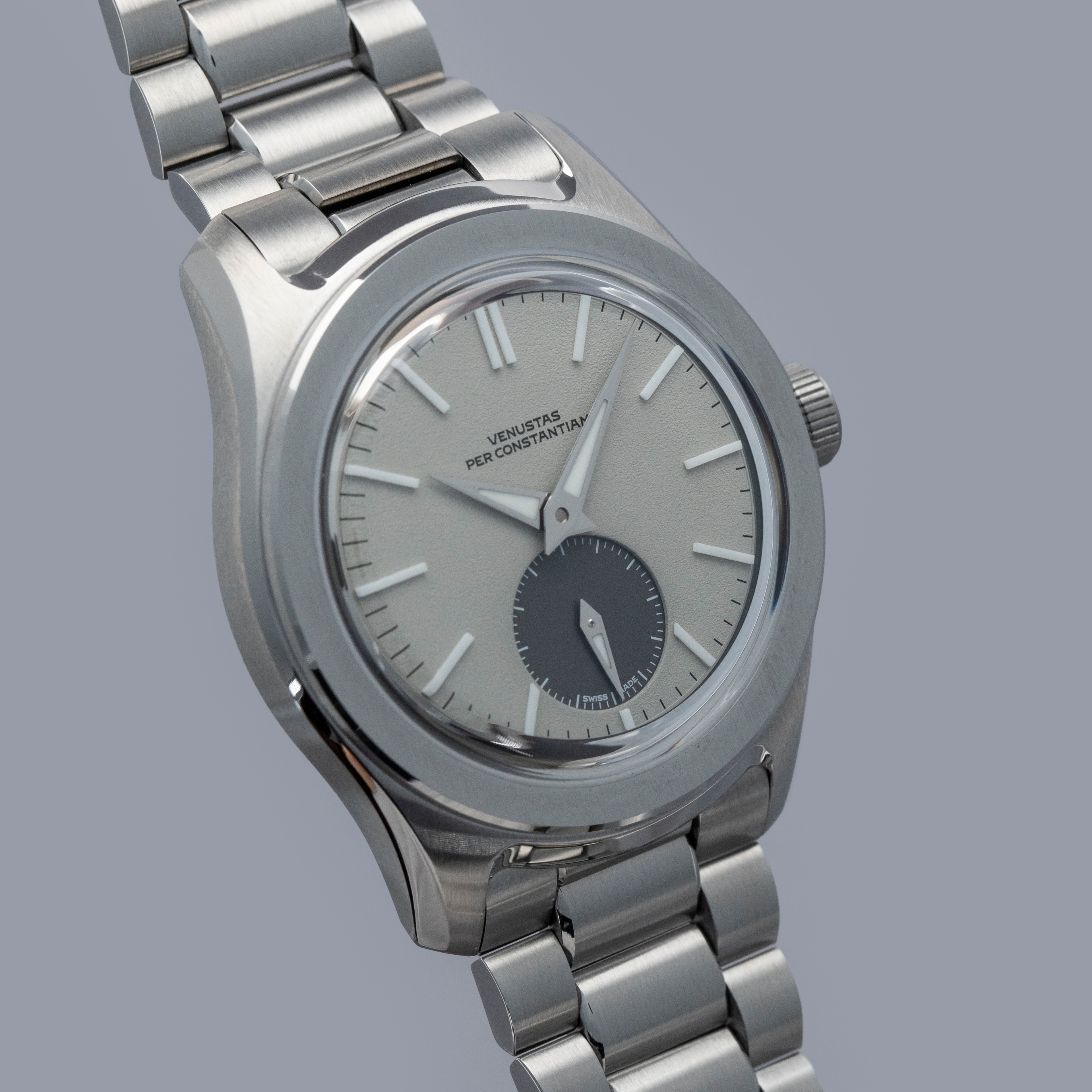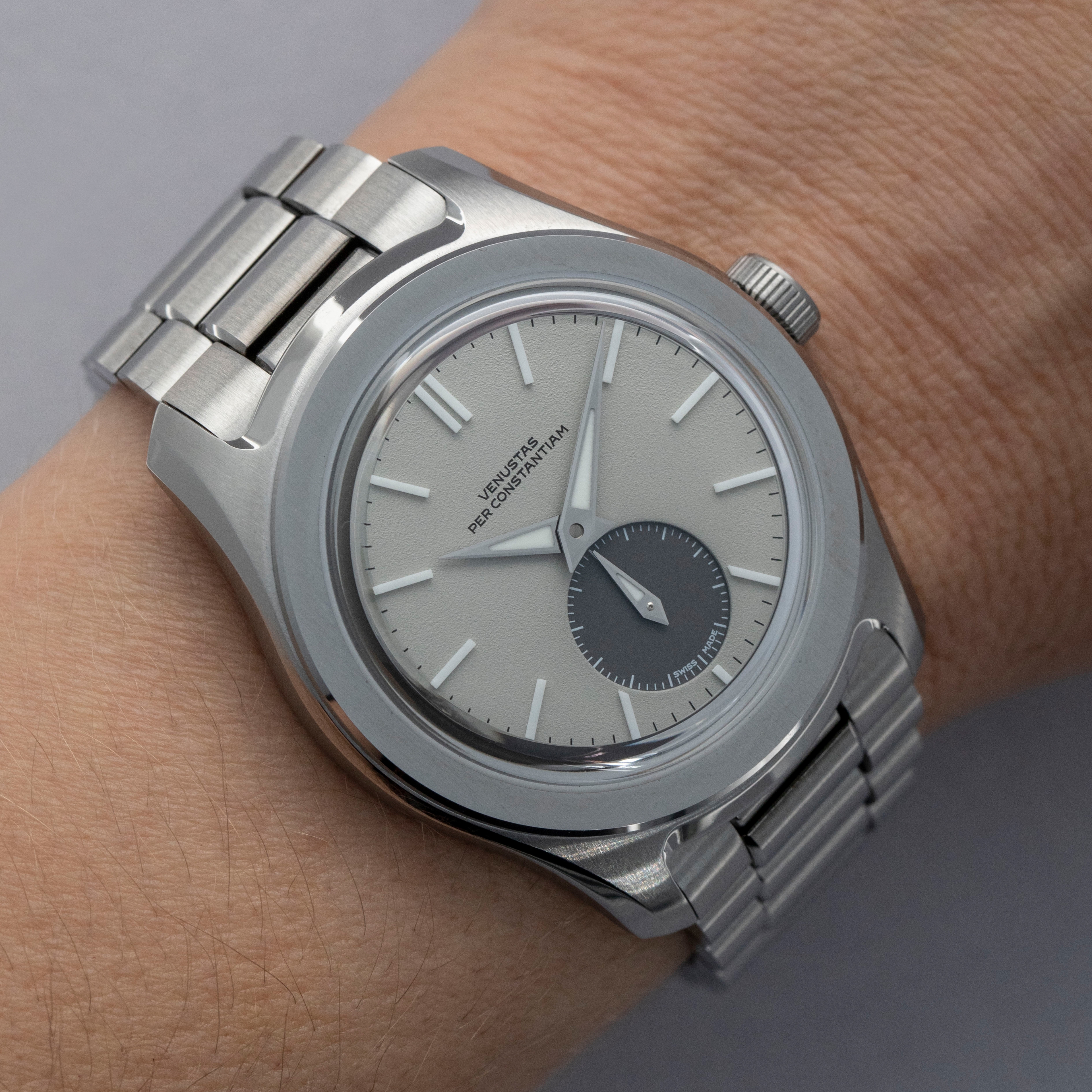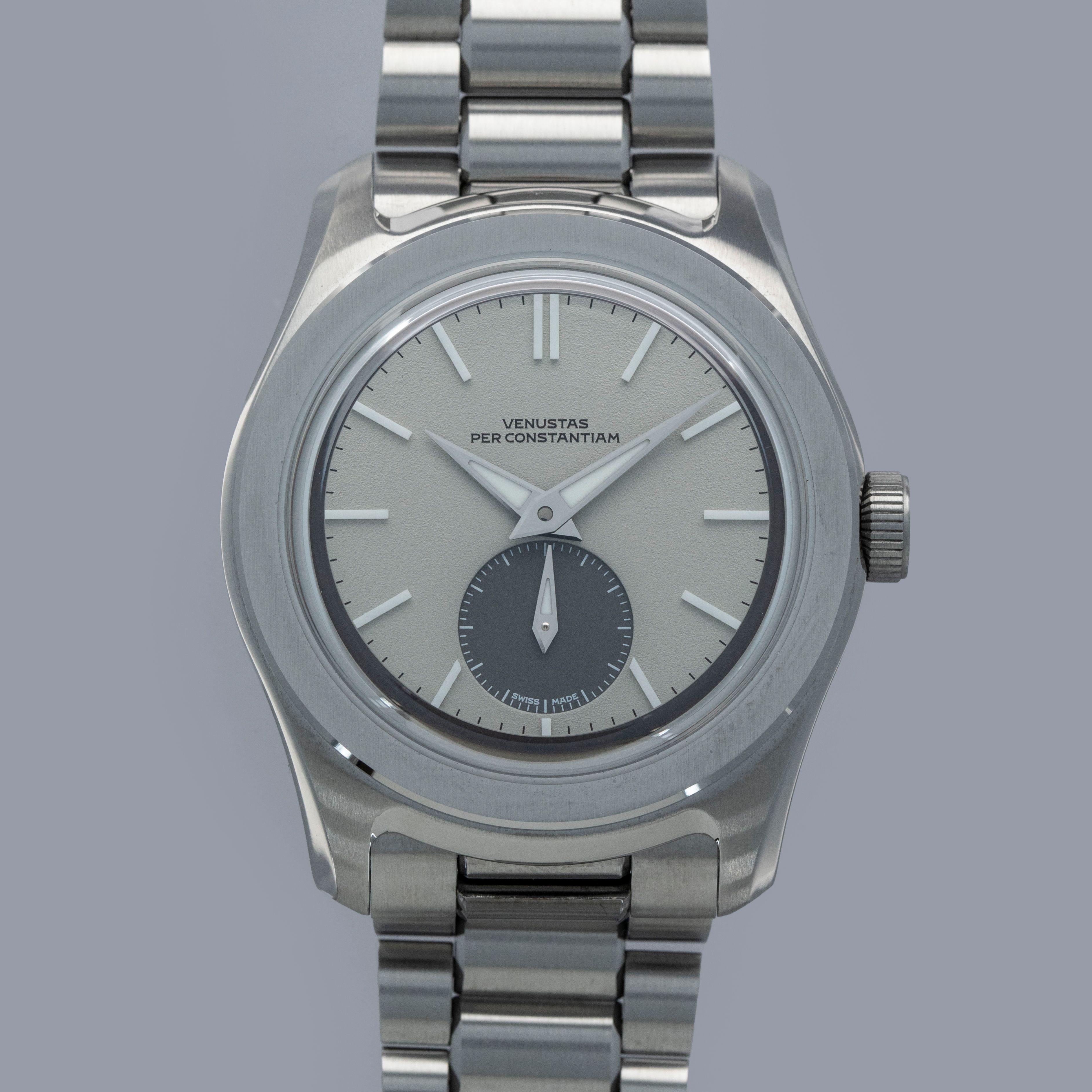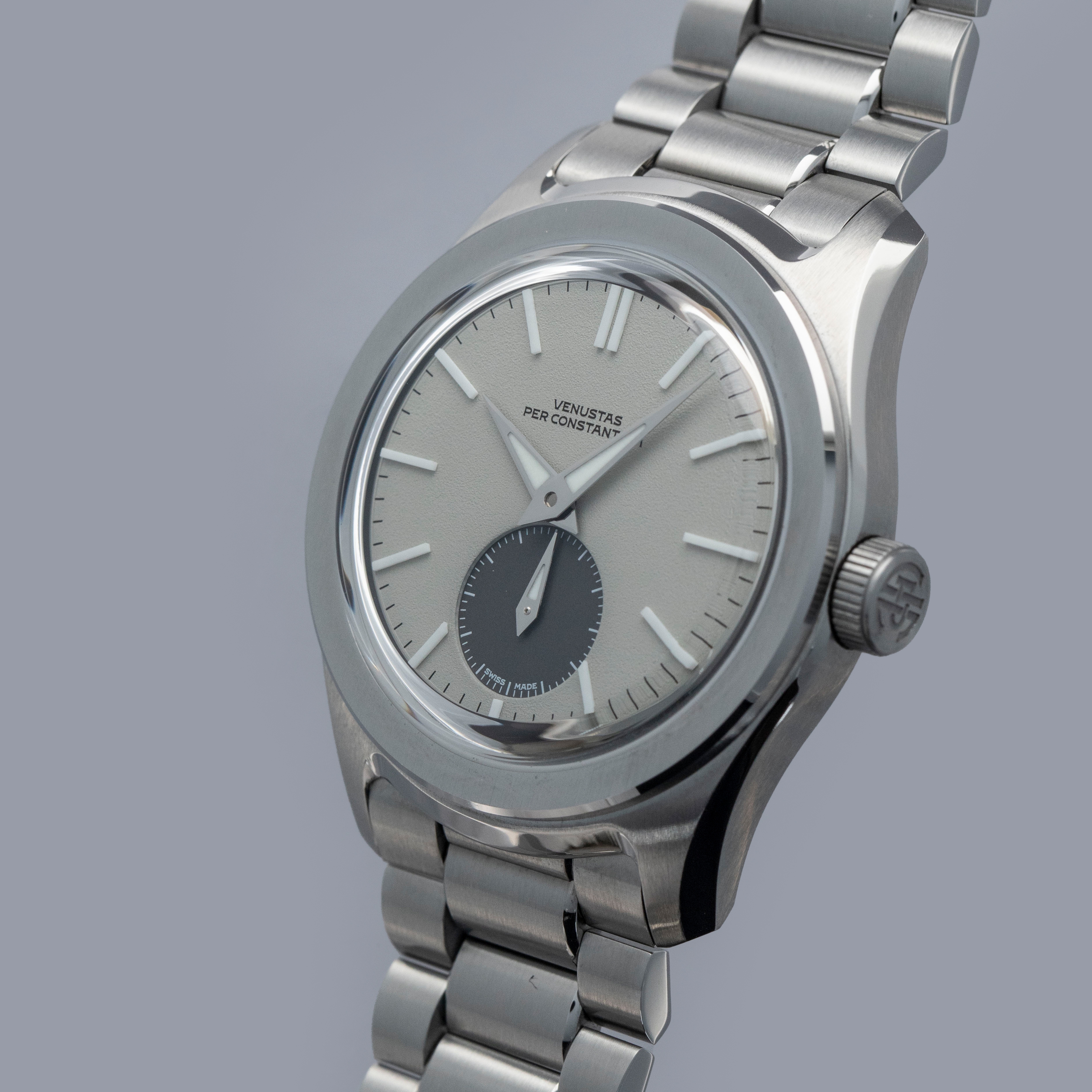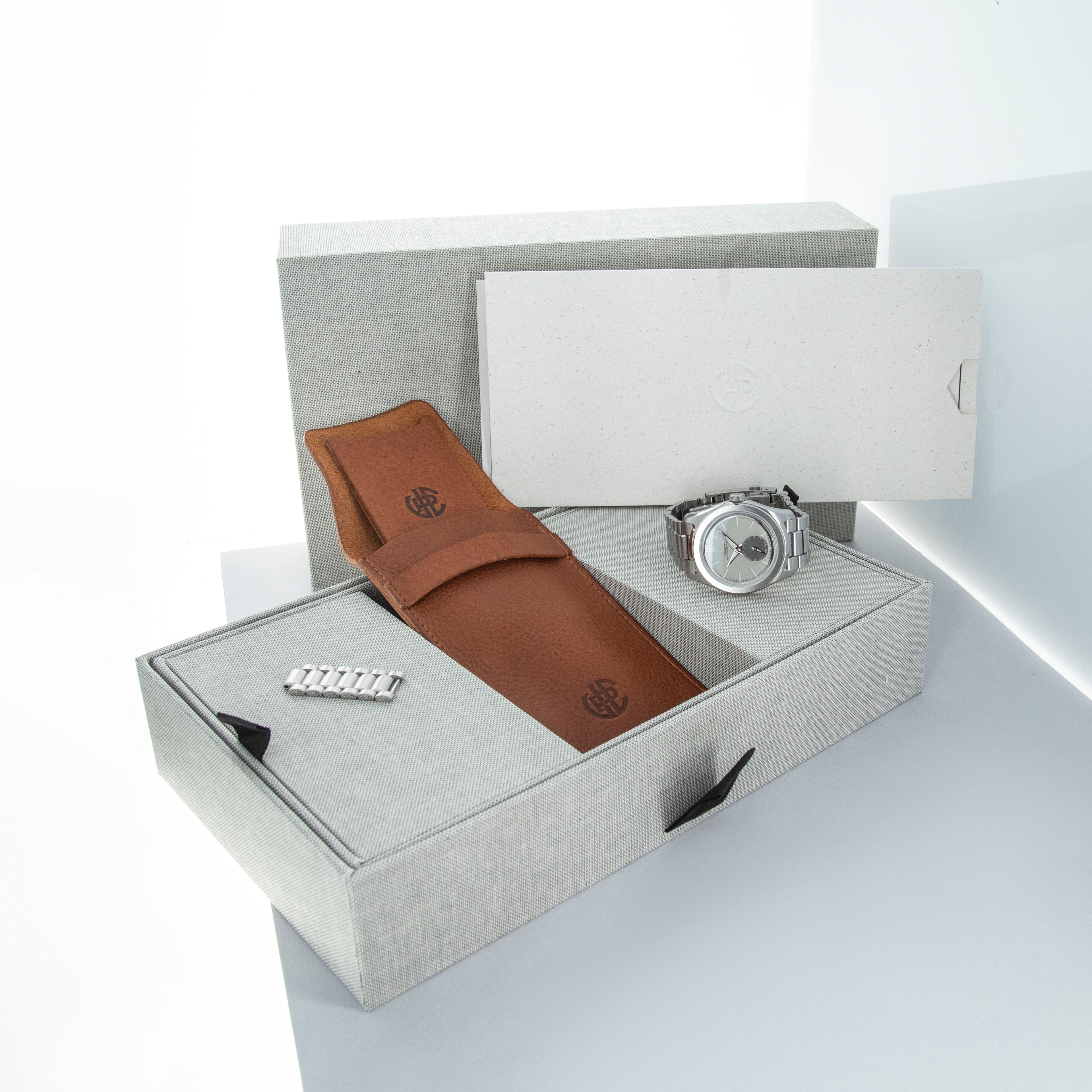 Featuring a dove grey dial with a two-piece construction that includes one frosted texture section and a sunken contrasting dark running seconds subdial, the 37HW's display is rich with depth and movement.