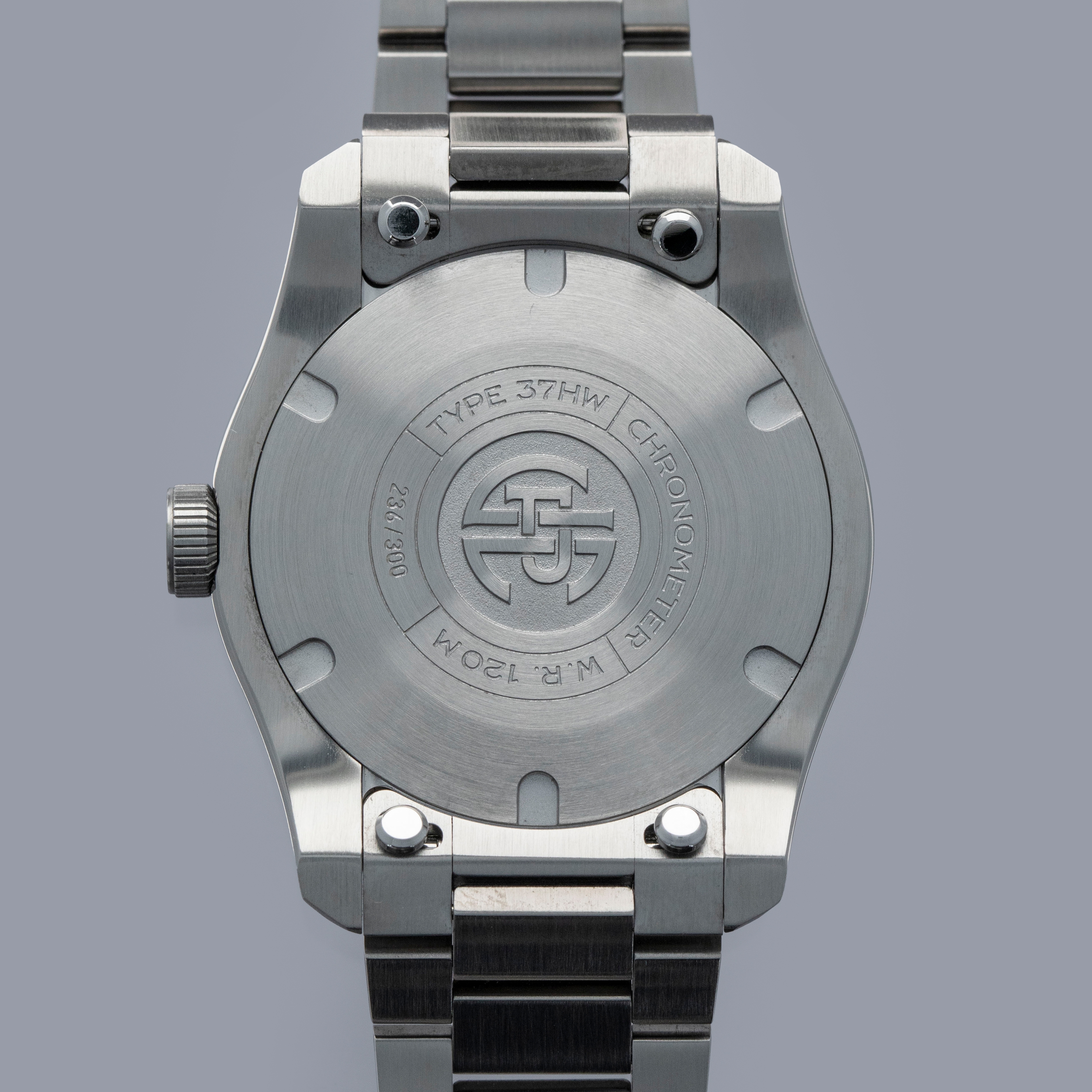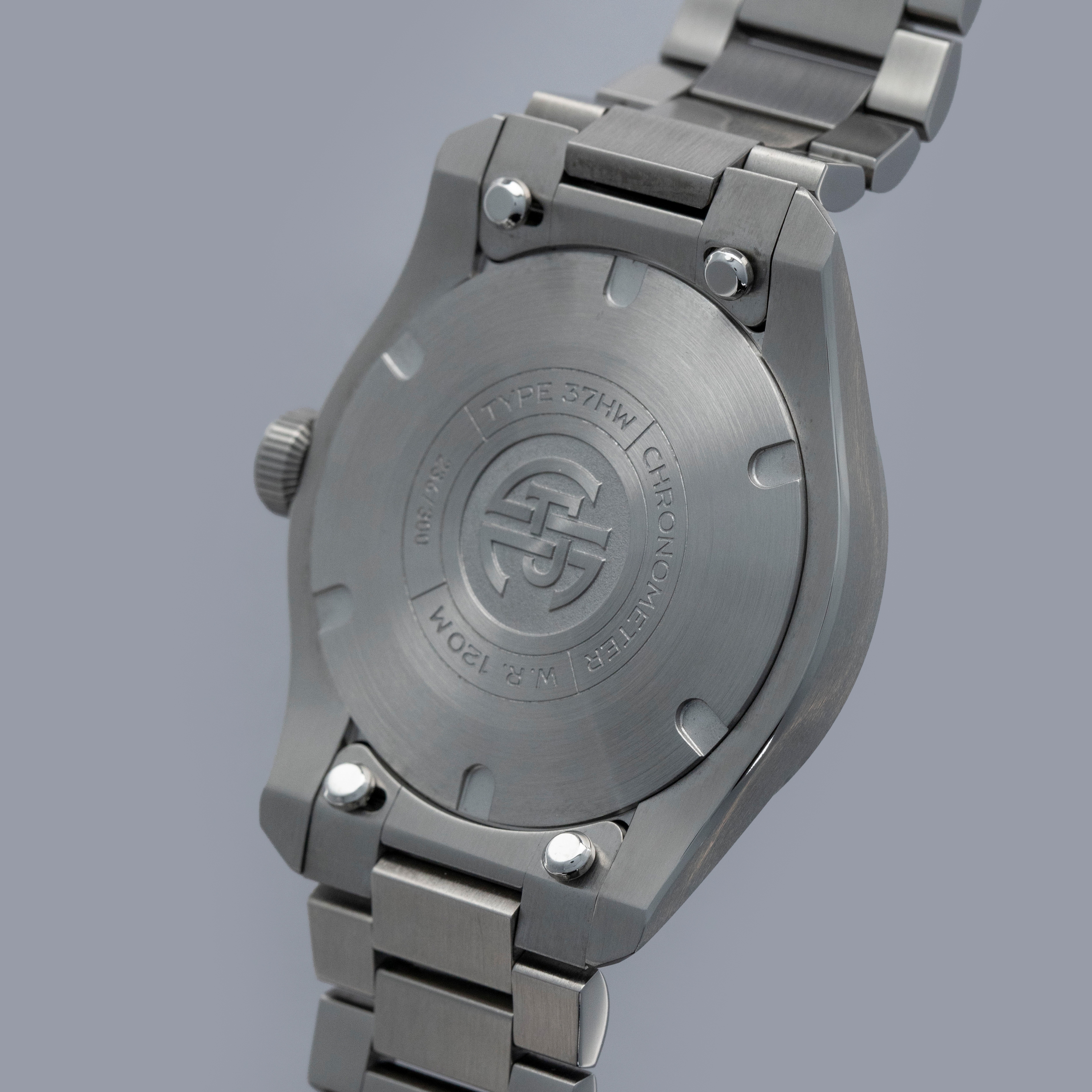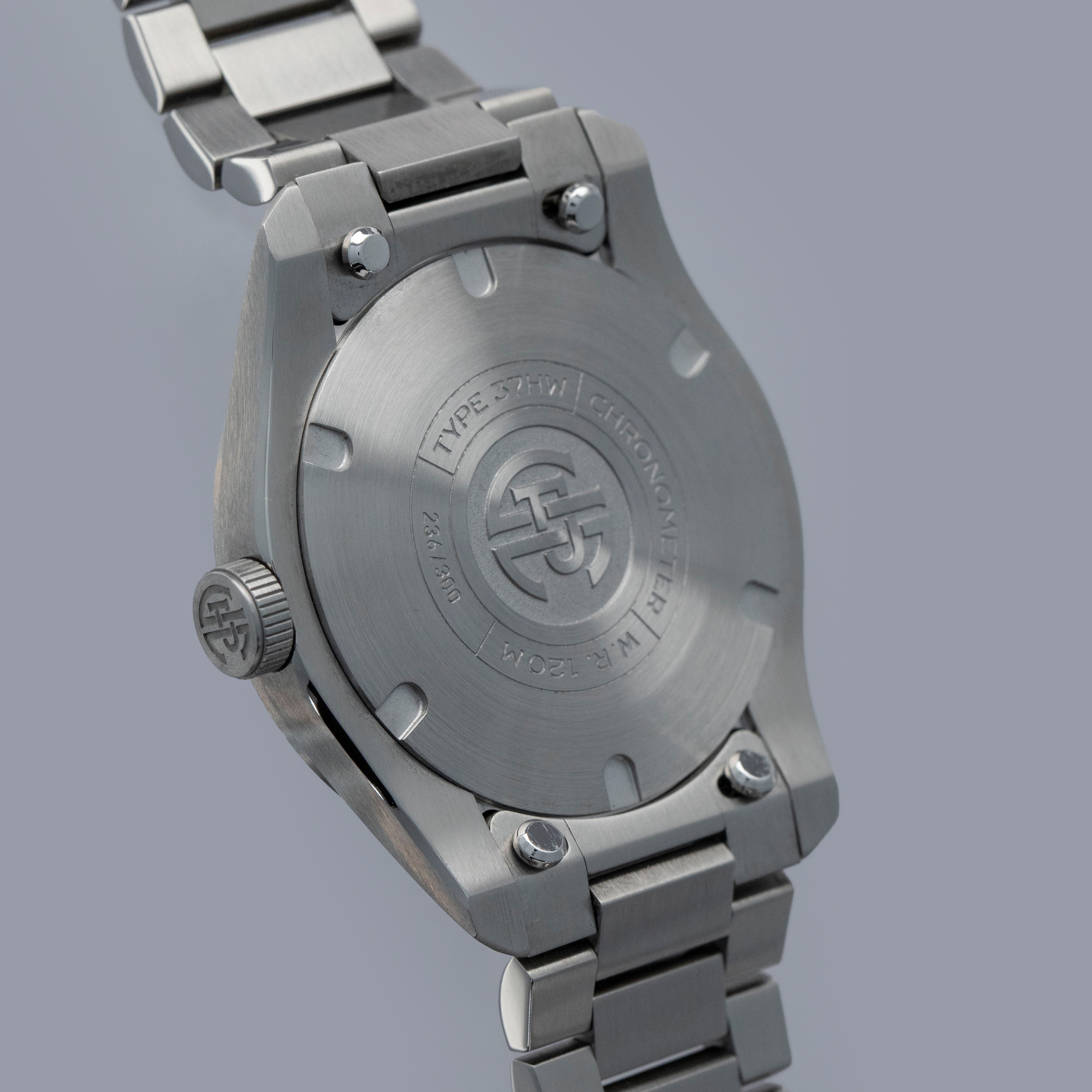 Featuring a carefully thought-out case which includes an array of polished chamfers and brushed surfaces, the 37HW's 37mm x 9.8mm stainless steel construction is the perfect representation of how to dress up a sporty case design.