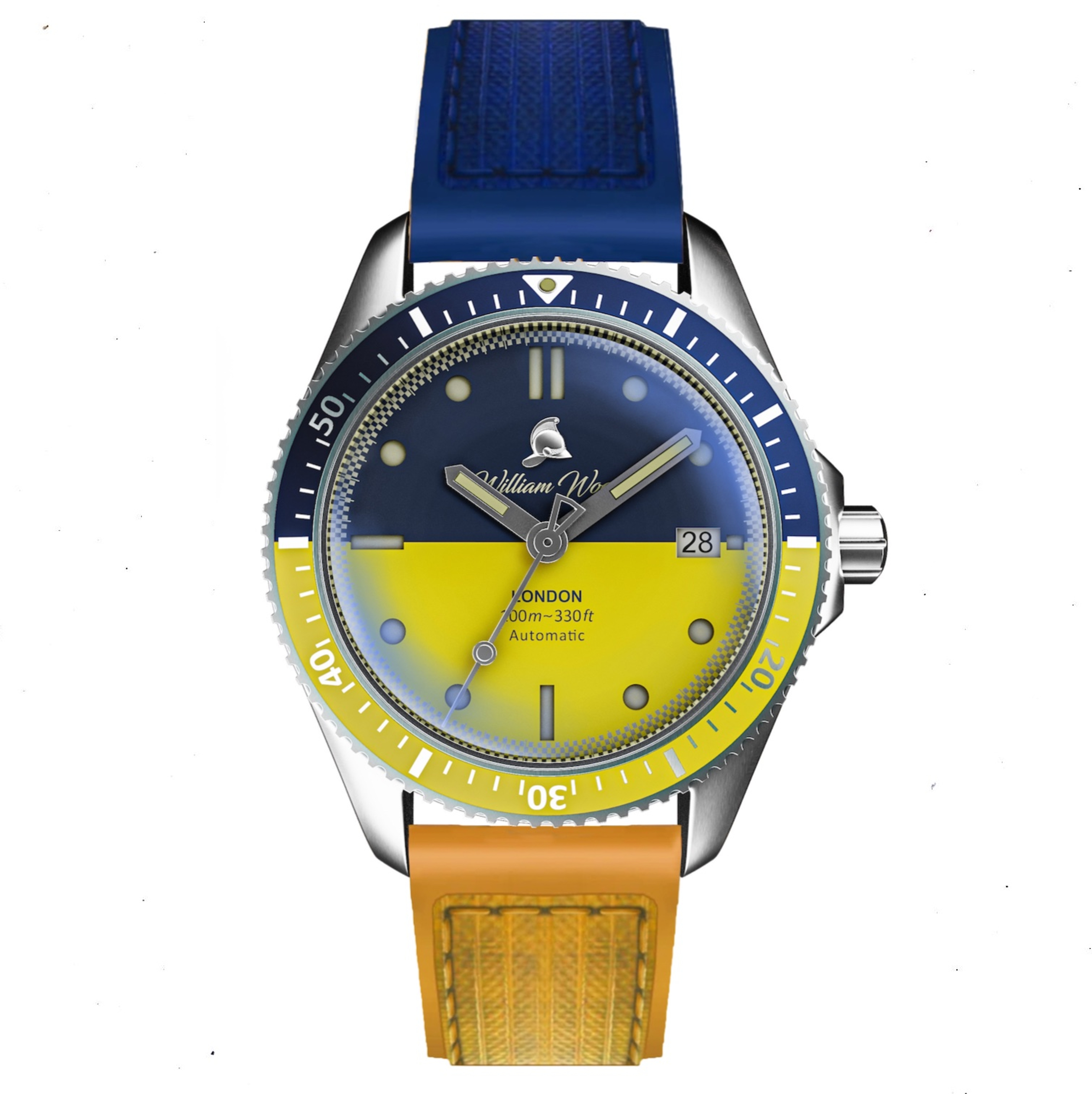 Fire Hose Straps - The watch is fitted with our iconic upcycled British fire hose straps made from fire hoses that have protected the UK Fire & Rescue Service for over 10 years. Each strap is completely unique with its own patina markings and story to tell. Our 'Supporting Ukraine' watch is fitted with our Upcycled Blue Tyne & Wear Fire Hose Straps on the top lug. Blue fire hose is a rare colour to find which is used in high rise tower fire drills, it is a very important strap to William Wood Watches as it is where the Founder's Grandfather, William Wood, was stationed as a firefighter for 25 years. On the bottom lug is our Upcycled Yellow West Midlands Fire & Rescue Service Straps. There are 52 firefighting regions in the UK, and the West Midlands are one of the only regions to use the colour yellow.