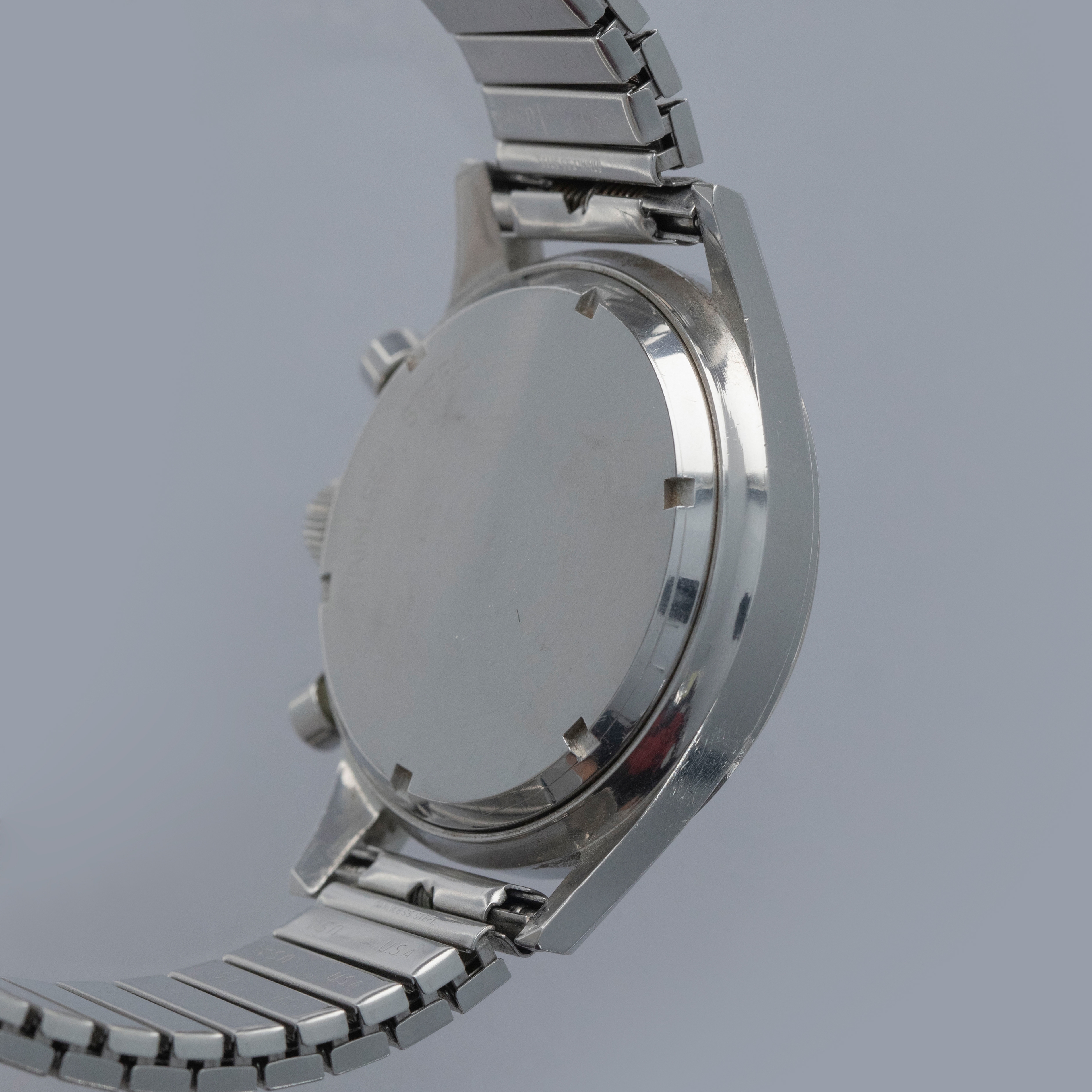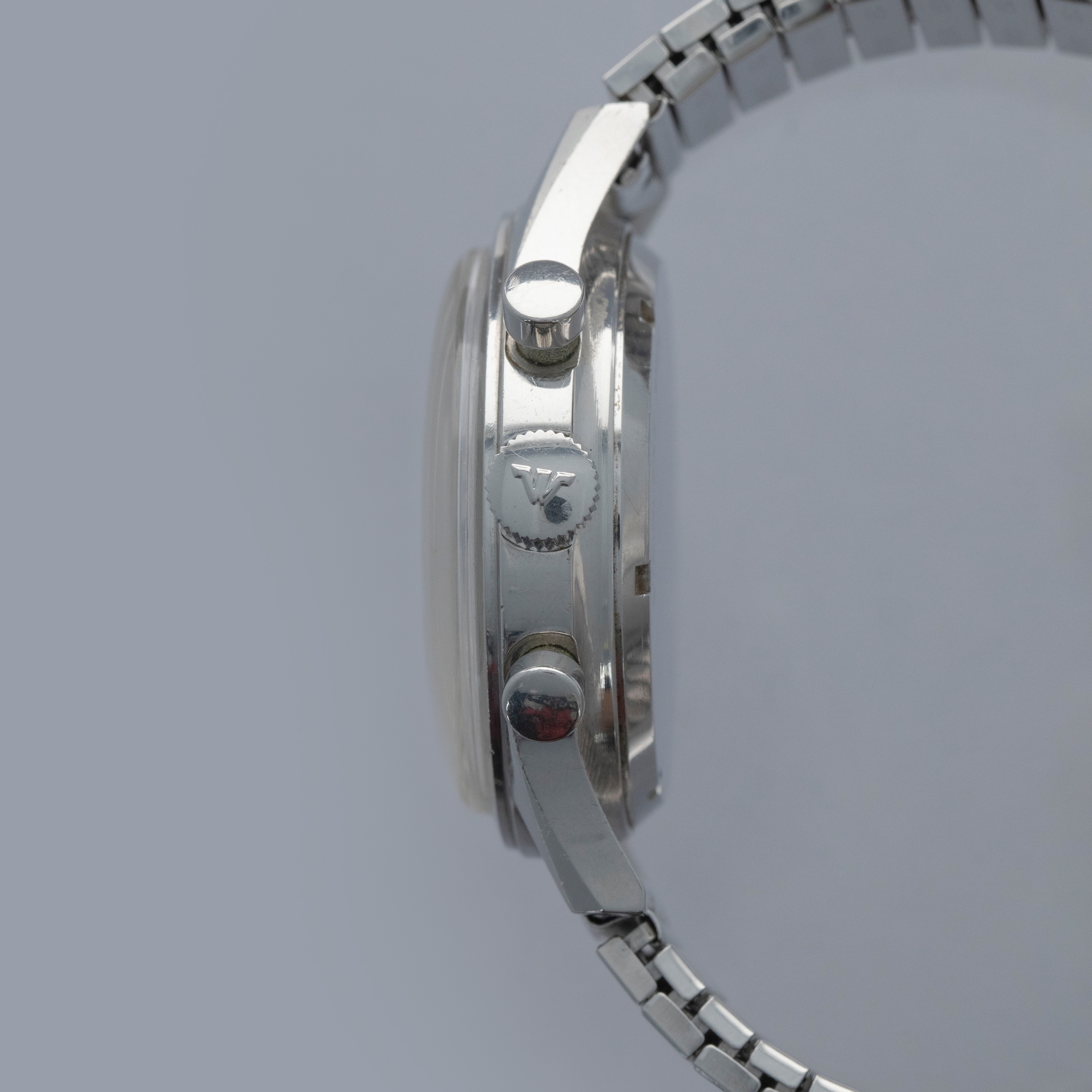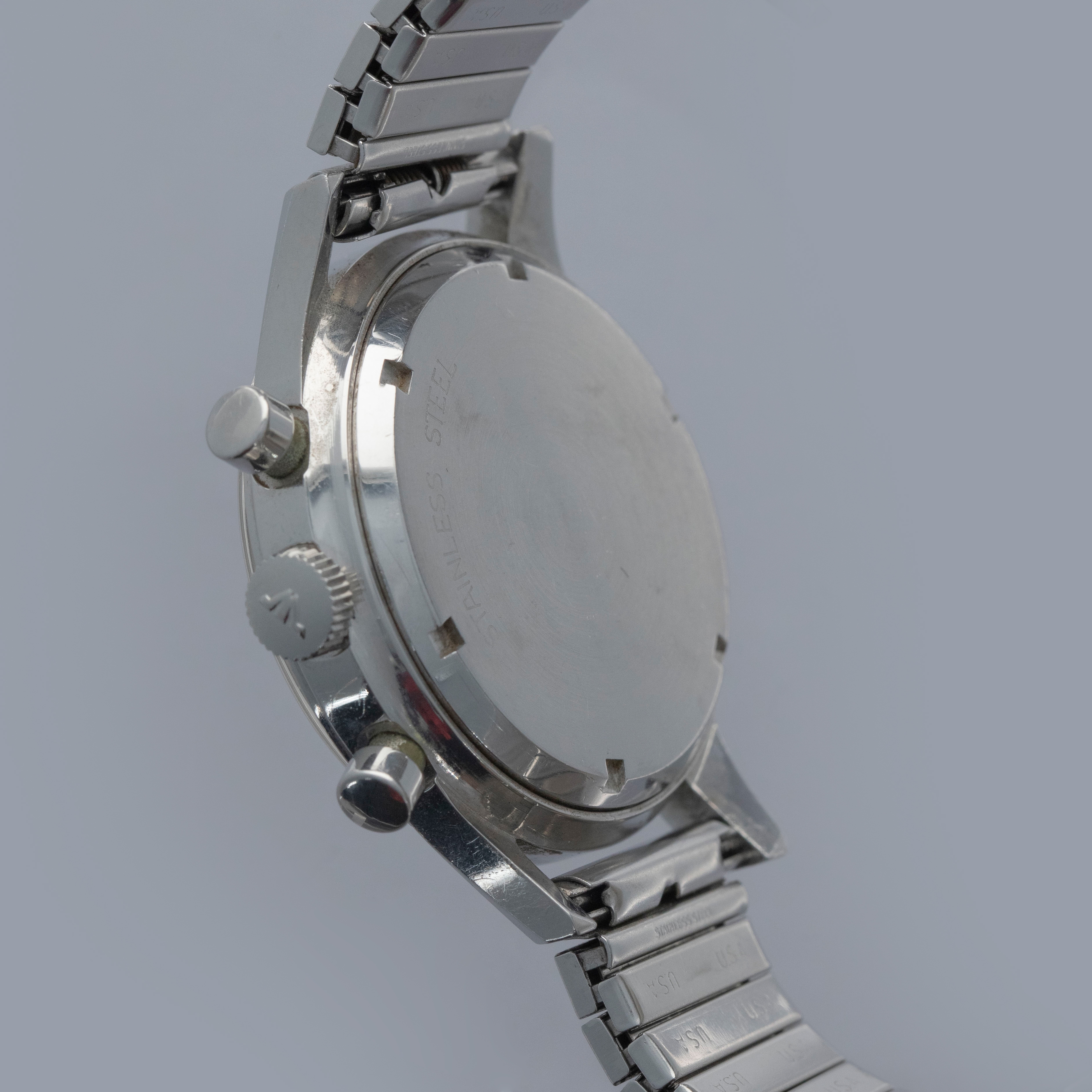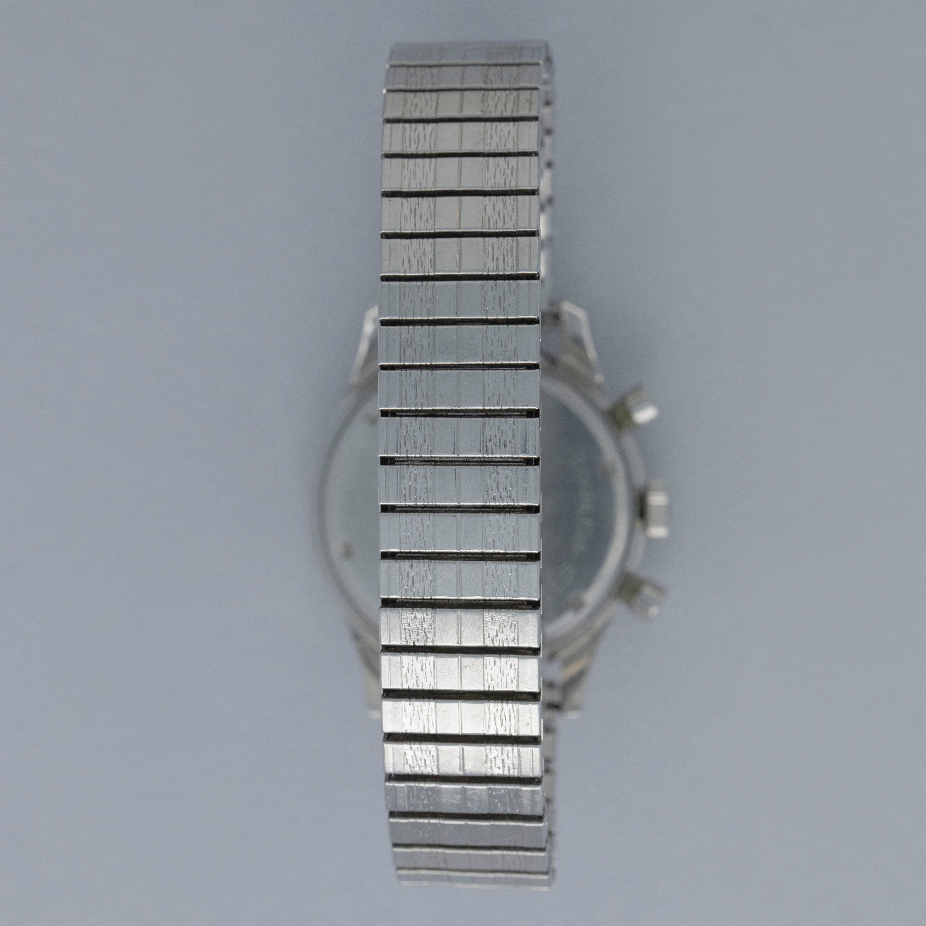 Watch is in overall excellent condition. The steel case shows surface scratches as expected of a watch of this vintage. The case back retains well-defined engravings and a circular brushed finish, with some surface scratches. The watch still retains its original W-embossed crown. The dial remains excellent, with bold colours to the scales, showing a few surface marks and light staining. The blue chronograph hands remain very clean, while the central hour and minute hands show some oxidation. It is fitted with a generic expanding steel bracelet.