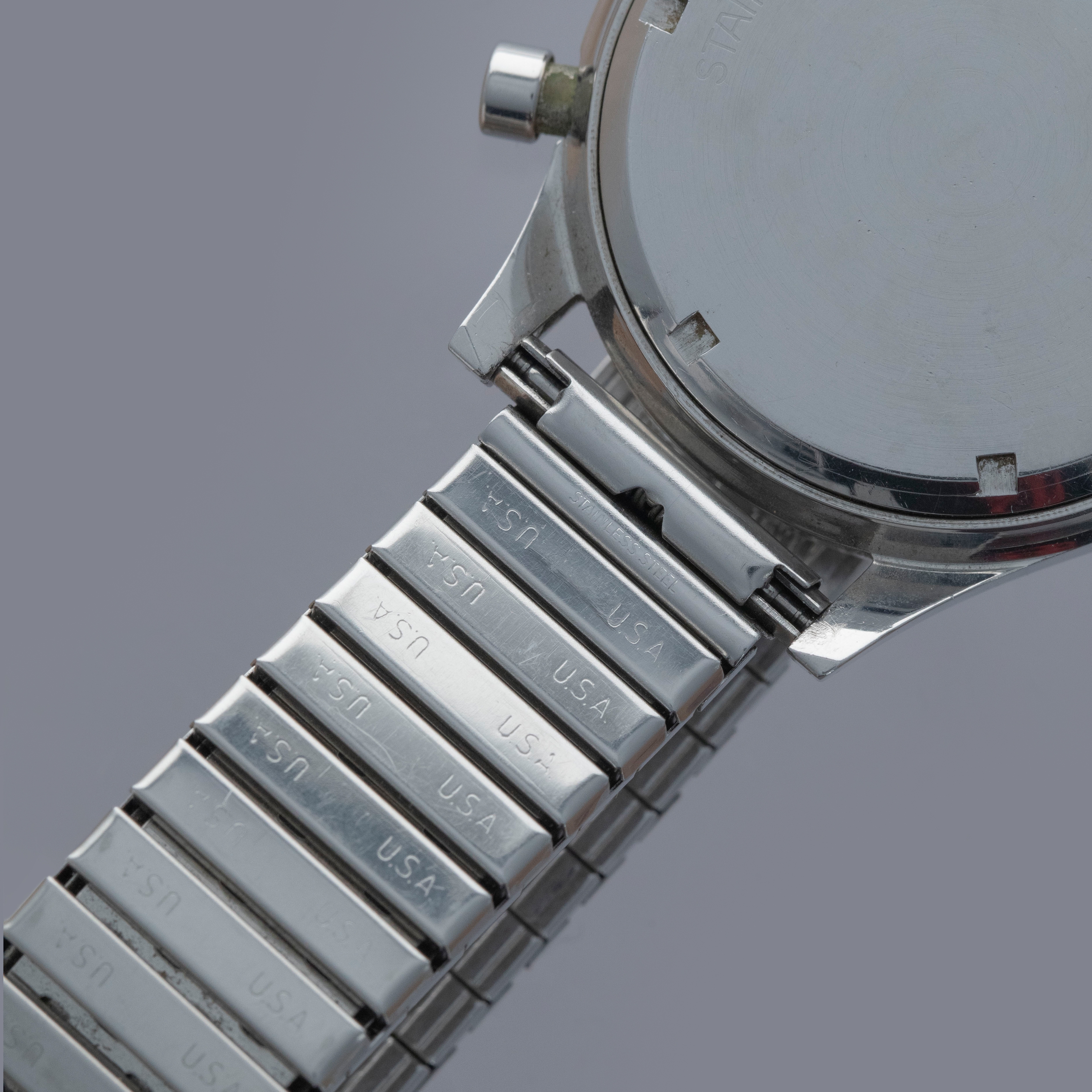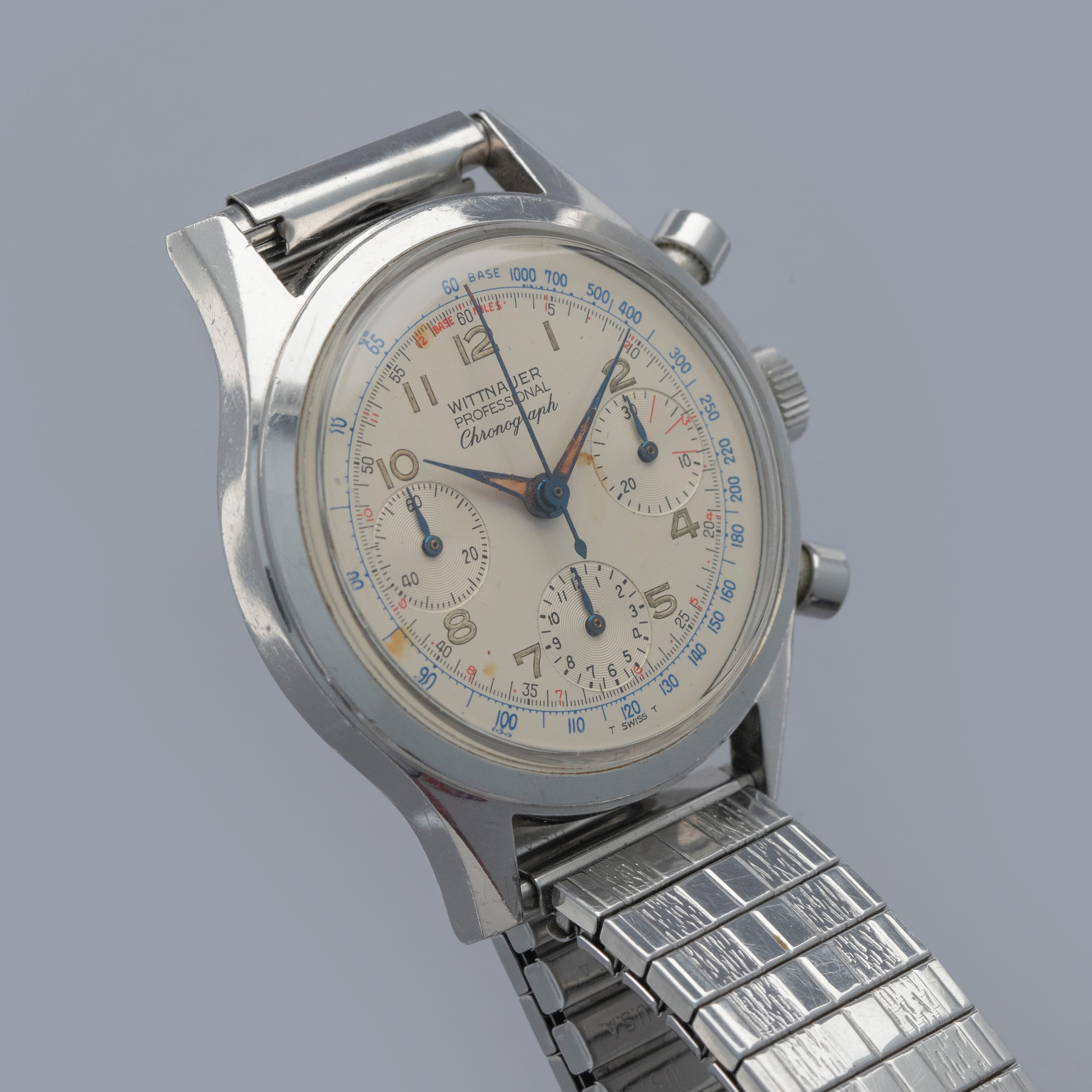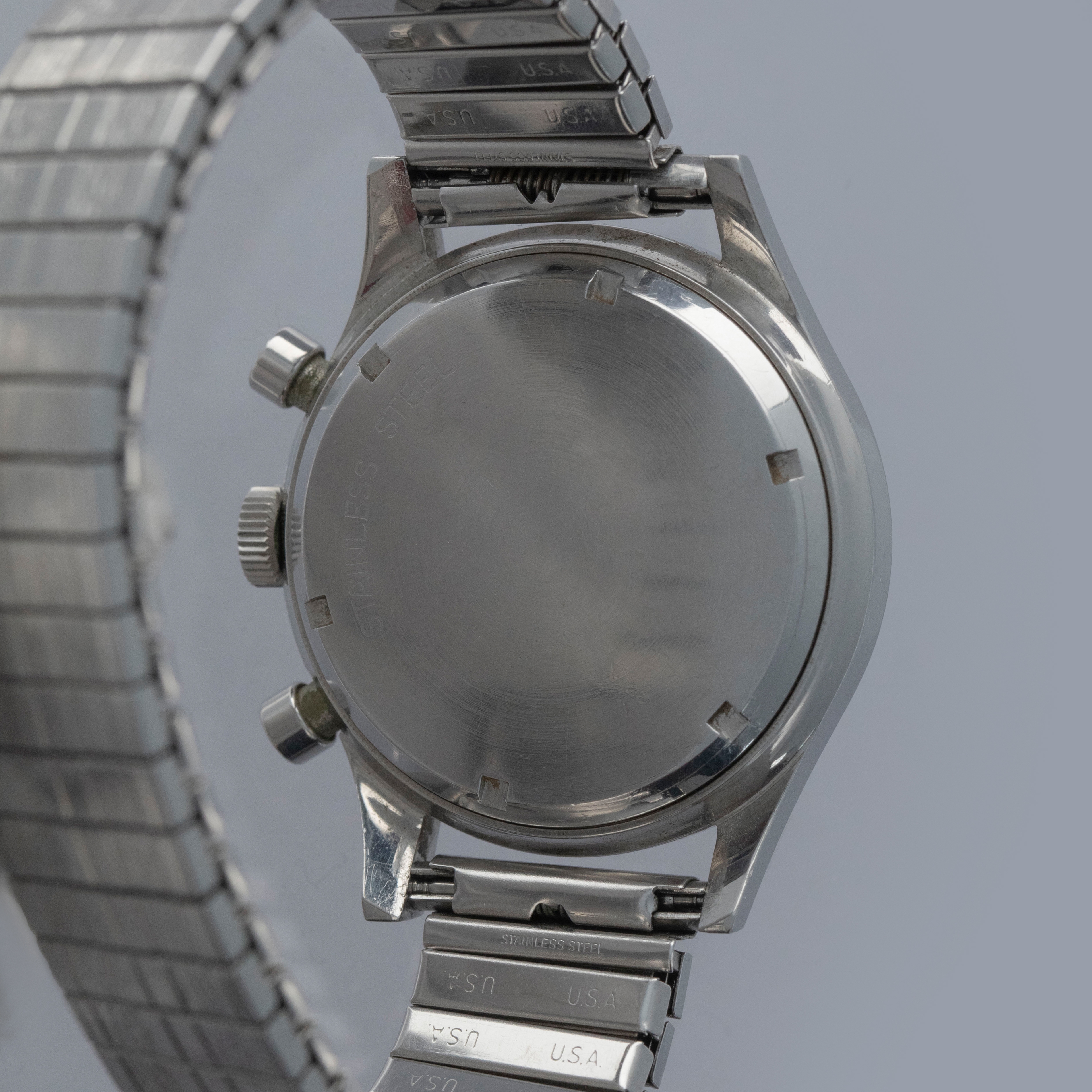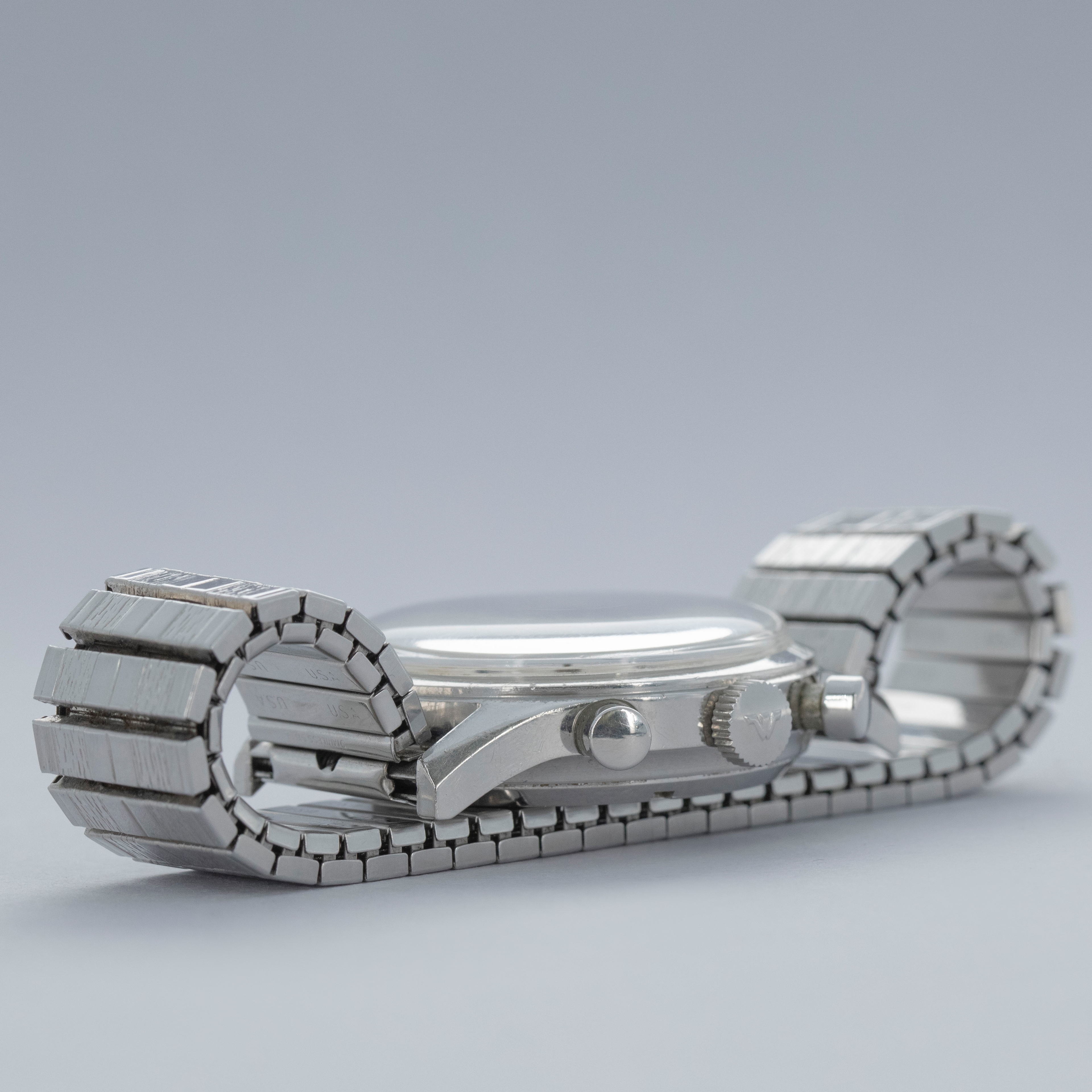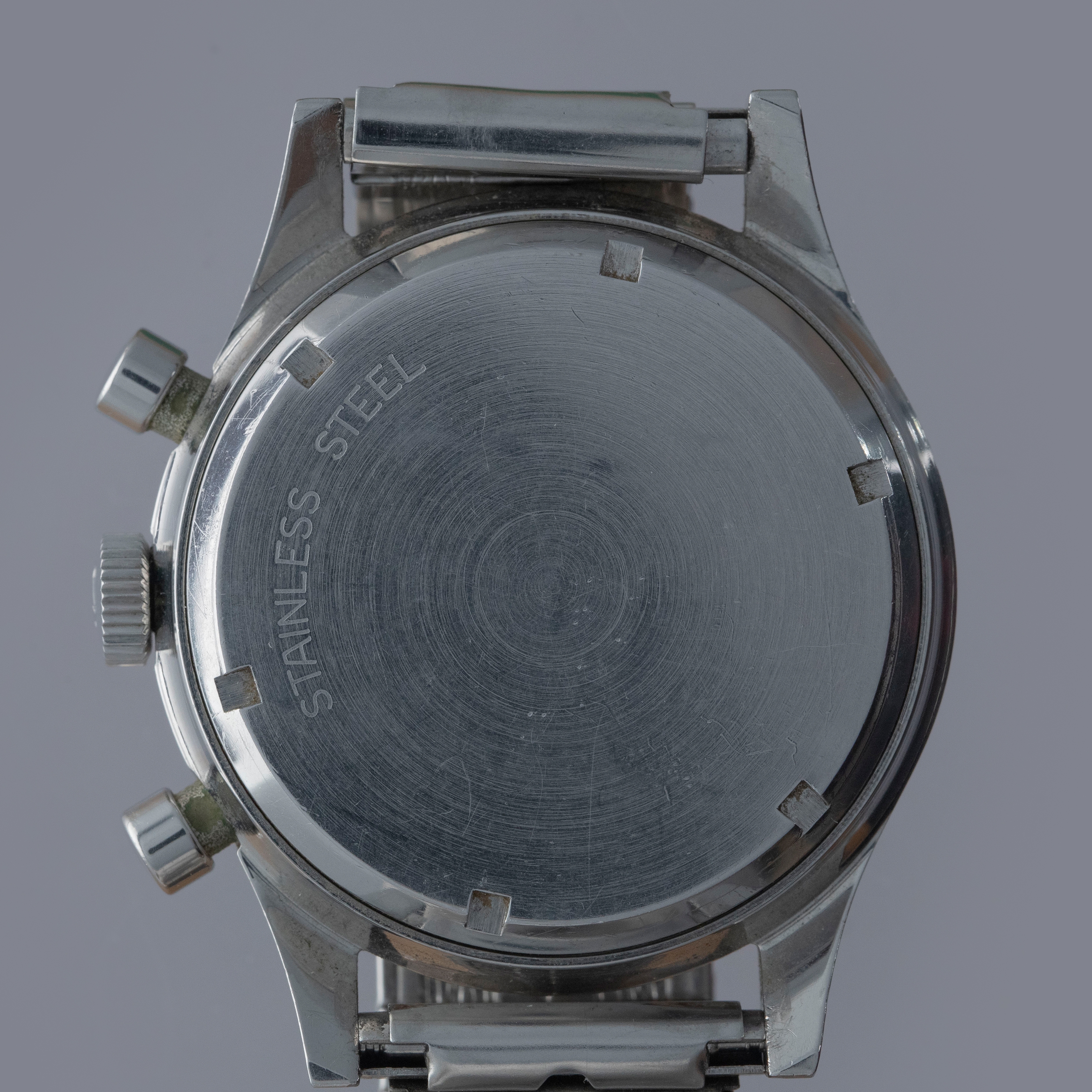 Watch is in overall excellent condition. The steel case shows surface scratches as expected of a watch of this vintage. The case back retains well-defined engravings and a circular brushed finish, with some surface scratches. The watch still retains its original W-embossed crown. The dial remains excellent, with bold colours to the scales, showing a few surface marks and light staining. The blue chronograph hands remain very clean, while the central hour and minute hands show some oxidation. It is fitted with a generic expanding steel bracelet.