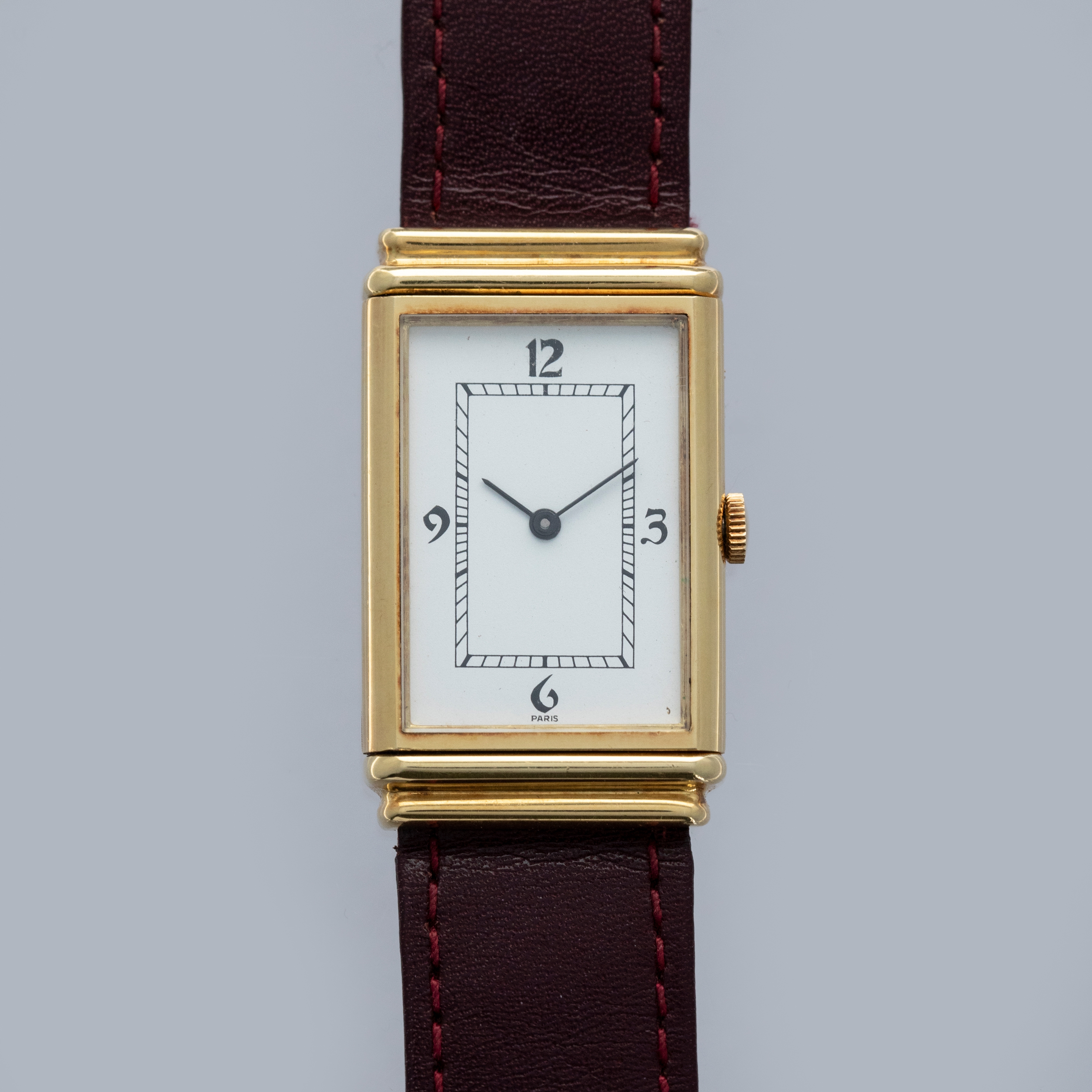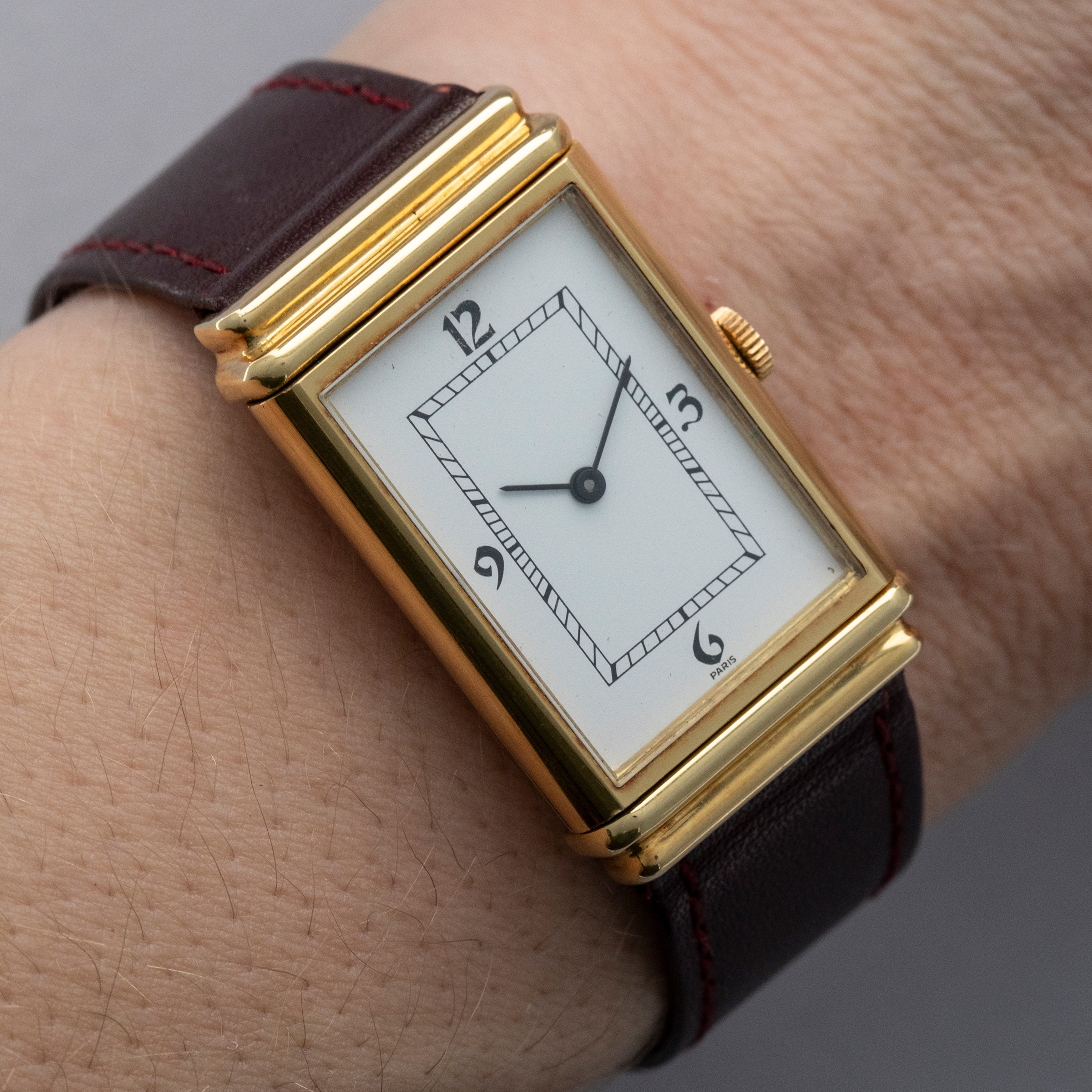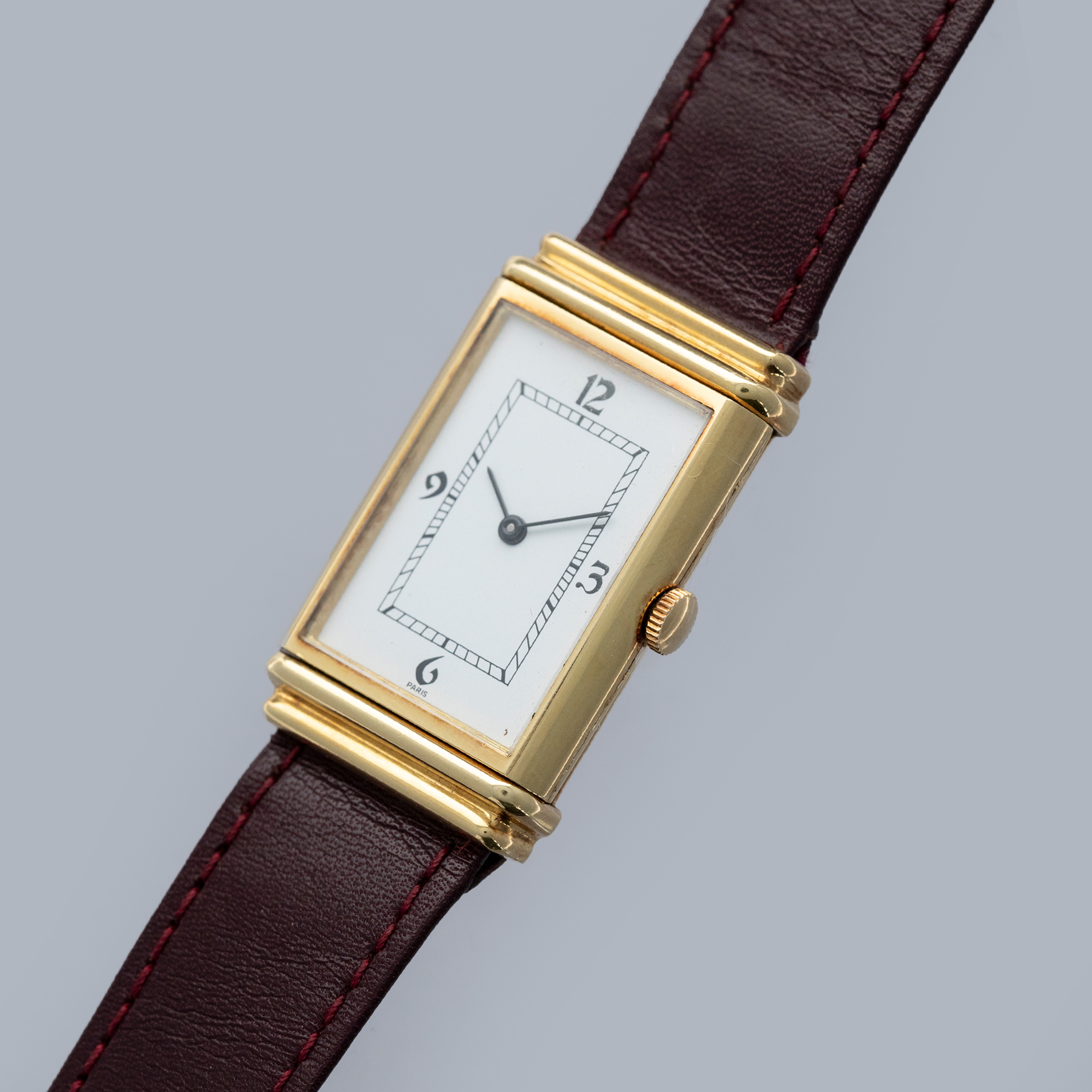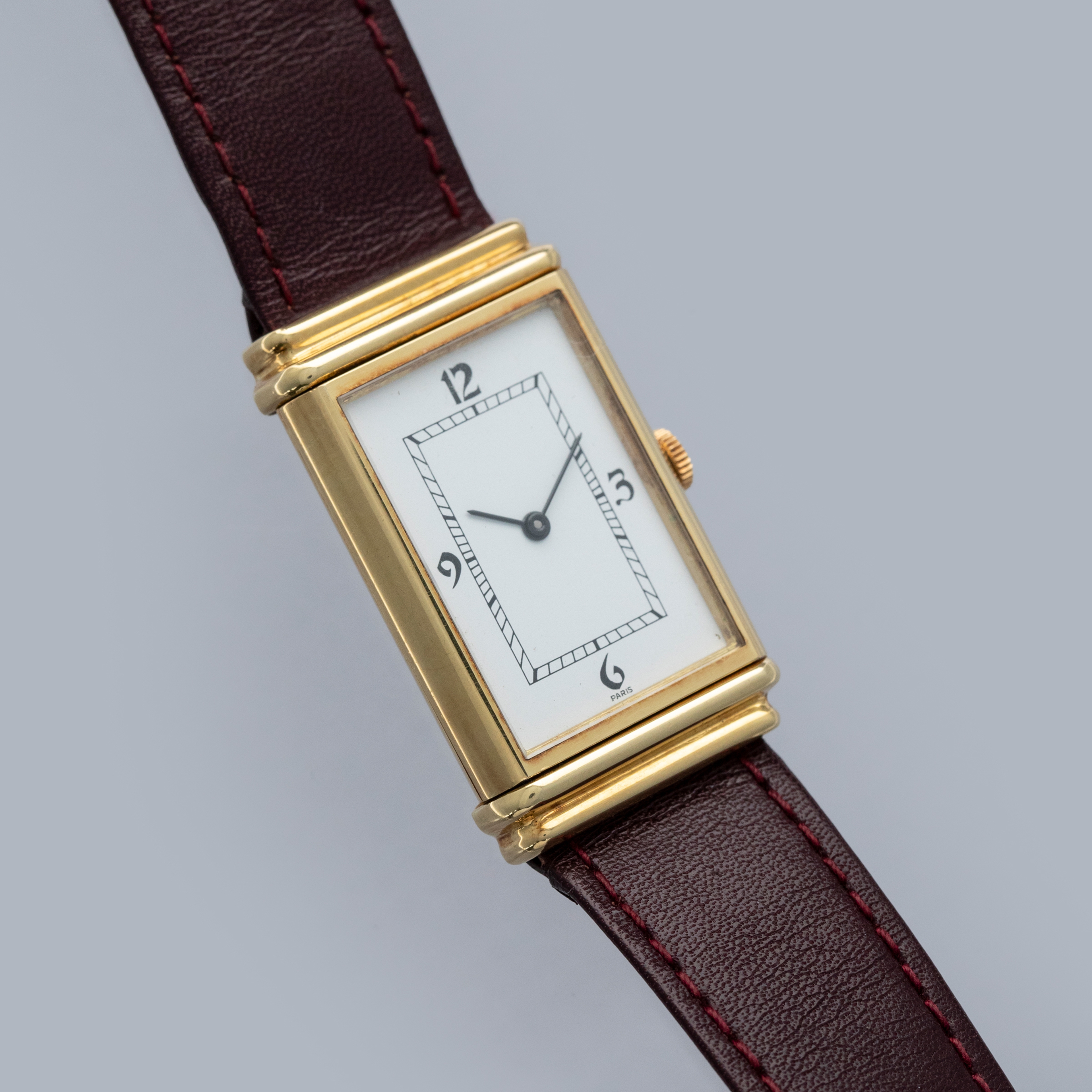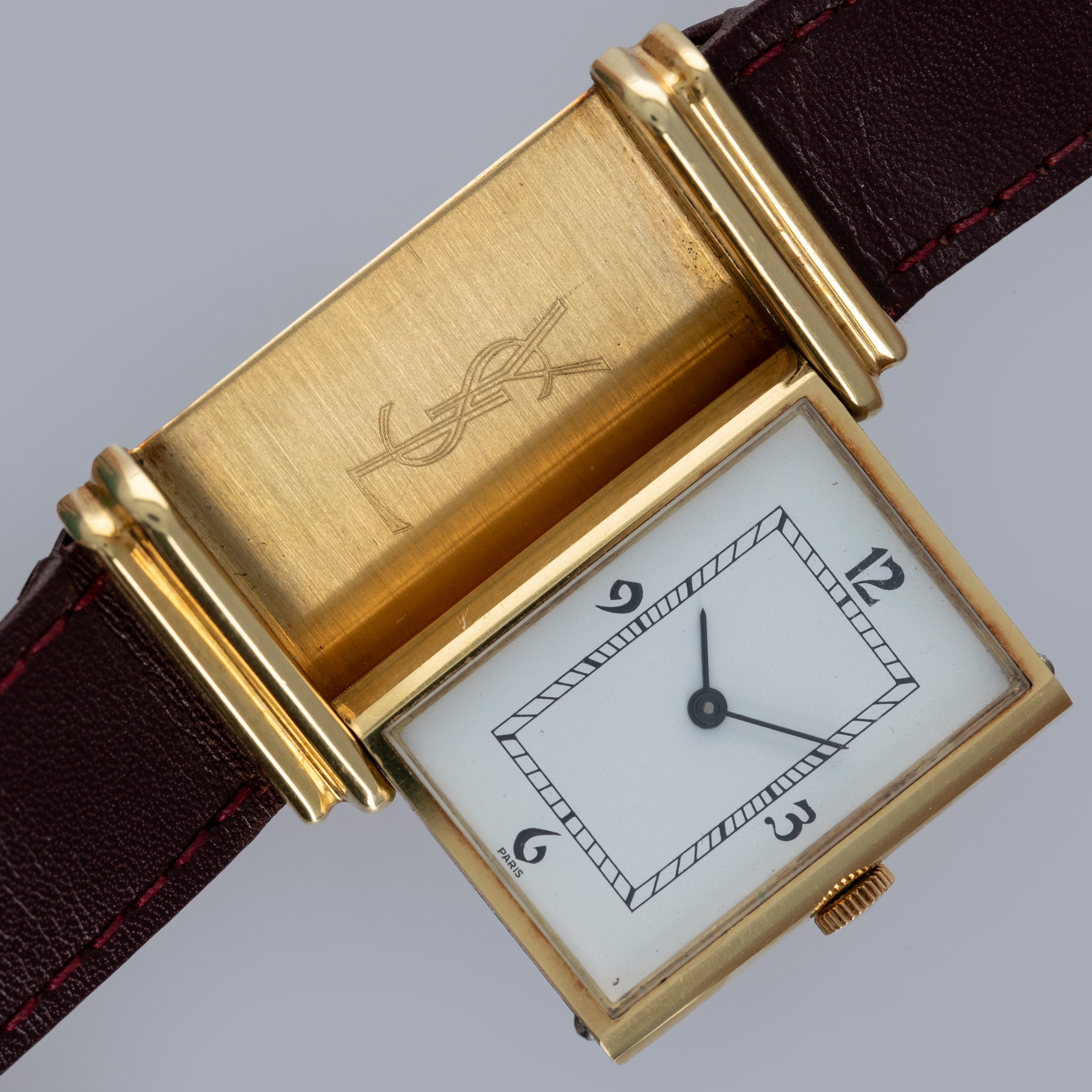 Free from any branding and featuring a rather understated aesthetic in general, the YSL Reverso's white dial only features a railroad-style minute track and Paris inscription at 6 o'clock.