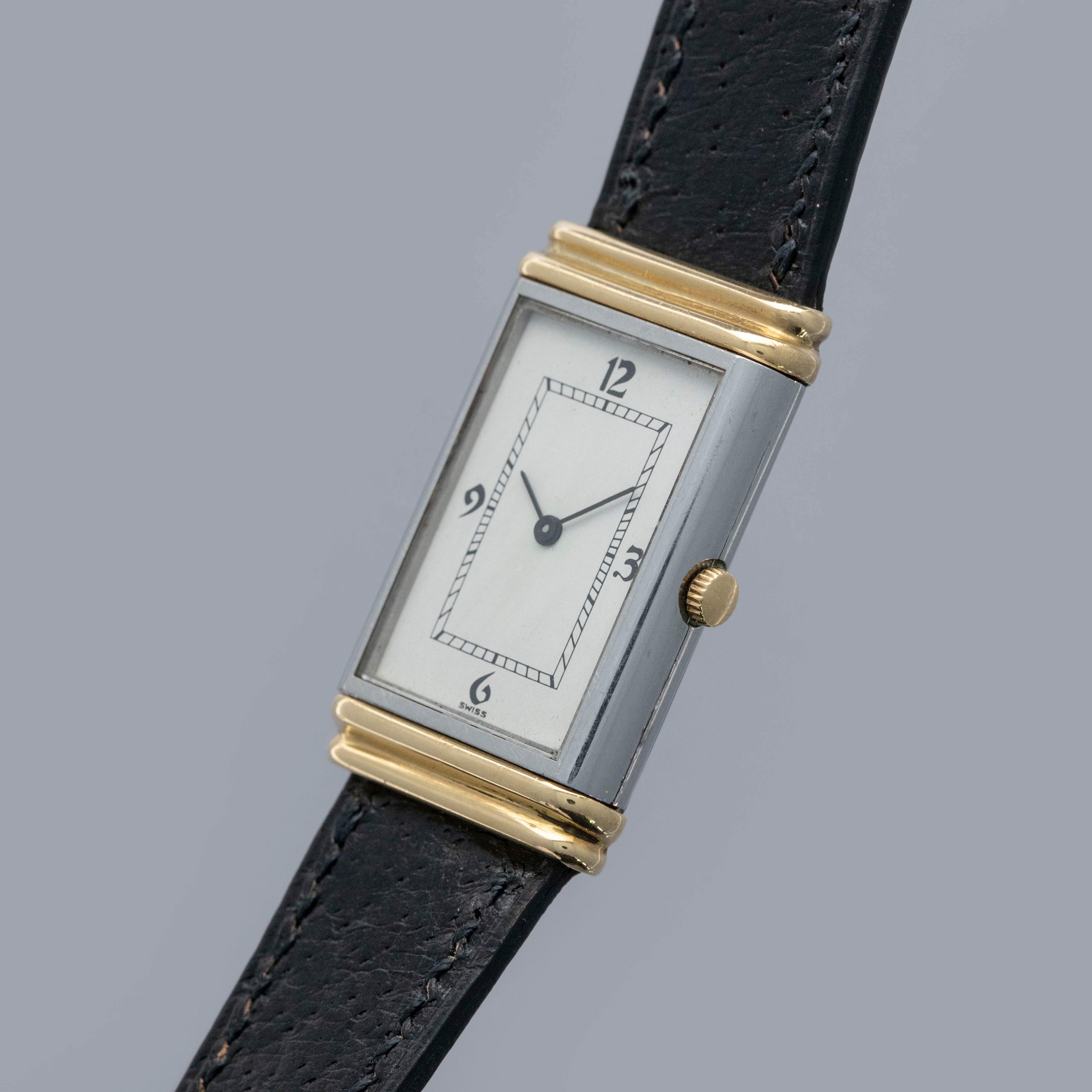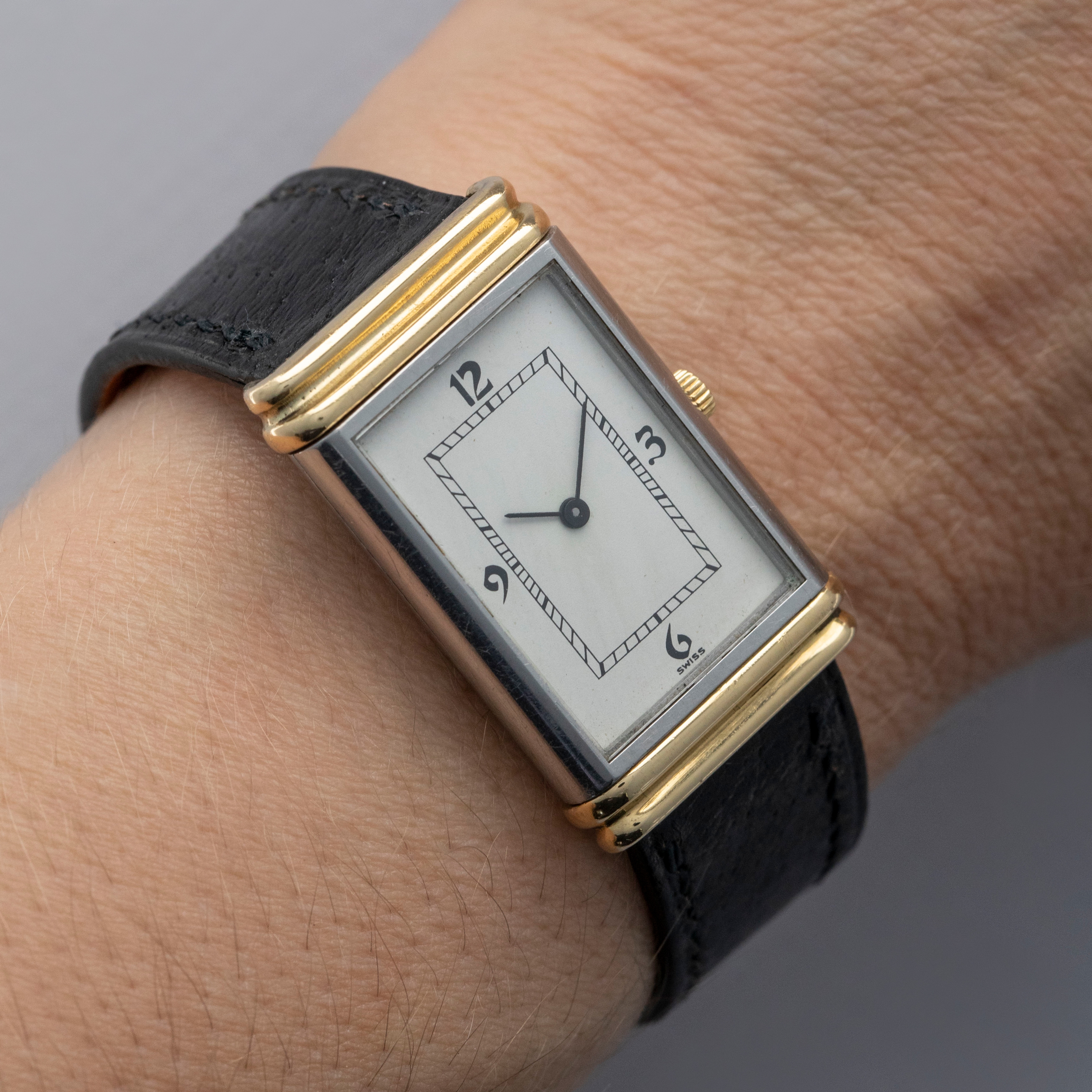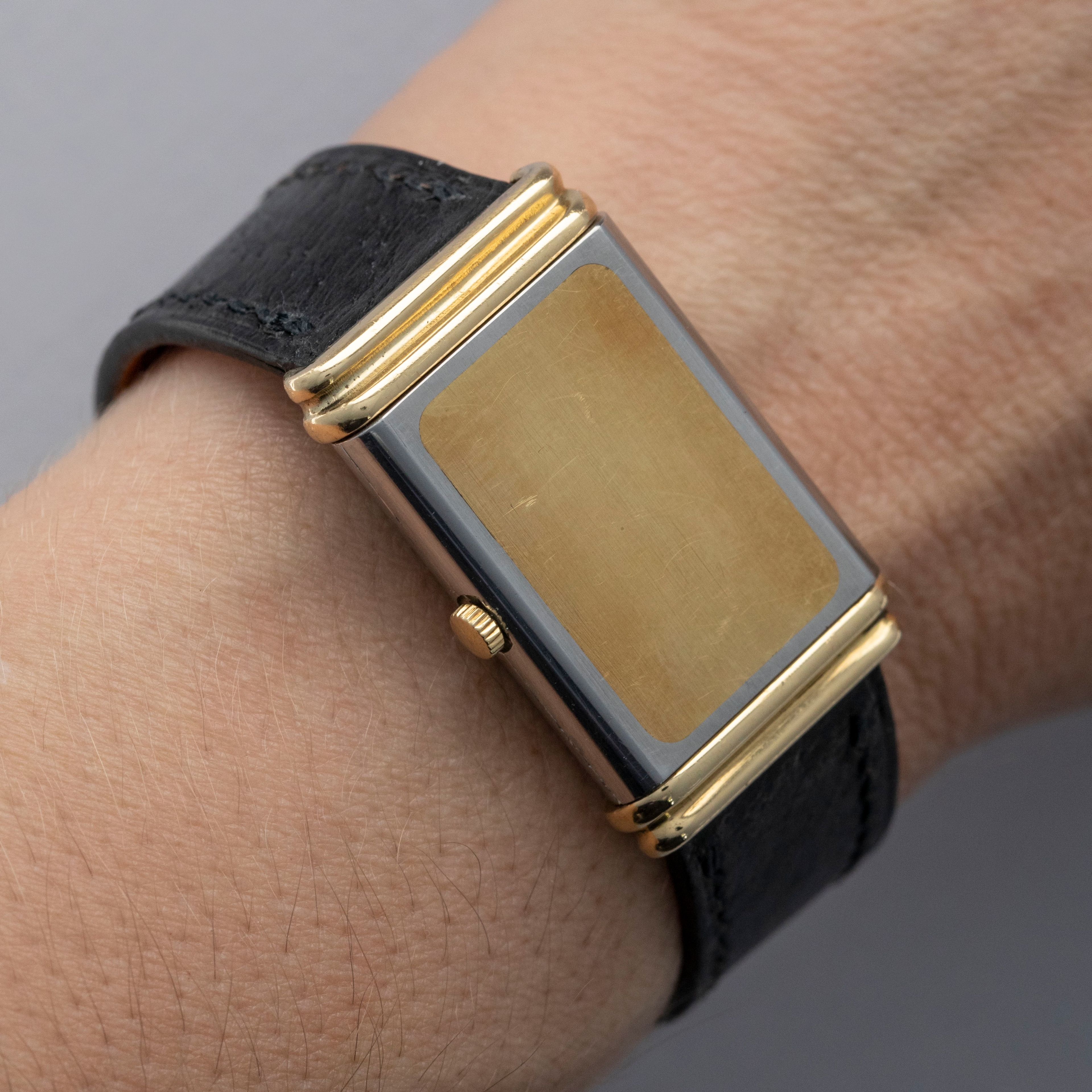 Offered as a unique take on the Reverso, this example features a two-tone 18kt yellow gold and stainless steel 35mm x 21mm case. However, its main point of differentiation come in the shape of its stepped lugs and understated white dial that boasts a wonderfully unique handwritten-style font. This is one stylish obscurity that vintage collectors are sure to be excited by, especially those who like the Cartier Reverso from the same period, and want something a bit more outside of the box than a typical JLC Reverso.