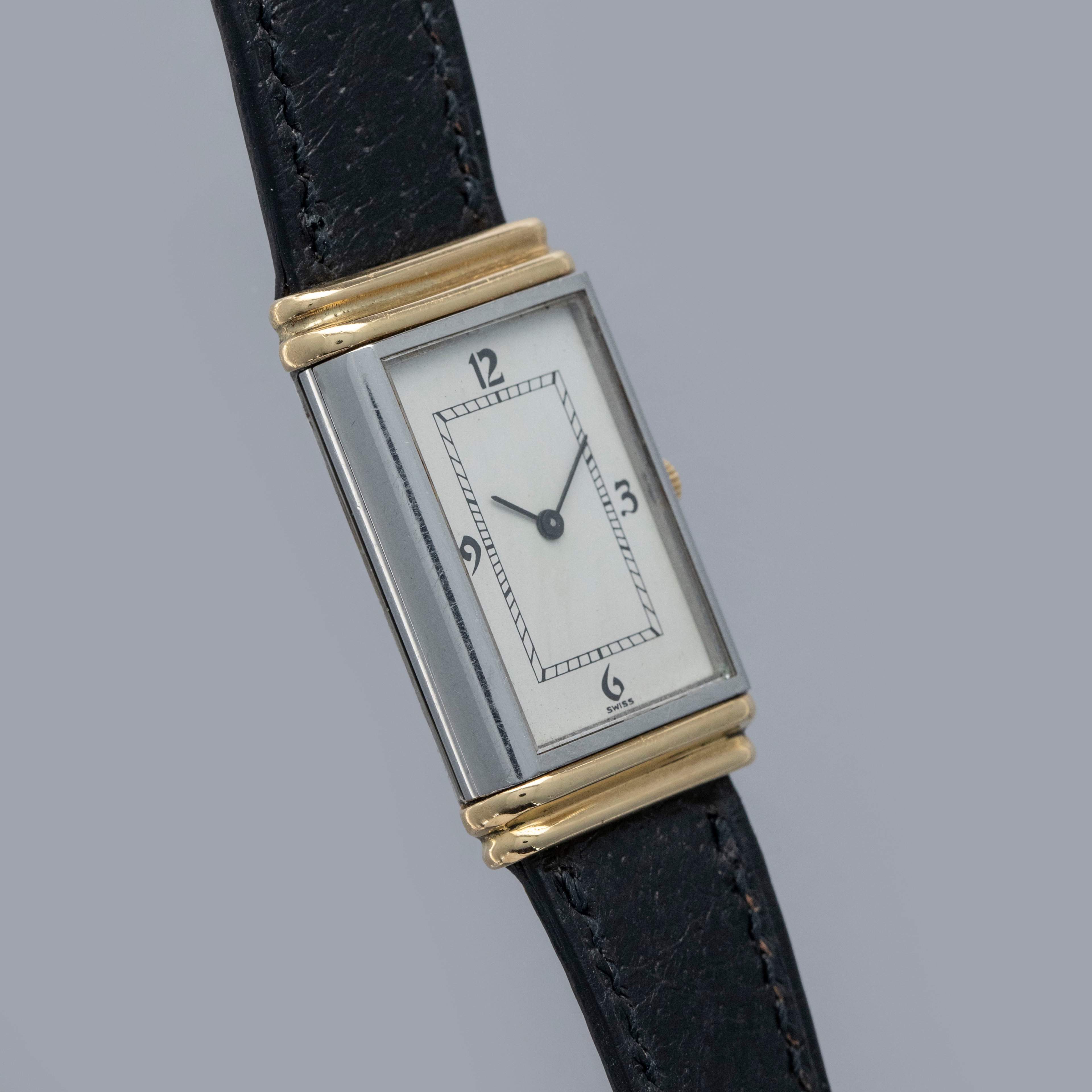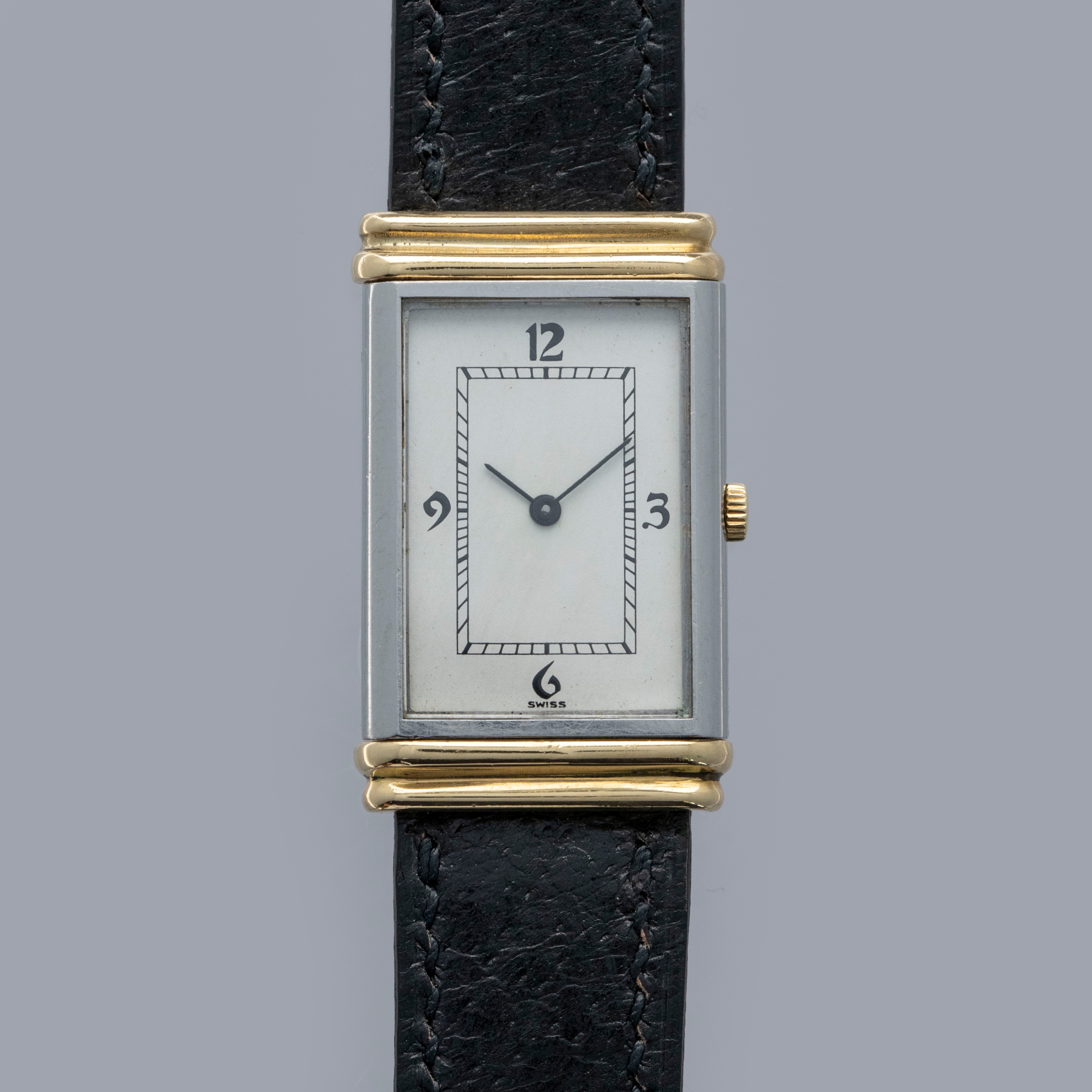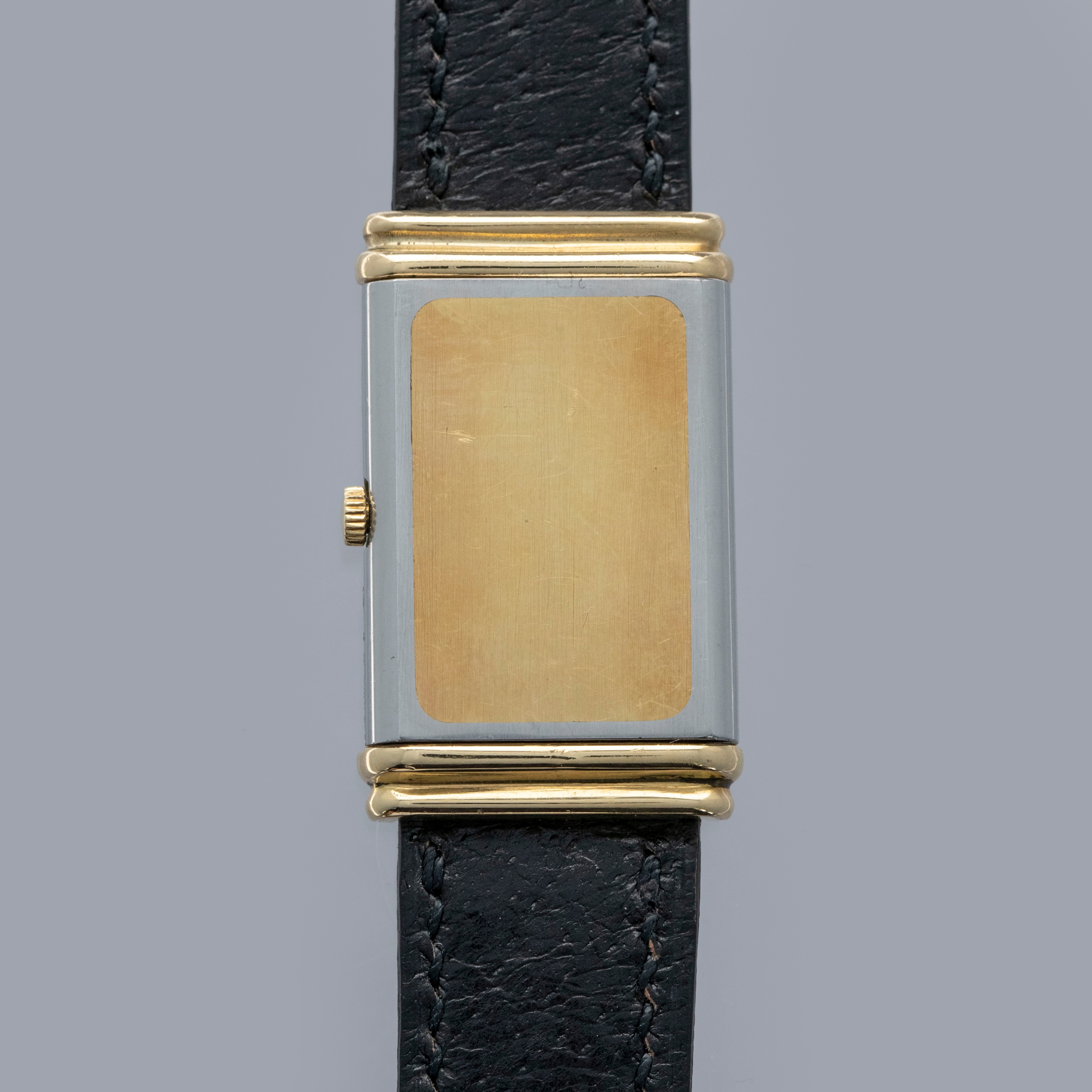 Offered as a unique take on the Reverso, this example features a two-tone 18kt yellow gold and stainless steel 35mm x 21mm case. However, its main point of differentiation come in the shape of its stepped lugs and understated white dial that boasts a wonderfully unique handwritten-style font. This is one stylish obscurity that vintage collectors are sure to be excited by, especially those who like the Cartier Reverso from the same period, and want something a bit more outside of the box than a typical JLC Reverso.