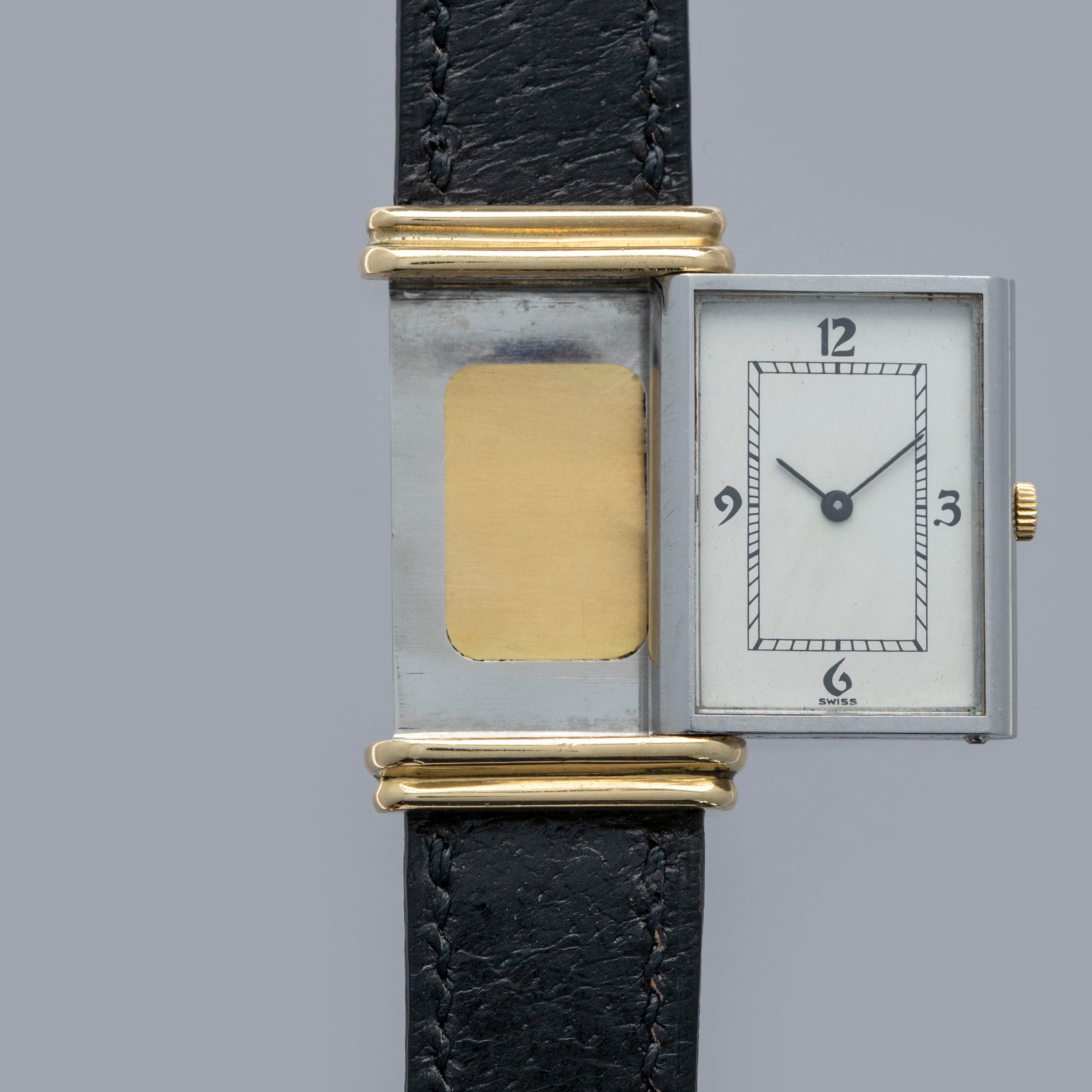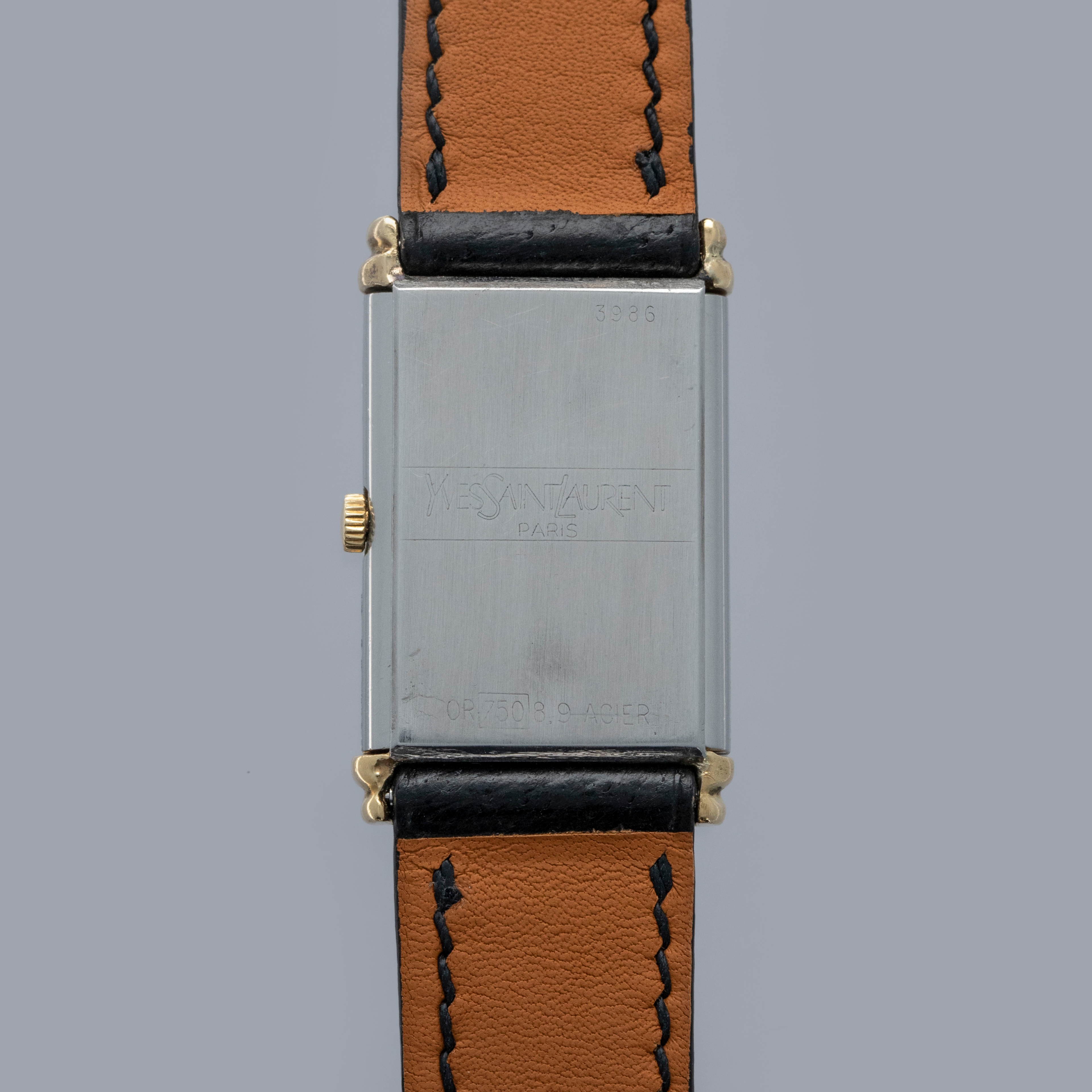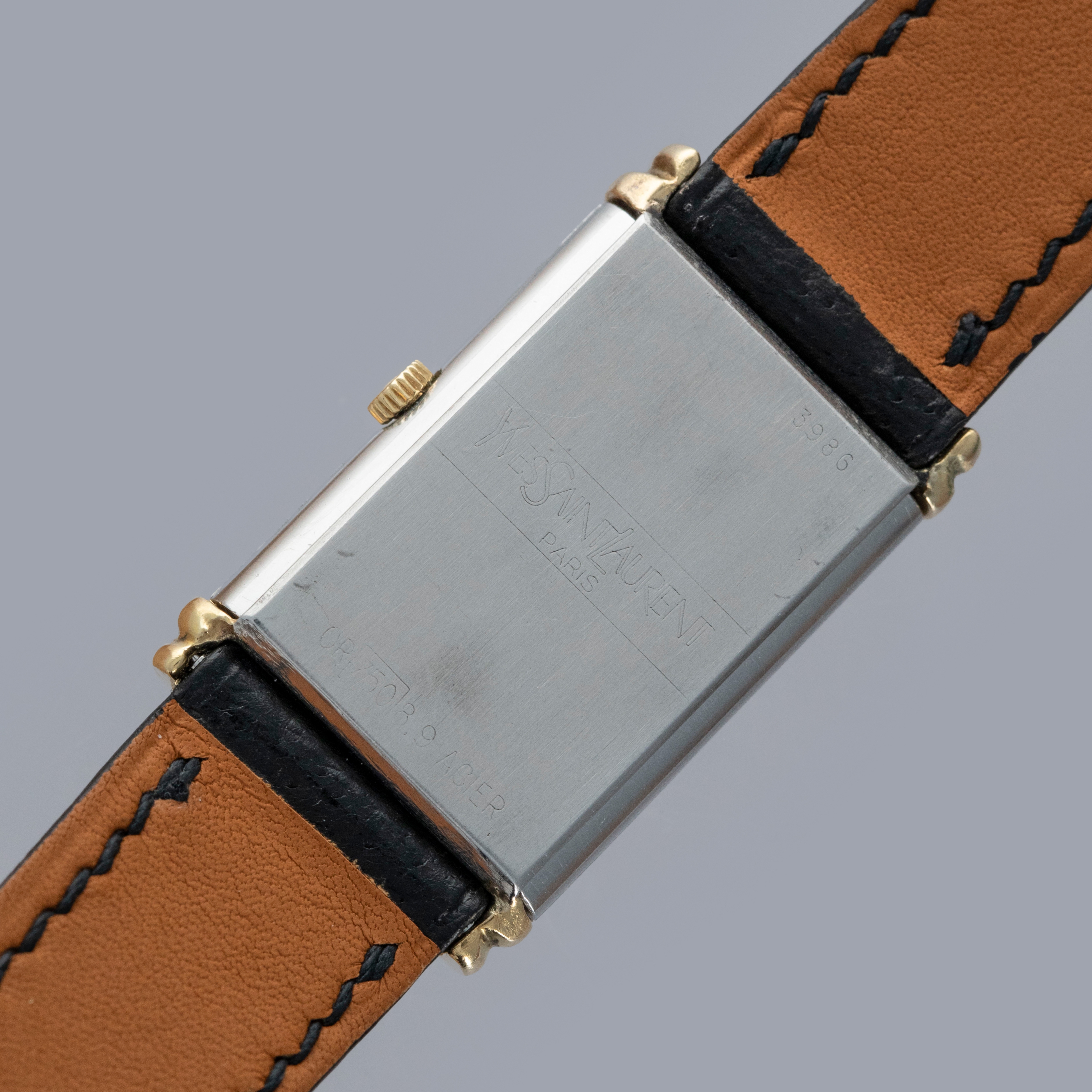 Sporting a reversible design and elegantly stepped lugs, the YSL Reverso's 18kt yellow gold and stainless steel case is both classical and elegant.