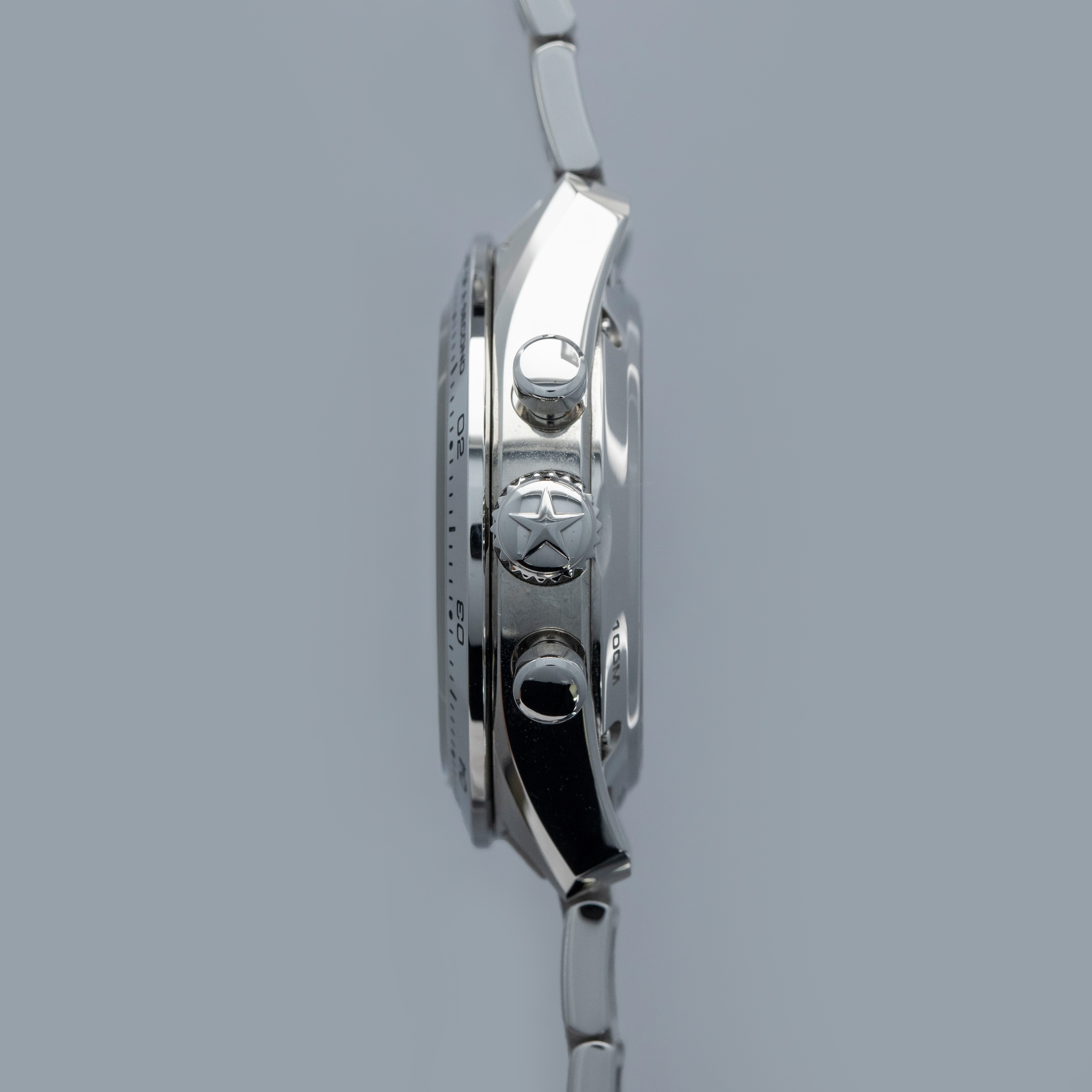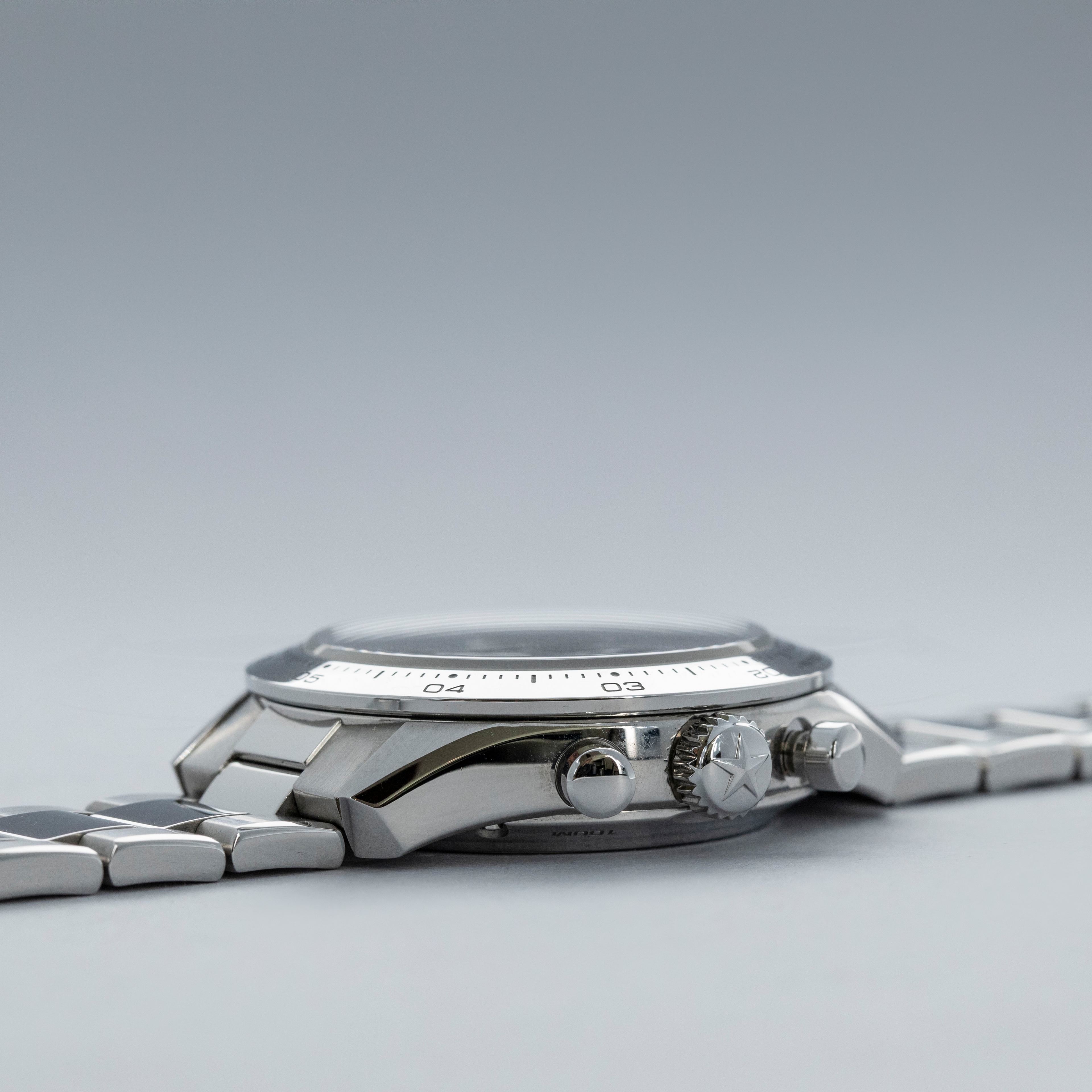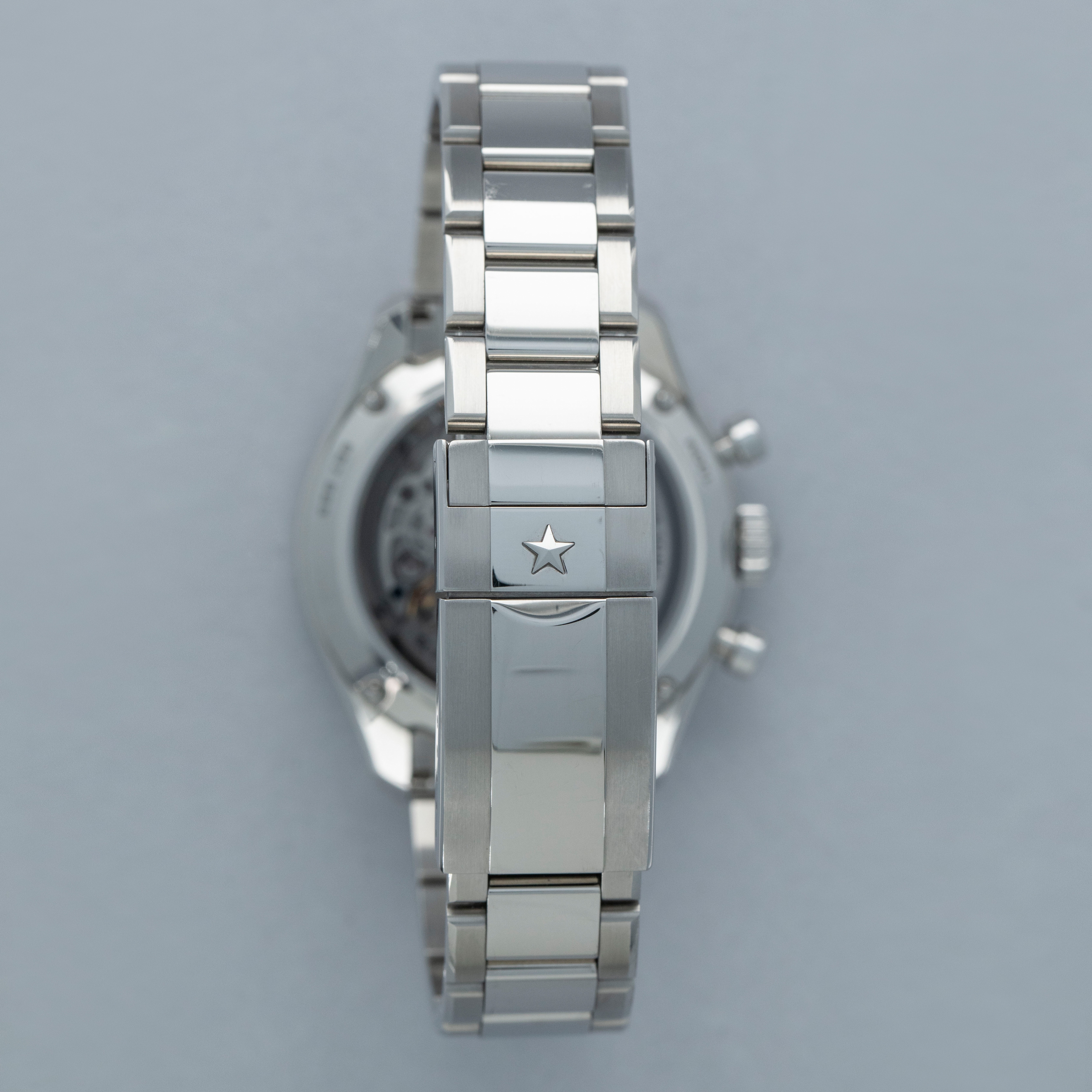 As in keeping with modern requirements, the Chronomaster's 41mm stainless steel case wears fantastically on the wrist with its 13.8mm height ensuring that it wears compact for a high-frequency chronograph that features a date function and exhibition caseback.