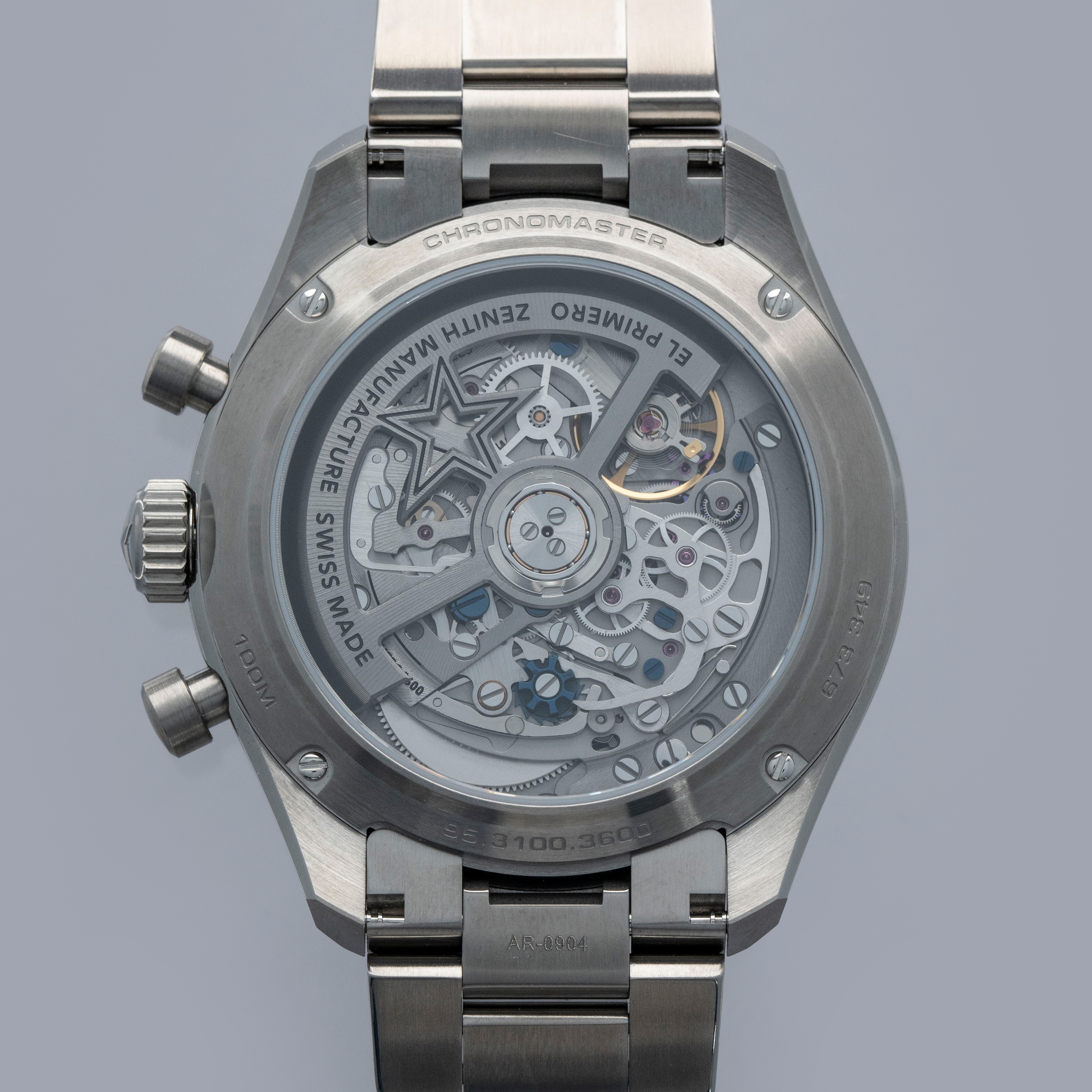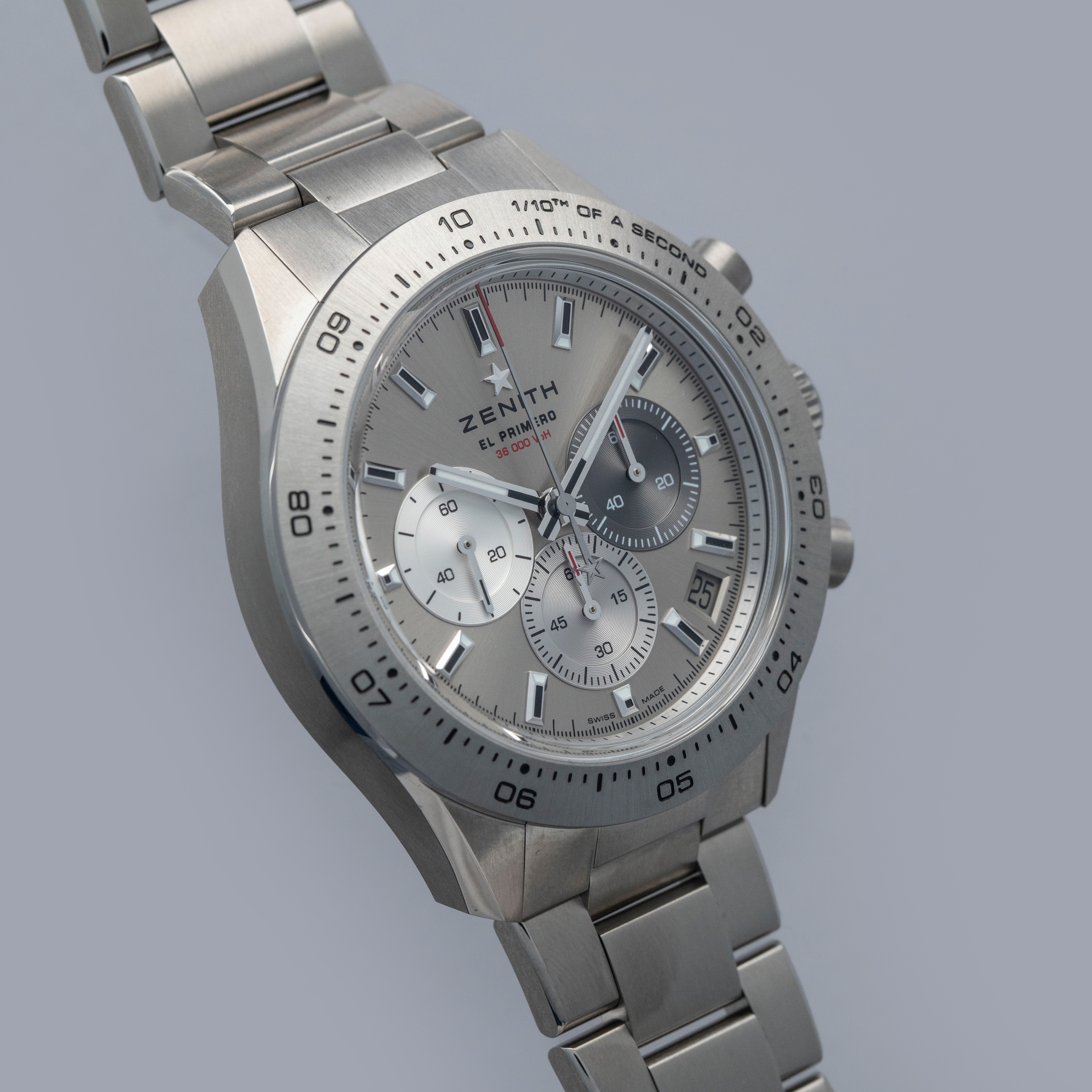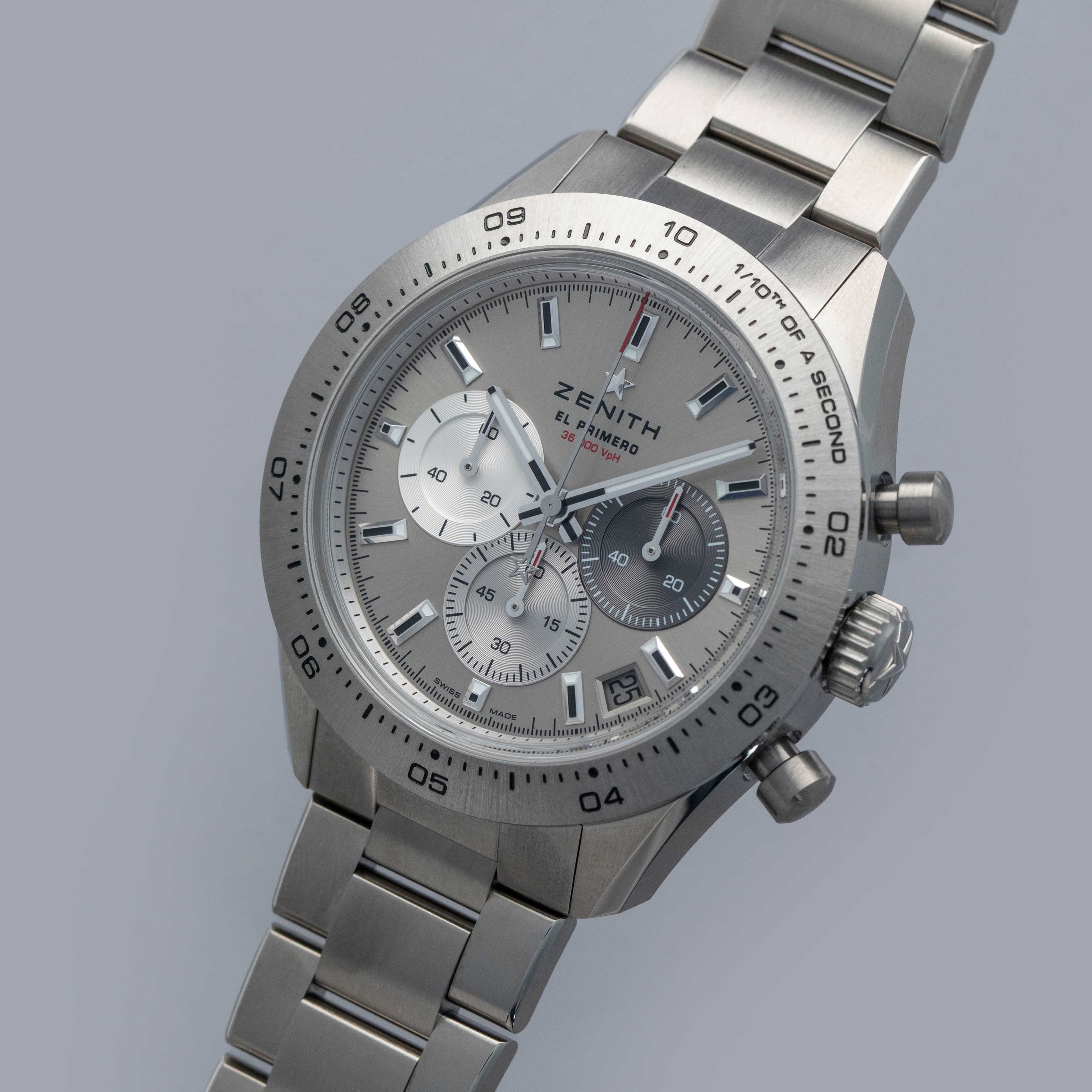 Arguably one of the most famous chronograph makers in all of horology, Zenith is best-known for their El Primero automatic chronograph movement. From its status as one of the first automatic chronograph movements ever made (depending on who you ask) and the base movement to feature within the second-generation Rolex Daytona, the El Primero is certainly a modern-day icon. Launched in 1969, its incredible hi-beat rate, amazing accuracy and technical prowess ensured that any watch it was inside was one of the best chronographs money could buy. Offered here we have the Zenith Chronomaster Sport 95.3100.3600/39.M3100 that was debuted in 2024 with a slew of modern design elements that have been combined with heritage-based elements to create a watch that appeals to modern collectors’ requirements for a luxury timepiece while speaking to thoughtful design. As such, the Chronomaster features a grey dial to match its titanium construction with tri-color subdials across the spectrum of grey with a bright silver, a light grey, and a dark grey, in keeping with the aesthetic that Zenith pioneered decades ago. Furthermore, it features pump-style chronograph pushers and their legendary El Primero chronograph movement that can measure to 1/10th of a second. In addition to everything, this timepiece sports a titaniym 41mm case, a stainless titanium bezel and a robust titanium bracelet that can safely tackle any wear and tear - as modern collectors have come to expect – but with a lightweighted feeling that is both surprising and comfortable.