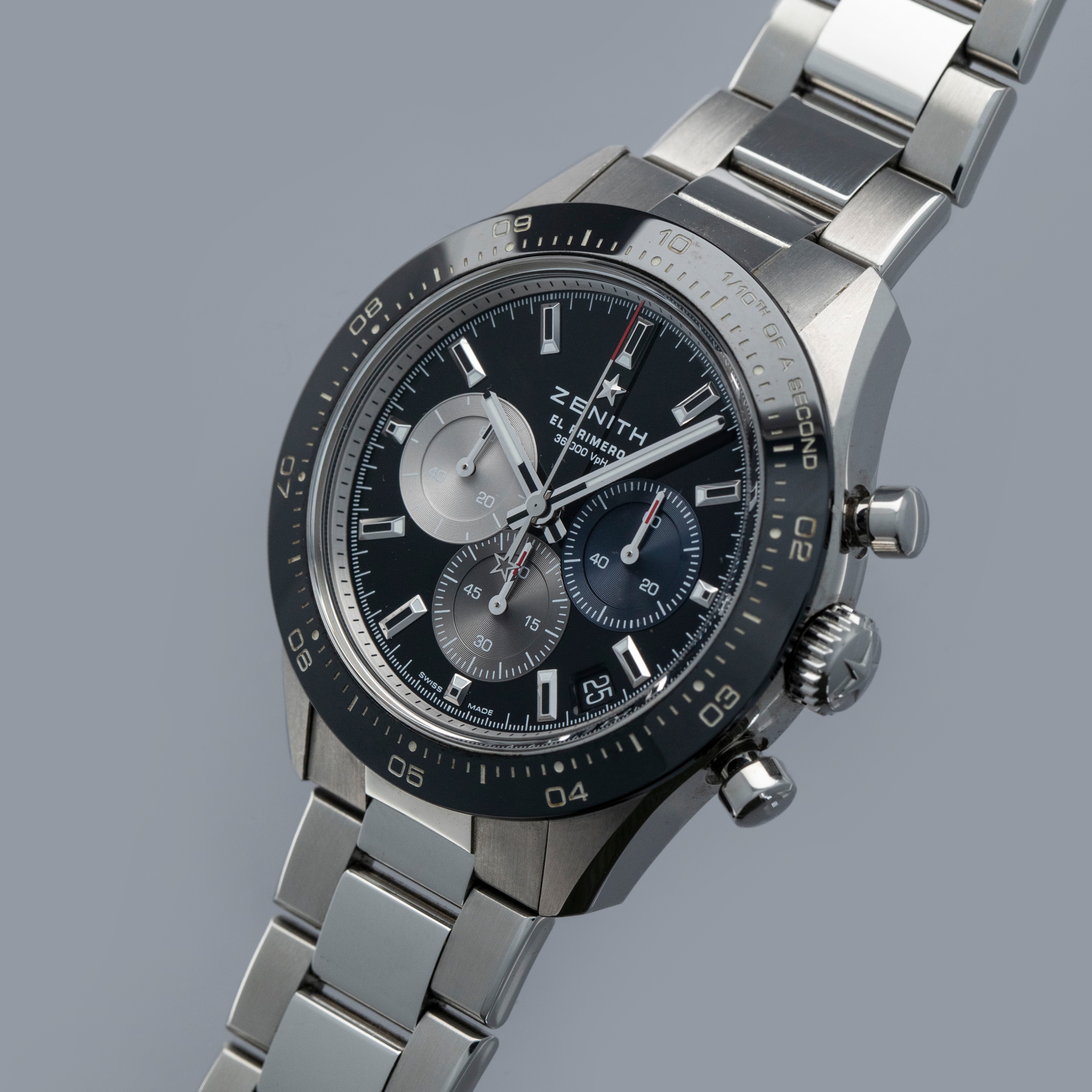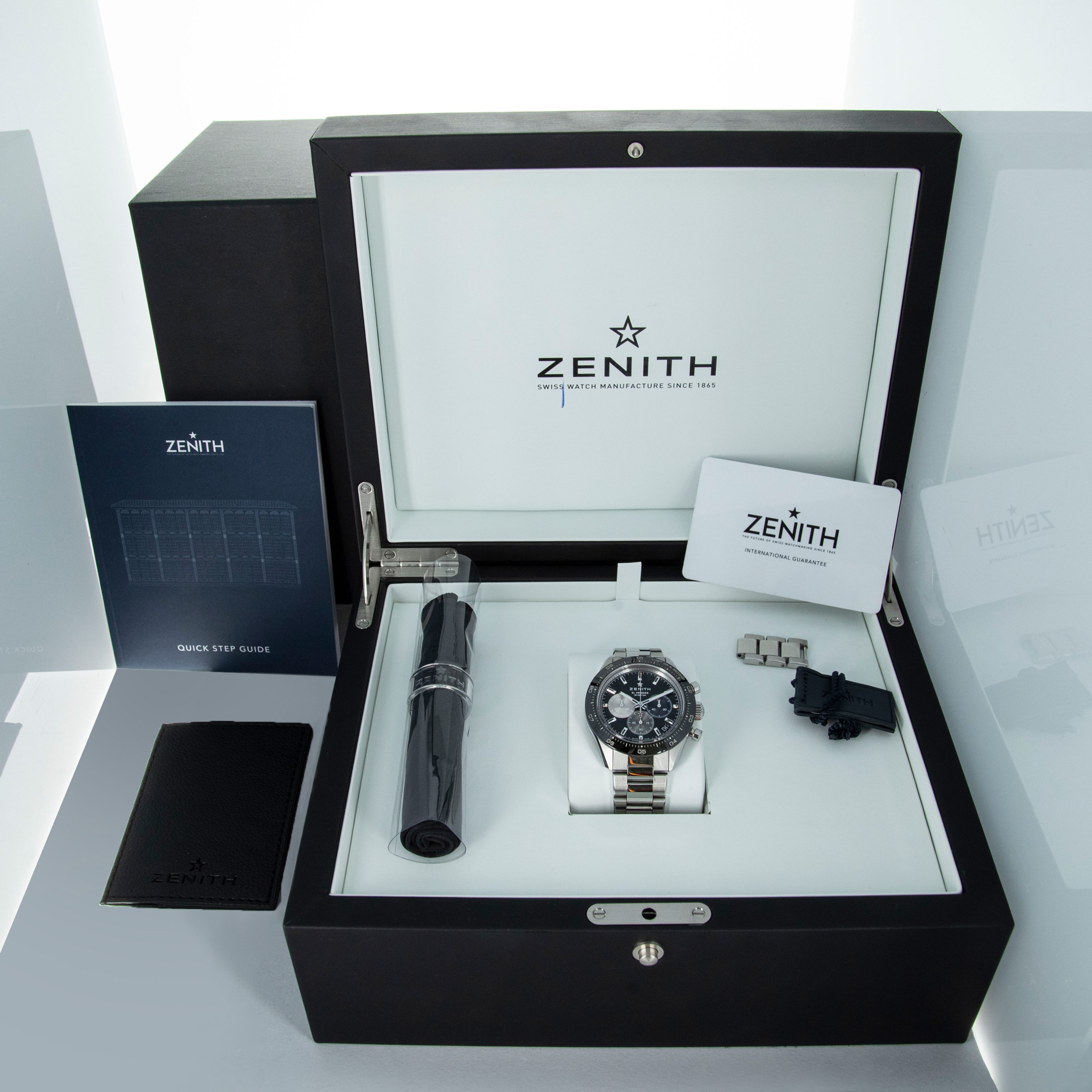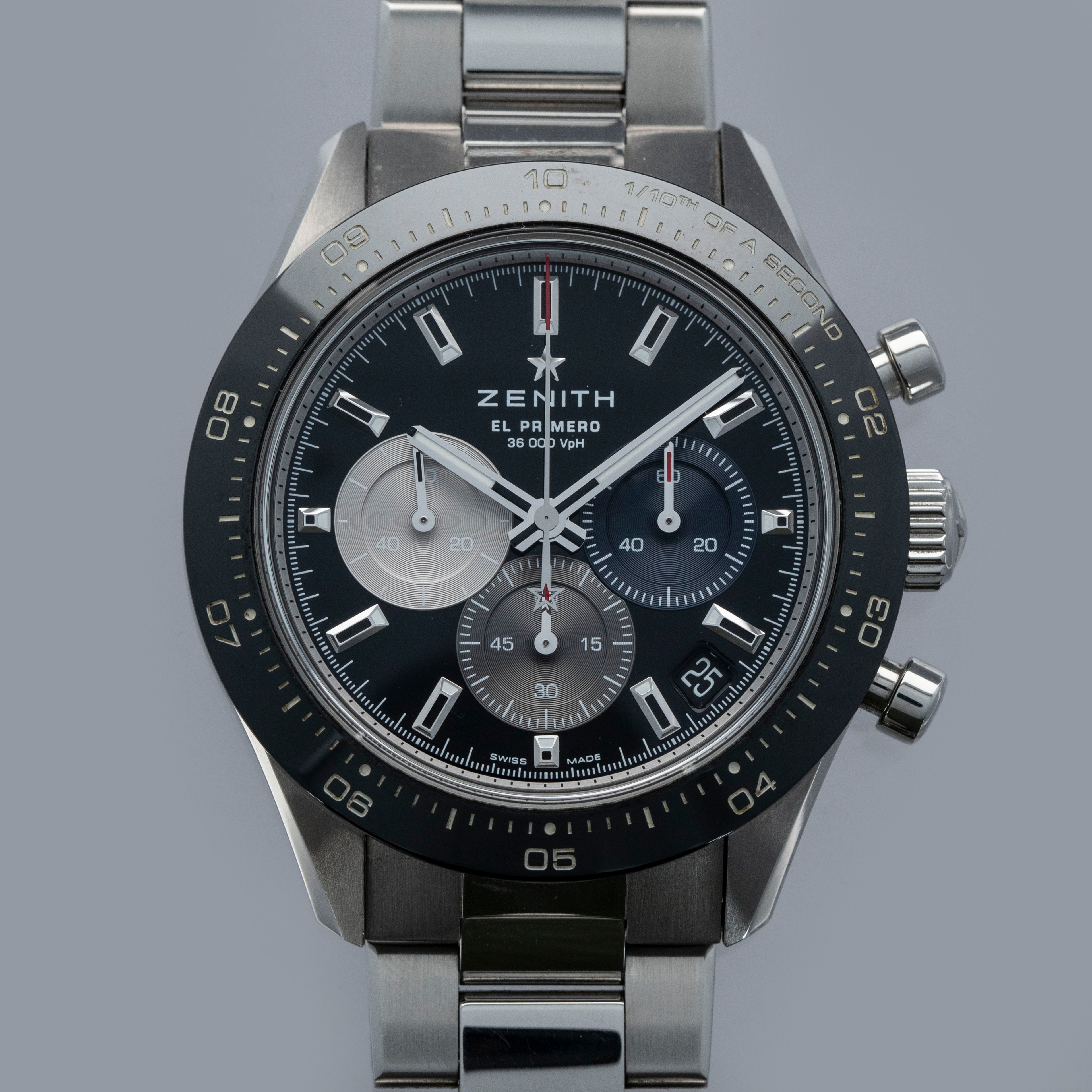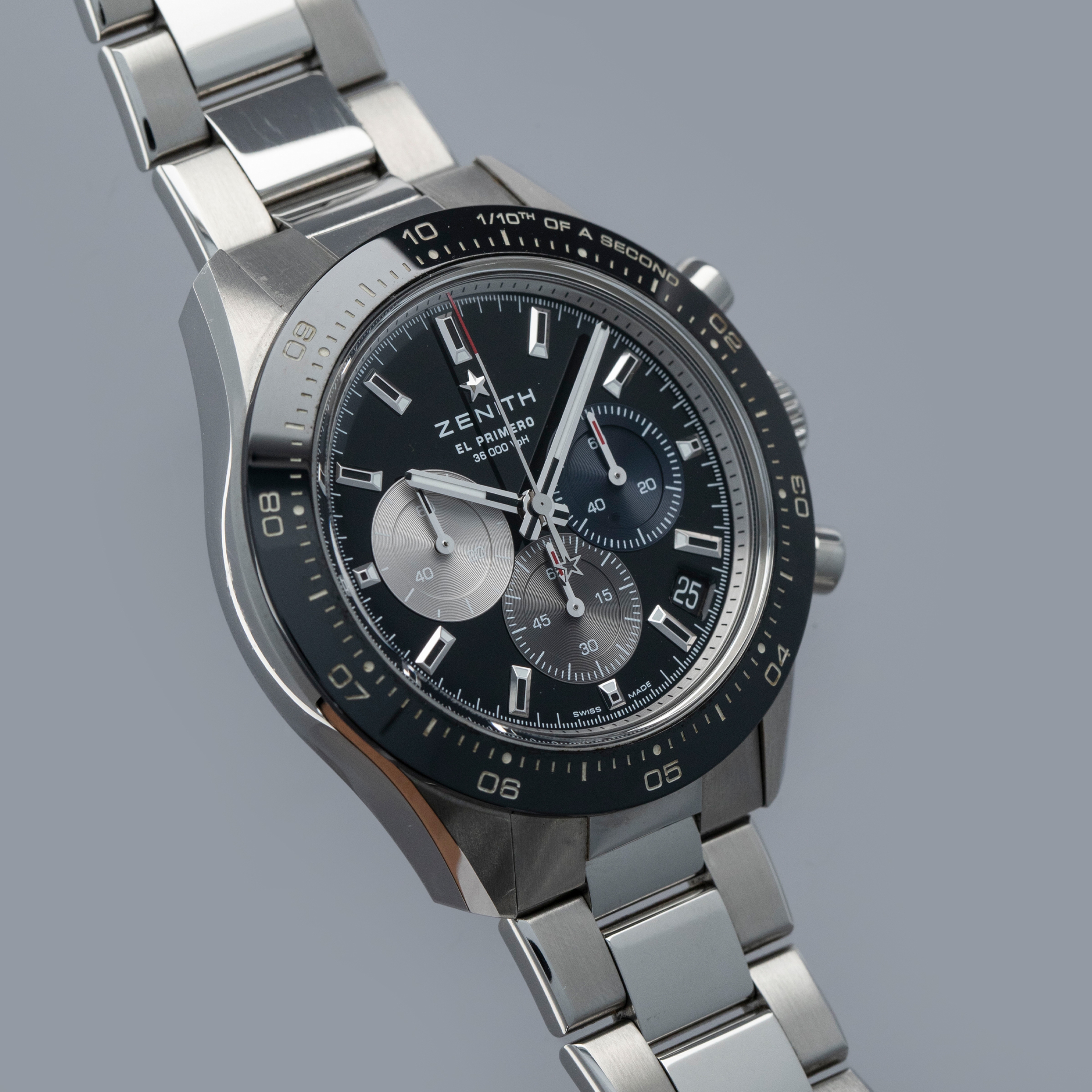 Arguably one of the most famous chronograph makers in all of horology, Zenith is best-known for their El Primero automatic chronograph movement. From its status as one of the first automatic chronograph movements ever made (depending on who you ask) and the base movement to feature within the second-generation Rolex Daytona, the El Primero is certainly a modern-day icon. Launched in 1969, its incredible hi-beat rate, amazing accuracy and technical prowess ensured that any watch it was inside was one of the best chronographs money could buy. Offered here we have the Zenith Chronomaster Sport that was debuted in 2021 with a slew of modern design elements that have been combined with heritage-based elements to create a watch that appeals to modern collectors’ requirements for a luxury timepiece while speaking to thoughtful design. As such, the Chronomaster features either a silver or black dial (black on this example) with tri-color subdials as Zenith pioneered decades ago, pump-style chronograph pushers and their legendary El Primero chronograph movement that can measure to 1/10th of a second. In addition to that, this timepiece sports a stainless steel 41mm case, a ceramic bezel and a robust stainless steel bracelet that can safely tackle any wear and tear - as modern collectors have come to expect.