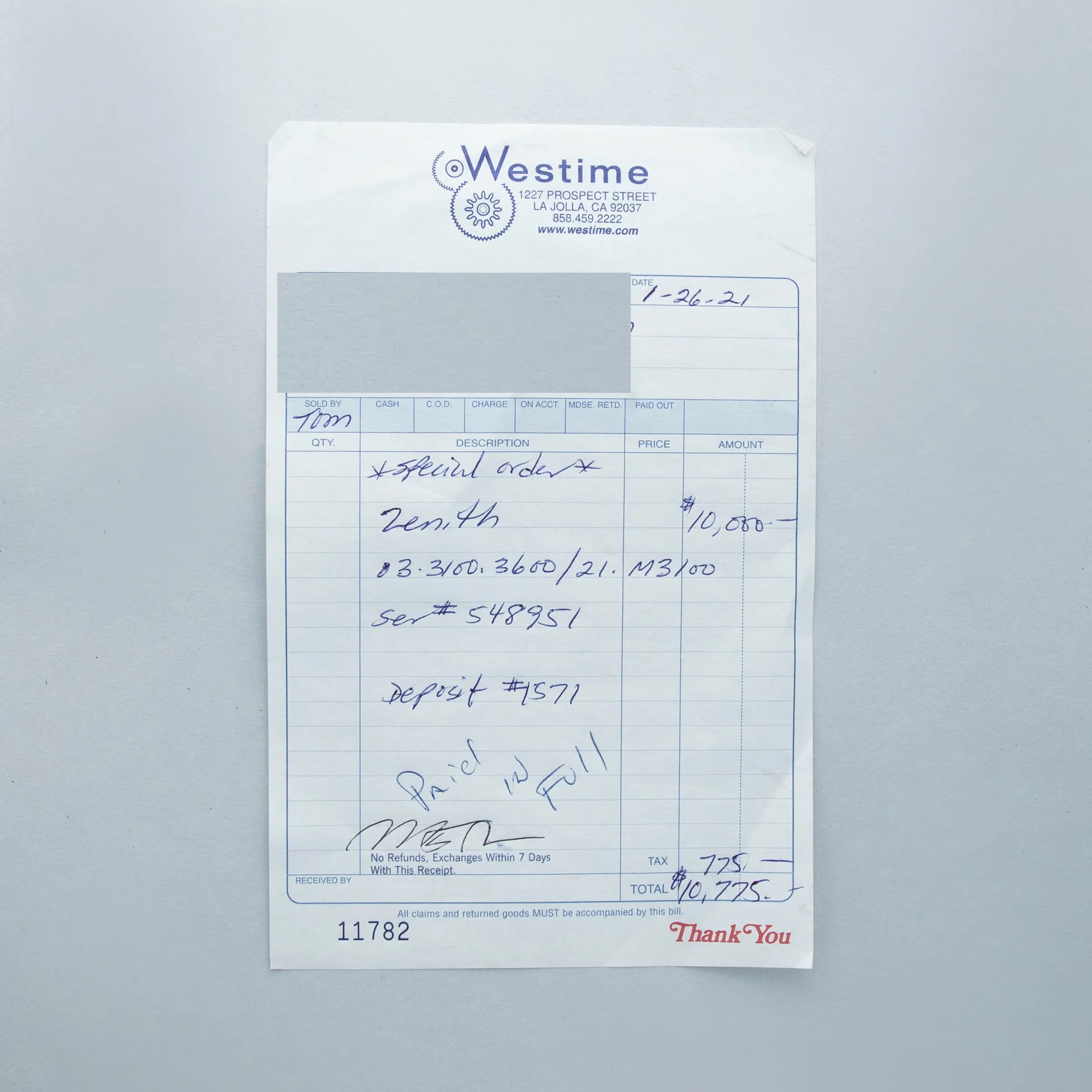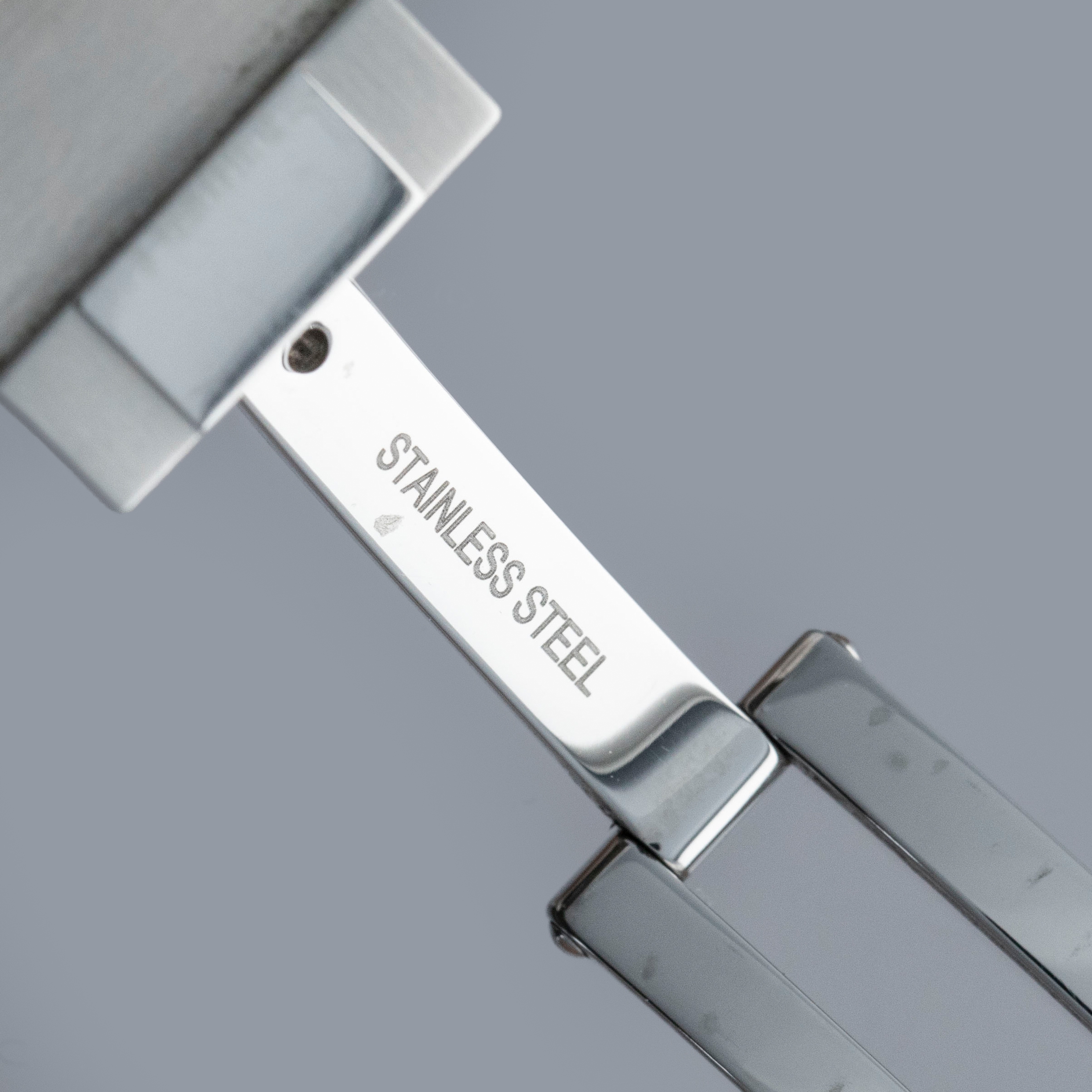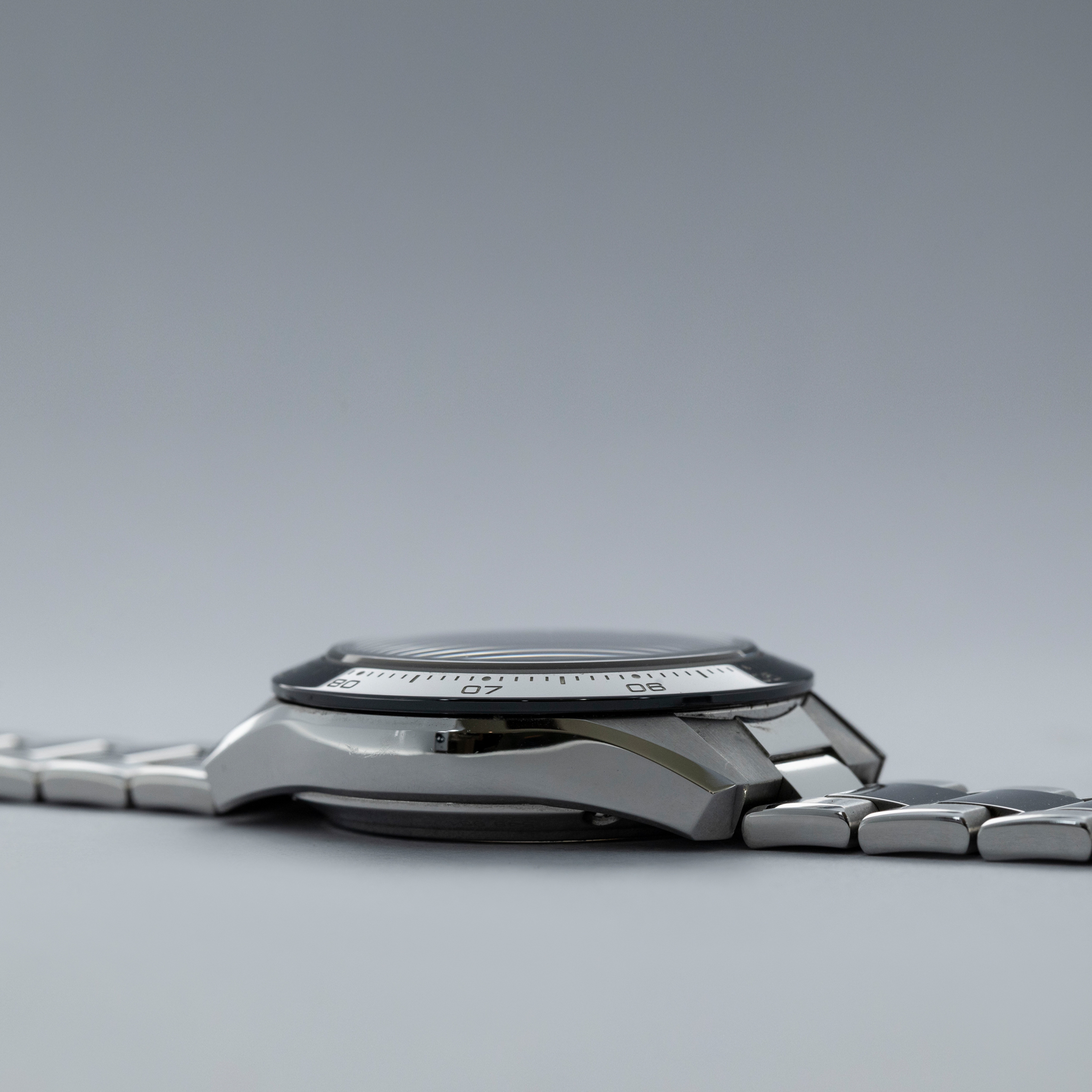 The watch is in overall excellent condition. The stainless steel case shows light scratches and marks on the lugs and case sides, while the display case back has additional light scratches and crisp engravings on the outer edge. The ceramic bezel shows some light marks. The dial and hands are like new. The bracelet has some surface scratches, particularly on the clasp. The bracelet currently fits an approximately 7¼” wrist and has 13 links, 3 of which are removable, with 3 additional links included. The watch comes as a full set with inner and outer boxes, warranty card, booklet, wallet, cloth, USB drive, and purchase receipts and paperwork.