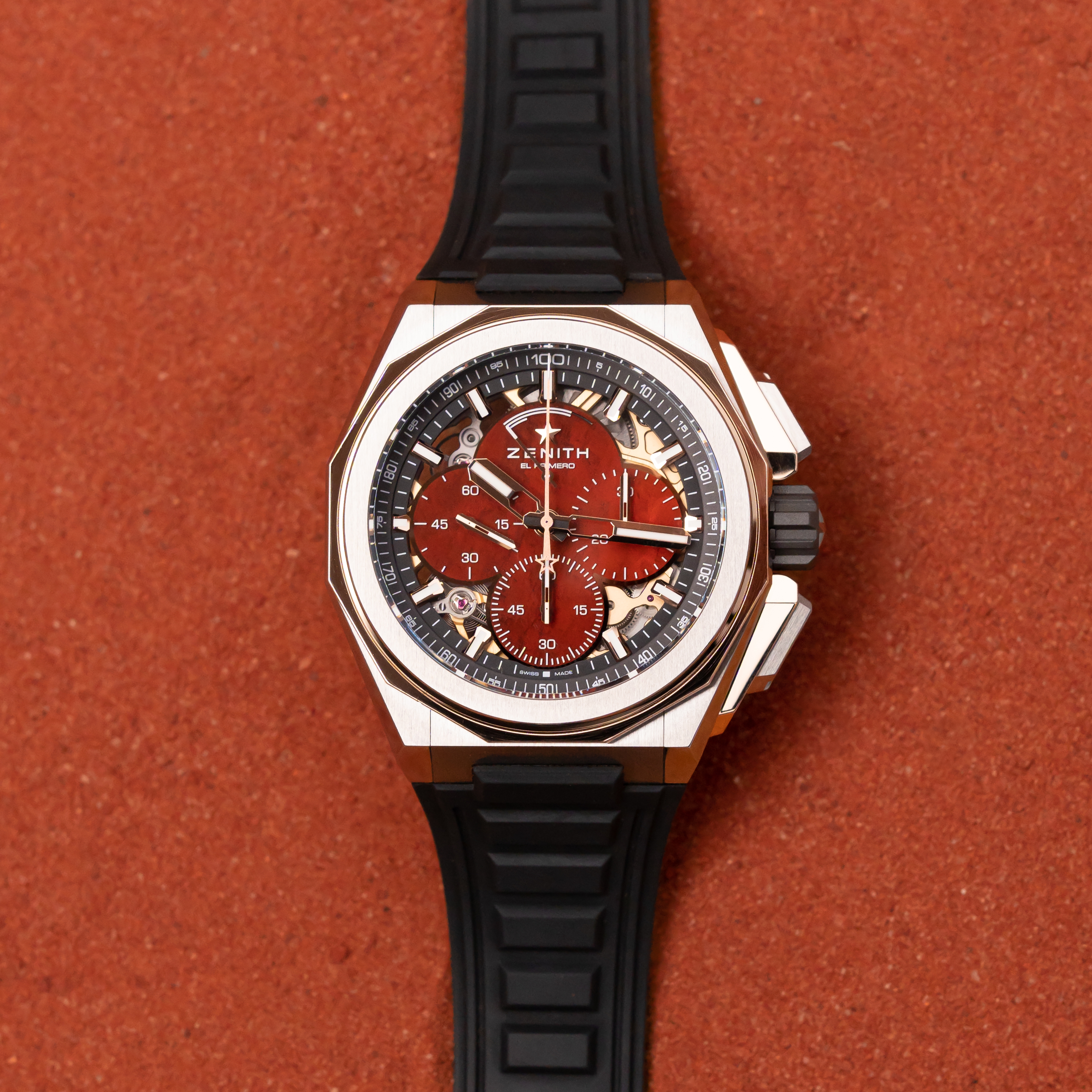Now, Buddy has worked closely with the design team from ZENITH to bring to life a bespoke version of the DEFY Extreme model inspired by the rugged Australian landscape and Buddy’s own Indgenous background. The Sapphire dial has been crafted in a custom colour called ‘Ulura’ with texturisation on the counter inspired by the iconic sandstone monolith and sacred site of Uluru.