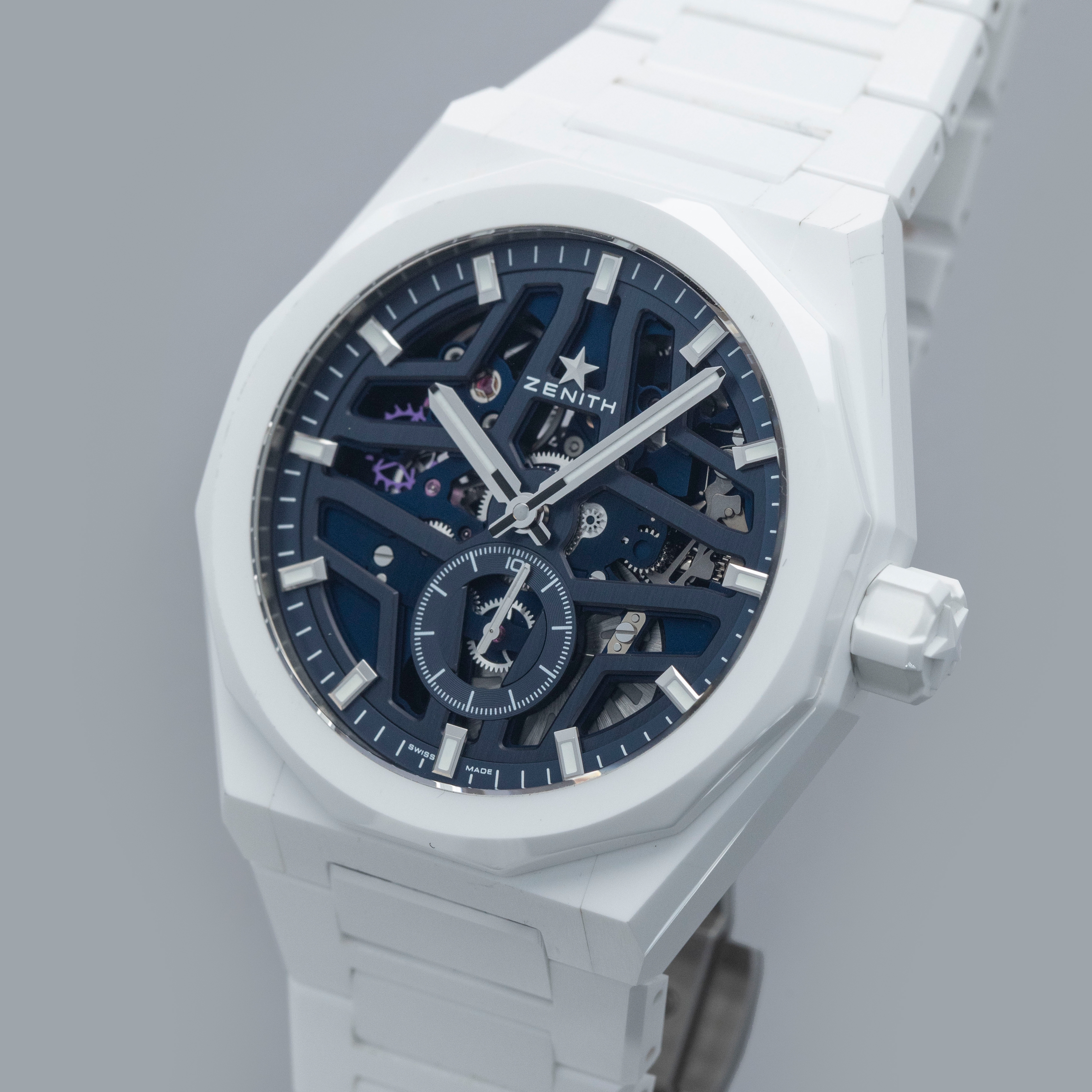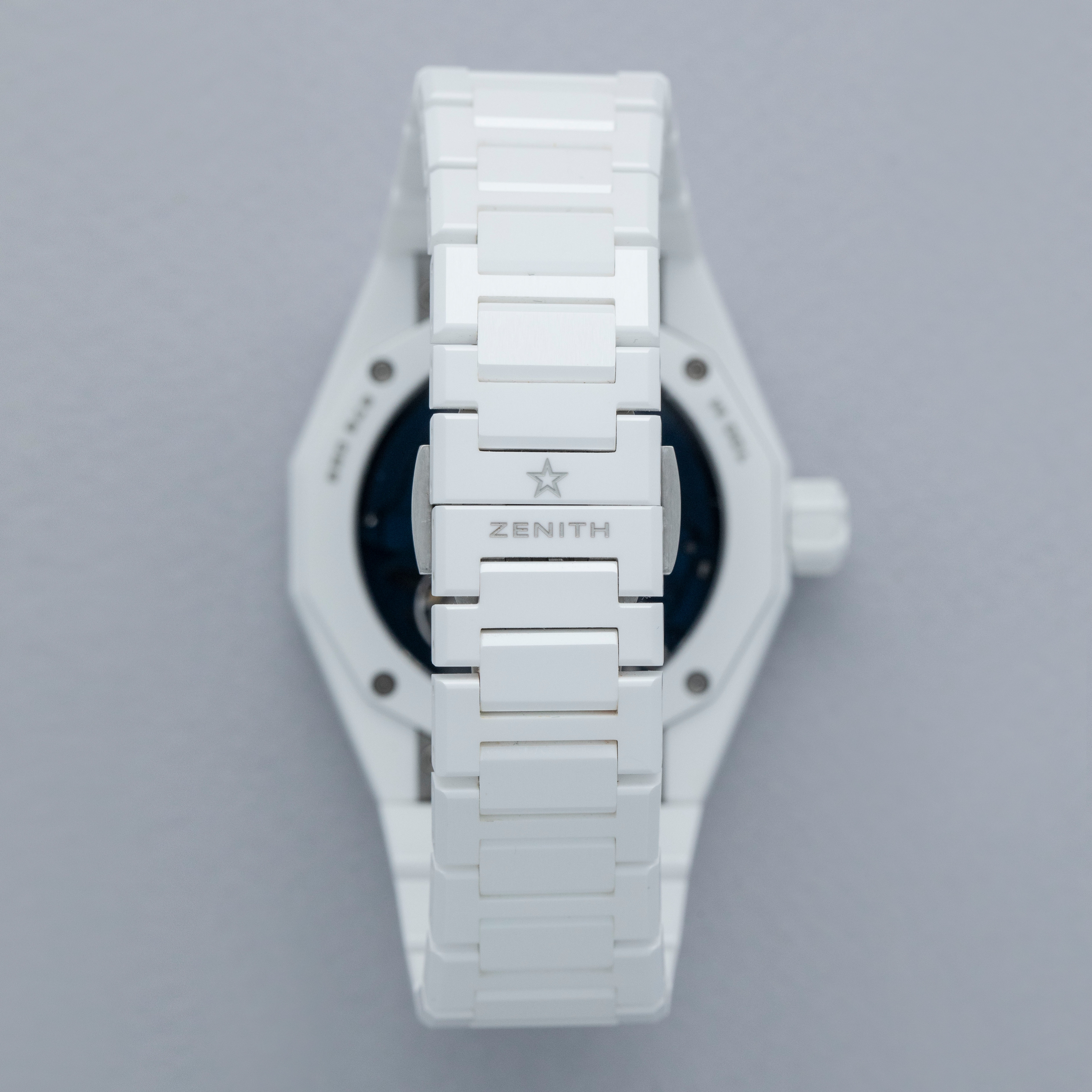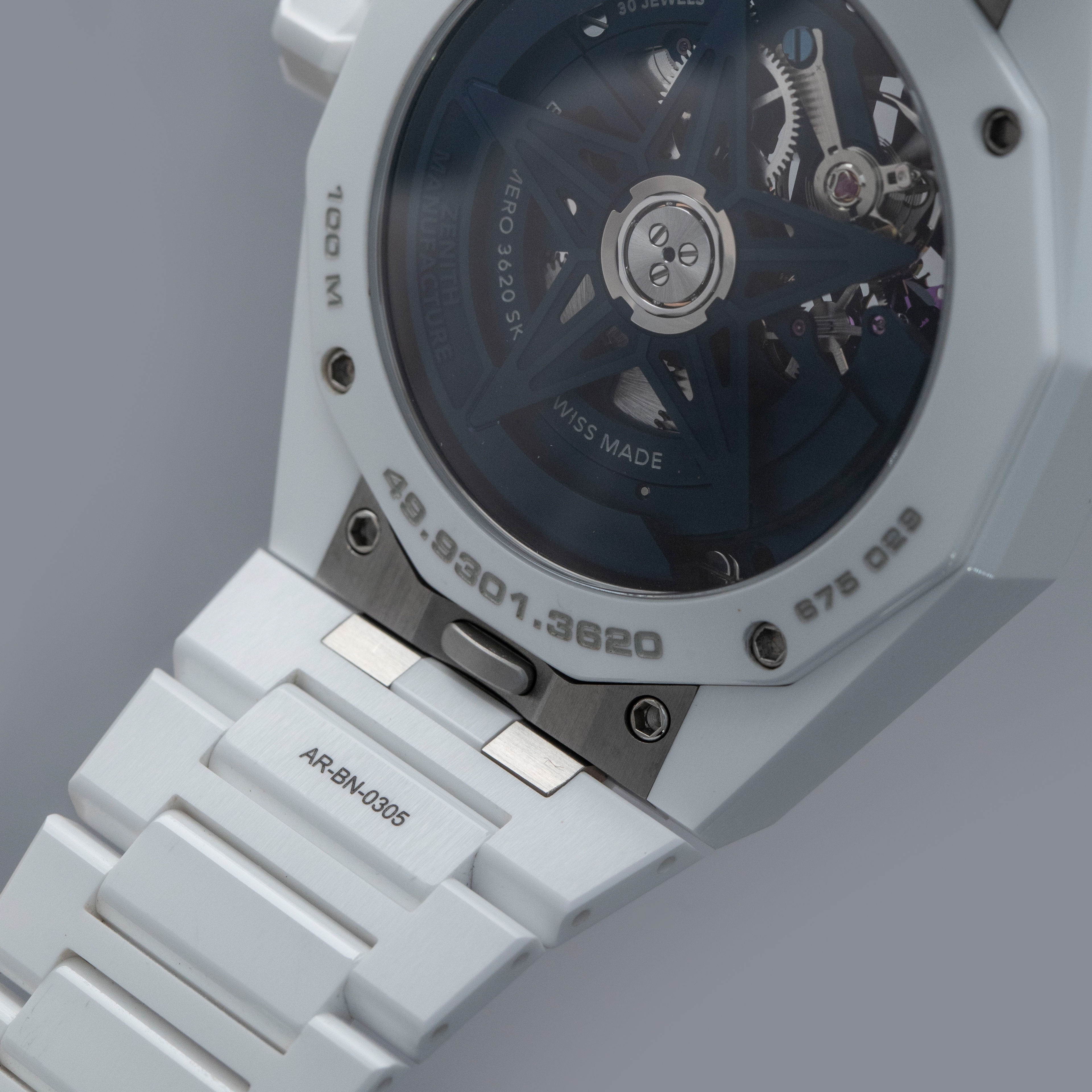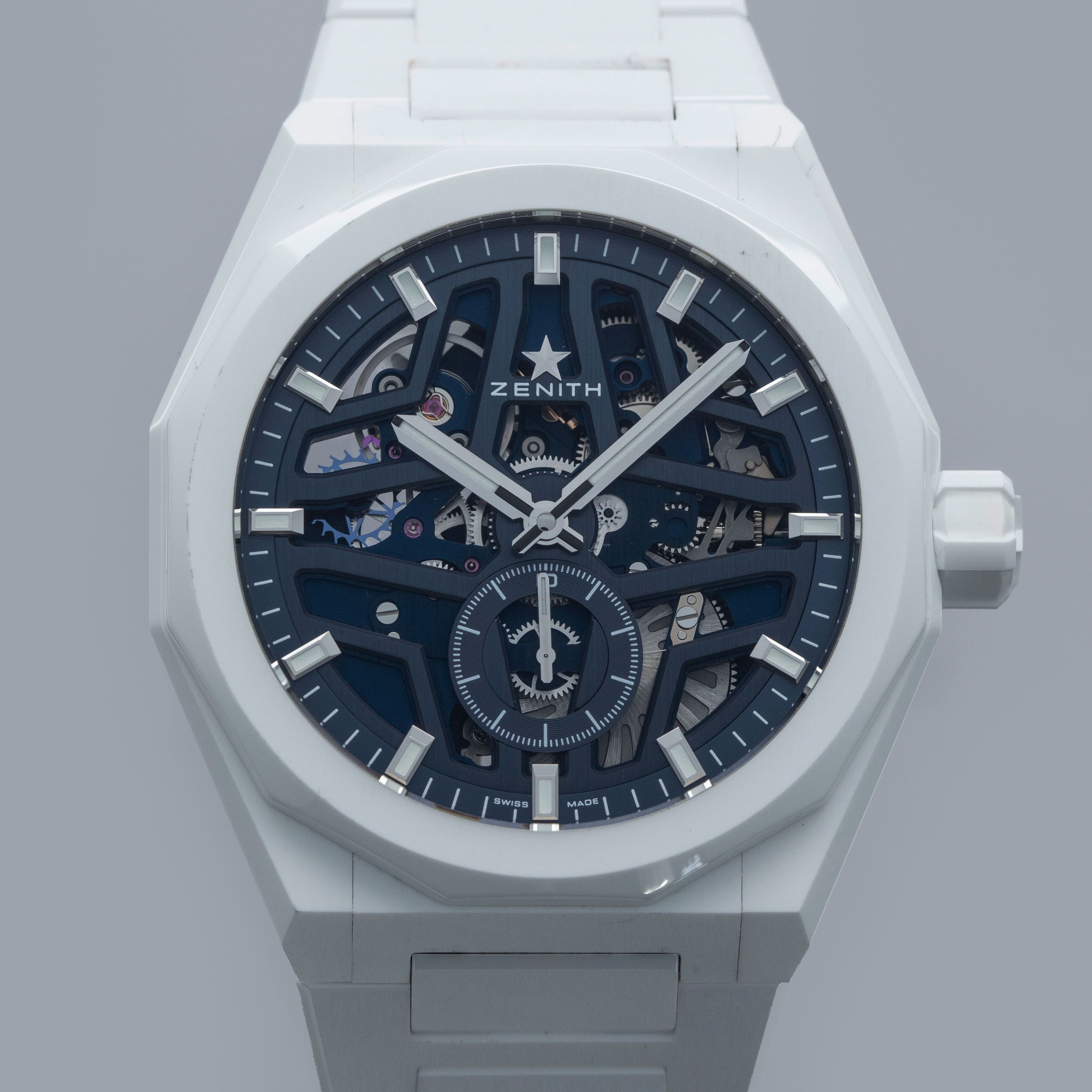Watch is in overall excellent condition. The white ceramic case shows surface scratches and marks, most noticeably on the bezel and upper right lug, while the display case back retains well-defined engravings around the outer edge. The dial and hands remain like new. It is fitted with a white ceramic bracelet showing light surface marks. The bracelet is fitted with 19 links and fits approximately a 6¾” wrist. The removed additional links are included. Comes complete with box and papers, along with a spare white Zenith rubber strap and steel pin buckle.