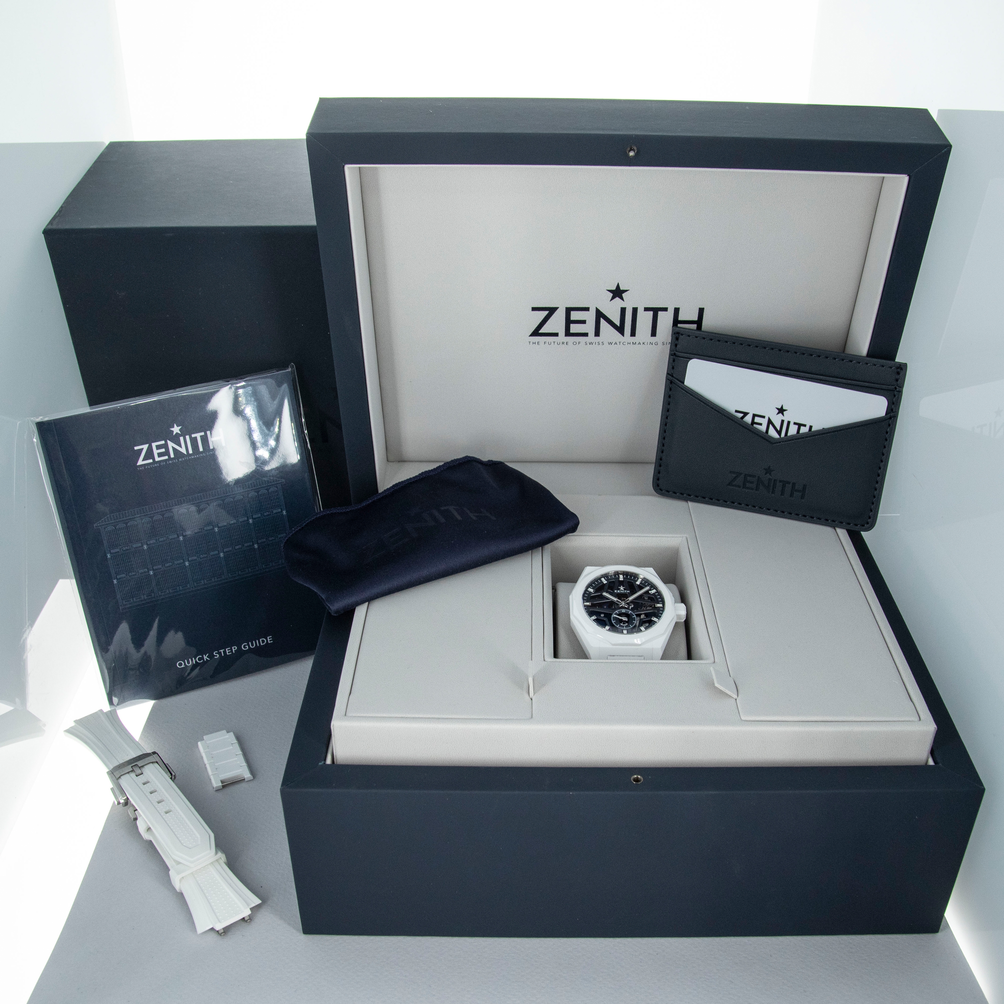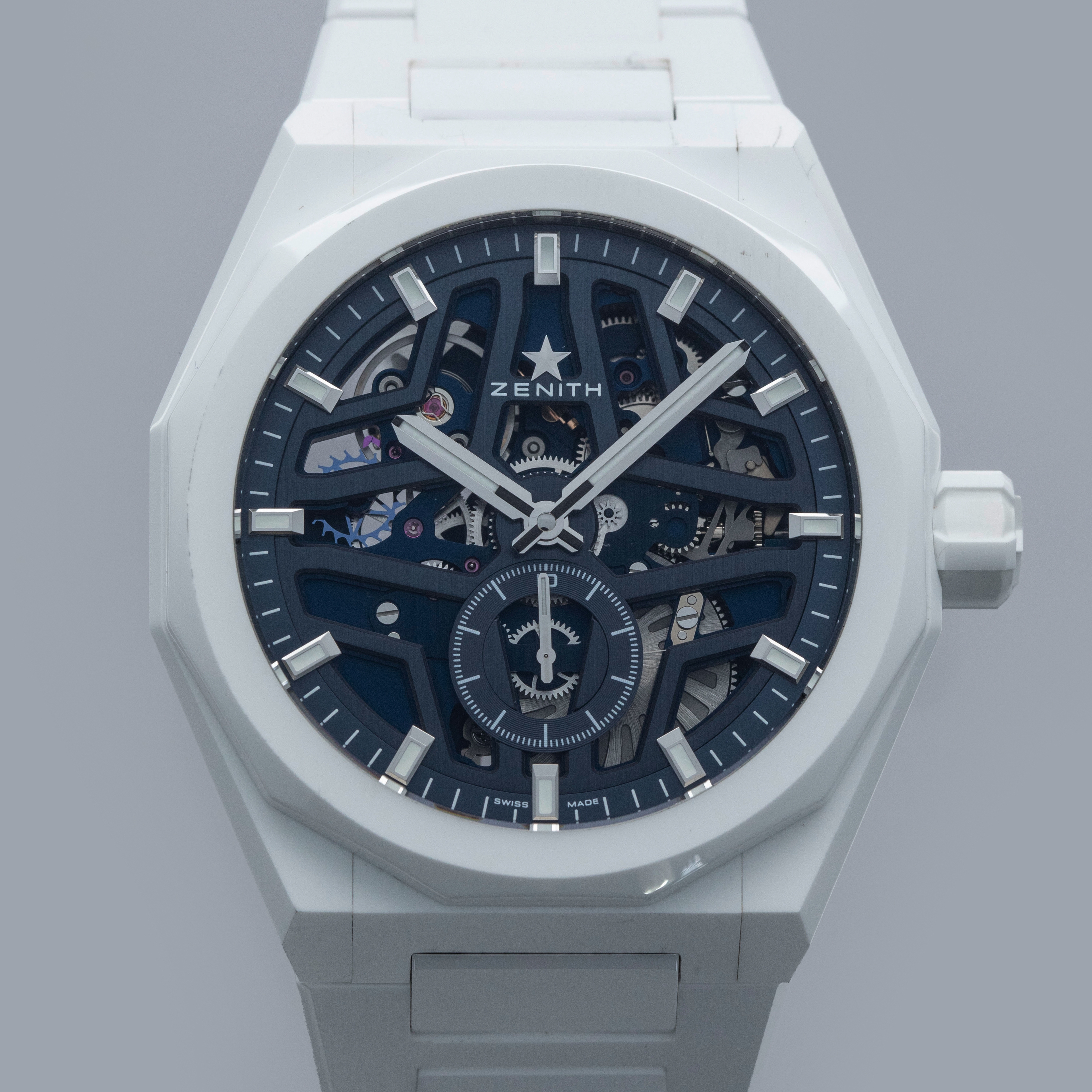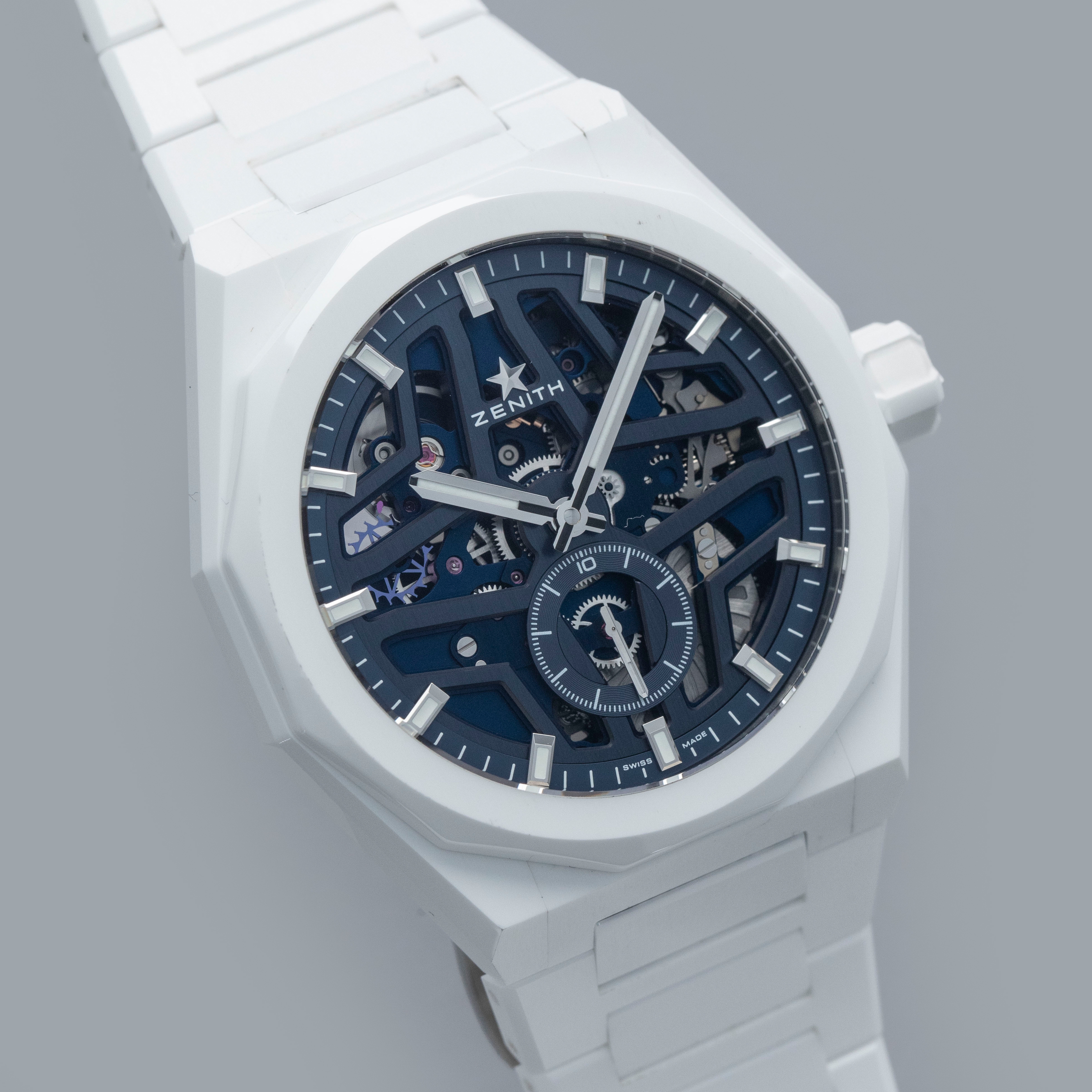 Watch is in overall excellent condition. The white ceramic case shows surface scratches and marks, most noticeably on the bezel and upper right lug, while the display case back retains well-defined engravings around the outer edge. The dial and hands remain like new. It is fitted with a white ceramic bracelet showing light surface marks. The bracelet is fitted with 19 links and fits approximately a 6¾” wrist. The removed additional links are included. Comes complete with box and papers, along with a spare white Zenith rubber strap and steel pin buckle.