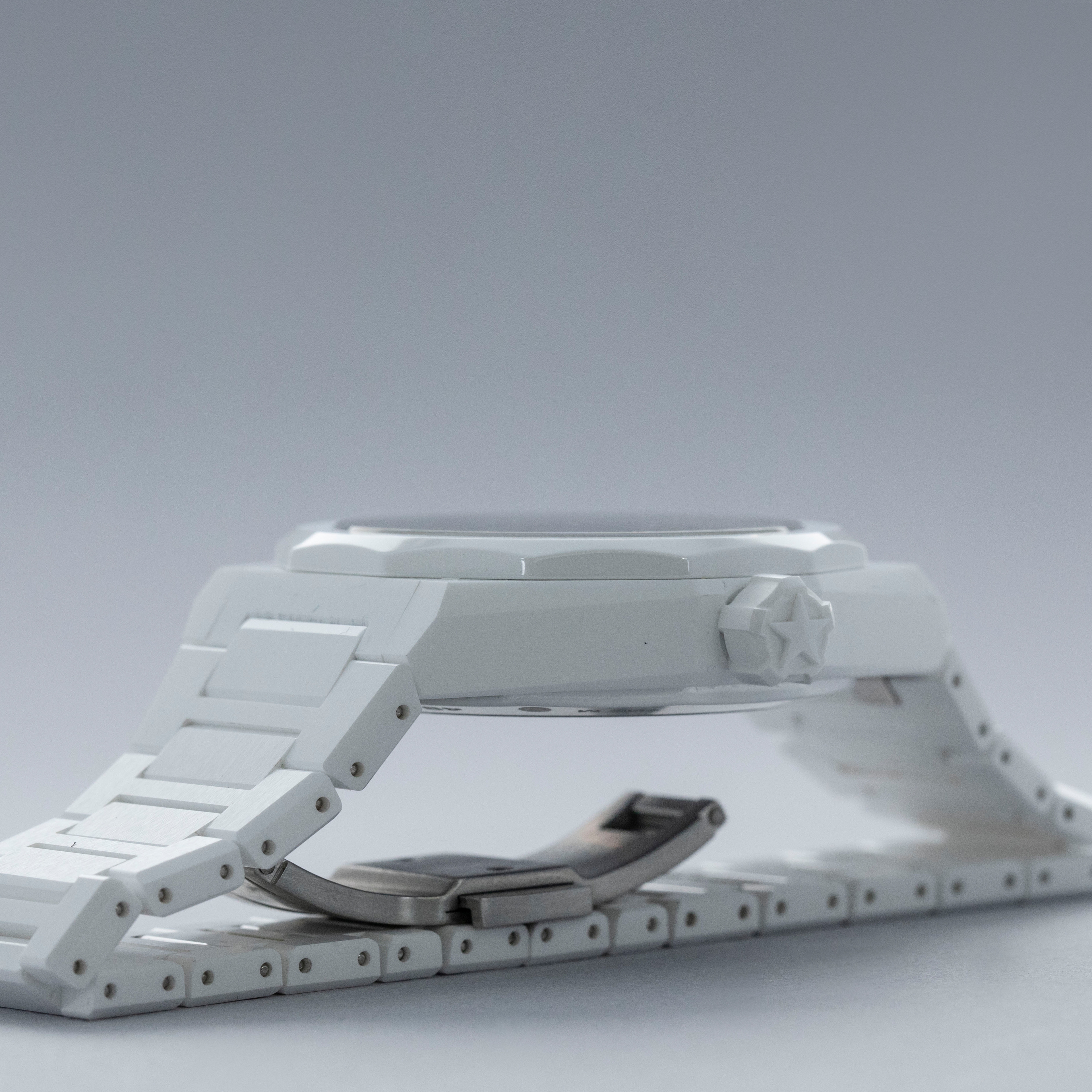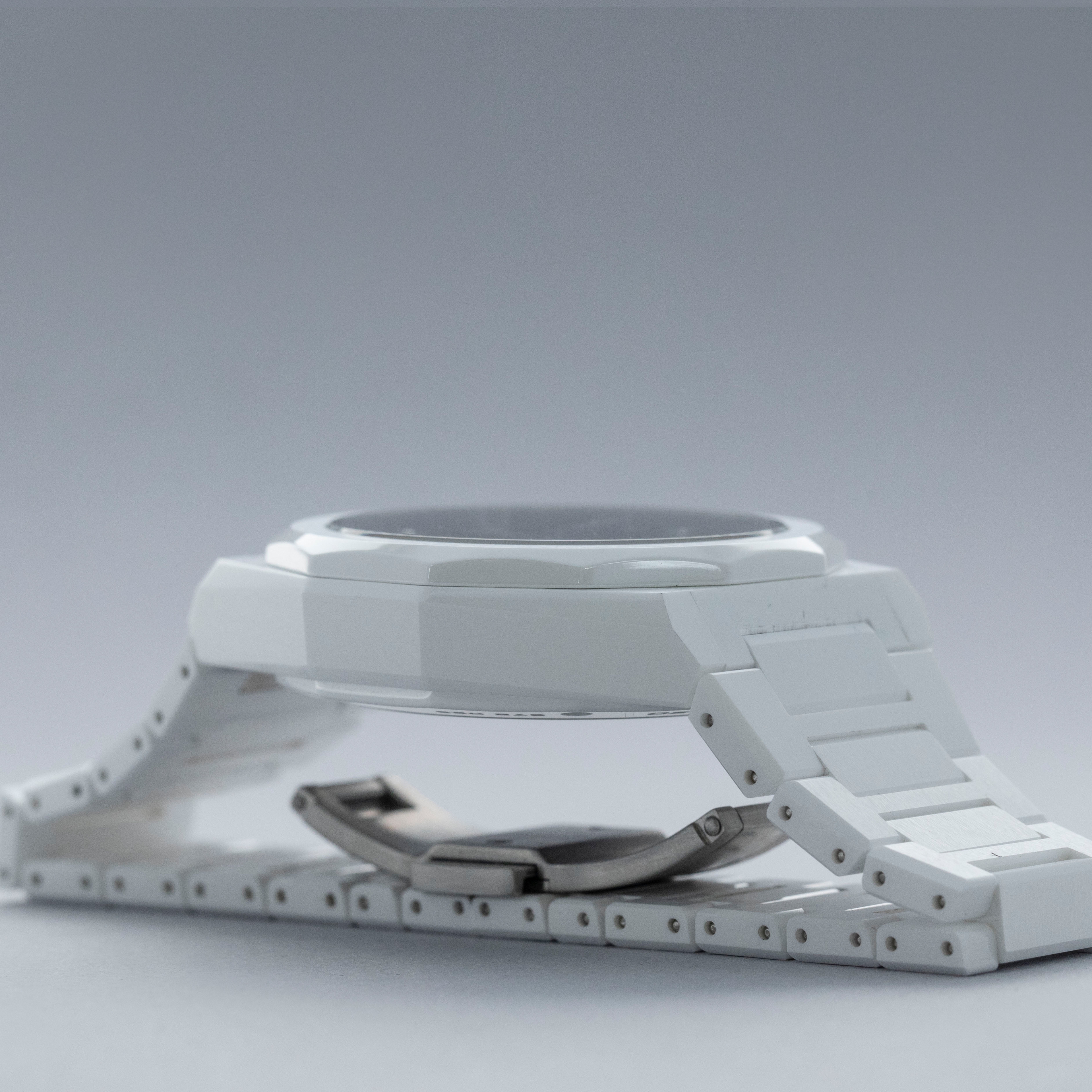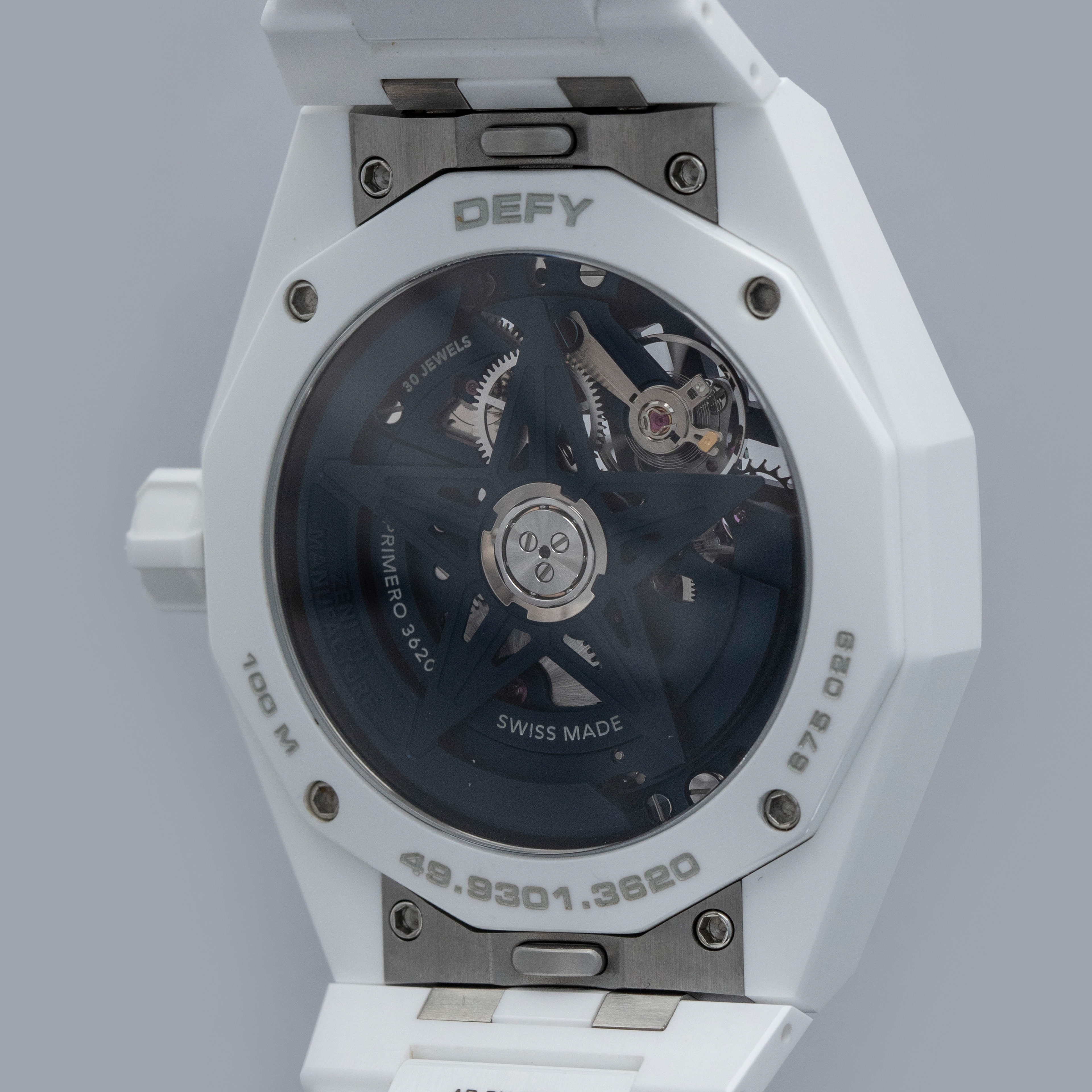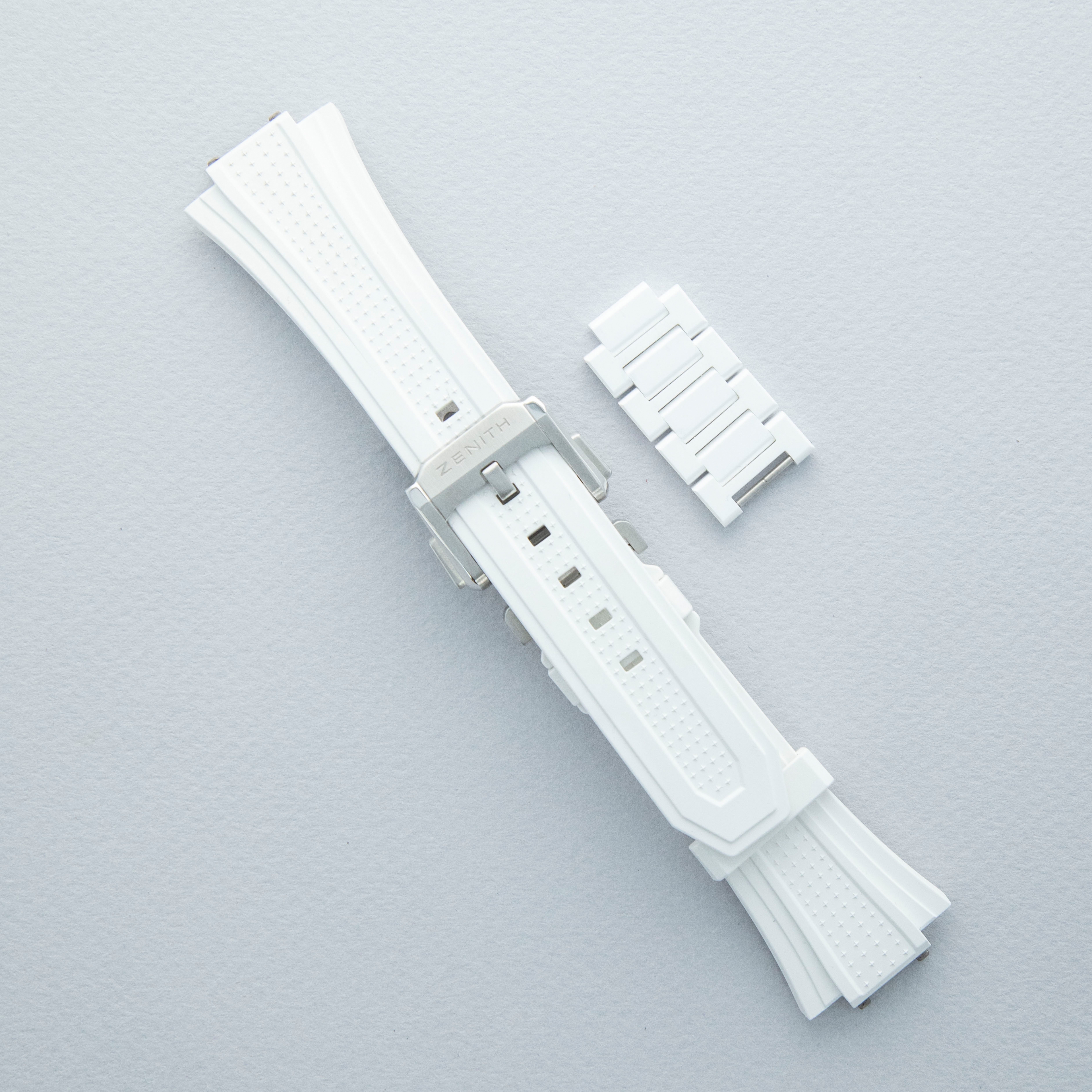 Watch is in overall excellent condition. The white ceramic case shows surface scratches and marks, most noticeably on the bezel and upper right lug, while the display case back retains well-defined engravings around the outer edge. The dial and hands remain like new. It is fitted with a white ceramic bracelet showing light surface marks. The bracelet is fitted with 19 links and fits approximately a 6¾” wrist. The removed additional links are included. Comes complete with box and papers, along with a spare white Zenith rubber strap and steel pin buckle.