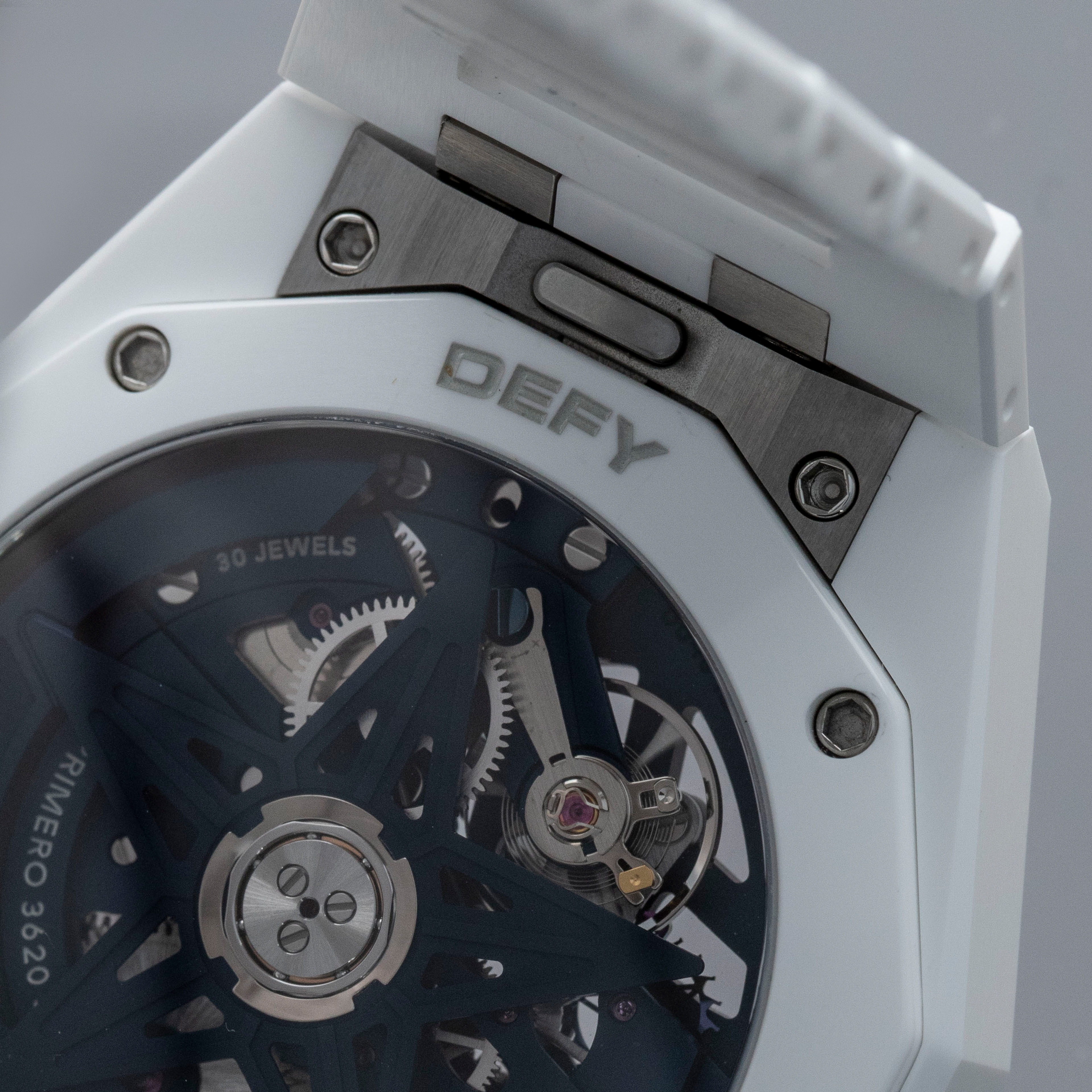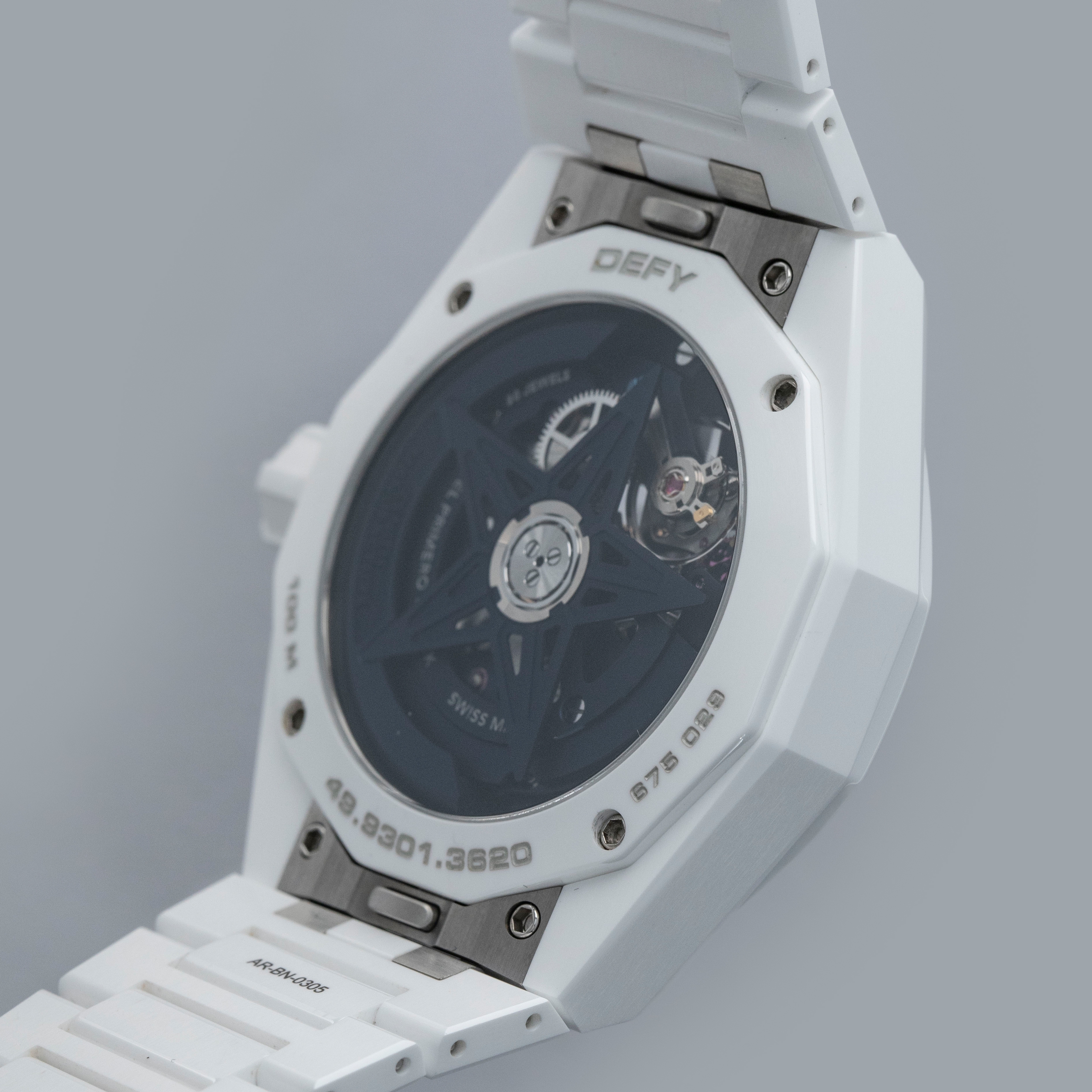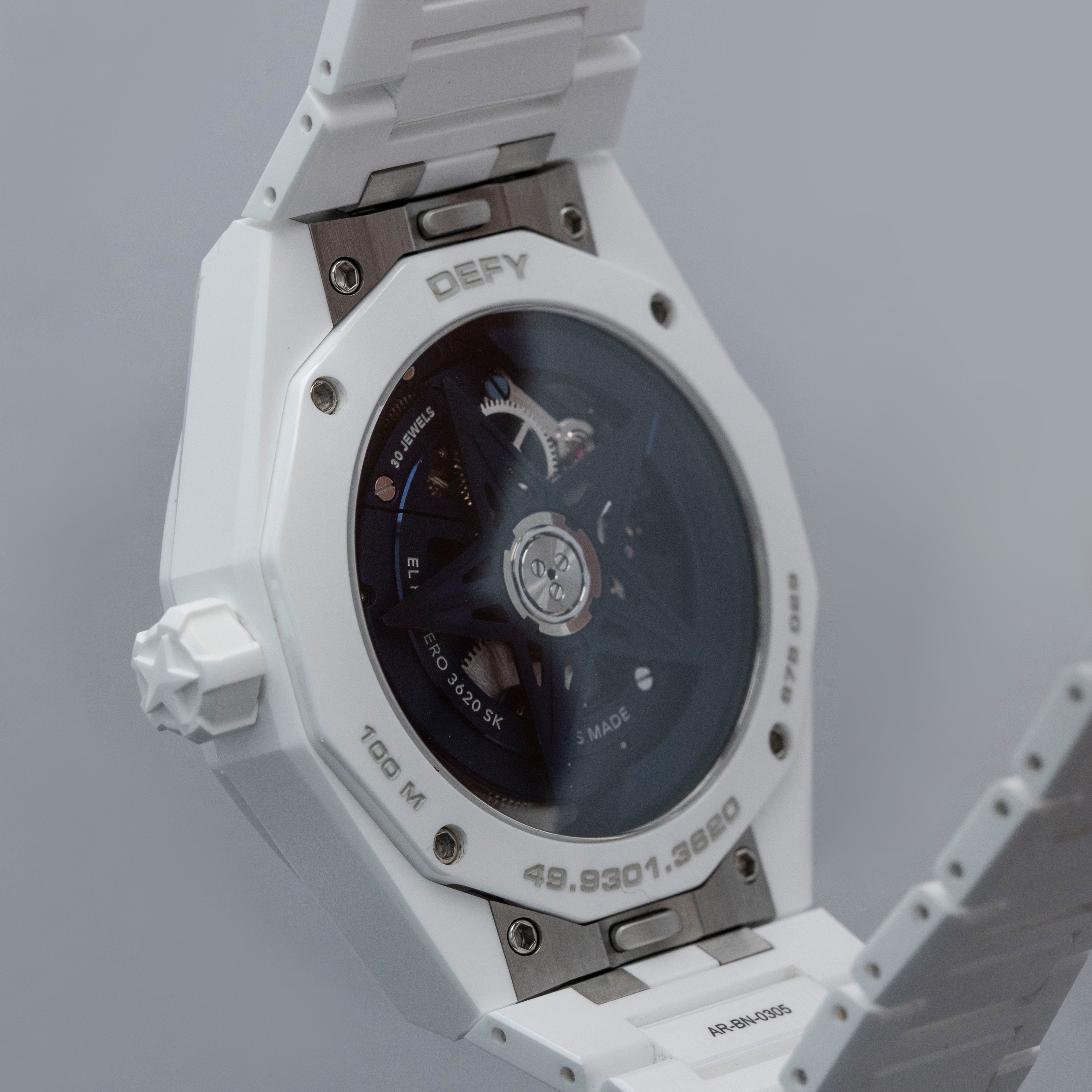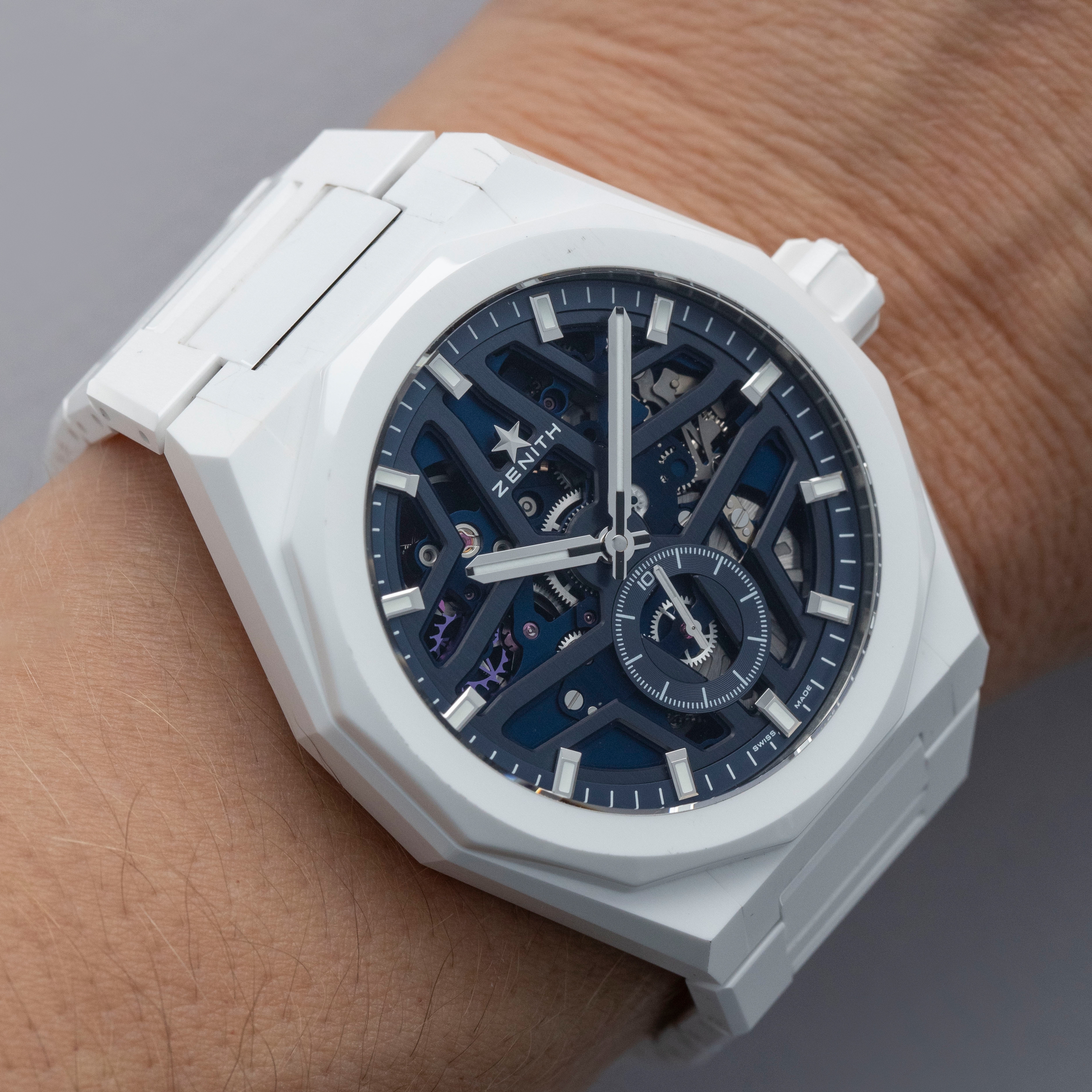 Aggressive, angular and sporty, the Defy Skyline Skeleton wears exactly as one would expect an integrated bracelet sports watch to wear, but with the might of its technically impressive white ceramic case and integrated bracelet.